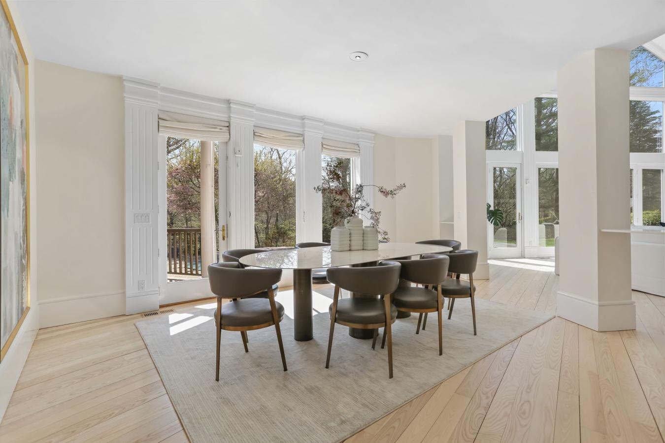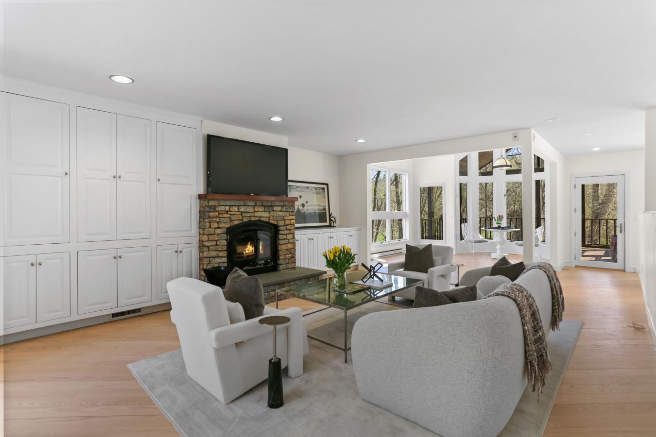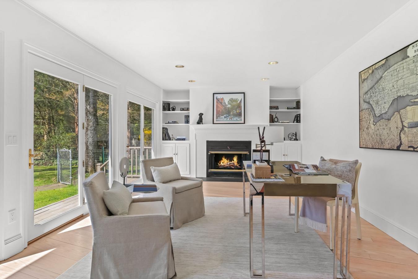 A four-season retreat-where open lawns, a beautiful pool, and the surrounding landscape create a sense of quiet luxury. Set along the Saugatuck River on a quiet private Lower Weston Cul de Sac, this architecturally distinctive contemporary is privately sited on 2.49 acres, offering scale, light, and direct river access in one of Westons most desirable settings. A soaring cathedral ceiling Great Room anchors the home, defined by dramatic vertical volume, expansive glass, and extraordinary natural light. A central fireplace adds warmth and balance to the openness, creating a space equally suited for entertaining or quiet evenings at home. The kitchen is thoughtfully positioned at the heart of daily living, opening seamlessly to the family room with fireplace. French doors lead directly to the deck, Gunite pool, and BBQ terraces, creating effortless indoor outdoor flow and making summer gatherings and everyday living feel connected to the landscape. A striking three season porch with cathedral ceilings extends the architectural expression and provides a serene transitional space overlooking the natural surroundings. A substantial private office with fireplace offers an exceptional work from home retreat. The primary suite is a sanctuary featuring its own fireplace and a newly renovated spa bath. 3/4 additional bedrooms provide comfort and flexibility. The grounds unfold toward the Saugatuck River, offering direct access for kayaking, fishing, or simply enjoying the peaceful waterfront setting. In winter months, upper level glimpses of the river add seasonal dimension. Additional highlights include a three-car garage and solar for energy efficiency. Architecturally expressive yet comfortably livable, this lower Weston contemporary blends light, privacy, and natural beauty just minutes from Westport amenities, commuting access, and Westons award-winning schools.