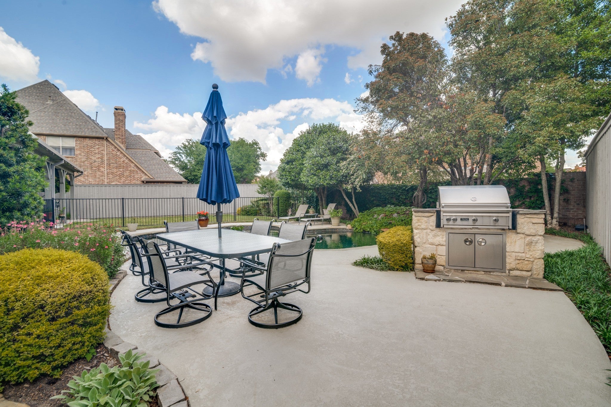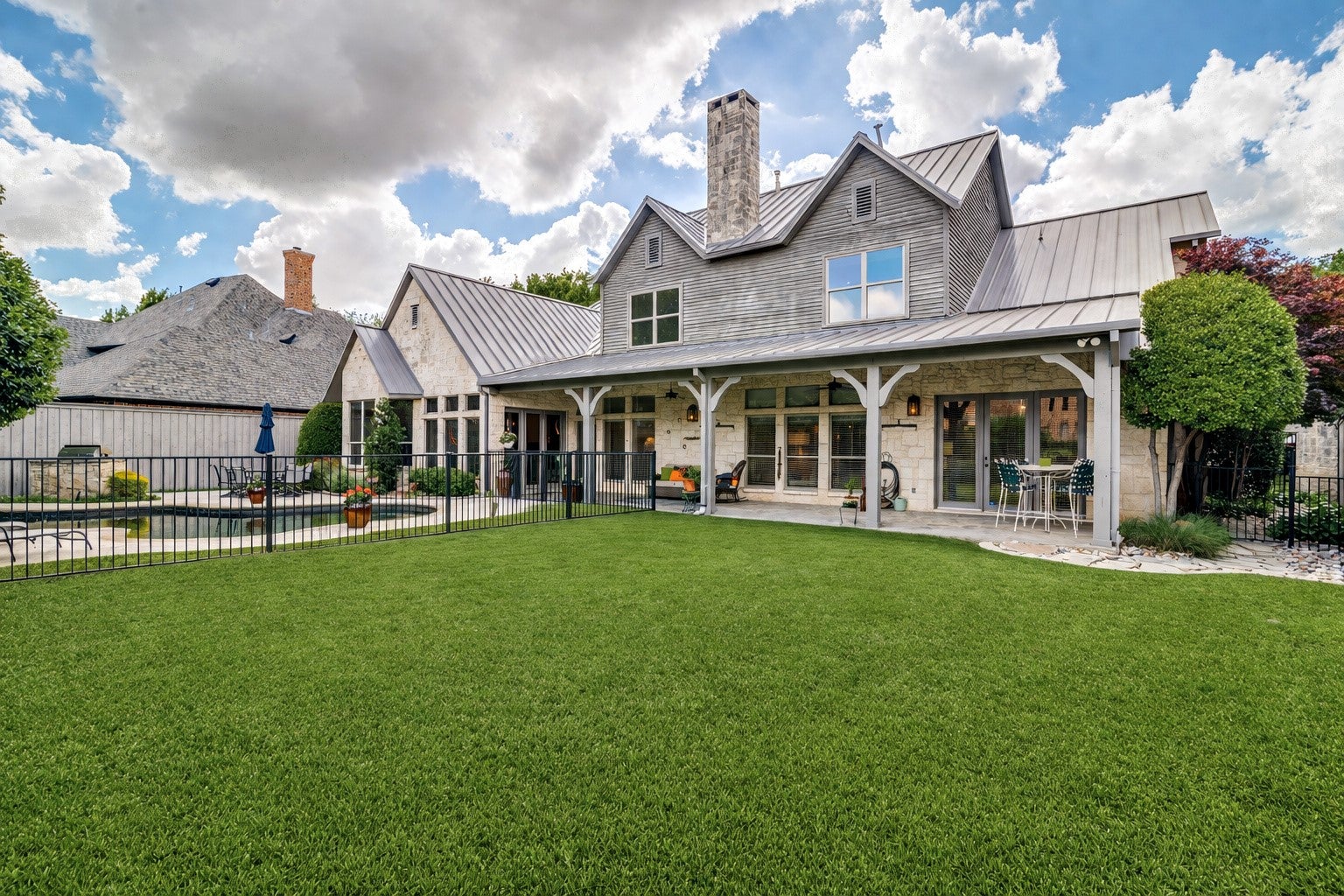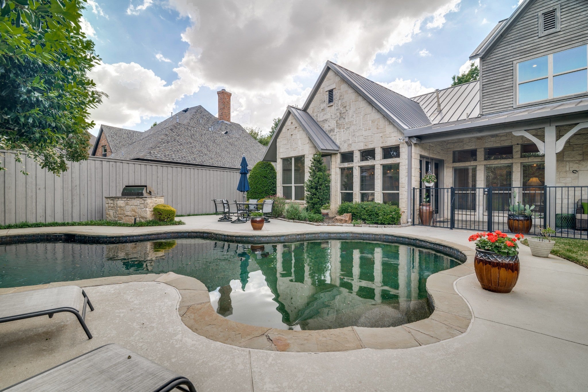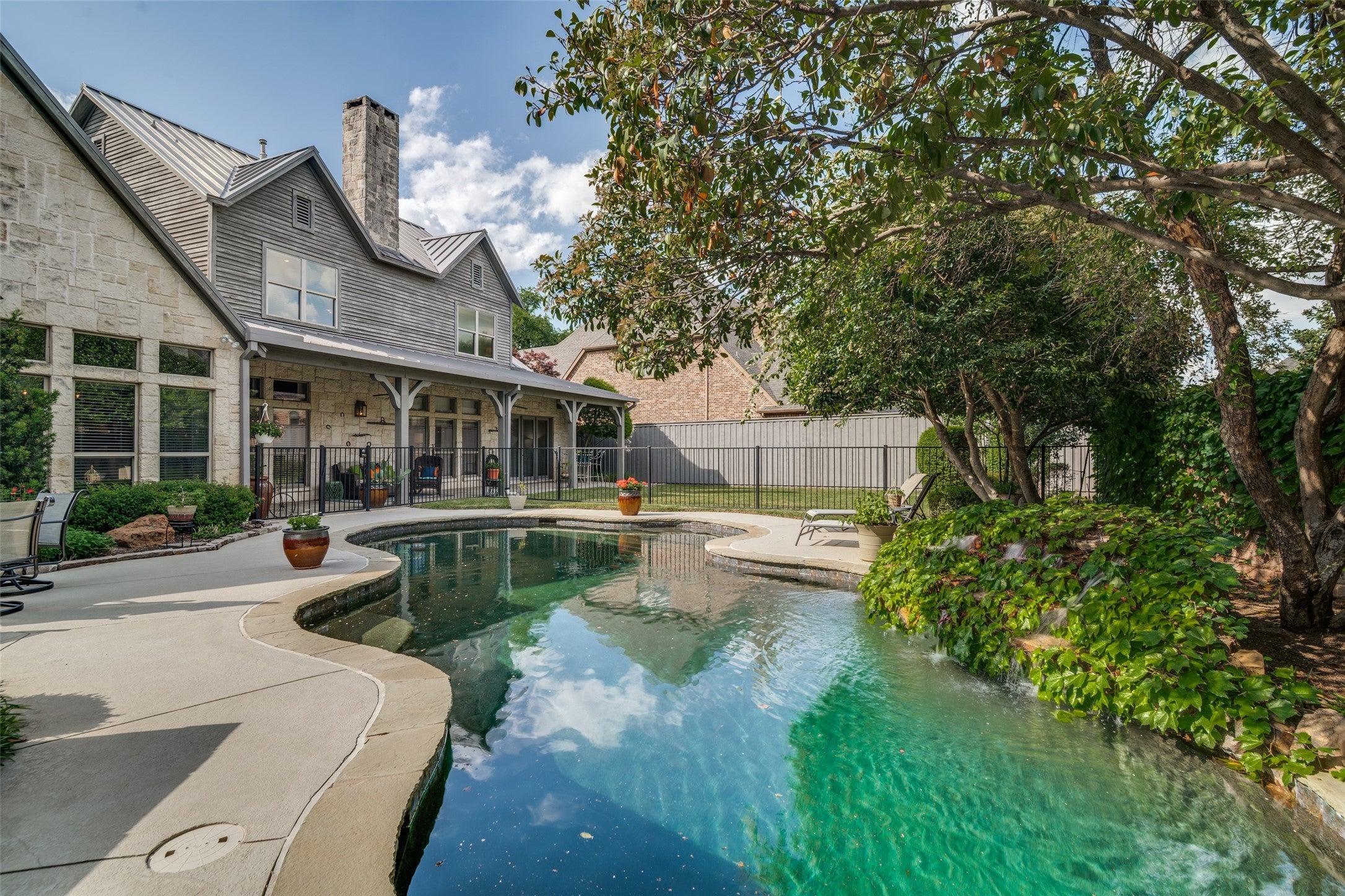 Nestled on a beautiful, tree-lined lot in the heart of Coppell, this exceptional 5-bedroom, 4-bath residence blends timeless character with spacious, functional design. A welcoming front elevation with stone accents and metal roof details sets the tone, leading into a grand entry with soaring ceilings, a dramatic staircase, and rich architectural detail throughout. Designed for both everyday living and entertaining, the expansive floor plan offers multiple living and dining areas, including a warm and inviting family room with wood beams, a stunning stone fireplace, and built-in cabinetry. The chefs kitchen is the heart of the home, featuring an oversized island, gas cooktop, stainless appliances, abundant cabinetry, and a seamless connection to the breakfast area and living spaces. The private primary suite is a serene retreat with backyard views and a spacious bath complete with dual vanities, soaking tub, and separate shower. A dedicated study with custom built-ins provides the perfect work-from-home space, while additional bedrooms and flexible living areas, including a large upstairs sitting or game room offer room for everyone. Step outside to your own backyard oasis, where a sparkling pool with waterfall, lush landscaping, and multiple seating areas create the ideal setting for relaxing or entertaining. The covered patio extends your living space year round. Additional highlights include hardwood floors, extensive built-ins, a well-appointed laundry room, and thoughtful storage throughout. Ideally located near parks, trails, dining, and within award-winning Coppell ISD.