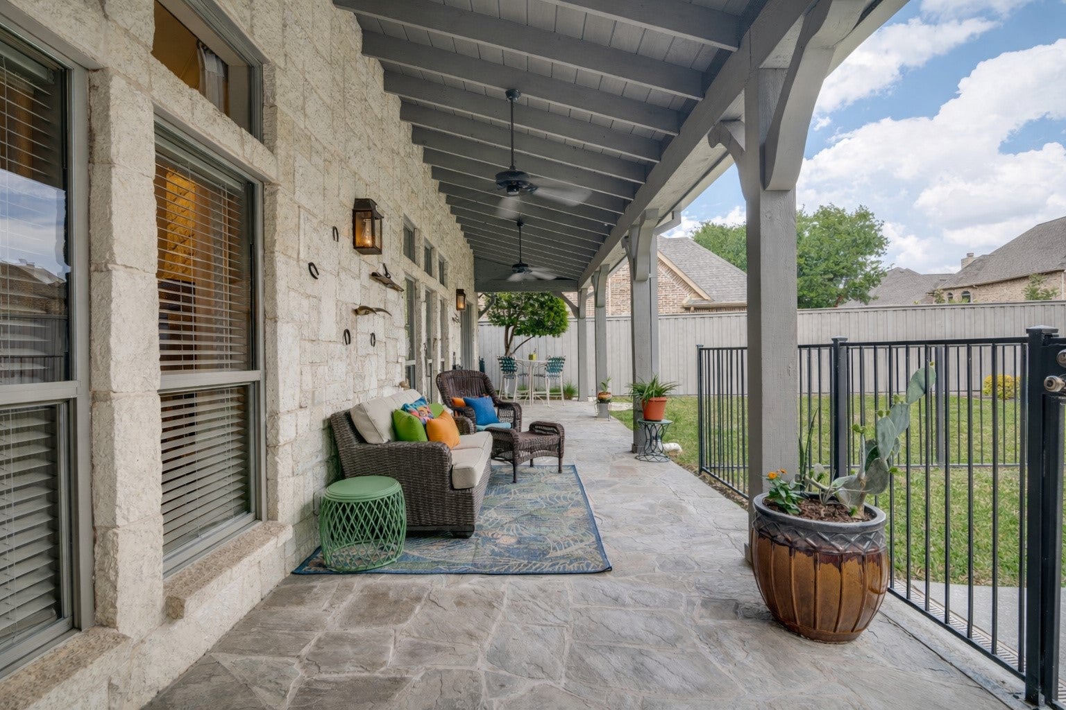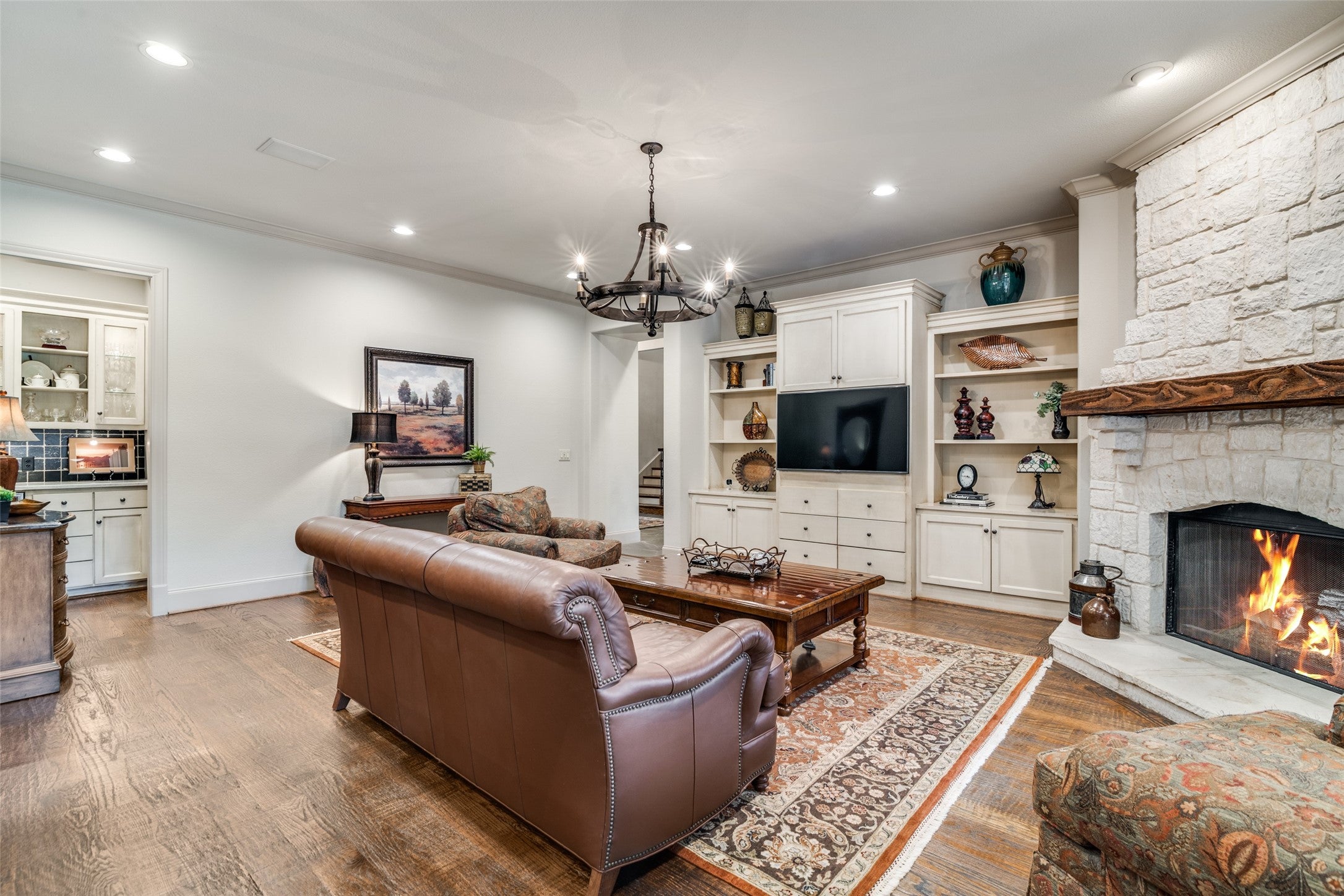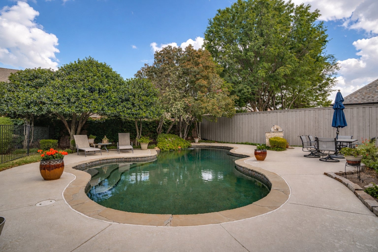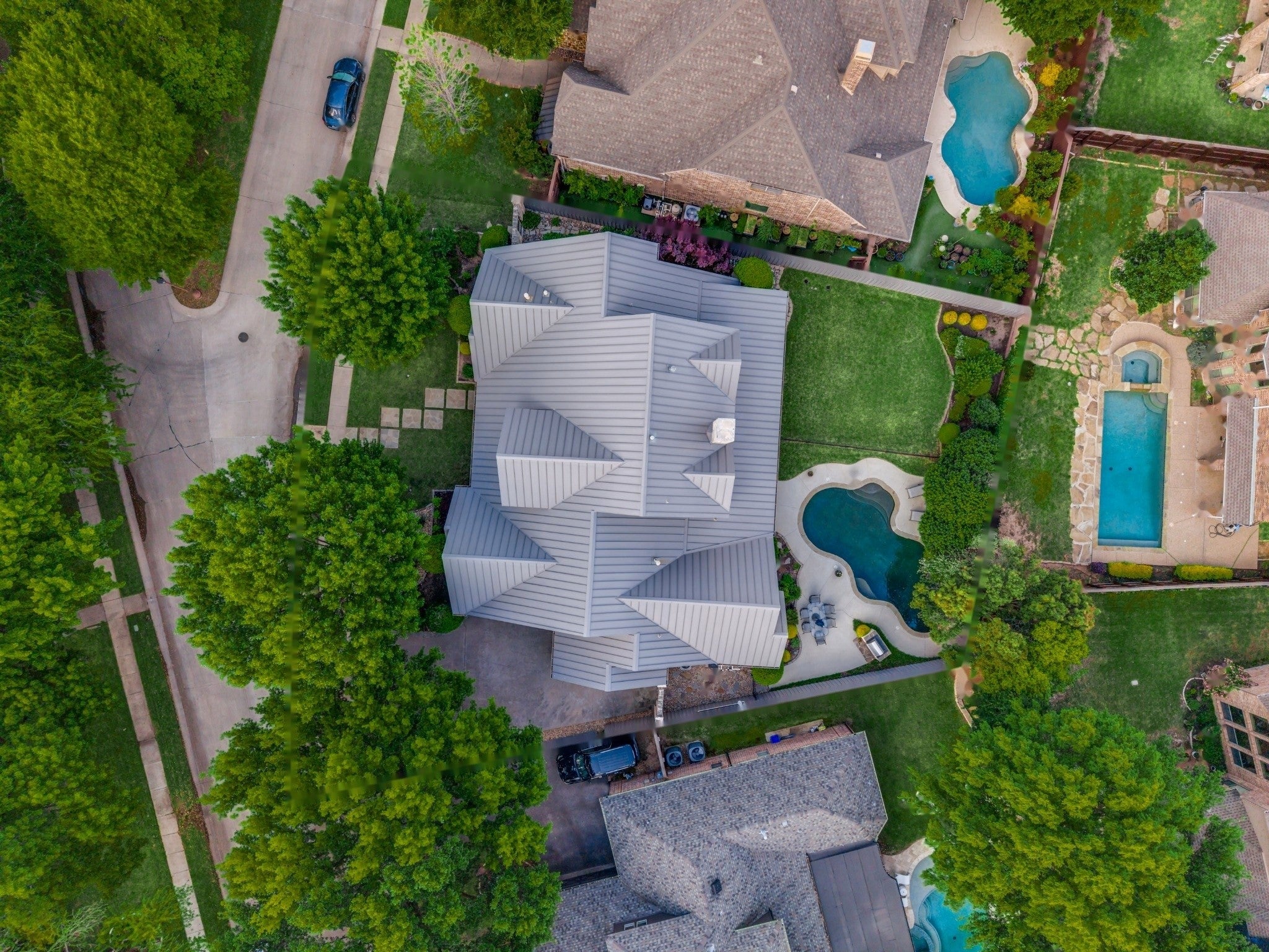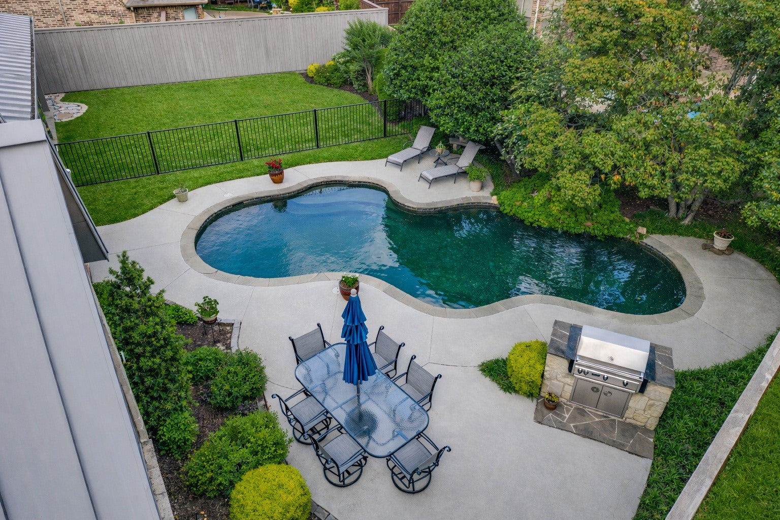 Nestled on a beautiful, tree-lined lot in the heart of Coppell, this exceptional 5-bedroom, 4-bath residence blends timeless character with spacious, functional design. A welcoming front elevation with stone accents and metal roof details sets the tone, leading into a grand entry with soaring ceilings, a dramatic staircase, and rich architectural detail throughout. Designed for both everyday living and entertaining, the expansive floor plan offers multiple living and dining areas, including a warm and inviting family room with wood beams, a stunning stone fireplace, and built-in cabinetry. The chefs kitchen is the heart of the home, featuring an oversized island, gas cooktop, stainless appliances, abundant cabinetry, and a seamless connection to the breakfast area and living spaces. The private primary suite is a serene retreat with backyard views and a spacious bath complete with dual vanities, soaking tub, and separate shower. A dedicated study with custom built-ins provides the perfect work-from-home space, while additional bedrooms and flexible living areas, including a large upstairs sitting or game room offer room for everyone. Step outside to your own backyard oasis, where a sparkling pool with waterfall, lush landscaping, and multiple seating areas create the ideal setting for relaxing or entertaining. The covered patio extends your living space year round. Additional highlights include hardwood floors, extensive built-ins, a well-appointed laundry room, and thoughtful storage throughout. Ideally located near parks, trails, dining, and within award-winning Coppell ISD.