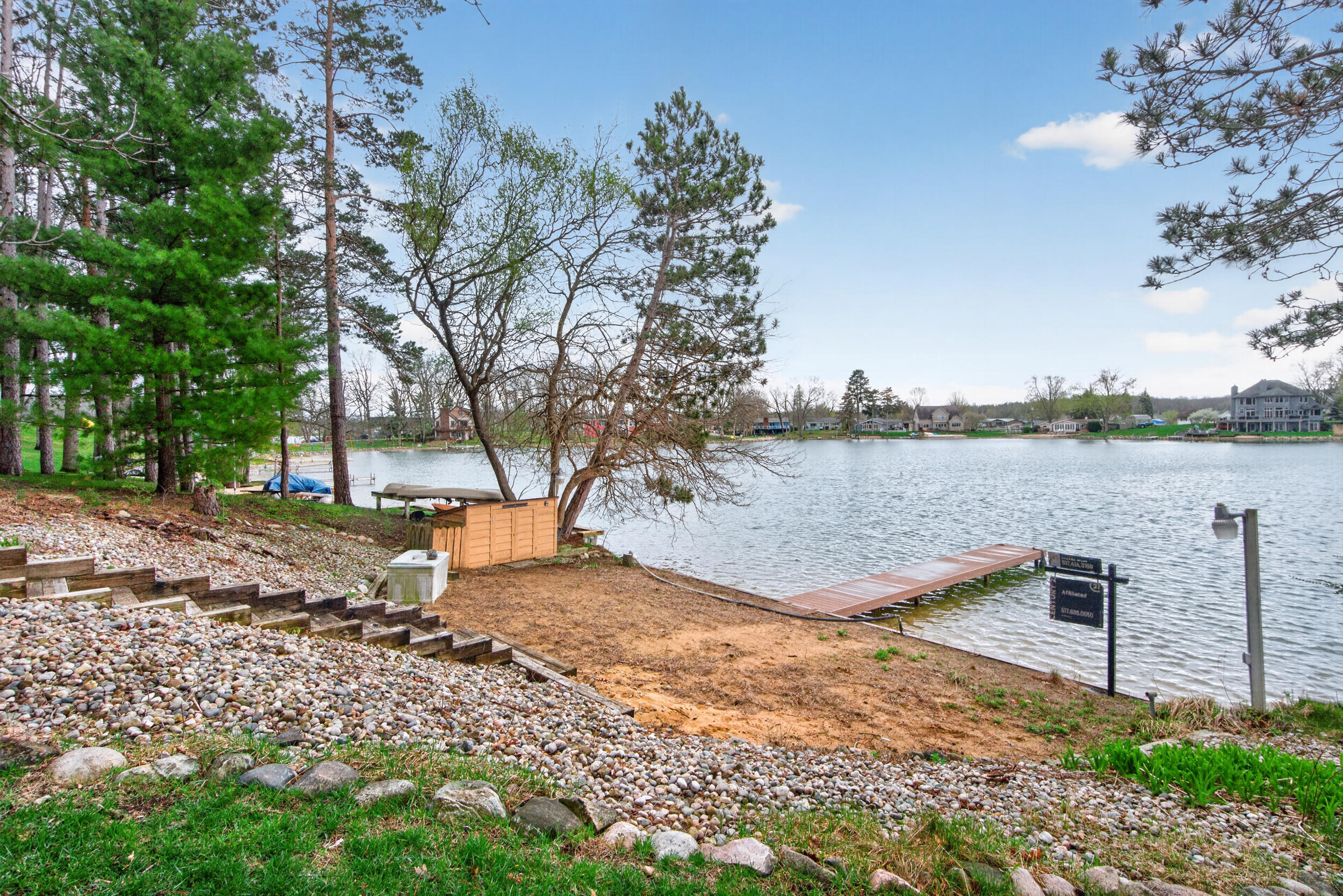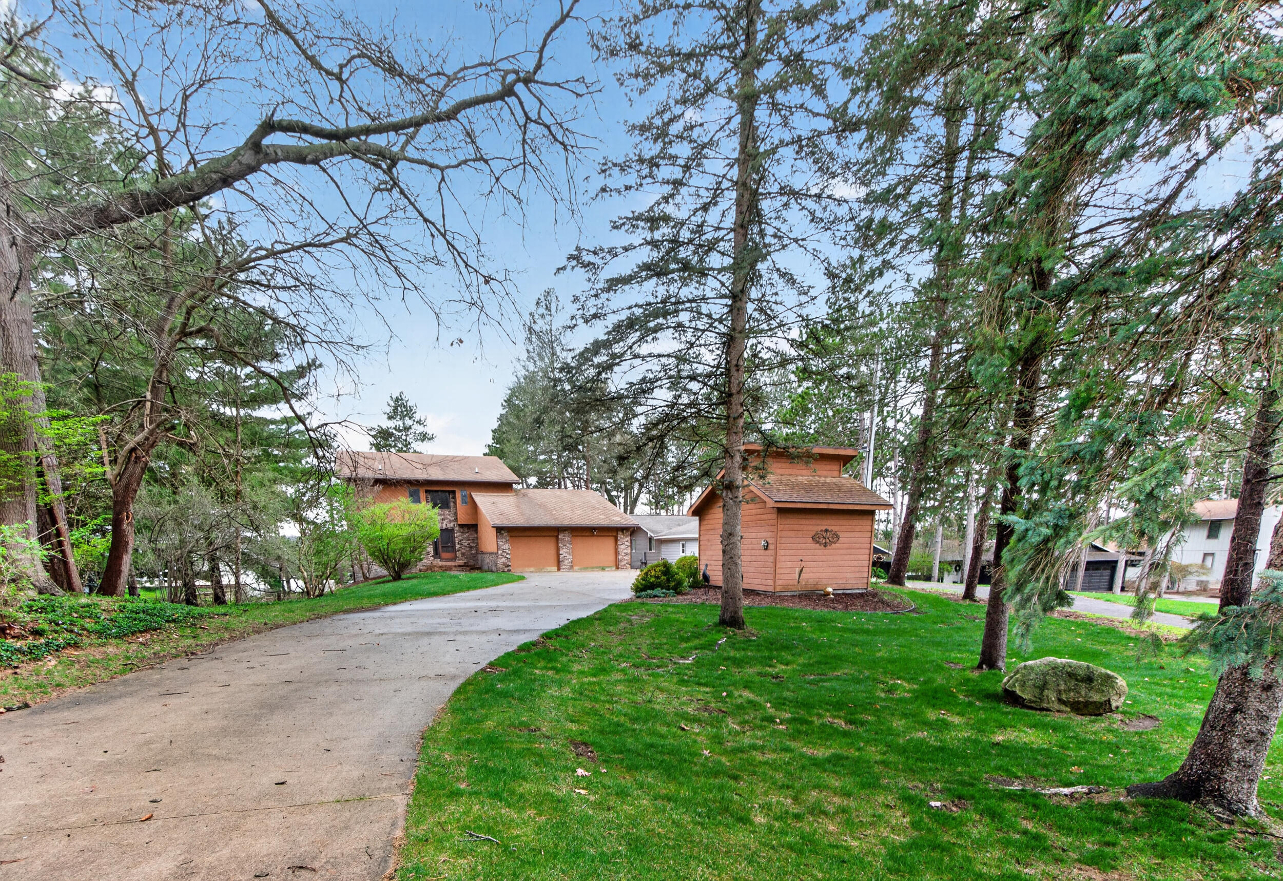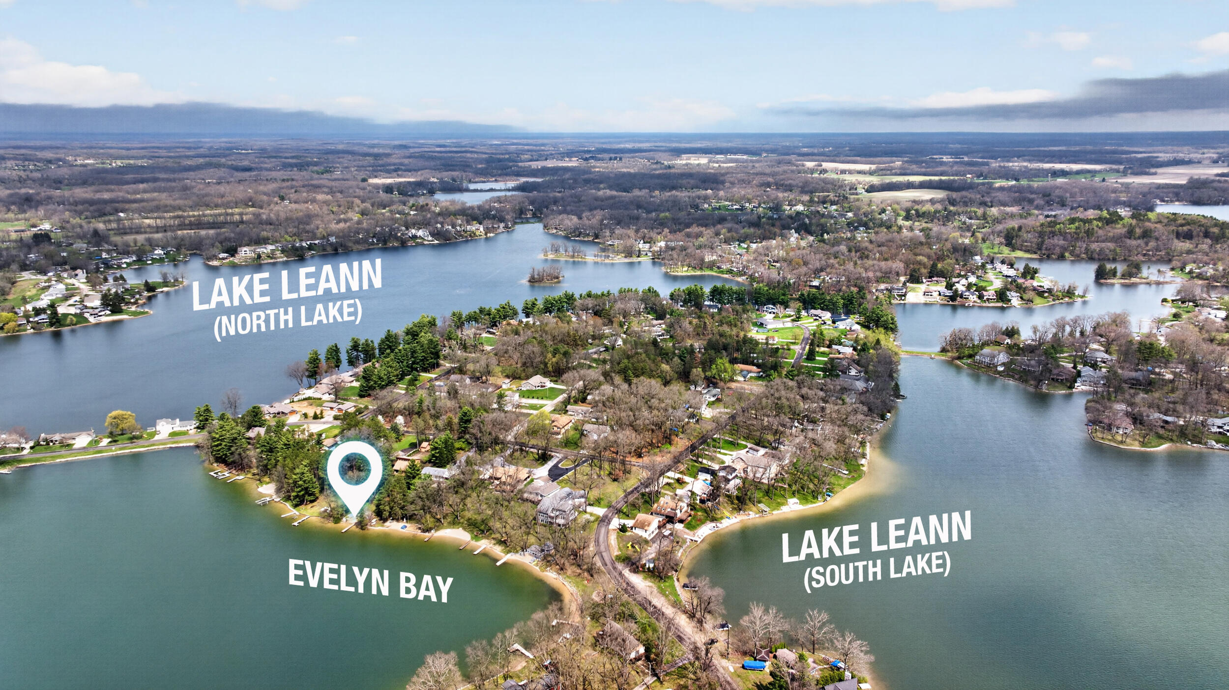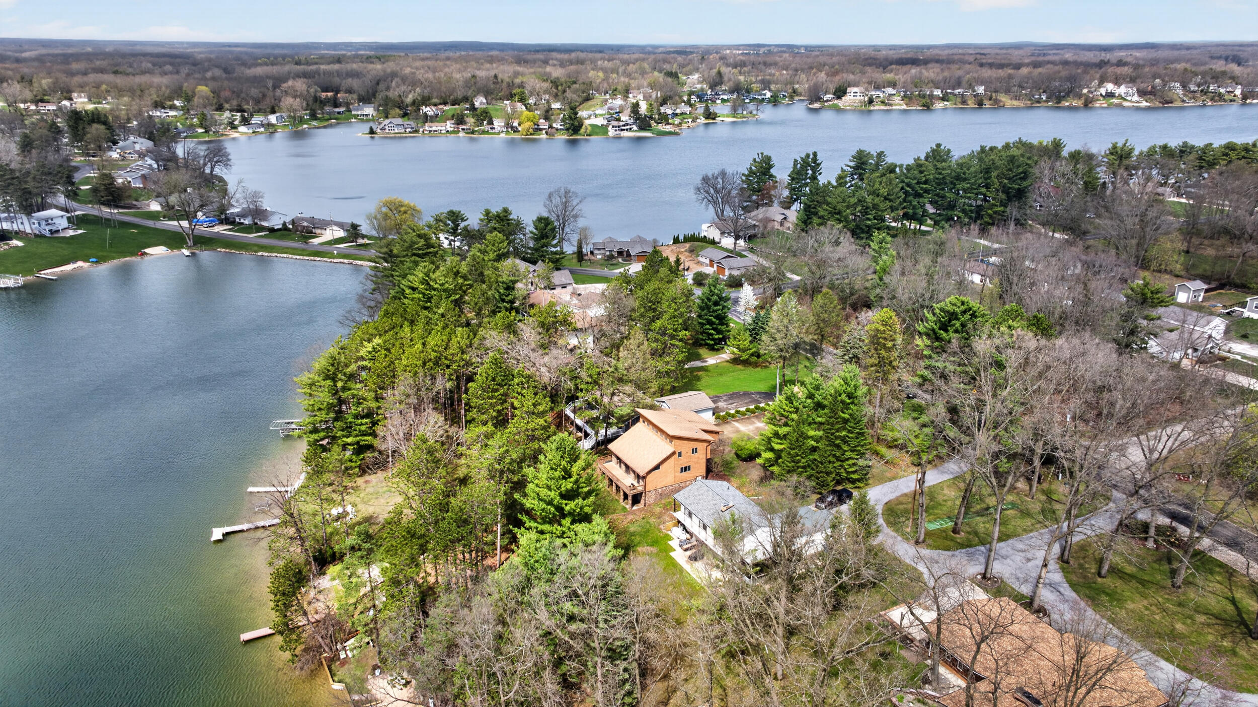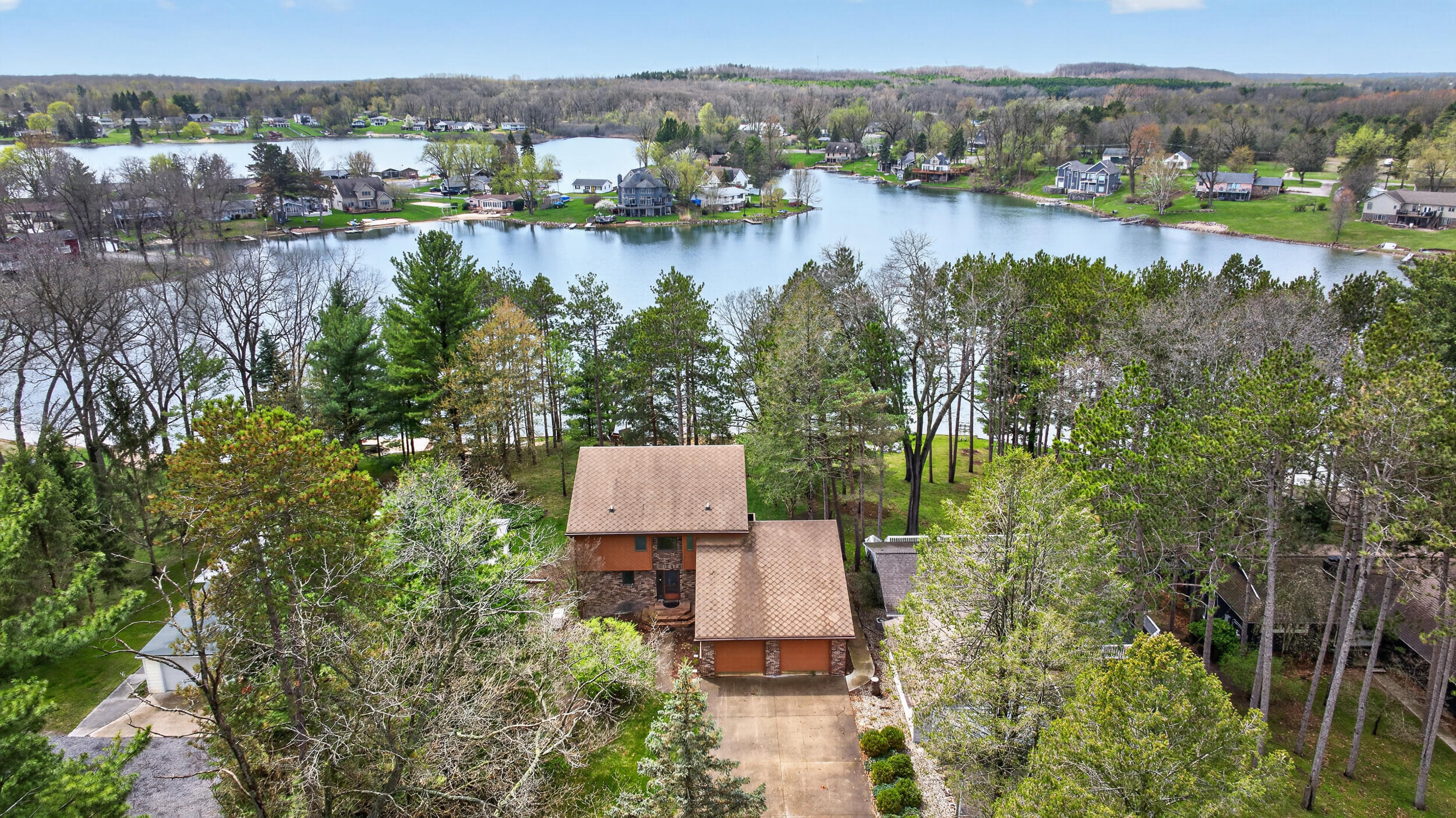 Experience the quintessential up north lifestyle right here in the prestigious Royal Shores community. Tucked away on Evelyns Bay, this stunning lakefront retreat sits on a private, all-sports Lake Leann shoreline characterized by towering trees, sandy bottoms, and pristine swimming waters. The home is perfectly positioned on a quiet, one-way peninsula that offers some of the most breathtaking elevated views of the water. From the moment you pull into the oversized driveway, the wooded setting and northern Michigan vacation feel set this property apart from every other home on the lake. The interior was masterfully designed to embrace the waterfront, featuring soaring vaulted ceilings and a wall of lakeside windows that flood the home with natural light. Multiple sliding glass doors lead to an expansive deck, perfect for entertaining or soaking in the scenery. Recent mechanical and cosmetic upgrades provide total peace of mind, including a natural gas line to your whole-home generator, and fresh paint throughout. The kitchen and bathrooms have been refreshed with all-new sink faucets, new toilets, and a brand-new suite of appliances including a stove, dishwasher, and microwave. A rare and highly functional feature of this home is the layout, which provides a full bathroom for every bedroom to ensure total privacy for your family and lake guests. The walk-out lower level serves as a premier entertainment hub, complete with a secondary living area, a wet bar, and a dedicated room featuring a hot tub and sauna. Storage is never an issue here, as the property includes an oversized garage designed to house all your lake toys, plus a matching shed for yard equipment. Outside, your private waterfront experience is completed by a permanent dock, making it easier than ever to enjoy the water. With lake season finally here, this is a unique opportunity to secure a fully equipped home in one of the most sought-after locations on the water.