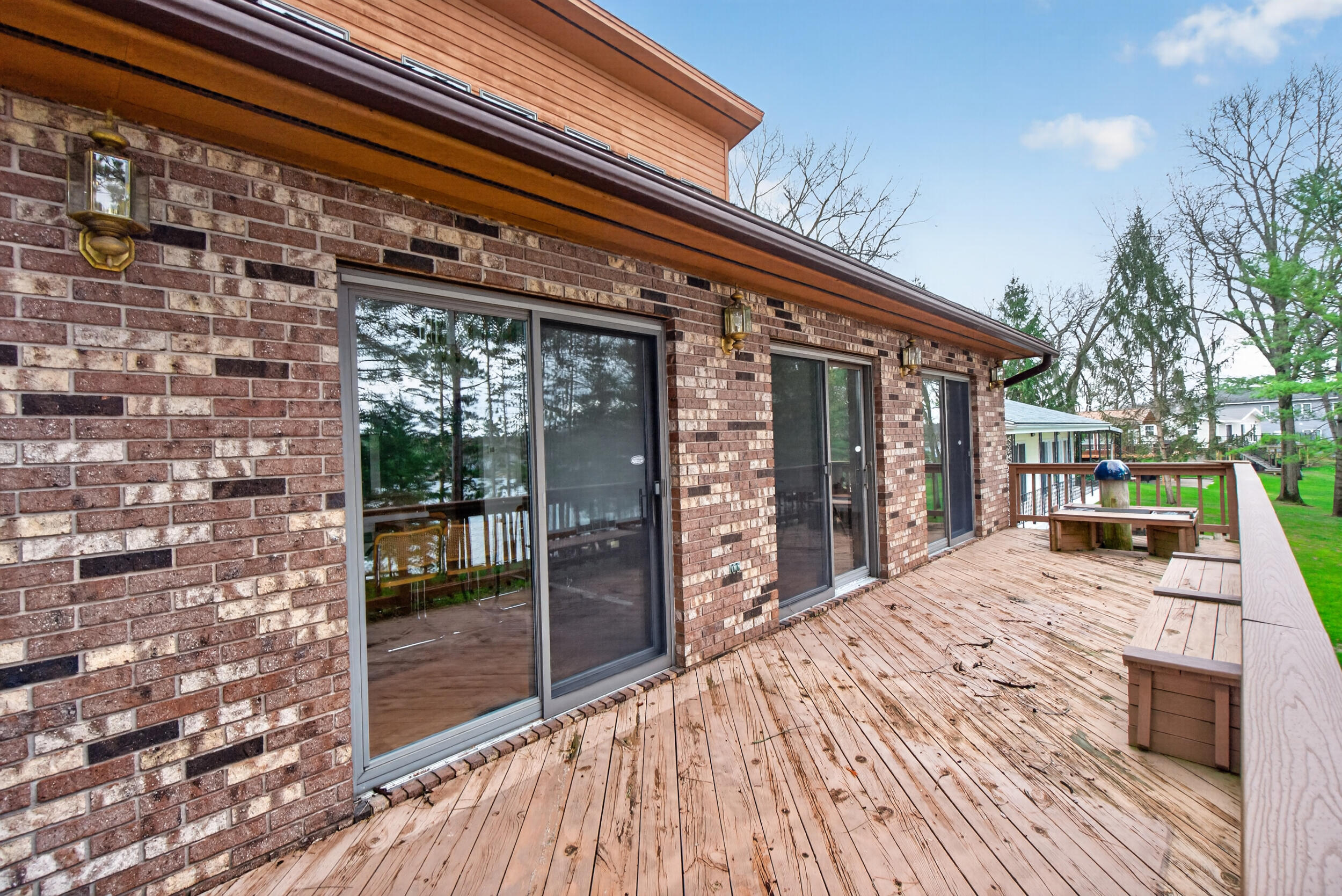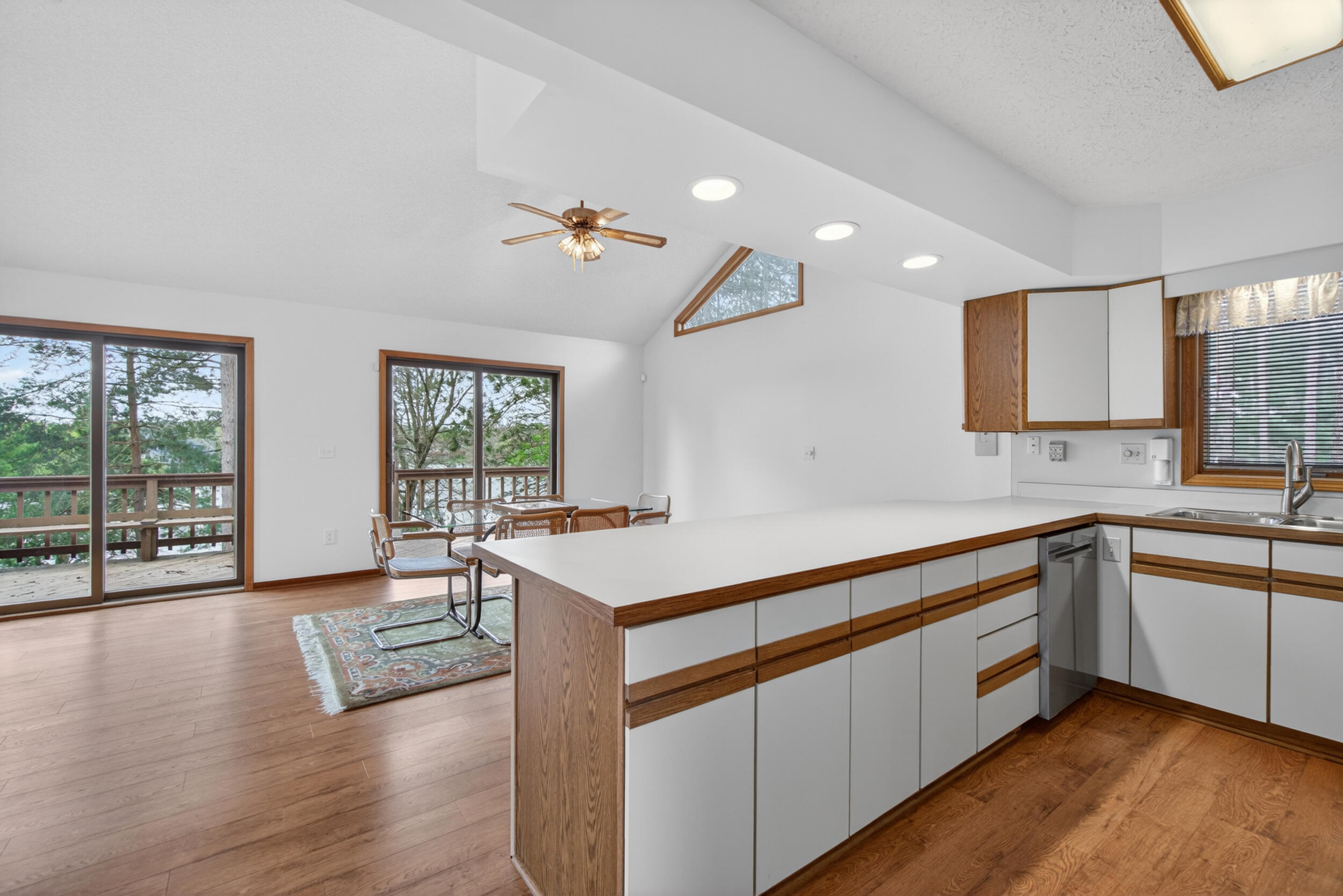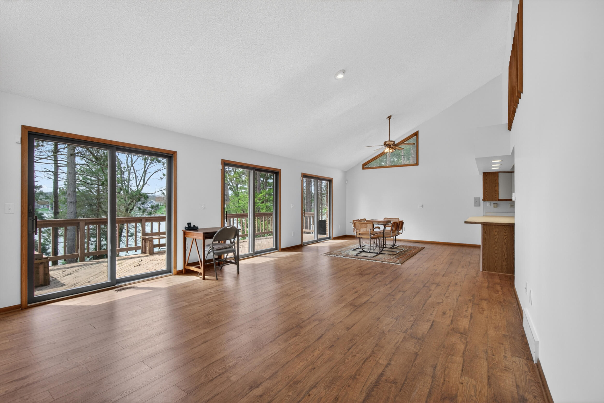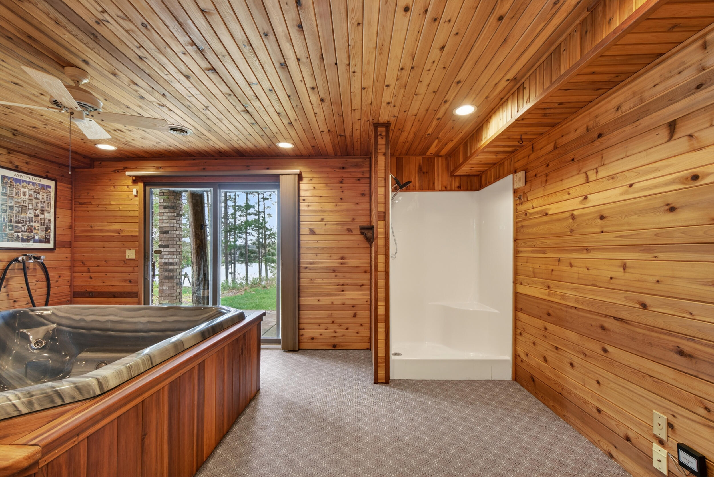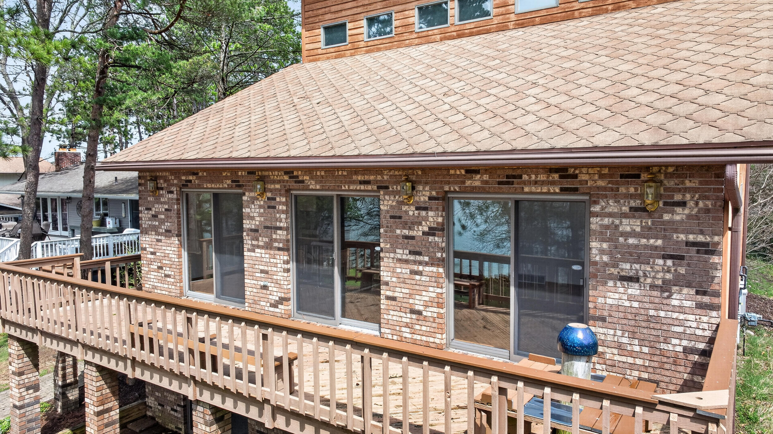 Experience the quintessential up north lifestyle right here in the prestigious Royal Shores community. Tucked away on Evelyns Bay, this stunning lakefront retreat sits on a private, all-sports Lake Leann shoreline characterized by towering trees, sandy bottoms, and pristine swimming waters. The home is perfectly positioned on a quiet, one-way peninsula that offers some of the most breathtaking elevated views of the water. From the moment you pull into the oversized driveway, the wooded setting and northern Michigan vacation feel set this property apart from every other home on the lake. The interior was masterfully designed to embrace the waterfront, featuring soaring vaulted ceilings and a wall of lakeside windows that flood the home with natural light. Multiple sliding glass doors lead to an expansive deck, perfect for entertaining or soaking in the scenery. Recent mechanical and cosmetic upgrades provide total peace of mind, including a natural gas line to your whole-home generator, and fresh paint throughout. The kitchen and bathrooms have been refreshed with all-new sink faucets, new toilets, and a brand-new suite of appliances including a stove, dishwasher, and microwave. A rare and highly functional feature of this home is the layout, which provides a full bathroom for every bedroom to ensure total privacy for your family and lake guests. The walk-out lower level serves as a premier entertainment hub, complete with a secondary living area, a wet bar, and a dedicated room featuring a hot tub and sauna. Storage is never an issue here, as the property includes an oversized garage designed to house all your lake toys, plus a matching shed for yard equipment. Outside, your private waterfront experience is completed by a permanent dock, making it easier than ever to enjoy the water. With lake season finally here, this is a unique opportunity to secure a fully equipped home in one of the most sought-after locations on the water.