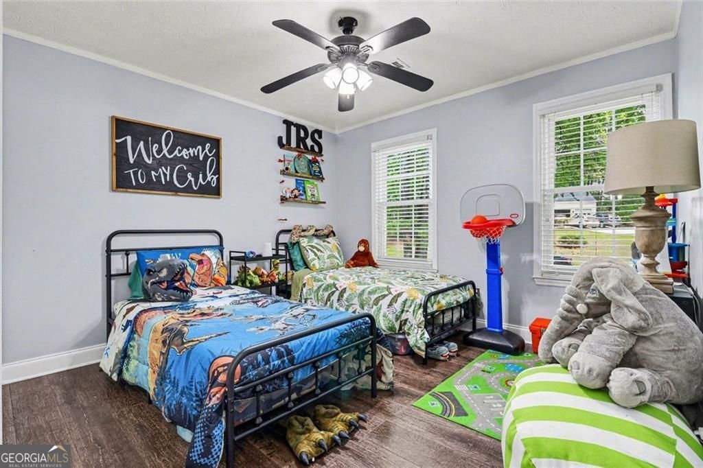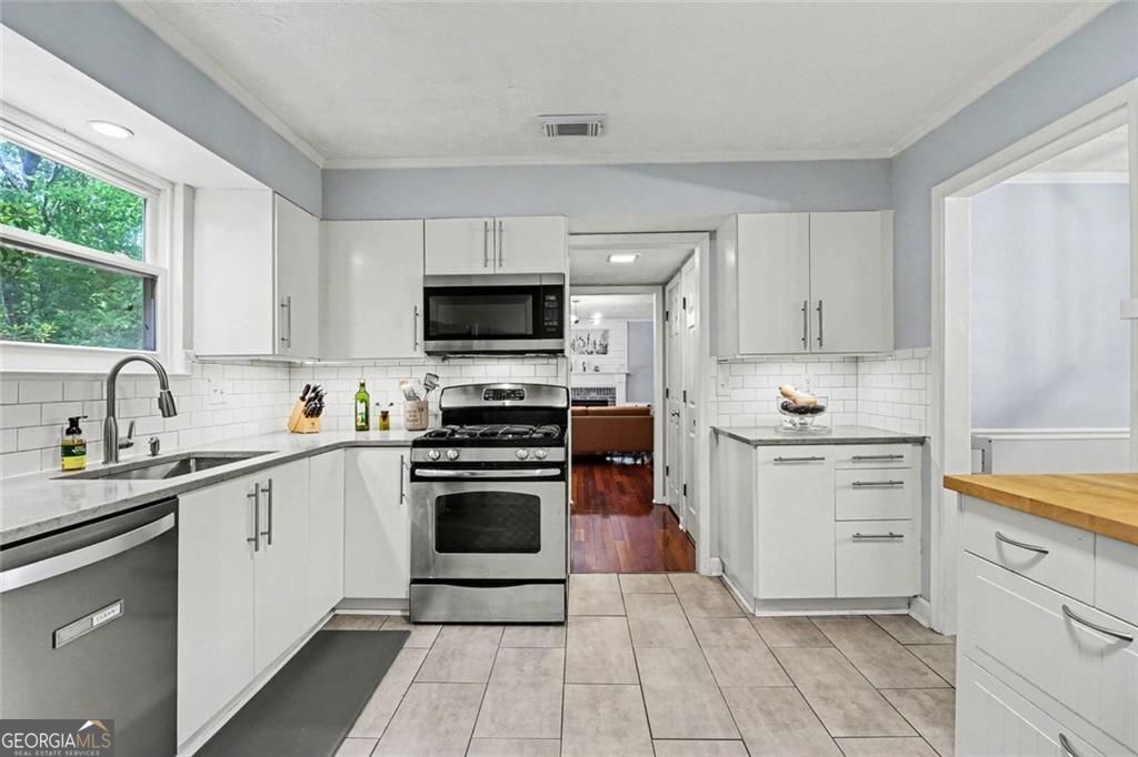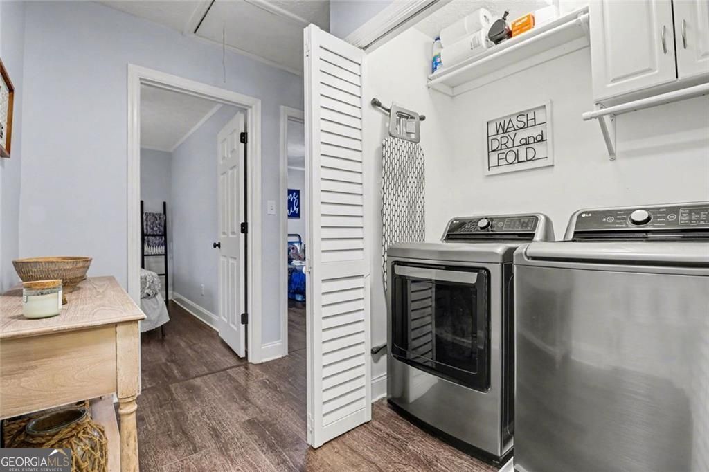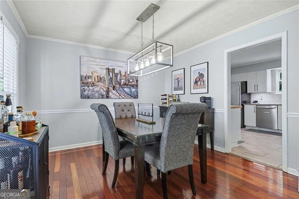 Charming jewel in Roswells desirable Barrington Farms neighborhood. The main level welcomes you with a spacious foyer leading to a bright living room that opens to a fireside family room-an ideal layout for entertaining. The updated kitchen features white cabinetry, quartz countertops, tile backsplash, stainless steel appliances (gas range, microwave), a coffee bar, abundant counter space and ample cabinets. A light-filled dining room with chair molding and modern lighting, plus an updated powder room, complete the main floor. Upstairs offers a large master suite with a custom walk-in closet and updated master bath, three secondary bedrooms, a hall bath, and convenient upstairs laundry. Beautiful hardwoods on the main level and easy-care laminate upstairs provide durable, low-maintenance flooring throughout. Neutral paint palette throughout. French doors from the family room open to a generous deck with decorative string lights-perfect for outdoor evenings. The finished basement provides flexible space for a playroom, rec room, gym, or hobby area. The private backyard features a firepit, partial fencing, and a garden shed painted to match the home. Prime location-minutes to GA-400, shopping, and dining, with neighborhood access to the Greenways miles of walking and biking trails. Easy commute to Historic Roswell, Downtown Alpharetta/Avalon, and Azalea Park. Fantastic value for a wonderful Roswell home.