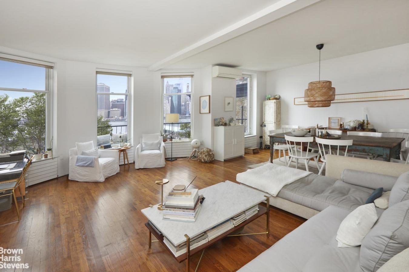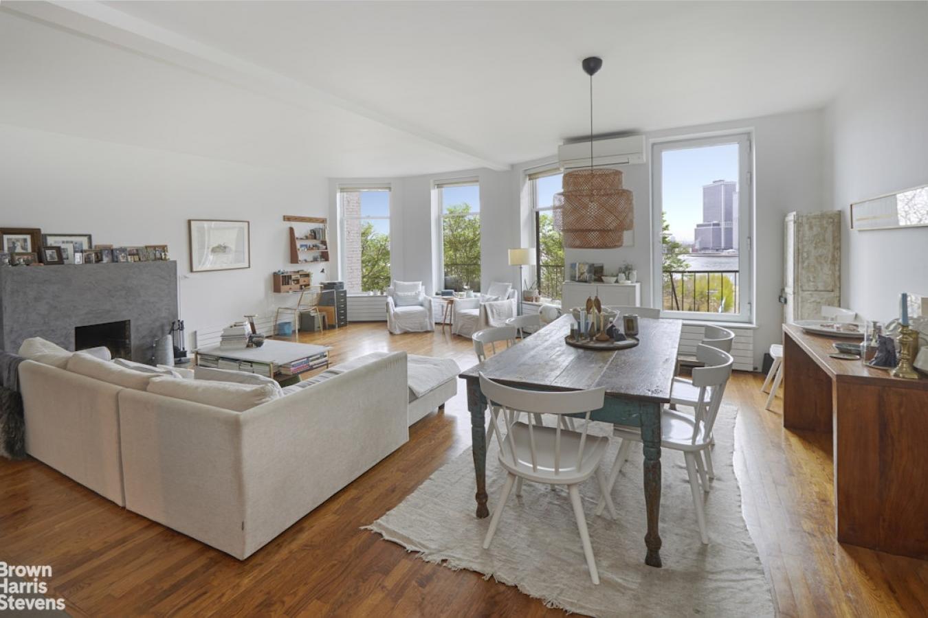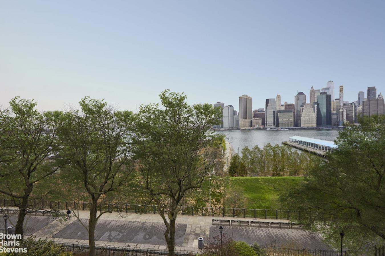 Situated high above the Brooklyn Heights Promenade and Brooklyn Bridge Park on one of the loveliest and most sought-after streets in Brooklyn Heights is this fabulous two-bedroom, two-bath floor-through beauty. With unobstructed views of the downtown Manhattan skyline and harbor, this is the perfect place to watch the ships pass by while relaxing in this quiet sanctuary. When you open the door to this meticulously renovated apartment, youre struck by the brilliant light filling the 25-foot-wide living/dining room. A wood-burning fireplace anchors this place for both quiet reflection and entertaining. The western exposure is wonderfully quiet due to the double-paned energy-saving windows. A walk-through galley kitchen just off the living area has been designed to not only take advantage of the view but also to make the best use of the high ceilings for maximal storage. It is equipped with a Sub-Zero refrigerator, a Bosch dishwasher, a Fisher & Paykel range, and an Asko washer and dryer. The adjacent butlers pantry is cleverly designed for additional storage and counter prep space. The apartment has a large primary bedroom with two floor-to-ceiling spacious closets. The good-sized second bedroom has a large storage closet as well as separate linen and utility closets. Both east-facing rooms have new city-quiet windows and lovely treetop views. The two bathrooms were both designed with space-saving pocket doors, one with a deep soaking tub and the other with a walk-in shower. There are hardwood floors, solid-core wooden doors, and abundant storage space throughout the apartment. A Mitsubishi split HVAC system for both heating and cooling provides comfort. 190 Columbia Heights, located in the center of this historical Brooklyn neighborhood, is a walk-up cooperative building with 5 floor-through units. You will be both charmed and pleased by this wonderful home.