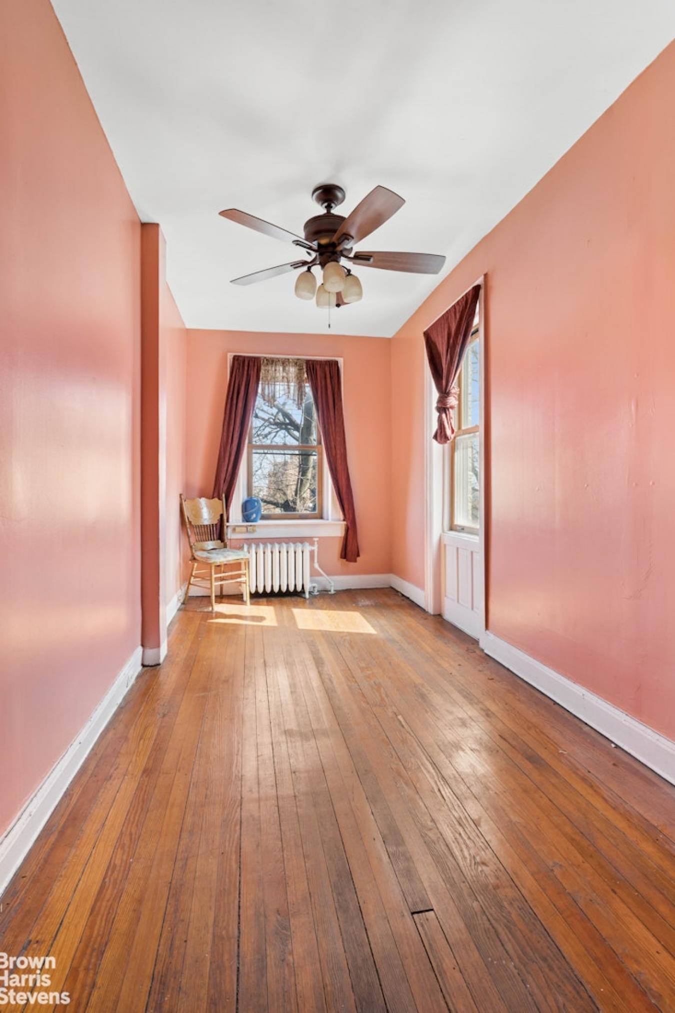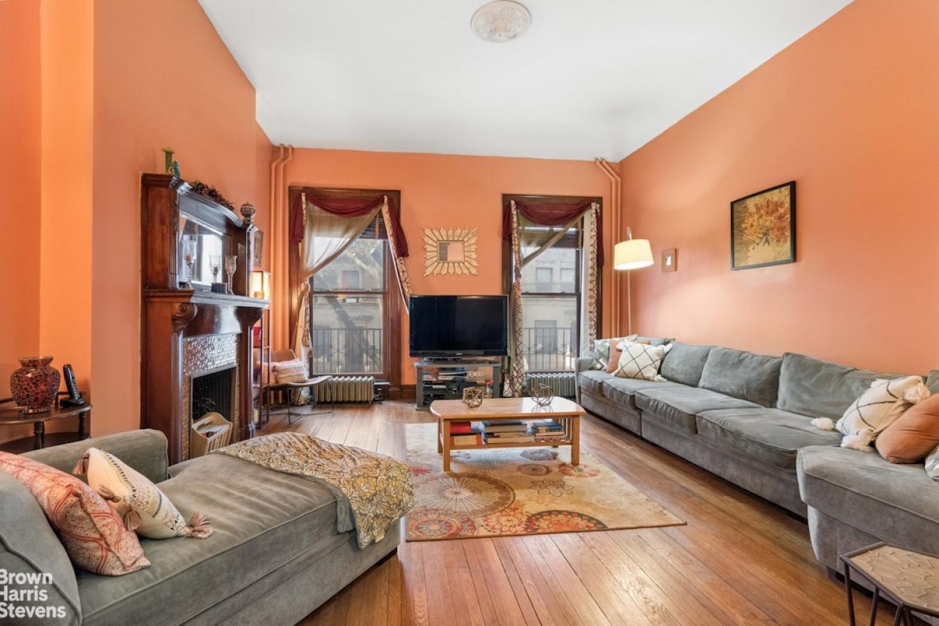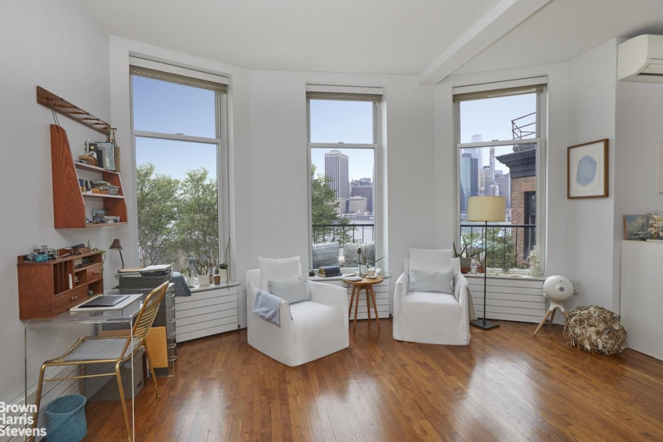 Situated high above the Brooklyn Heights Promenade and Brooklyn Bridge Park on one of the loveliest and most sought-after streets in Brooklyn Heights is this fabulous two-bedroom, two-bath floor-through beauty. With unobstructed views of the downtown Manhattan skyline and harbor, this is the perfect place to watch the ships pass by while relaxing in this quiet sanctuary. When you open the door to this meticulously renovated apartment, youre struck by the brilliant light filling the 25-foot-wide living/dining room. A wood-burning fireplace anchors this place for both quiet reflection and entertaining. The western exposure is wonderfully quiet due to the double-paned energy-saving windows. A walk-through galley kitchen just off the living area has been designed to not only take advantage of the view but also to make the best use of the high ceilings for maximal storage. It is equipped with a Sub-Zero refrigerator, a Bosch dishwasher, a Fisher & Paykel range, and an Asko washer and dryer. The adjacent butlers pantry is cleverly designed for additional storage and counter prep space. The apartment has a large primary bedroom with two floor-to-ceiling spacious closets. The good-sized second bedroom has a large storage closet as well as separate linen and utility closets. Both east-facing rooms have new city-quiet windows and lovely treetop views. The two bathrooms were both designed with space-saving pocket doors, one with a deep soaking tub and the other with a walk-in shower. There are hardwood floors, solid-core wooden doors, and abundant storage space throughout the apartment. A Mitsubishi split HVAC system for both heating and cooling provides comfort. 190 Columbia Heights, located in the center of this historical Brooklyn neighborhood, is a walk-up cooperative building with 5 floor-through units. You will be both charmed and pleased by this wonderful home.