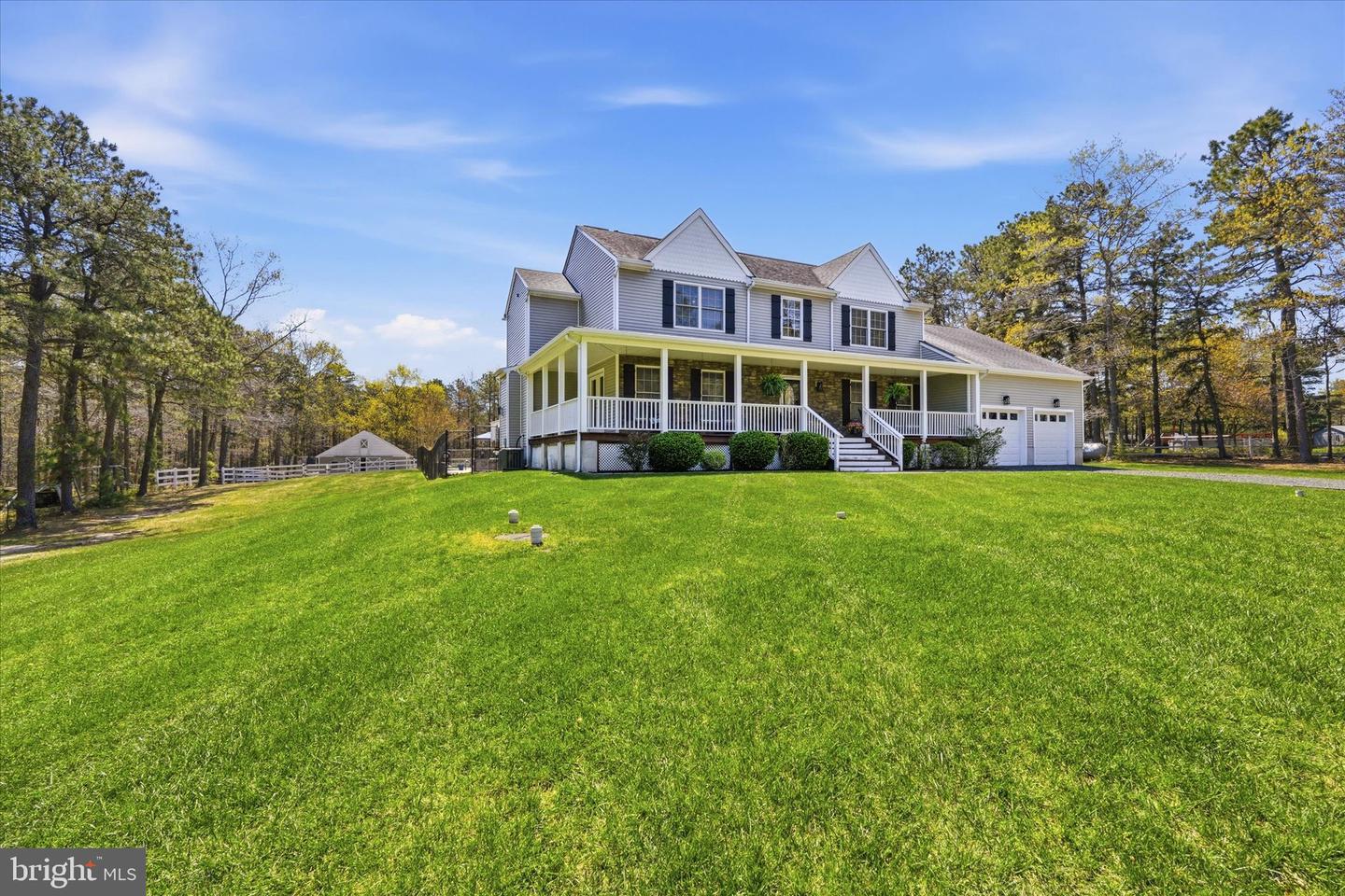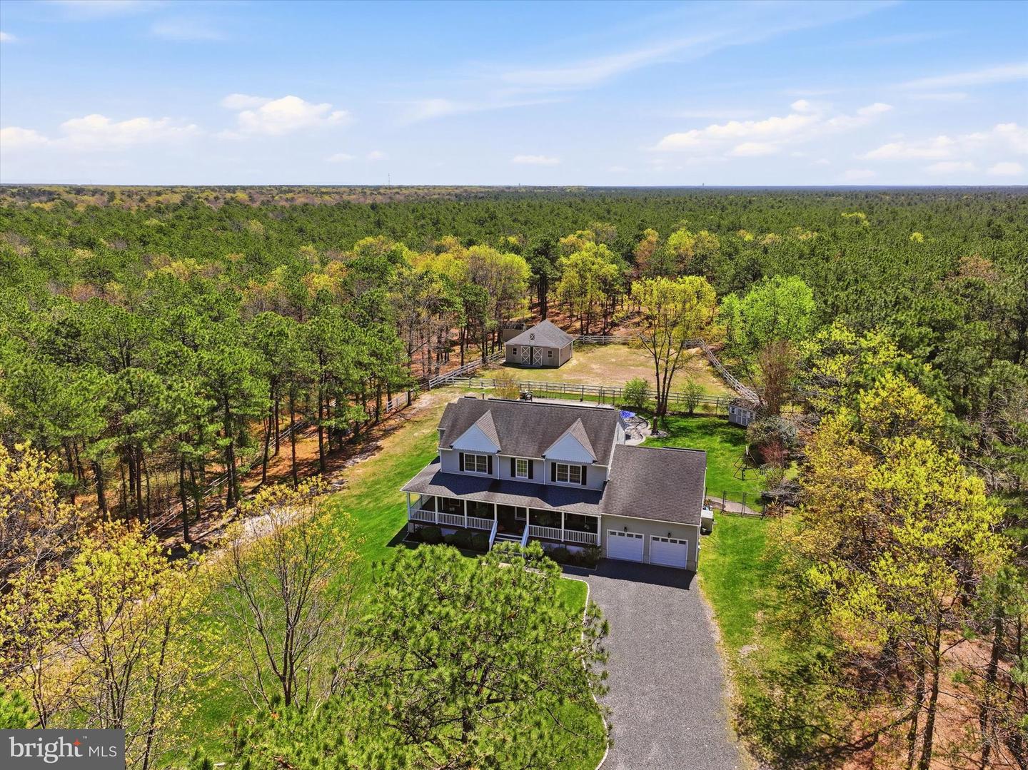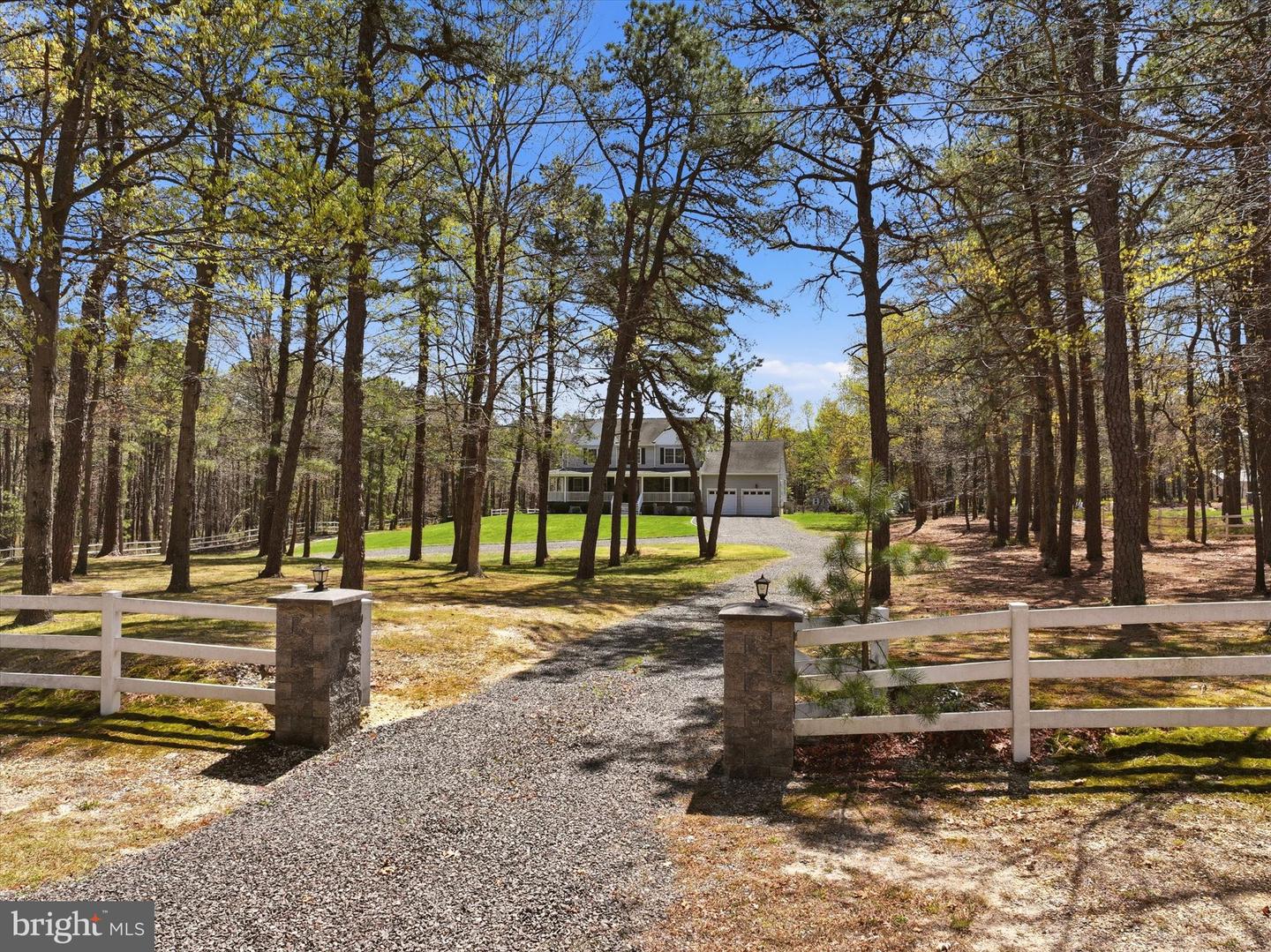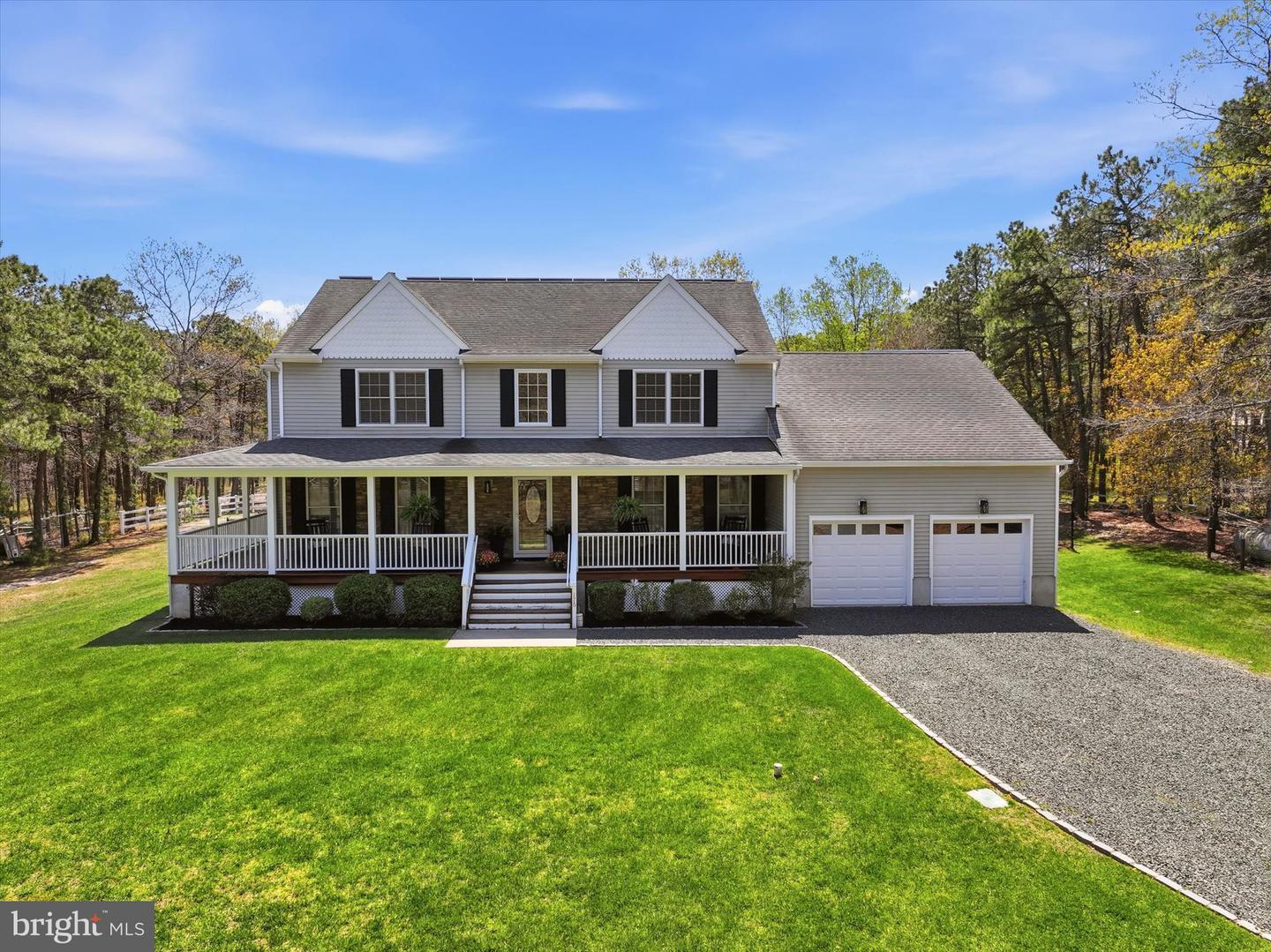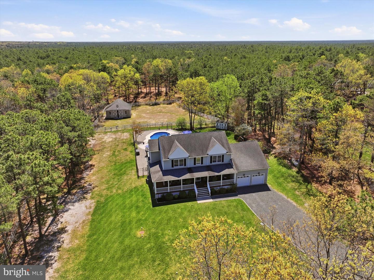 Brand new to the market! Luxury farmhouse nestled on 3.42 acres of pristine Pinelands offering the perfect blend of privacy, and nature. This spectacular residence merges elegant charm with modern finishes, focusing on indoor-outdoor living, stunning forest views, and spacious acreage. This lush relaxing environment boasts a heated inground pool and a 3 stall tack room for your horses. Front yard entry gates lead to the circular driveway and charming wrap around porch. Enter into the foyer with a NEW grand staircase, NEW rich hickory hardwood floors & NEW crown moulding throughout. Entirely NEW kitchen with pearly white quartz countertops, and endless cabinets. Living room showcases NEW French doors to the porch. The NEW family room boasts a decorative cozy fireplace with sliders to the sundeck. Bonus... a NEW first floor bedroom & full bath. Upstairs is all NEW including the main bedroom suite with lux soaking tub/double quartz vanity/shower/ WIC! Come preview the dream!!! Extras include: Solar panels are owned (no payment) NEW pool pump, NEW pool heater, NEW shutters, NEW crown & base moulding, New fans & lighting, All new pavers around the pool, pub table, new landscaping, and so much more...WOW!