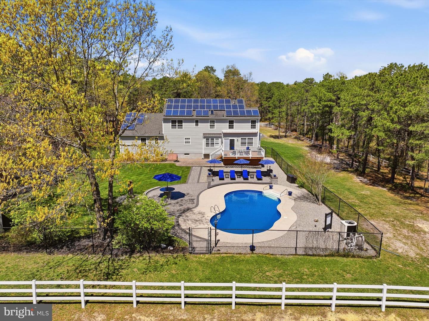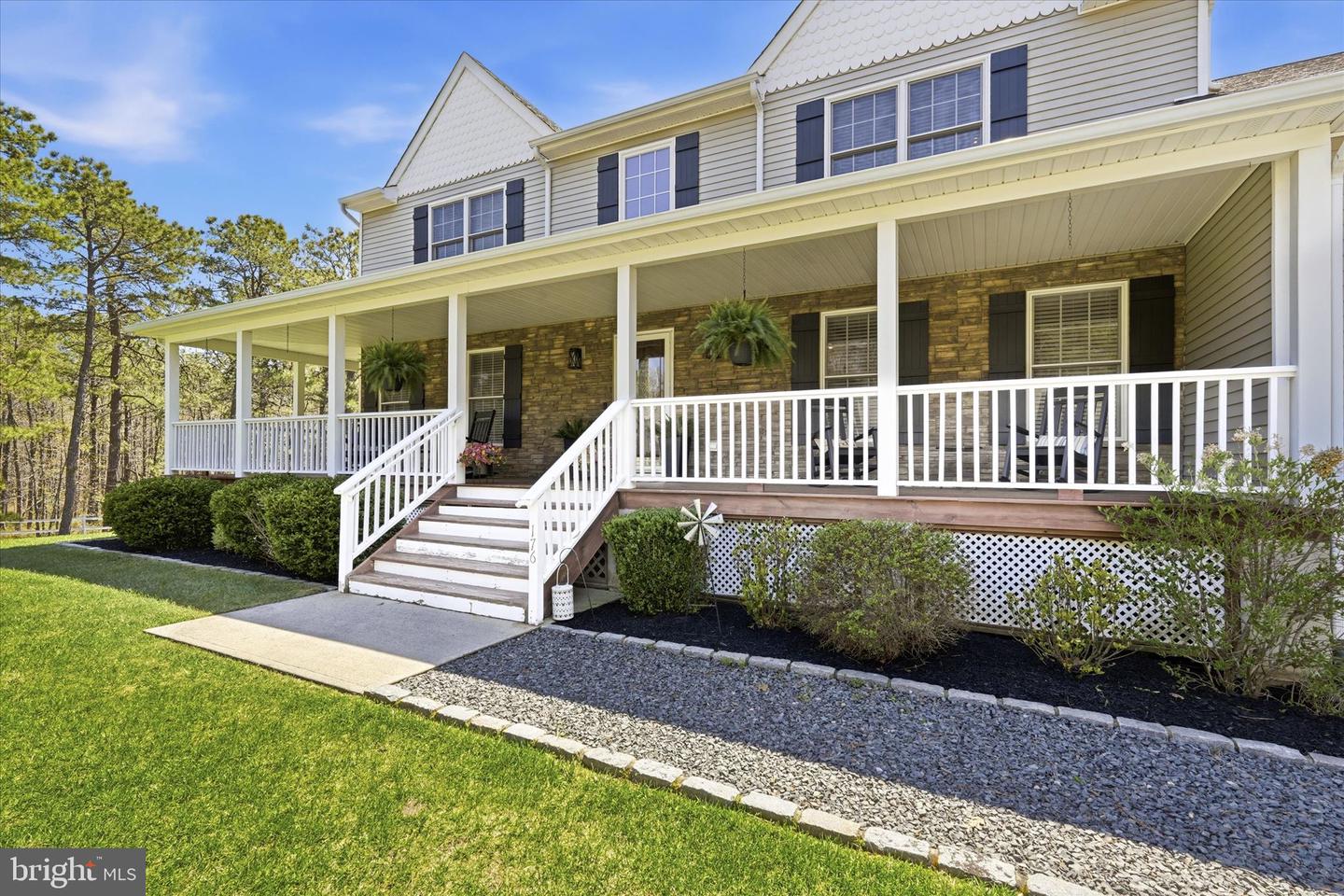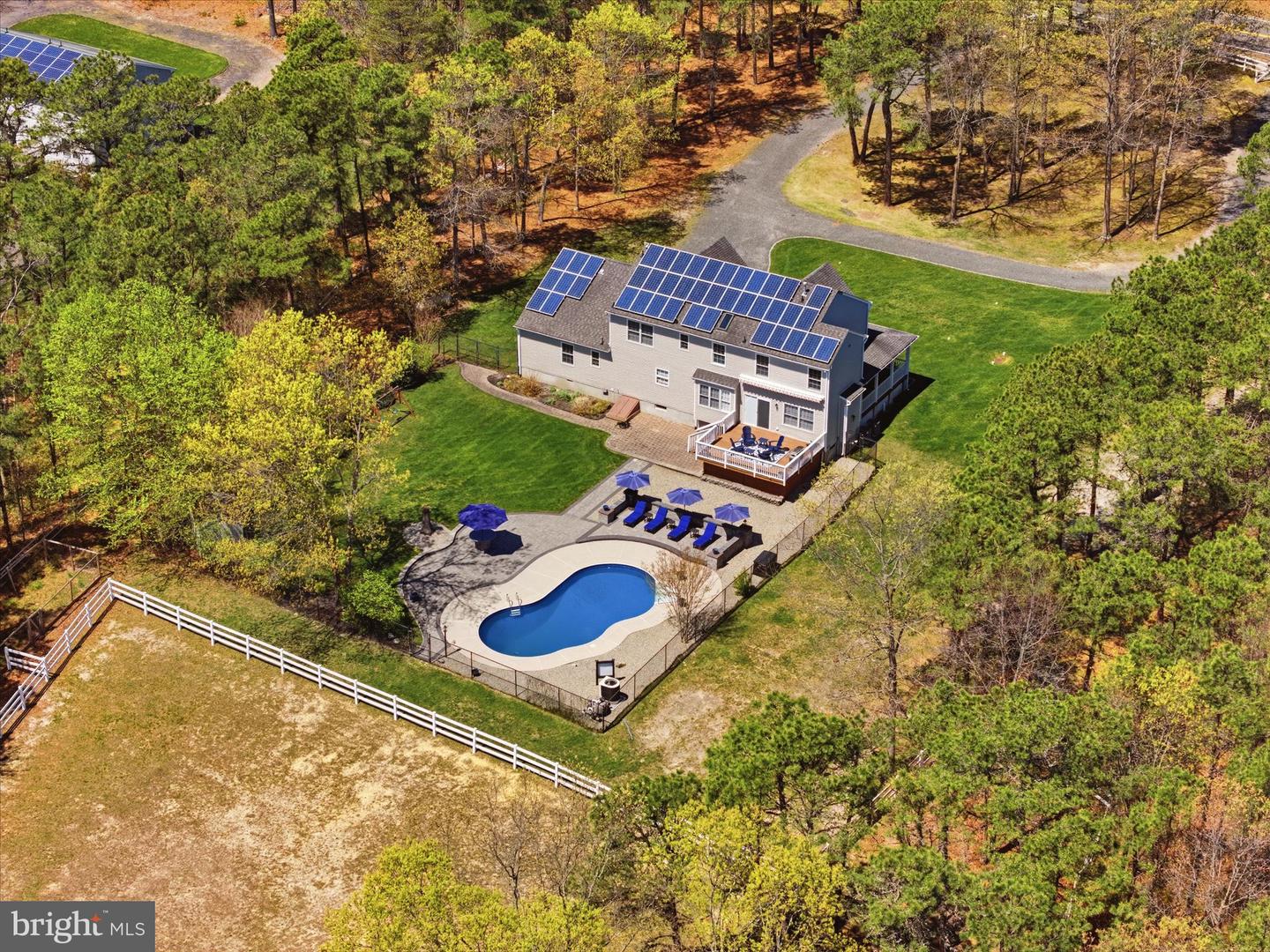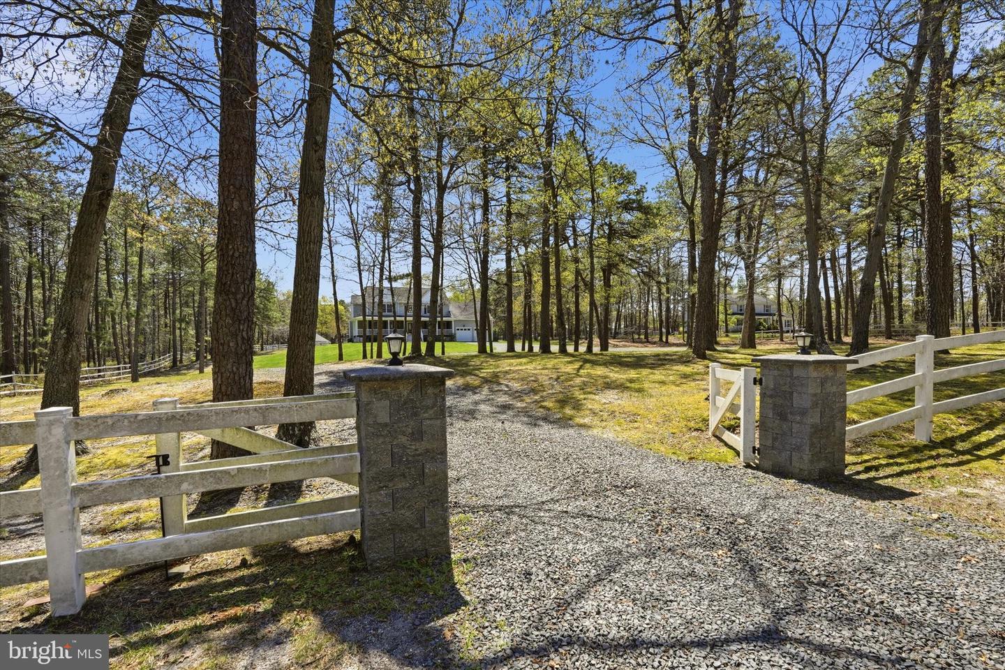 Brand new to the market! Luxury farmhouse nestled on 3.42 acres of pristine Pinelands offering the perfect blend of privacy, and nature. This spectacular residence merges elegant charm with modern finishes, focusing on indoor-outdoor living, stunning forest views, and spacious acreage. This lush relaxing environment boasts a heated inground pool and a 3 stall tack room for your horses. Front yard entry gates lead to the circular driveway and charming wrap around porch. Enter into the foyer with a NEW grand staircase, NEW rich hickory hardwood floors & NEW crown moulding throughout. Entirely NEW kitchen with pearly white quartz countertops, and endless cabinets. Living room showcases NEW French doors to the porch. The NEW family room boasts a decorative cozy fireplace with sliders to the sundeck. Bonus... a NEW first floor bedroom & full bath. Upstairs is all NEW including the main bedroom suite with lux soaking tub/double quartz vanity/shower/ WIC! Come preview the dream!!! Extras include: Solar panels are owned (no payment) NEW pool pump, NEW pool heater, NEW shutters, NEW crown & base moulding, New fans & lighting, All new pavers around the pool, pub table, new landscaping, and so much more...WOW!