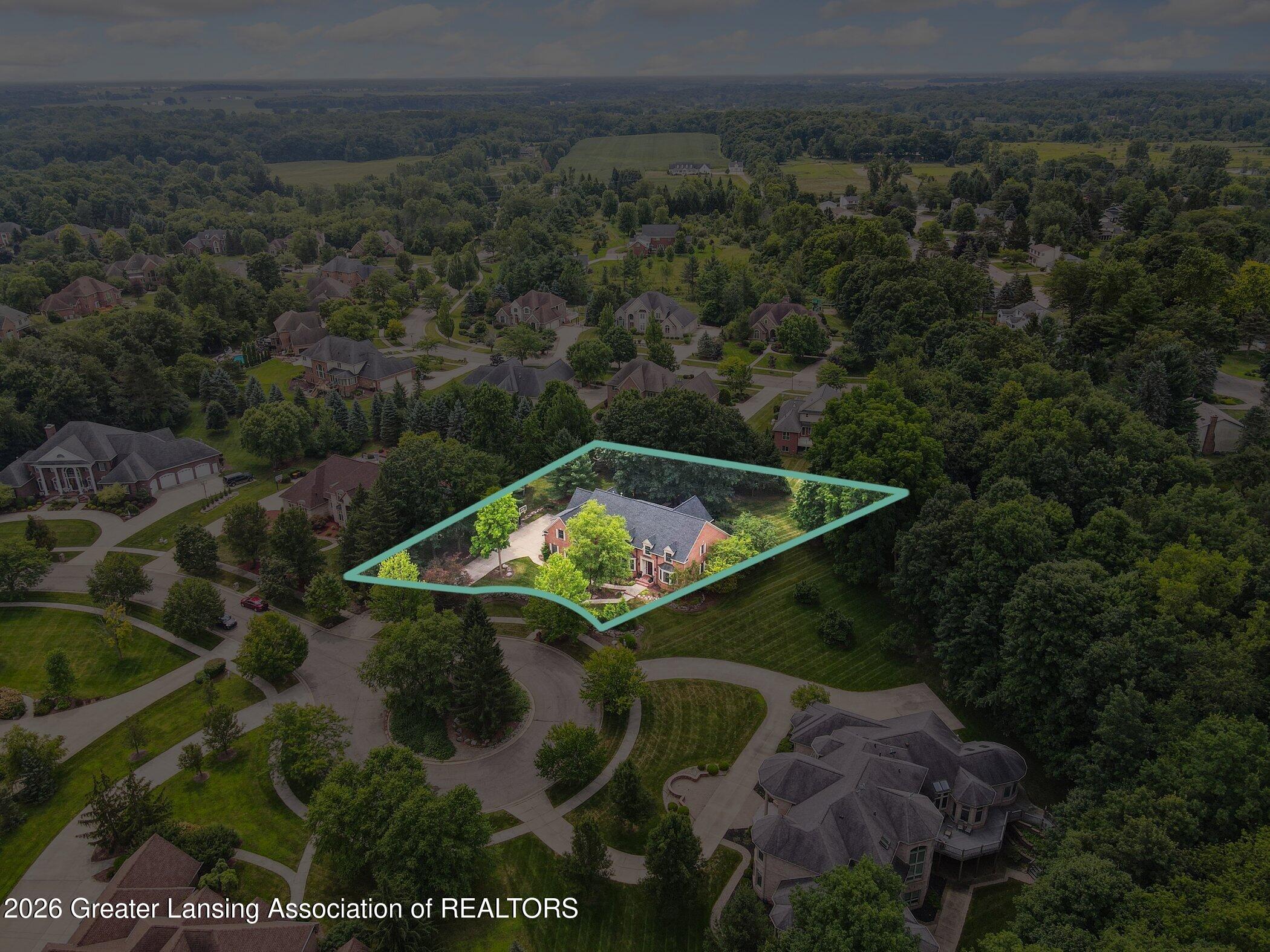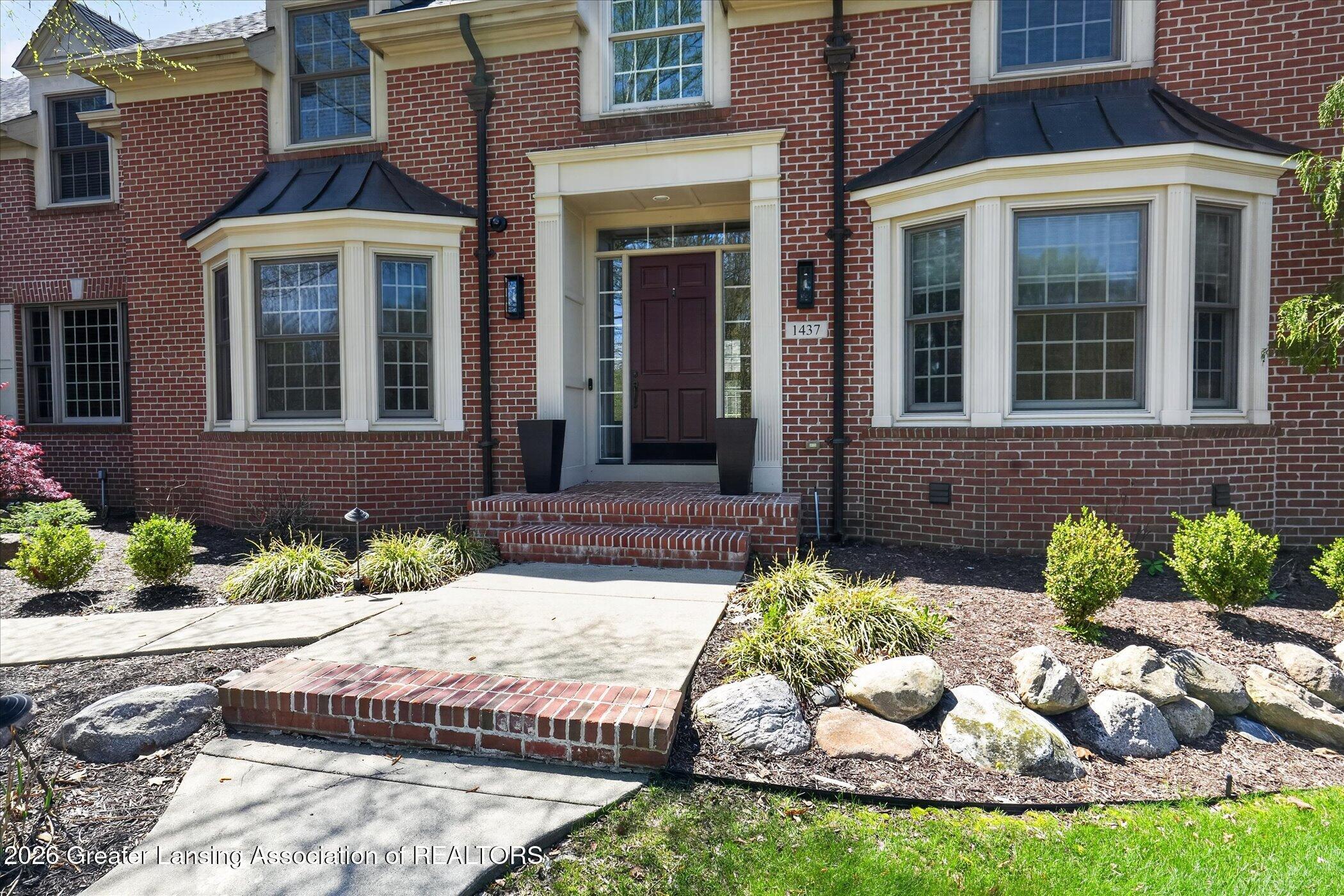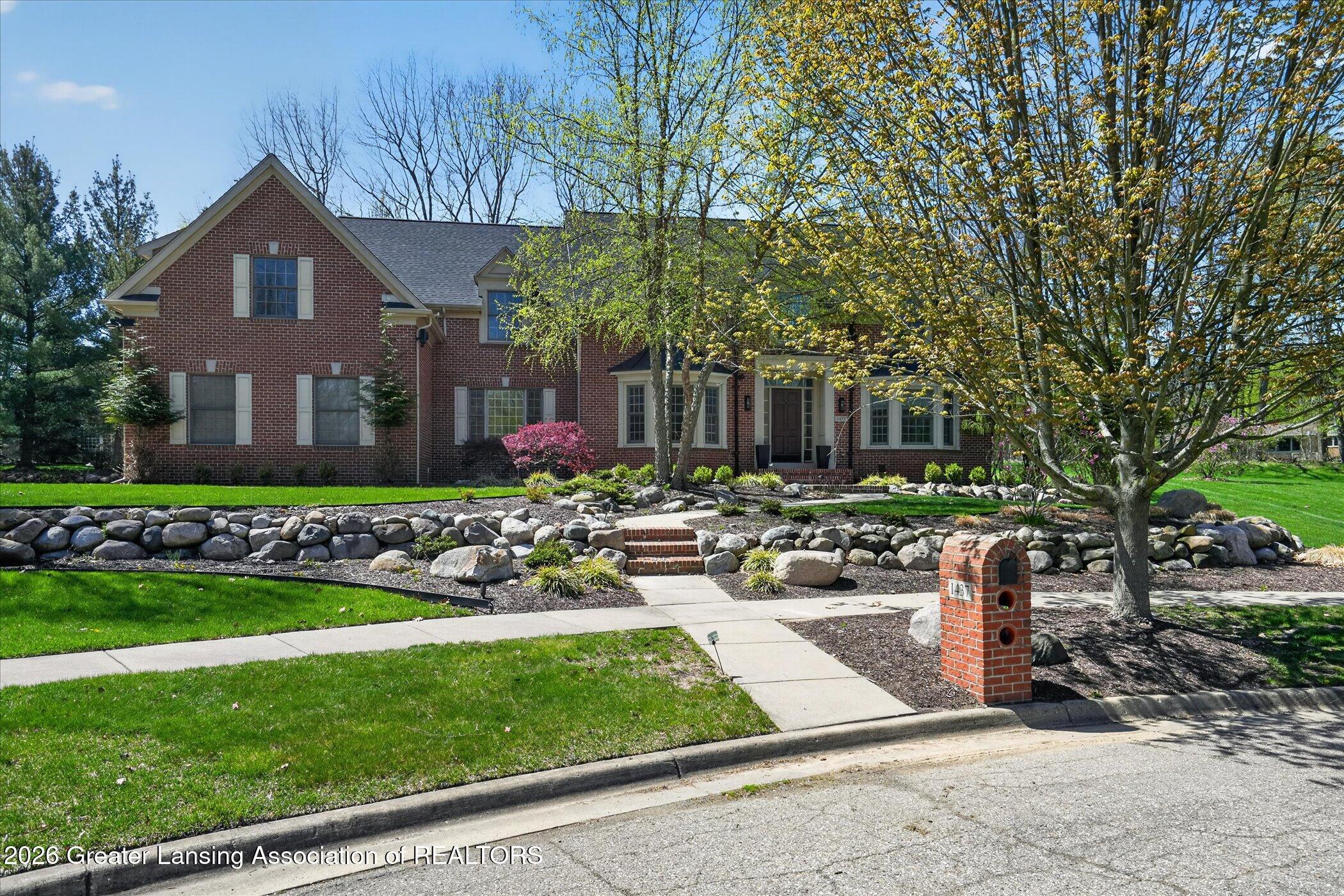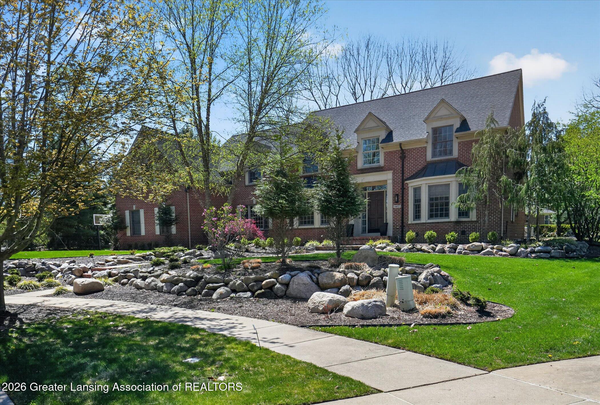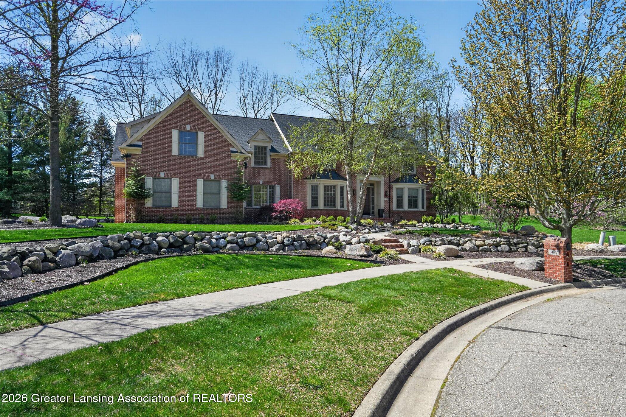Welcome to 1437 Wandering Way, an exceptional 5-bedroom, 5.5-bath, all brick executive style home tucked away on a private cul-de-sac in the highly sought-after Ember Oaks subdivision, within the award-winning Okemos School District. This impressive residence seamlessly blends timeless elegance with modern updates. Over 300,000 in tasteful updates since 2023! To name a few, revamped landscaping, a brand-new roof, new furnace, fresh paint, new carpet, and updated lighting throughout. The first floor offers an ideal layout for both everyday living and entertaining, featuring a spacious eat-in chefs kitchen, a dramatic two-story great room with beamed ceilings and a gas fireplace, formal dining room, den, and convenient first-floor laundry. A private office with custom cabinetry provides the perfect work-from-home space. The luxurious first-floor primary suite is a true retreat, boasting a spa-like ensuite with a two-sided gas fireplace and an expansive walk-in closet. Upstairs, youll find four generously sized bedrooms, each with its own full bathroom and walk-in closet, along with a versatile bonus room complete with a wet bar and gas fireplace, perfect for entertaining or additional living space. The finished lower level elevates this home even further, offering a full bathroom, expansive living area, in-home theater, bar area, an 80k fully encapsulated dedicated cigar room addition in 2024, and an enormous storage space. Step outside to enjoy the large, private, tree-lined lot with mature landscaping, a brick-paved patio, screened-in porch, and hot tub, an ideal setting for relaxing or hosting gatherings. This extraordinary home offers privacy, luxury, and comfort in one of Okemos most prestigious neighborhoods. A must see! Call today for your private tour.
