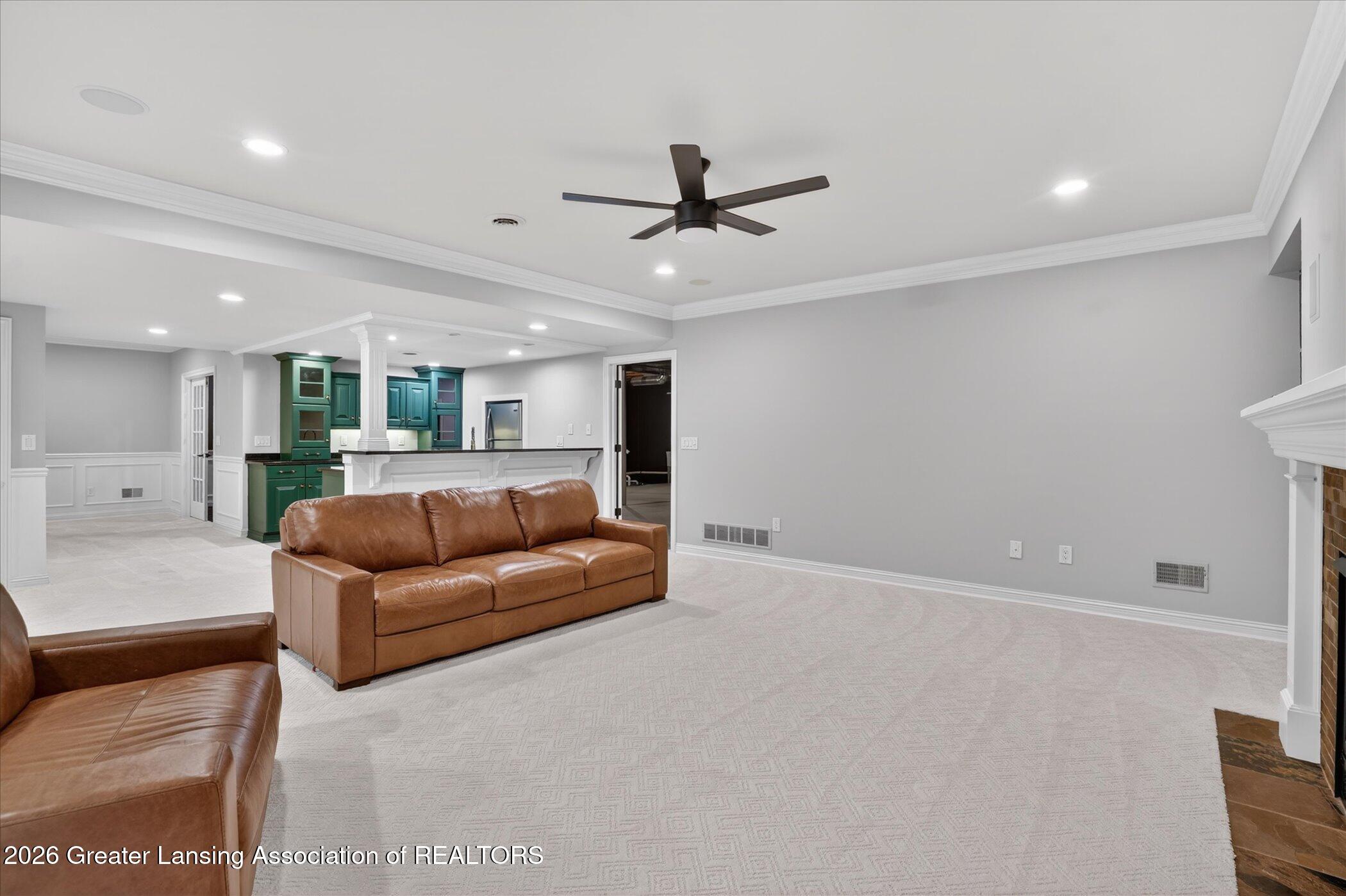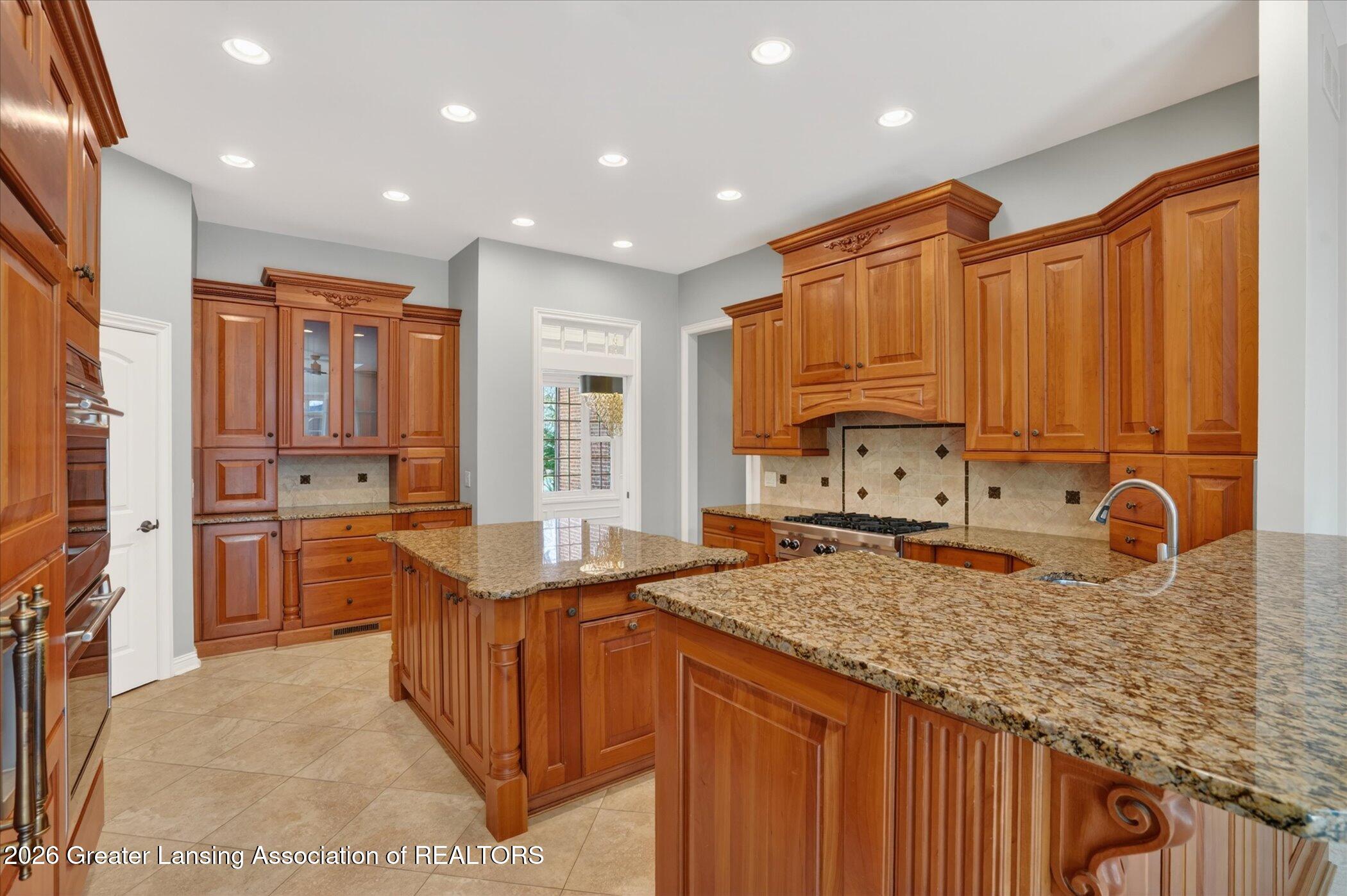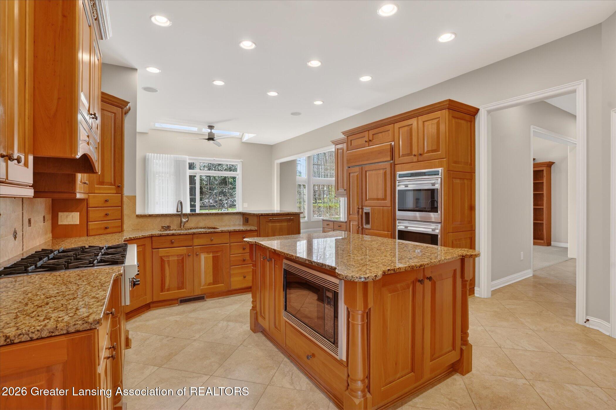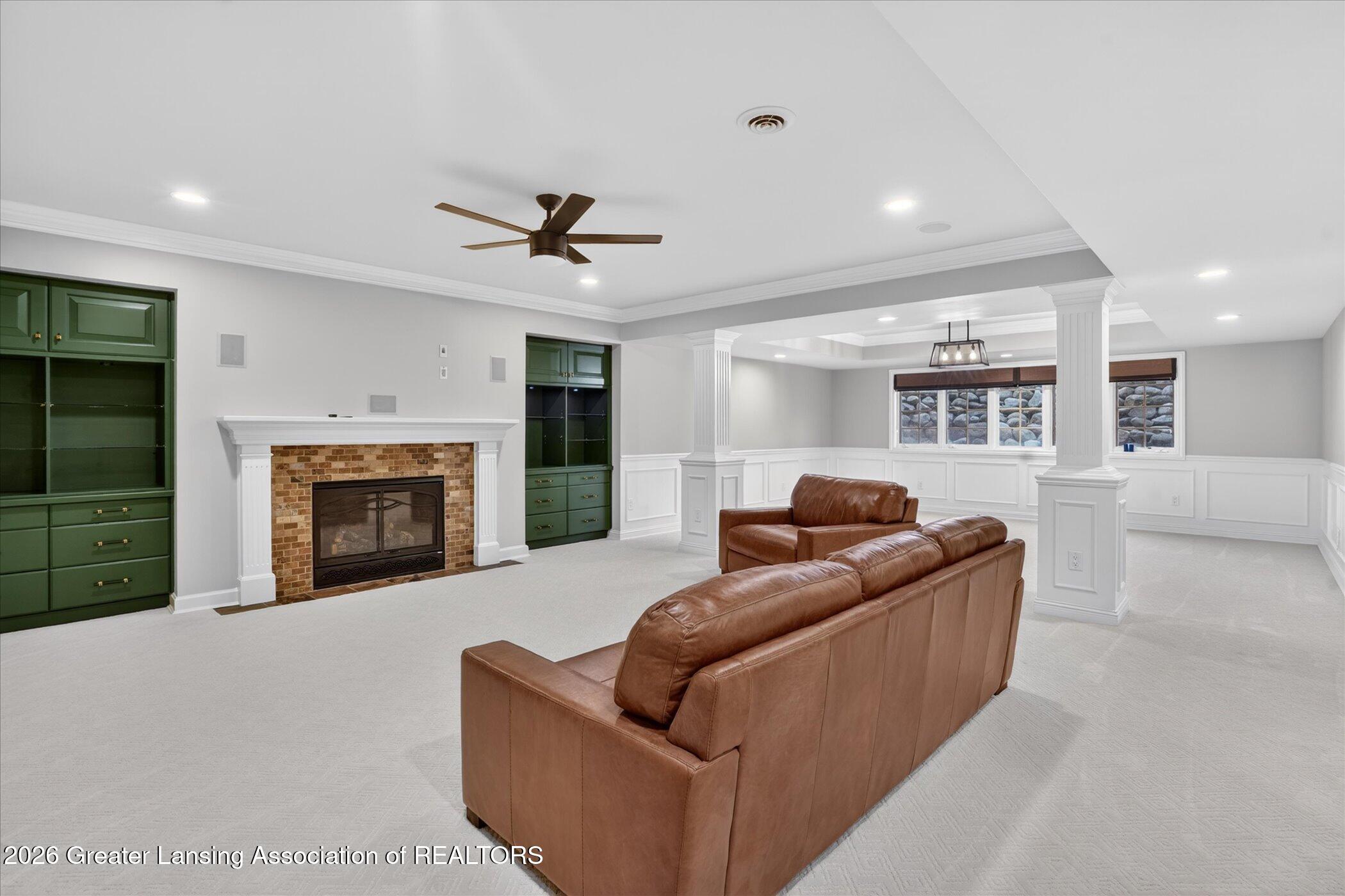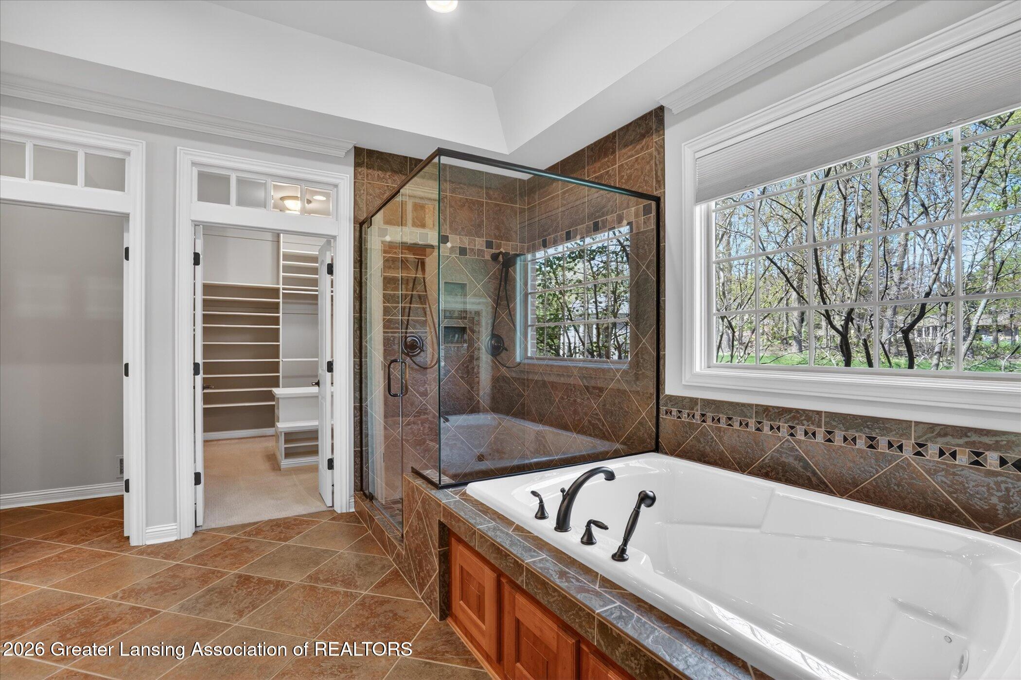 Welcome to 1437 Wandering Way, an exceptional 5-bedroom, 5.5-bath, all brick executive style home tucked away on a private cul-de-sac in the highly sought-after Ember Oaks subdivision, within the award-winning Okemos School District. This impressive residence seamlessly blends timeless elegance with modern updates. Over 300,000 in tasteful updates since 2023! To name a few, revamped landscaping, a brand-new roof, new furnace, fresh paint, new carpet, and updated lighting throughout. The first floor offers an ideal layout for both everyday living and entertaining, featuring a spacious eat-in chefs kitchen, a dramatic two-story great room with beamed ceilings and a gas fireplace, formal dining room, den, and convenient first-floor laundry. A private office with custom cabinetry provides the perfect work-from-home space. The luxurious first-floor primary suite is a true retreat, boasting a spa-like ensuite with a two-sided gas fireplace and an expansive walk-in closet. Upstairs, youll find four generously sized bedrooms, each with its own full bathroom and walk-in closet, along with a versatile bonus room complete with a wet bar and gas fireplace, perfect for entertaining or additional living space. The finished lower level elevates this home even further, offering a full bathroom, expansive living area, in-home theater, bar area, an 80k fully encapsulated dedicated cigar room addition in 2024, and an enormous storage space. Step outside to enjoy the large, private, tree-lined lot with mature landscaping, a brick-paved patio, screened-in porch, and hot tub, an ideal setting for relaxing or hosting gatherings. This extraordinary home offers privacy, luxury, and comfort in one of Okemos most prestigious neighborhoods. A must see! Call today for your private tour.