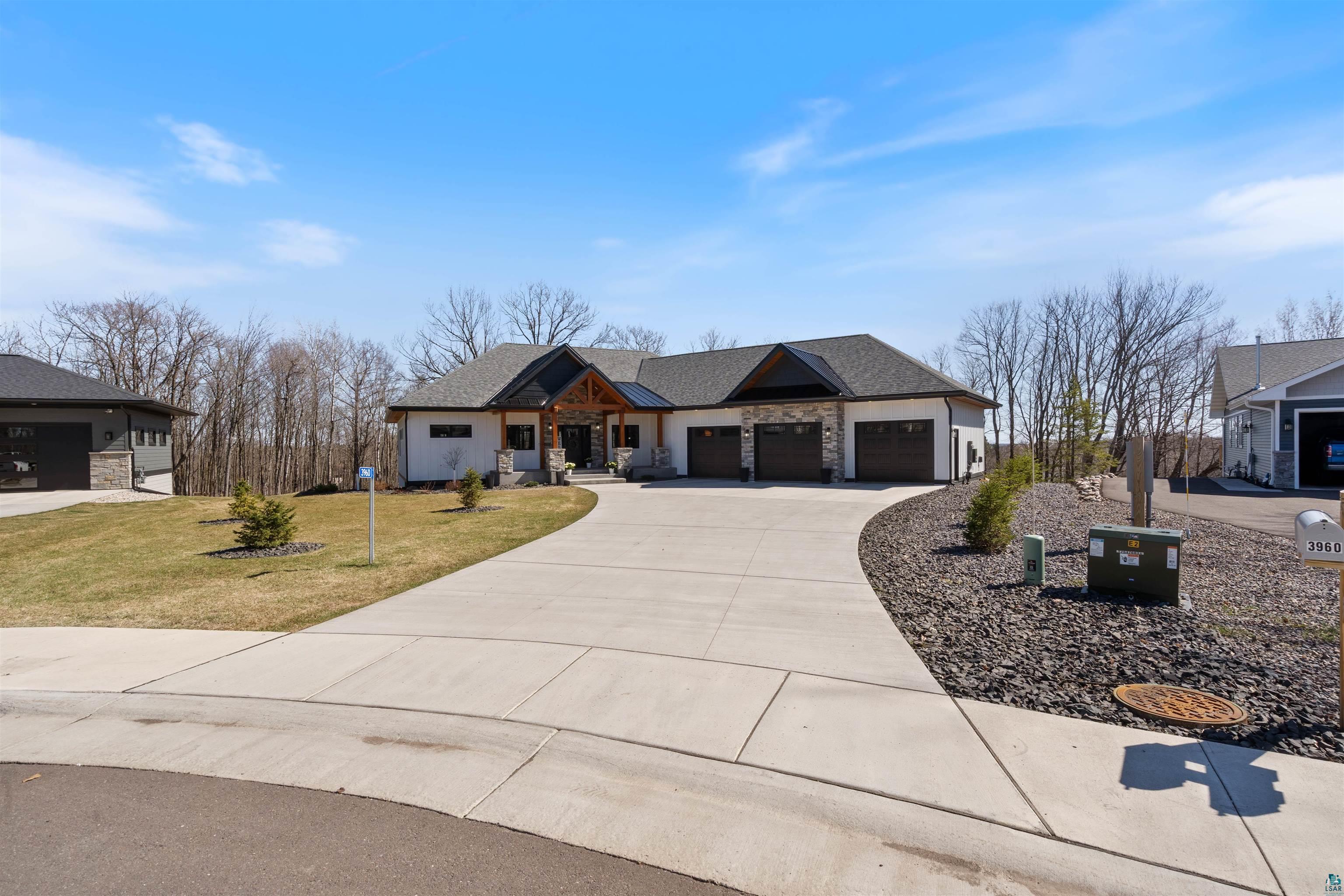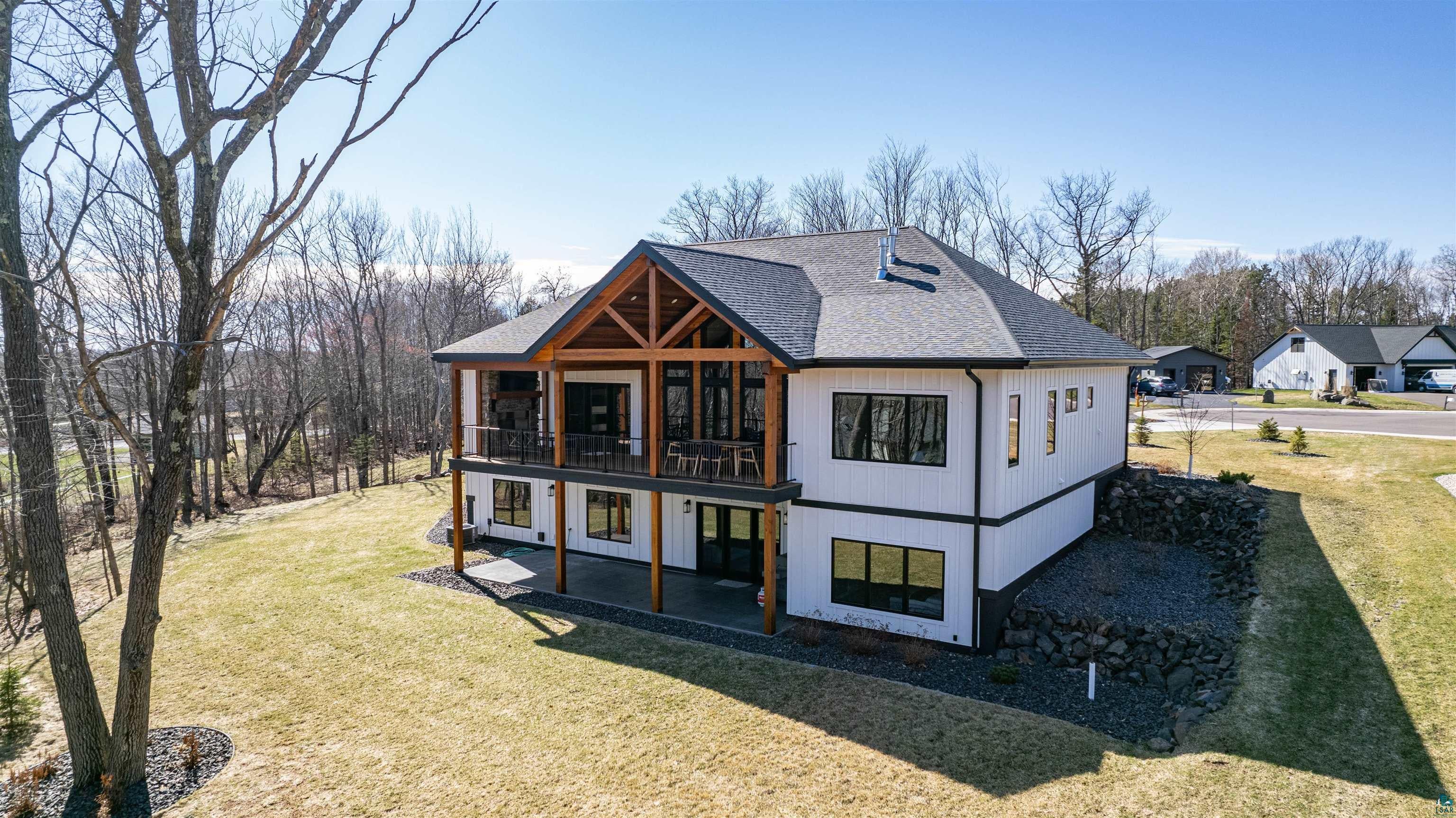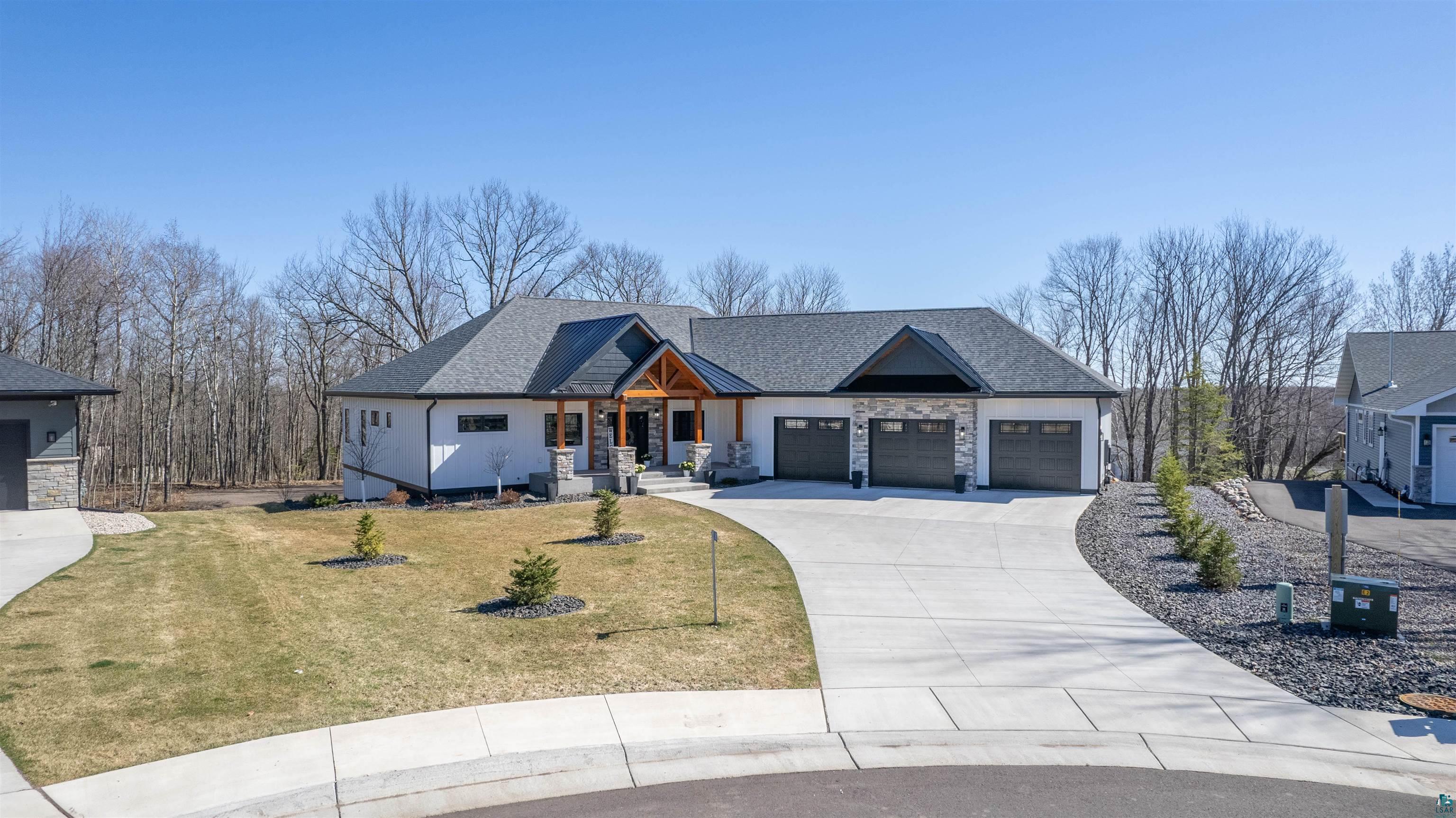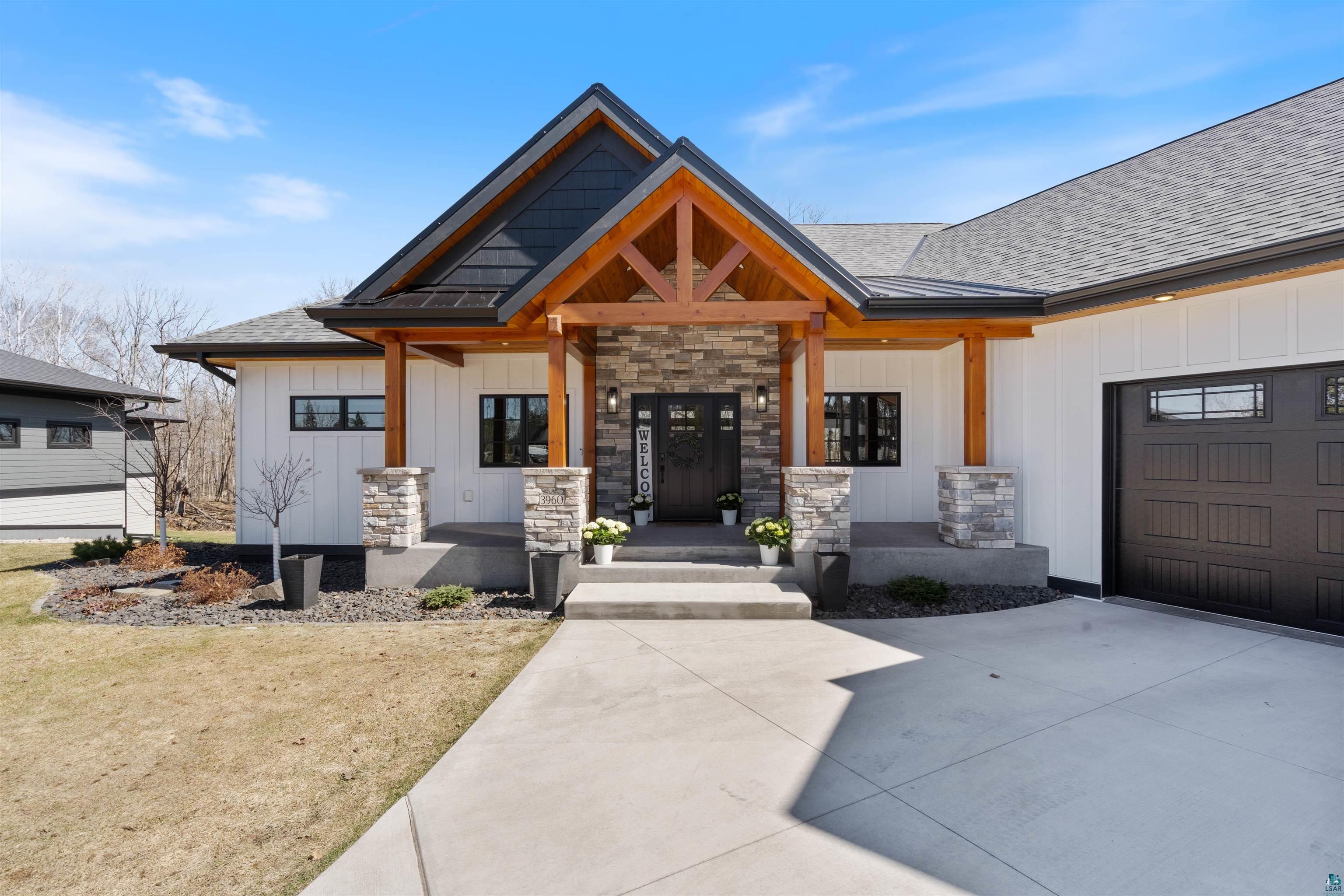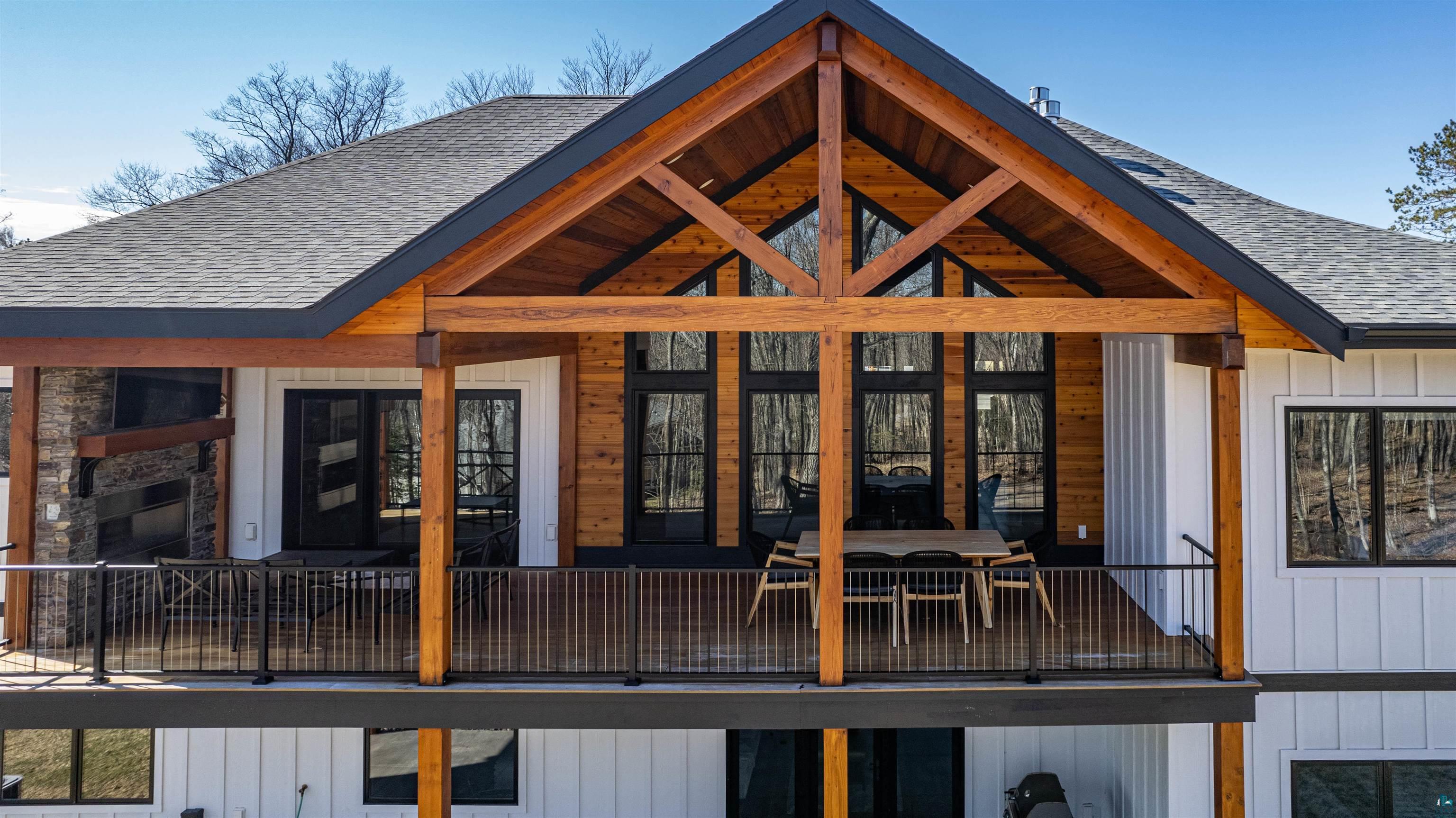 Experience the perfect blend of luxury, craftsmanship, and functionality in this stunning 4-bedroom, 4-bath home. From the moment you arrive, the impressive timber-framed entry and natural stone exterior create a warm yet sophisticated first impression, complemented by cedar soffits and durable LP Smart siding. Inside, the home is filled with natural light thanks to oversized Pella windows that showcase peaceful backyard views. The open-concept floor plan is thoughtfully designed for both everyday living and entertaining, anchored by a spacious custom kitchen featuring a large center island, abundant cabinetry, and an expansive walk-in pantry. The living room boasts a soaring vaulted ceiling, creating a bright and inviting atmosphere. A generously sized mudroom offers excellent storage and organization, while the massive 40 x 30 garage provides plenty of space for vehicles, equipment, and more. The walkout lower level is designed for comfort and versatility, complete with in-floor heating and tile flooring throughout. Entertain with ease at the custom-built bar, or take advantage of the additional flex room, perfect for a home office, fitness space, or extra storage. Convenience is key with two laundry rooms, including one located in the primary suites closet and another in the lower level. Step outside to a backyard built for enjoyment, featuring a versatile pad ready for a hockey rink, fire pit area, or additional outdoor living space. The covered deck is a true highlight, showcasing natural stone finishes, a cozy gas fireplace, and ample room for dining and relaxing year-round. Finished with a concrete driveway and packed with high-end details throughout, this home offers exceptional comfort, style, and space for modern living.
