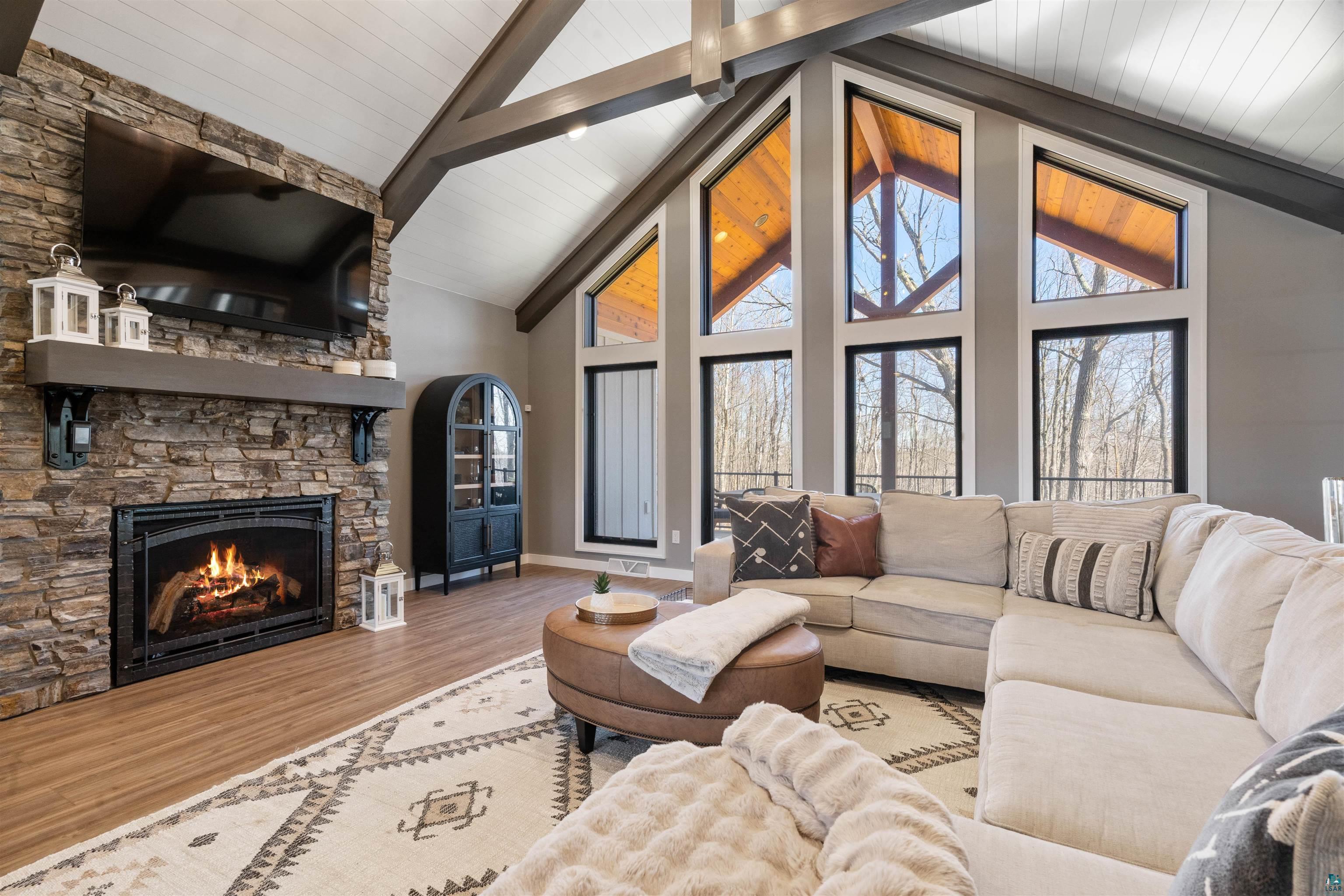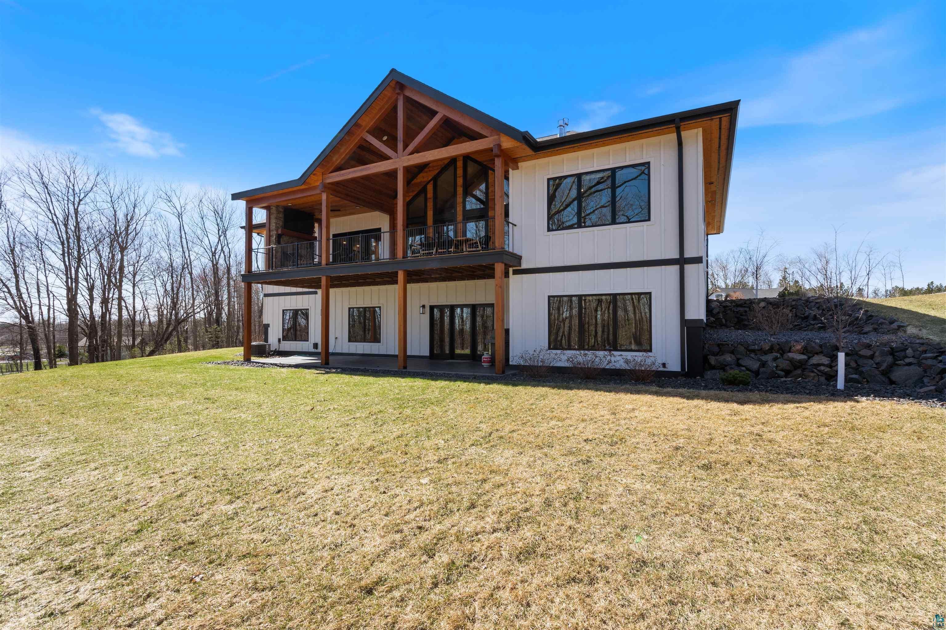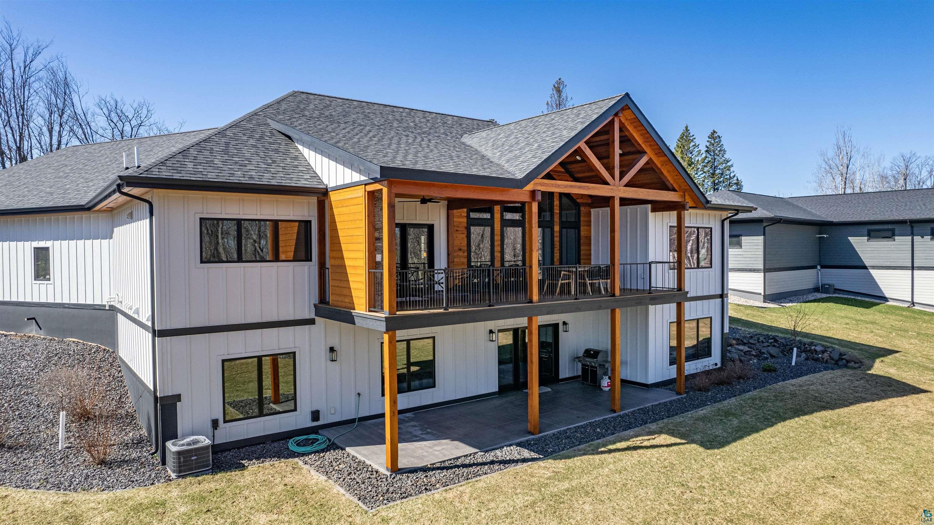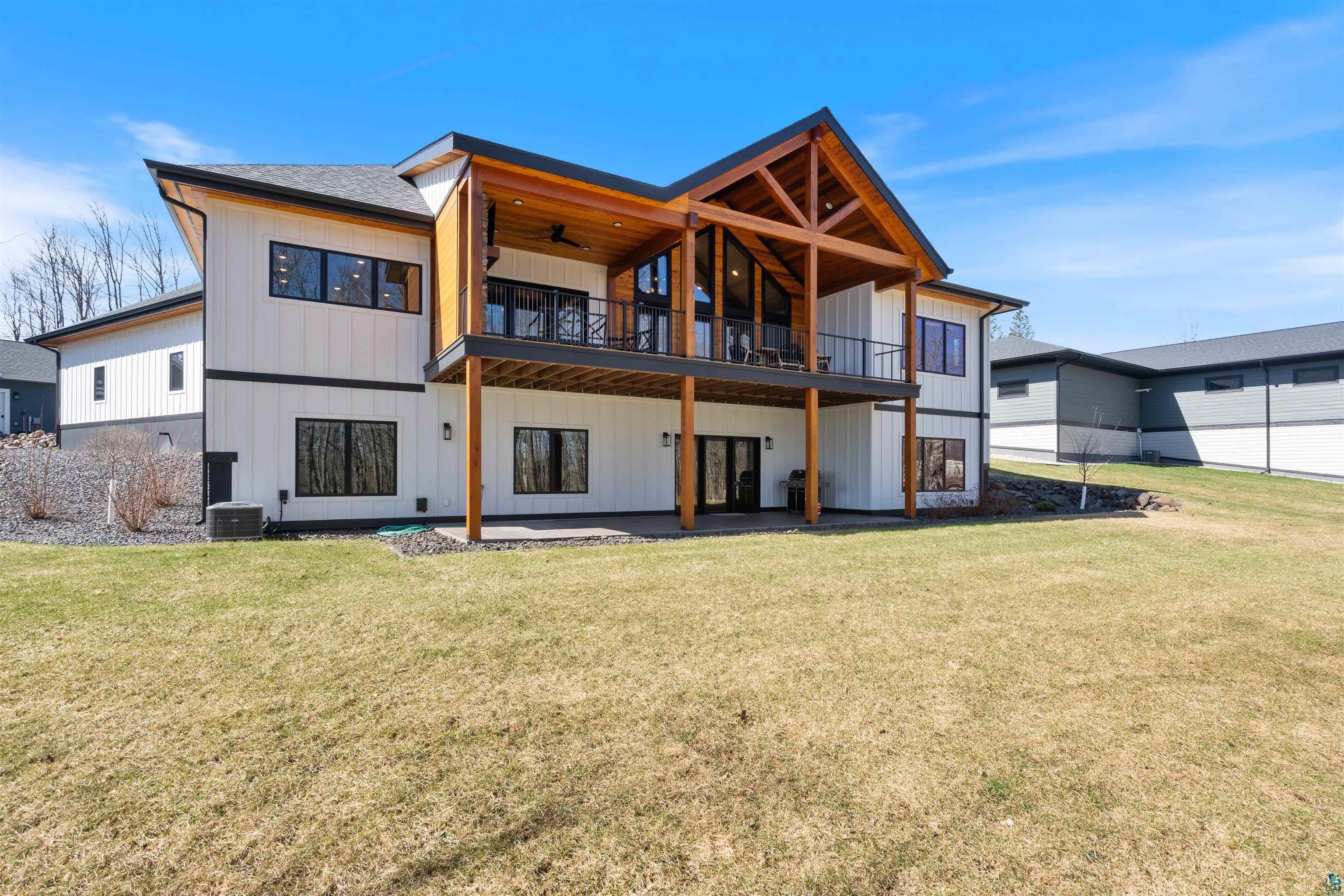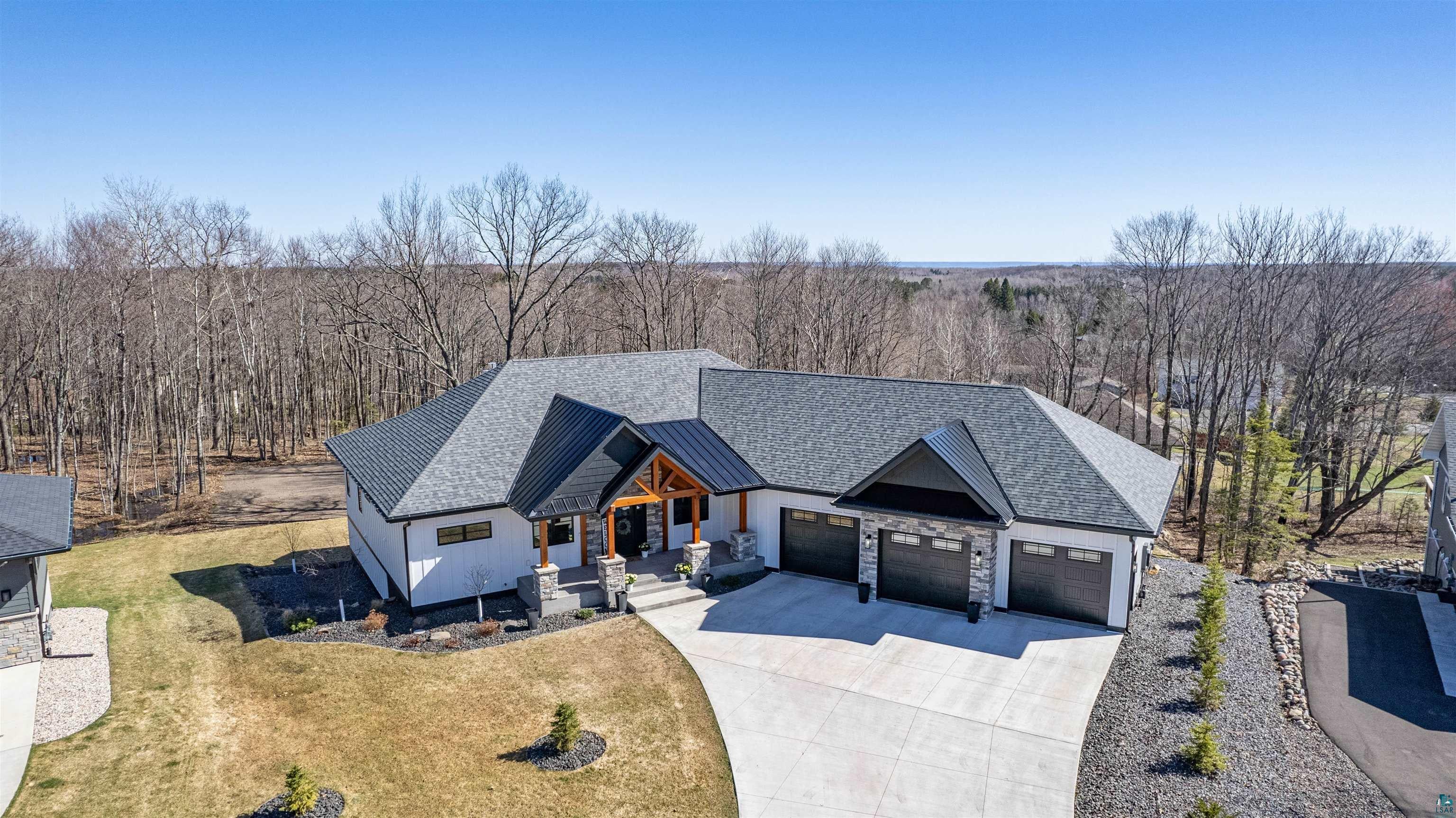 Experience the perfect blend of luxury, craftsmanship, and functionality in this stunning 4-bedroom, 4-bath home. From the moment you arrive, the impressive timber-framed entry and natural stone exterior create a warm yet sophisticated first impression, complemented by cedar soffits and durable LP Smart siding. Inside, the home is filled with natural light thanks to oversized Pella windows that showcase peaceful backyard views. The open-concept floor plan is thoughtfully designed for both everyday living and entertaining, anchored by a spacious custom kitchen featuring a large center island, abundant cabinetry, and an expansive walk-in pantry. The living room boasts a soaring vaulted ceiling, creating a bright and inviting atmosphere. A generously sized mudroom offers excellent storage and organization, while the massive 40 x 30 garage provides plenty of space for vehicles, equipment, and more. The walkout lower level is designed for comfort and versatility, complete with in-floor heating and tile flooring throughout. Entertain with ease at the custom-built bar, or take advantage of the additional flex room, perfect for a home office, fitness space, or extra storage. Convenience is key with two laundry rooms, including one located in the primary suites closet and another in the lower level. Step outside to a backyard built for enjoyment, featuring a versatile pad ready for a hockey rink, fire pit area, or additional outdoor living space. The covered deck is a true highlight, showcasing natural stone finishes, a cozy gas fireplace, and ample room for dining and relaxing year-round. Finished with a concrete driveway and packed with high-end details throughout, this home offers exceptional comfort, style, and space for modern living.