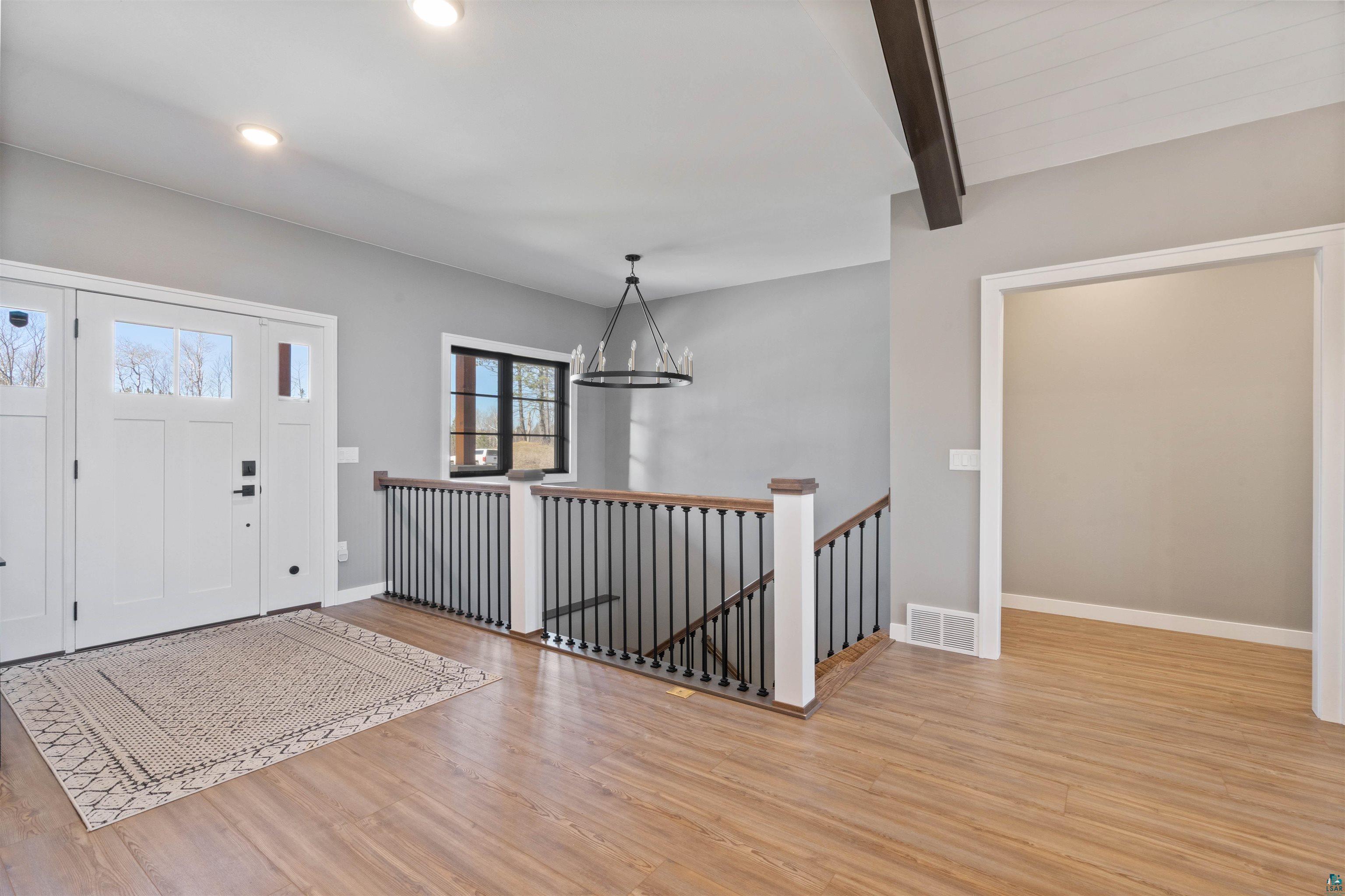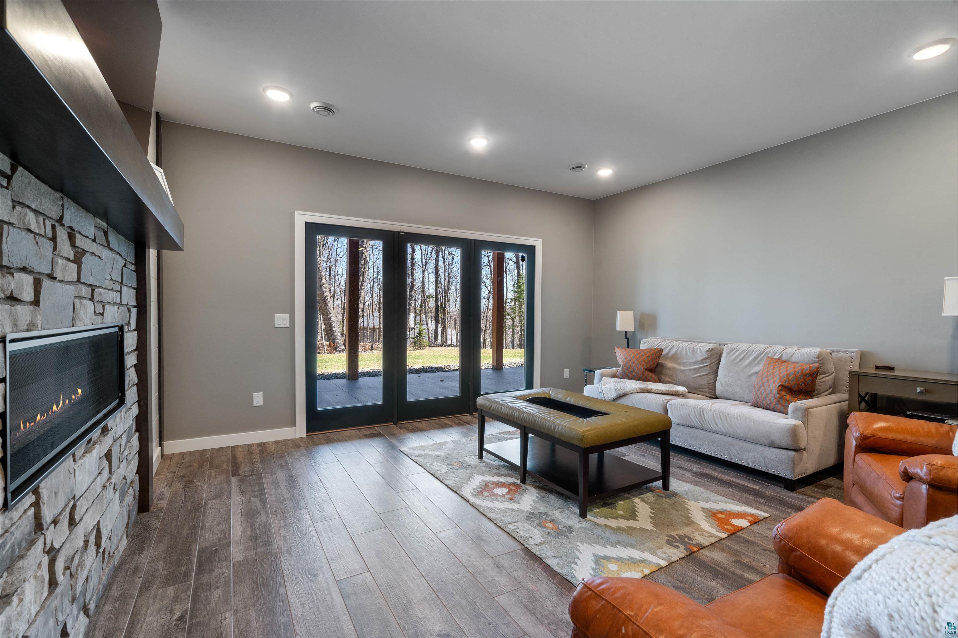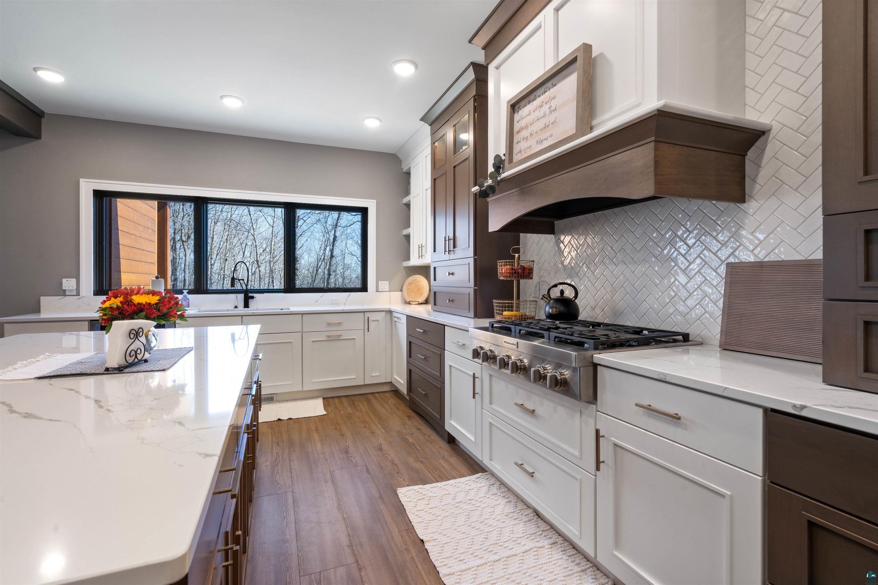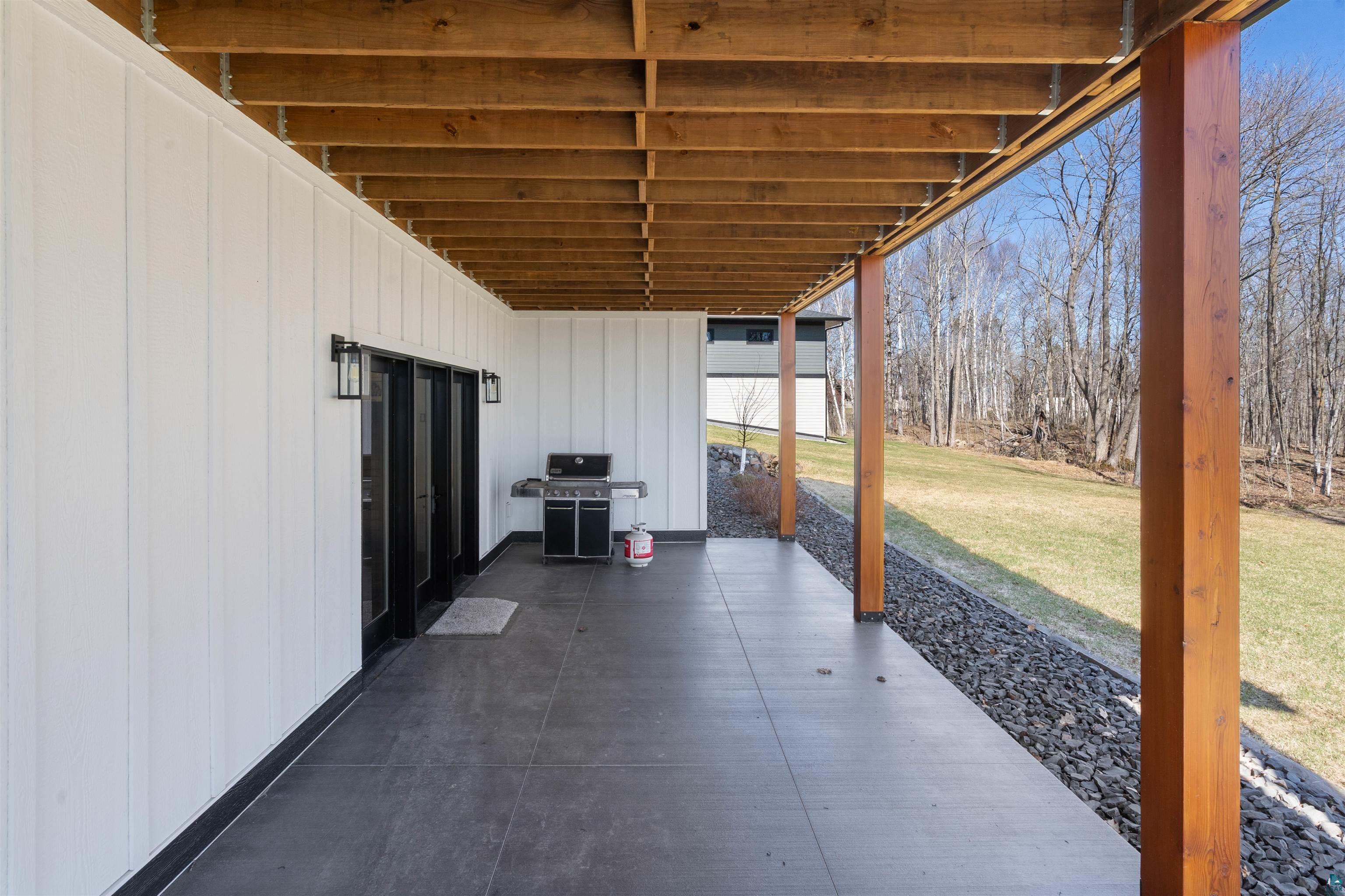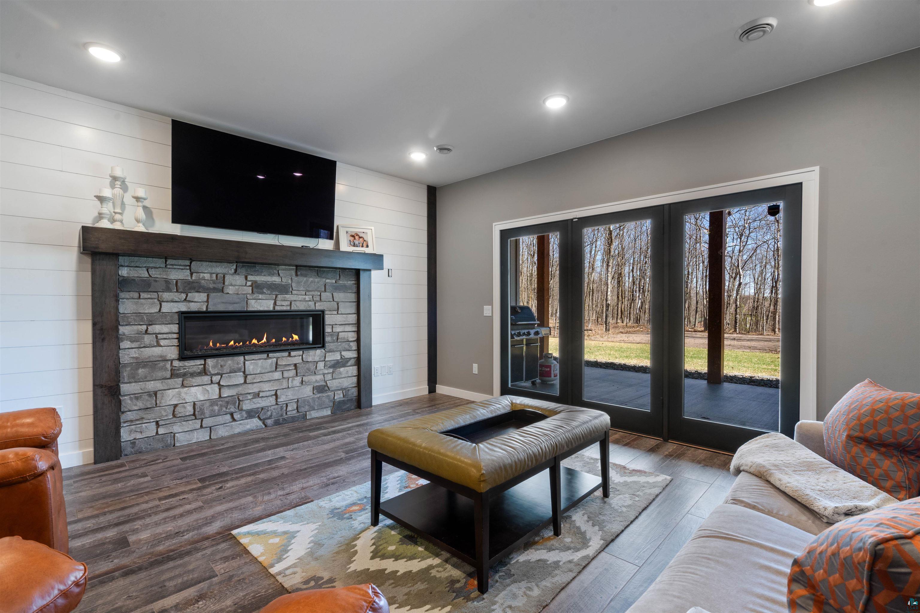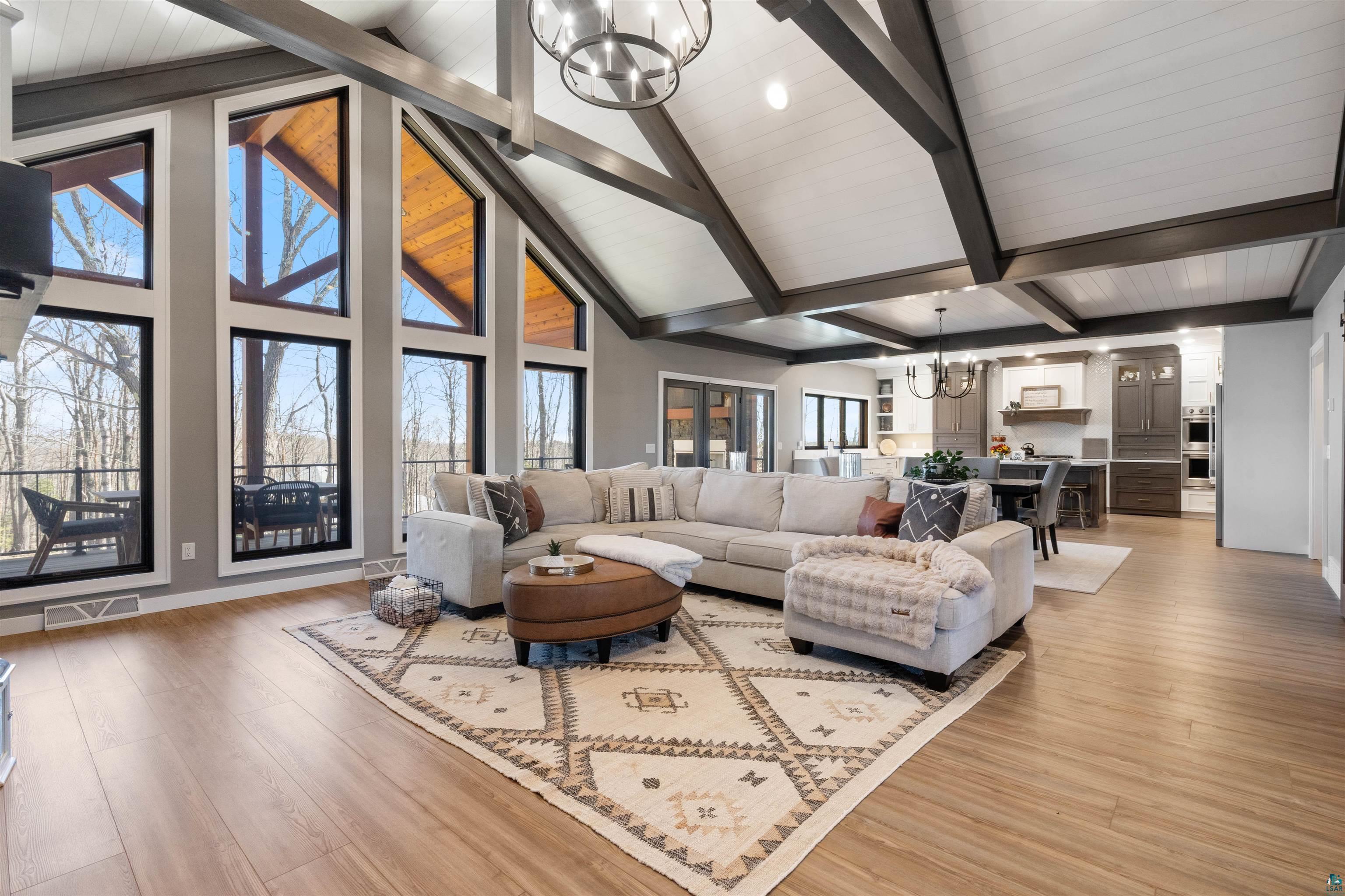 Experience the perfect blend of luxury, craftsmanship, and functionality in this stunning 4-bedroom, 4-bath home. From the moment you arrive, the impressive timber-framed entry and natural stone exterior create a warm yet sophisticated first impression, complemented by cedar soffits and durable LP Smart siding. Inside, the home is filled with natural light thanks to oversized Pella windows that showcase peaceful backyard views. The open-concept floor plan is thoughtfully designed for both everyday living and entertaining, anchored by a spacious custom kitchen featuring a large center island, abundant cabinetry, and an expansive walk-in pantry. The living room boasts a soaring vaulted ceiling, creating a bright and inviting atmosphere. A generously sized mudroom offers excellent storage and organization, while the massive 40 x 30 garage provides plenty of space for vehicles, equipment, and more. The walkout lower level is designed for comfort and versatility, complete with in-floor heating and tile flooring throughout. Entertain with ease at the custom-built bar, or take advantage of the additional flex room, perfect for a home office, fitness space, or extra storage. Convenience is key with two laundry rooms, including one located in the primary suites closet and another in the lower level. Step outside to a backyard built for enjoyment, featuring a versatile pad ready for a hockey rink, fire pit area, or additional outdoor living space. The covered deck is a true highlight, showcasing natural stone finishes, a cozy gas fireplace, and ample room for dining and relaxing year-round. Finished with a concrete driveway and packed with high-end details throughout, this home offers exceptional comfort, style, and space for modern living.