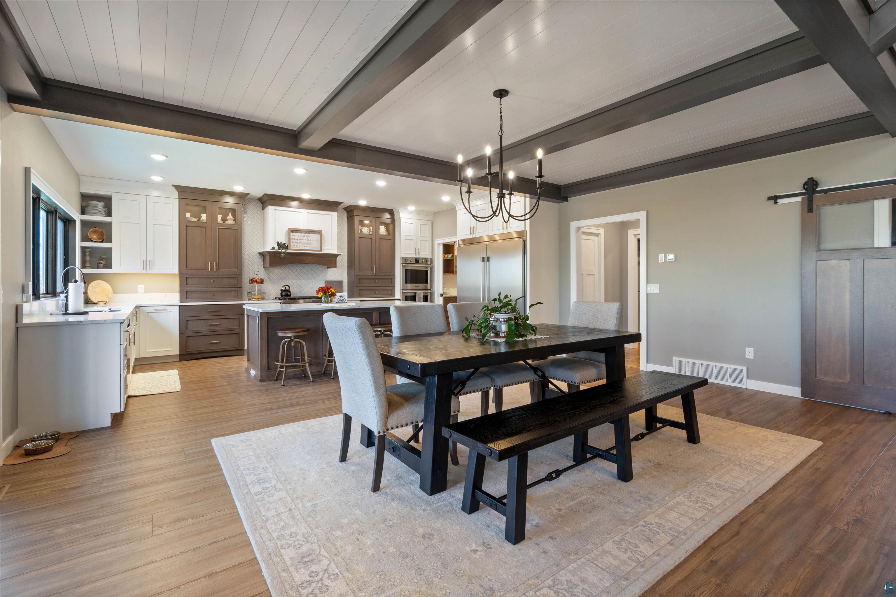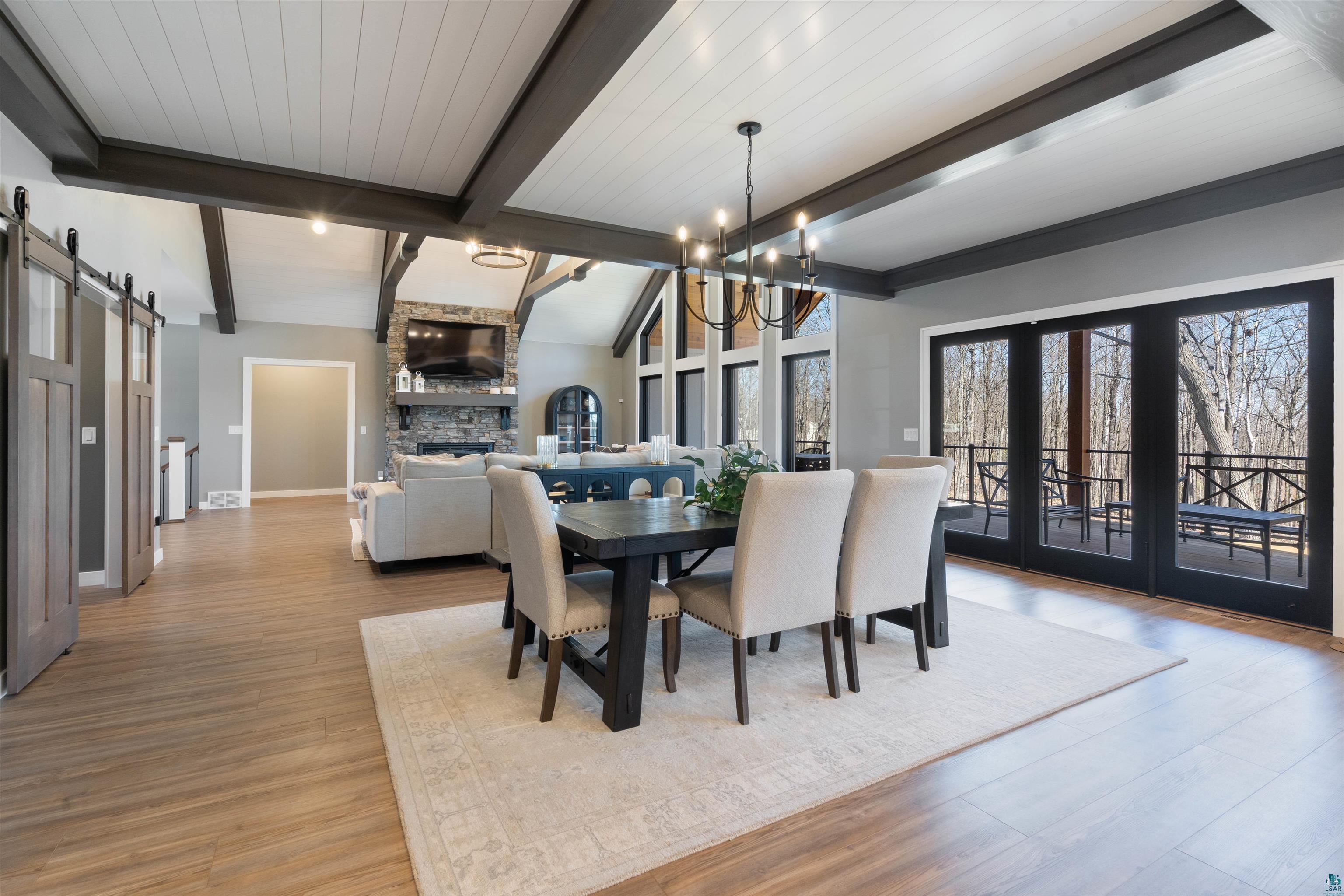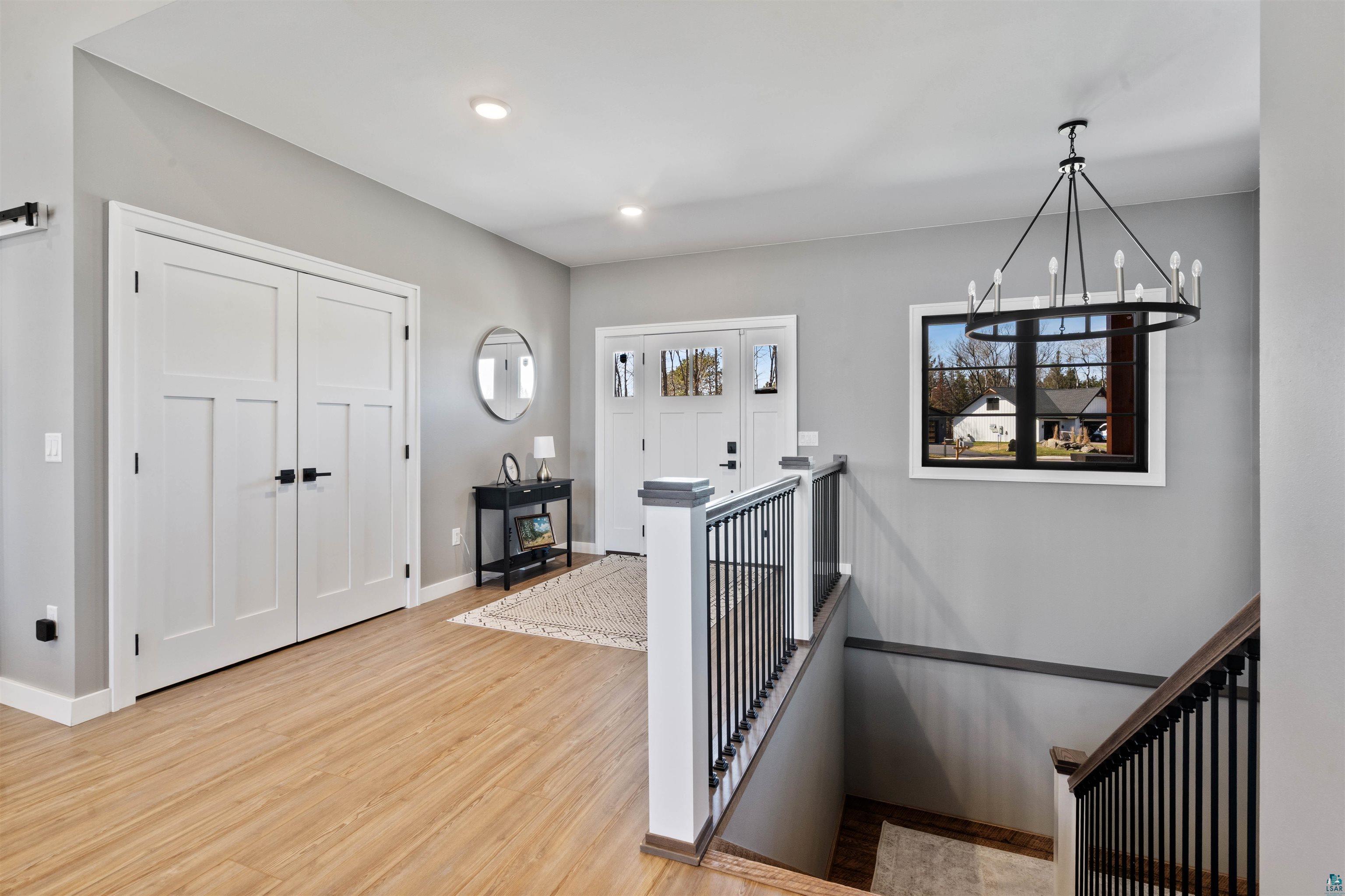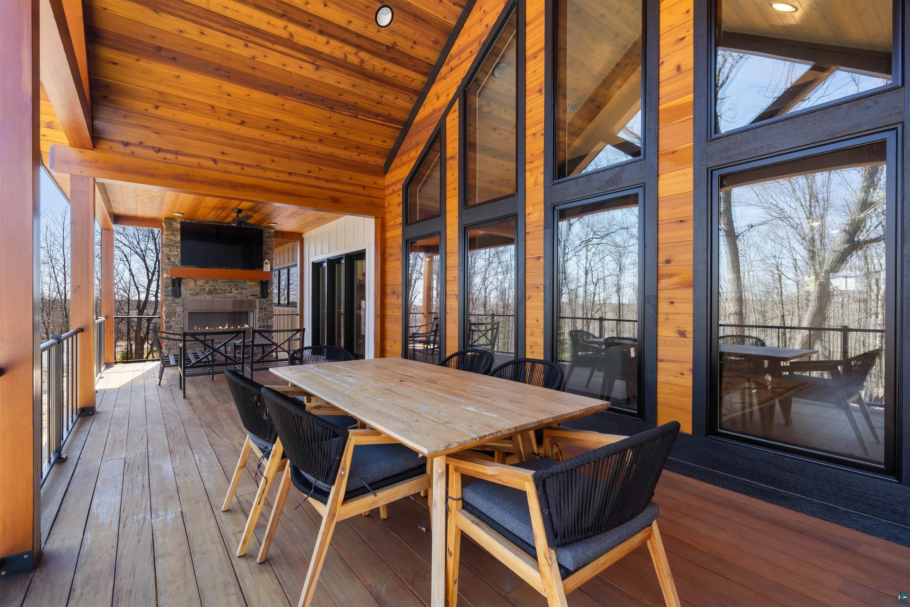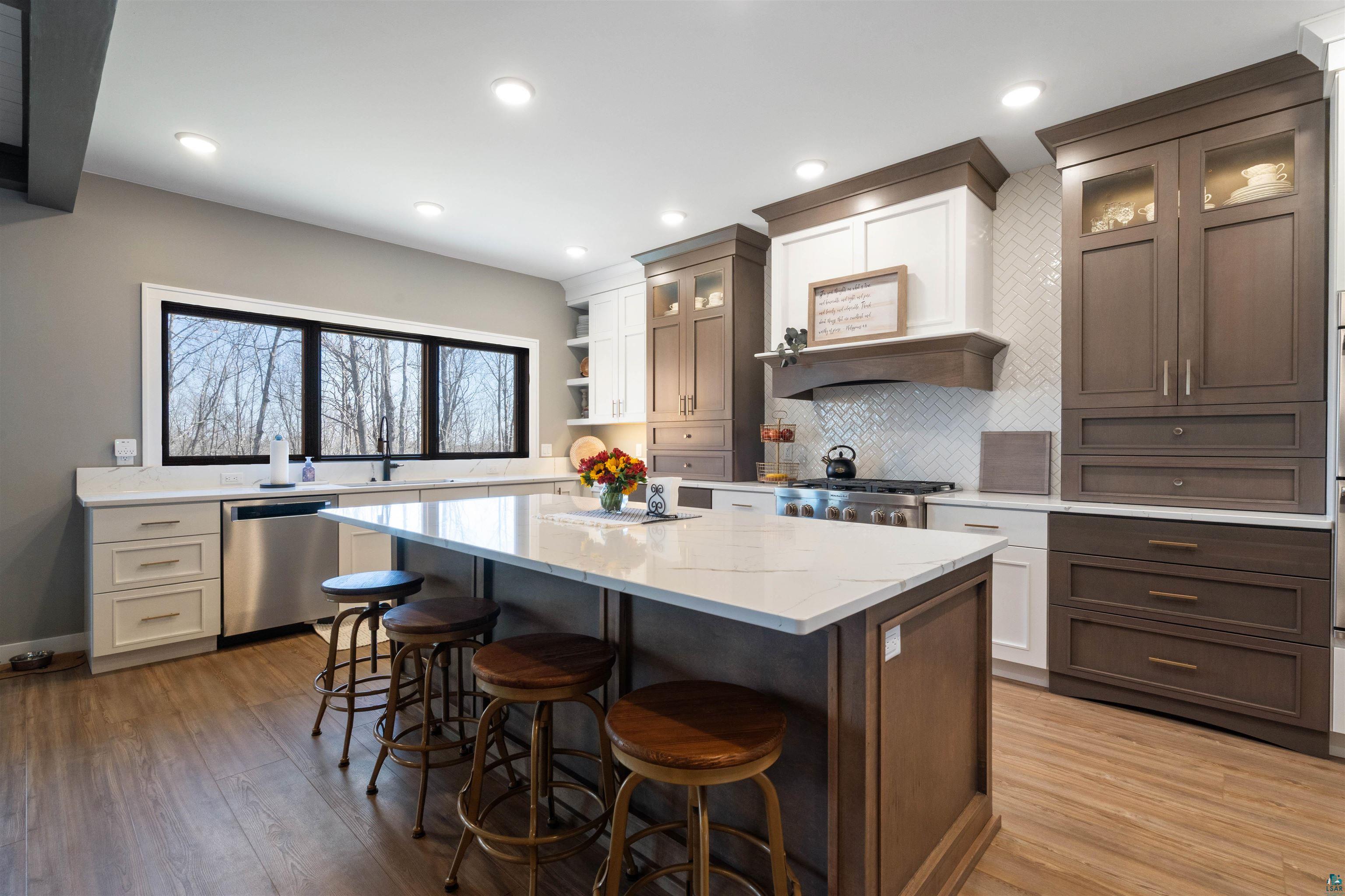 Experience the perfect blend of luxury, craftsmanship, and functionality in this stunning 4-bedroom, 4-bath home. From the moment you arrive, the impressive timber-framed entry and natural stone exterior create a warm yet sophisticated first impression, complemented by cedar soffits and durable LP Smart siding. Inside, the home is filled with natural light thanks to oversized Pella windows that showcase peaceful backyard views. The open-concept floor plan is thoughtfully designed for both everyday living and entertaining, anchored by a spacious custom kitchen featuring a large center island, abundant cabinetry, and an expansive walk-in pantry. The living room boasts a soaring vaulted ceiling, creating a bright and inviting atmosphere. A generously sized mudroom offers excellent storage and organization, while the massive 40 x 30 garage provides plenty of space for vehicles, equipment, and more. The walkout lower level is designed for comfort and versatility, complete with in-floor heating and tile flooring throughout. Entertain with ease at the custom-built bar, or take advantage of the additional flex room, perfect for a home office, fitness space, or extra storage. Convenience is key with two laundry rooms, including one located in the primary suites closet and another in the lower level. Step outside to a backyard built for enjoyment, featuring a versatile pad ready for a hockey rink, fire pit area, or additional outdoor living space. The covered deck is a true highlight, showcasing natural stone finishes, a cozy gas fireplace, and ample room for dining and relaxing year-round. Finished with a concrete driveway and packed with high-end details throughout, this home offers exceptional comfort, style, and space for modern living.