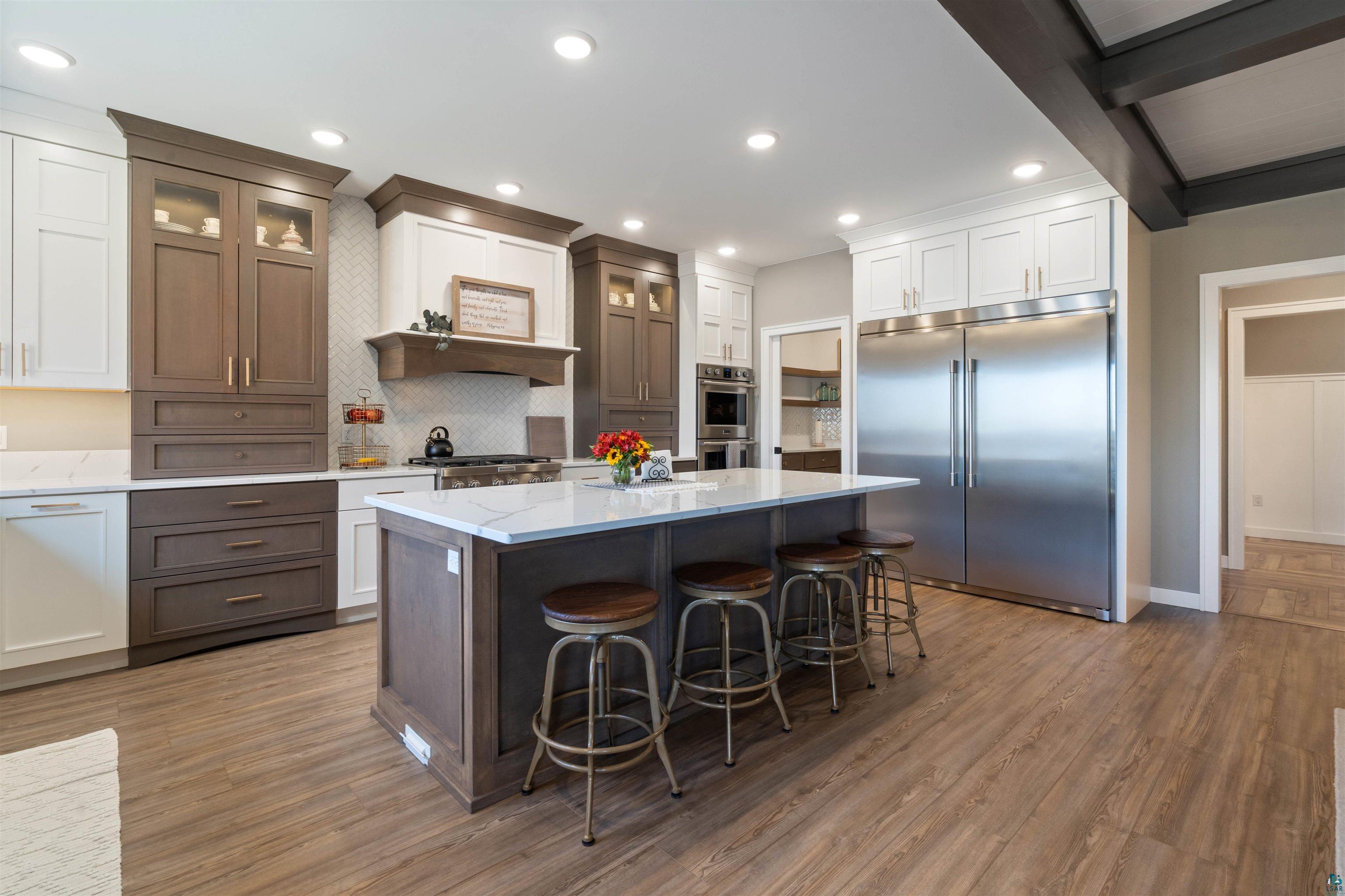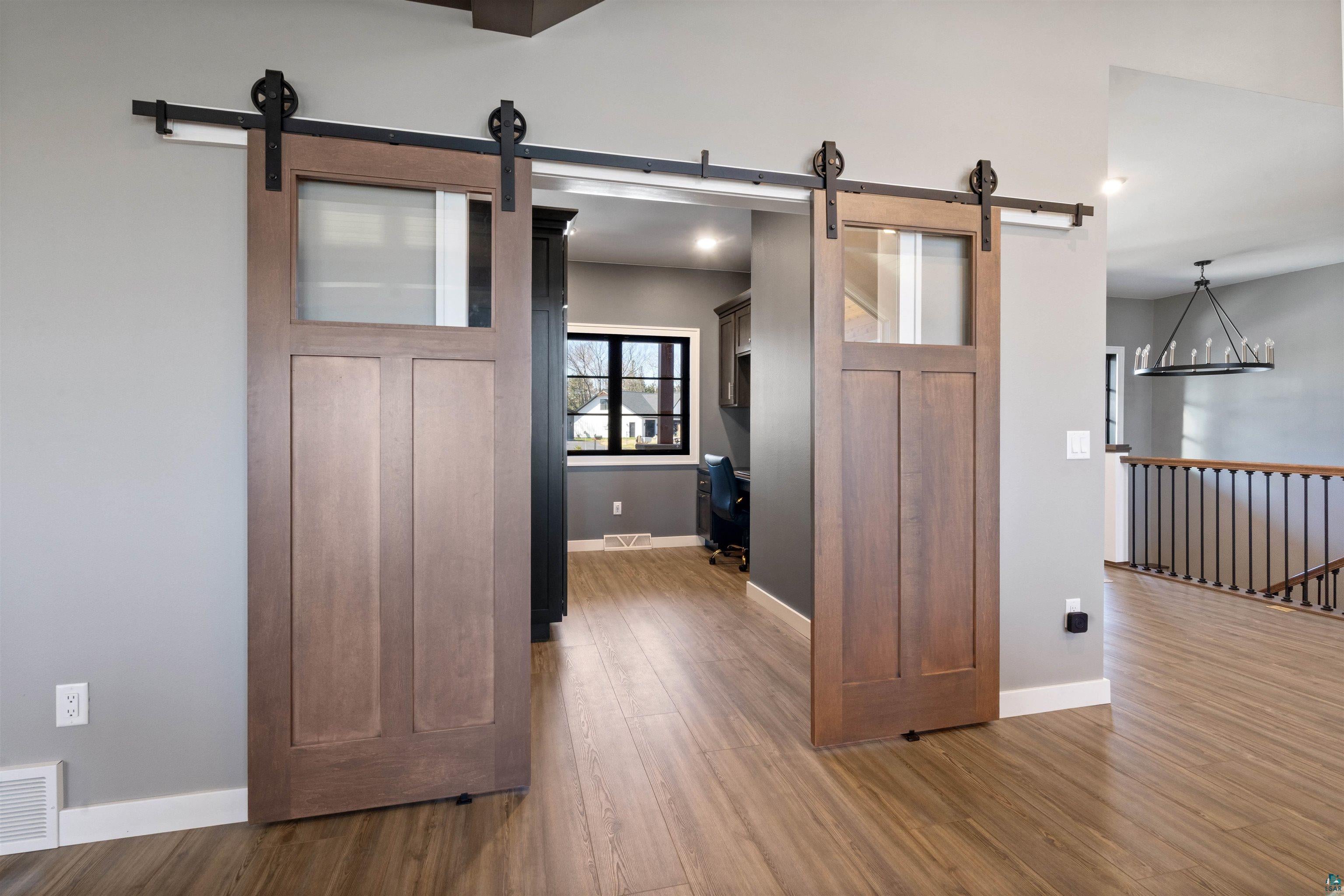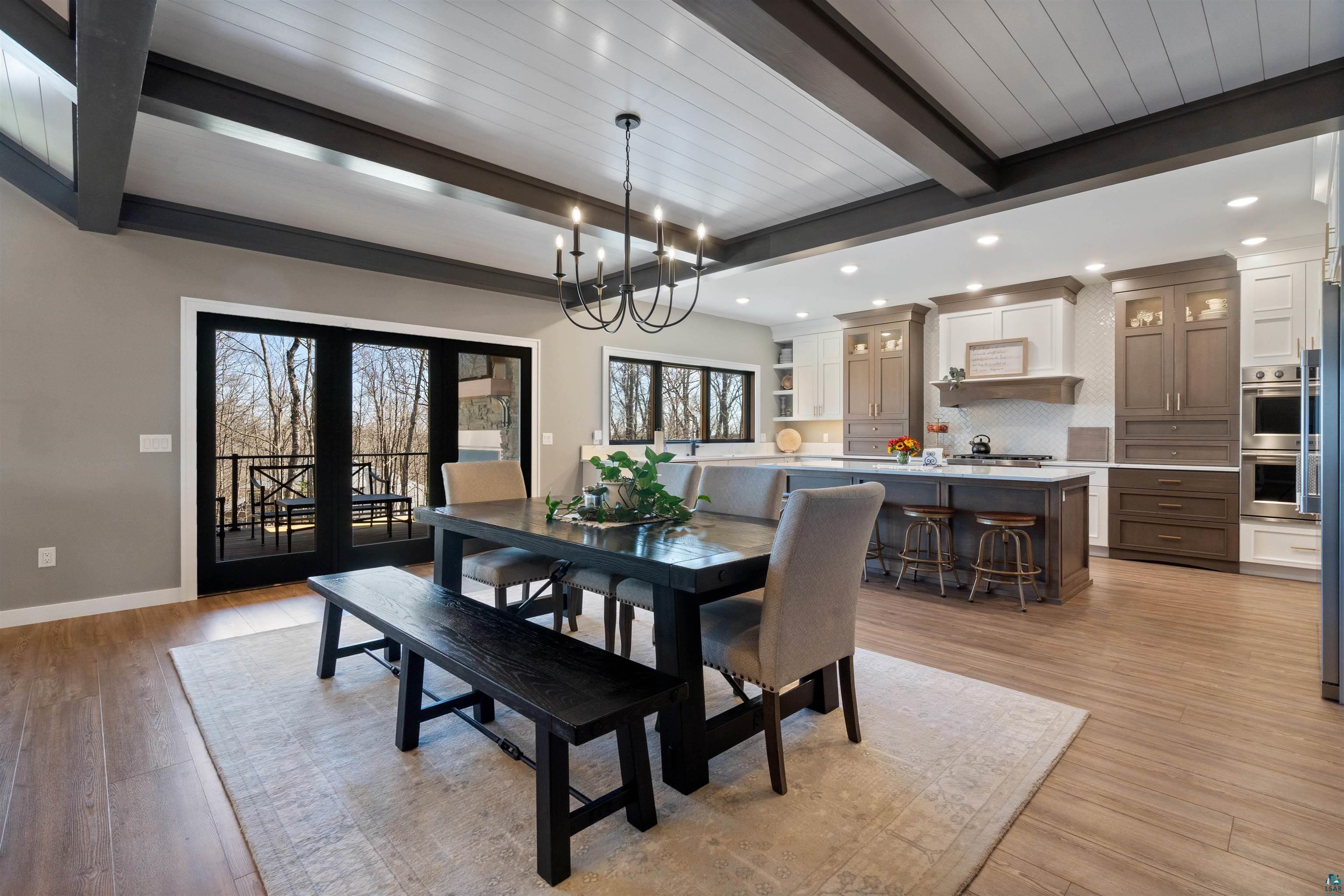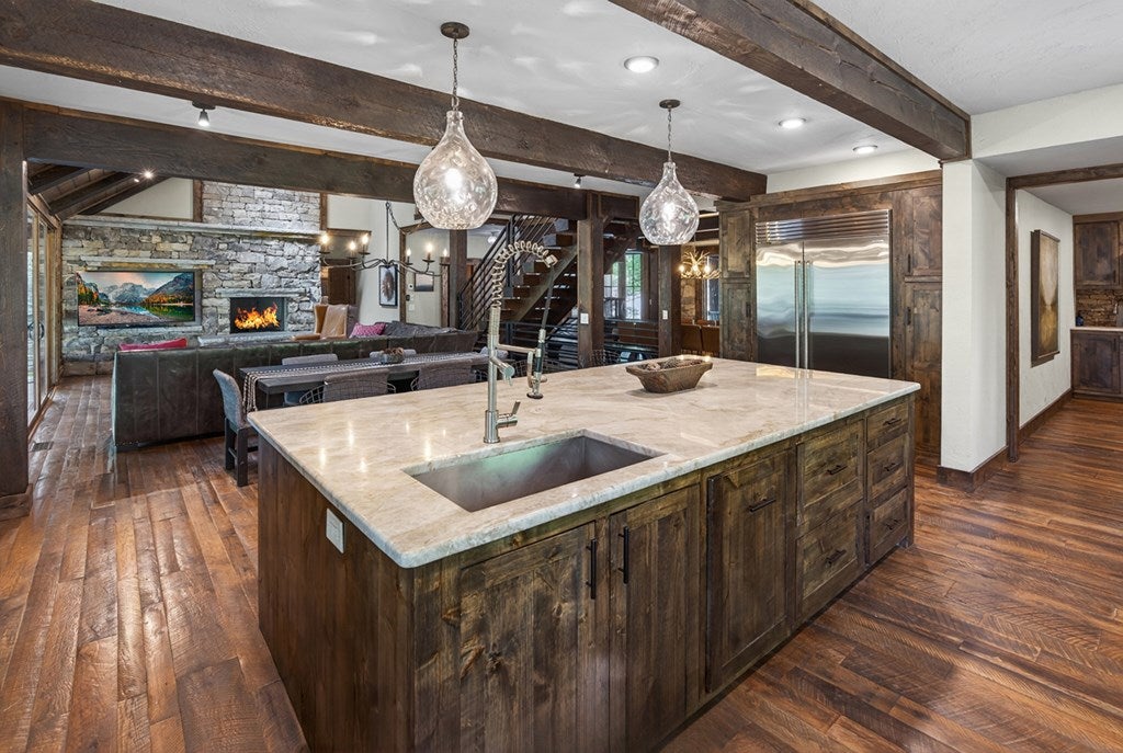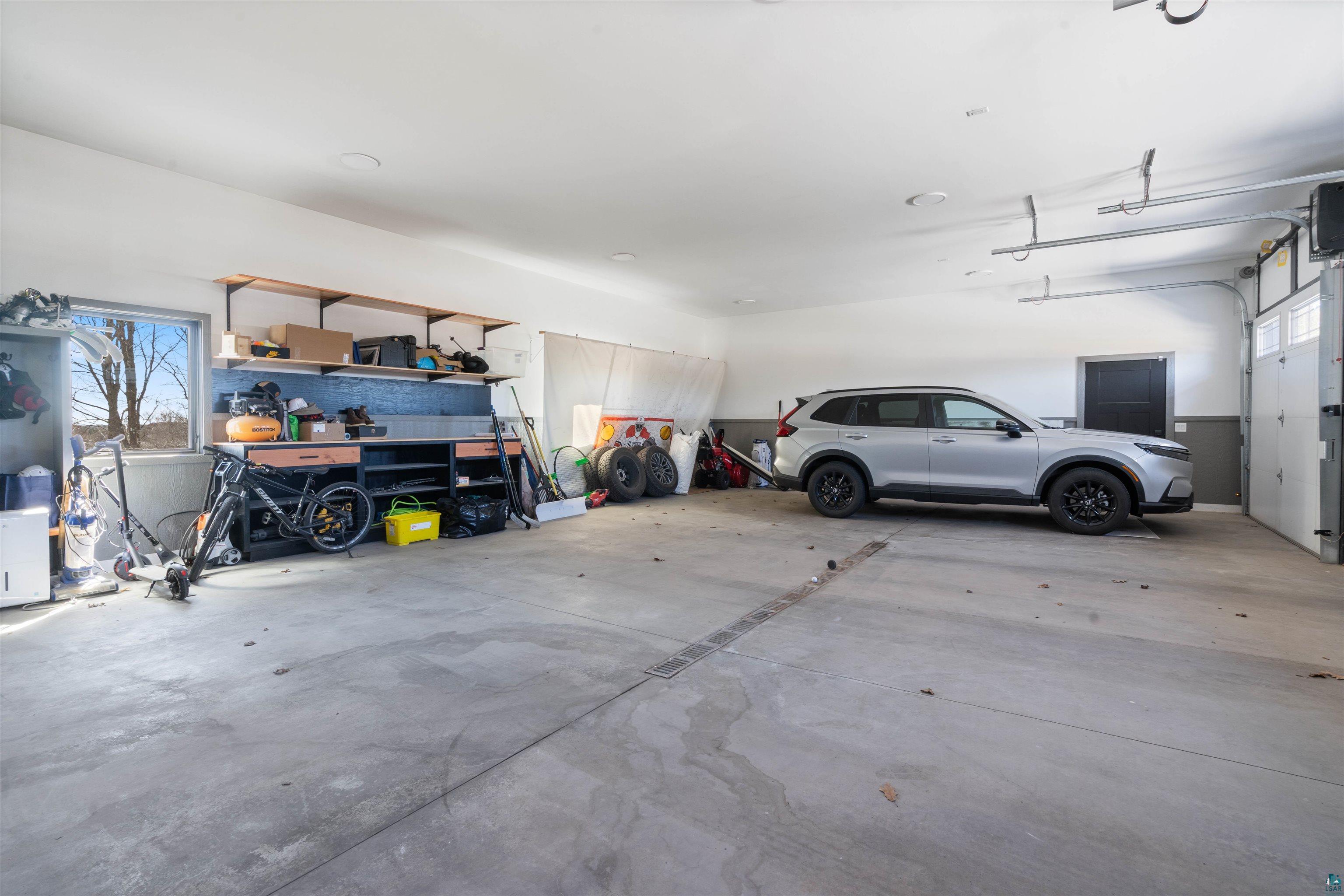 Experience the perfect blend of luxury, craftsmanship, and functionality in this stunning 4-bedroom, 4-bath home. From the moment you arrive, the impressive timber-framed entry and natural stone exterior create a warm yet sophisticated first impression, complemented by cedar soffits and durable LP Smart siding. Inside, the home is filled with natural light thanks to oversized Pella windows that showcase peaceful backyard views. The open-concept floor plan is thoughtfully designed for both everyday living and entertaining, anchored by a spacious custom kitchen featuring a large center island, abundant cabinetry, and an expansive walk-in pantry. The living room boasts a soaring vaulted ceiling, creating a bright and inviting atmosphere. A generously sized mudroom offers excellent storage and organization, while the massive 40 x 30 garage provides plenty of space for vehicles, equipment, and more. The walkout lower level is designed for comfort and versatility, complete with in-floor heating and tile flooring throughout. Entertain with ease at the custom-built bar, or take advantage of the additional flex room, perfect for a home office, fitness space, or extra storage. Convenience is key with two laundry rooms, including one located in the primary suites closet and another in the lower level. Step outside to a backyard built for enjoyment, featuring a versatile pad ready for a hockey rink, fire pit area, or additional outdoor living space. The covered deck is a true highlight, showcasing natural stone finishes, a cozy gas fireplace, and ample room for dining and relaxing year-round. Finished with a concrete driveway and packed with high-end details throughout, this home offers exceptional comfort, style, and space for modern living.