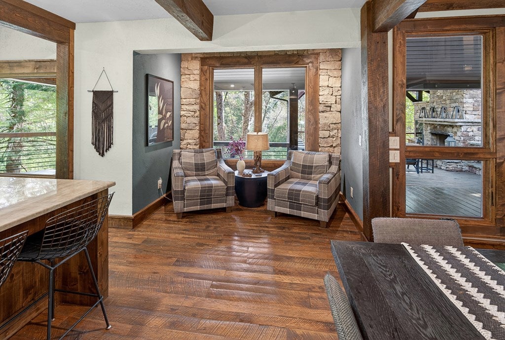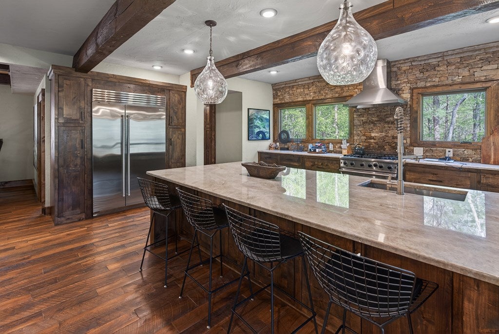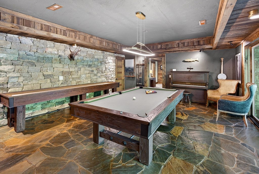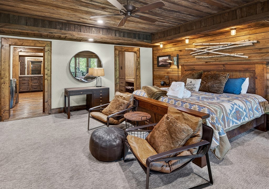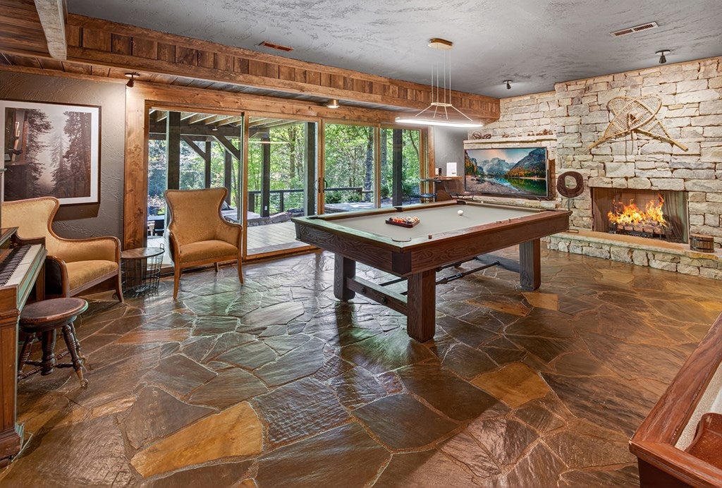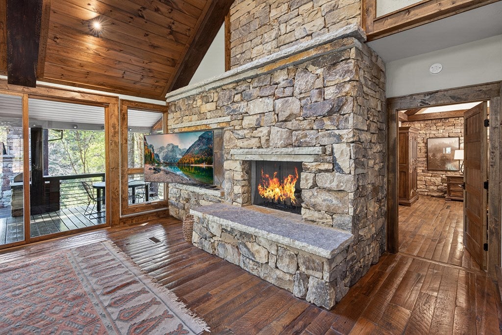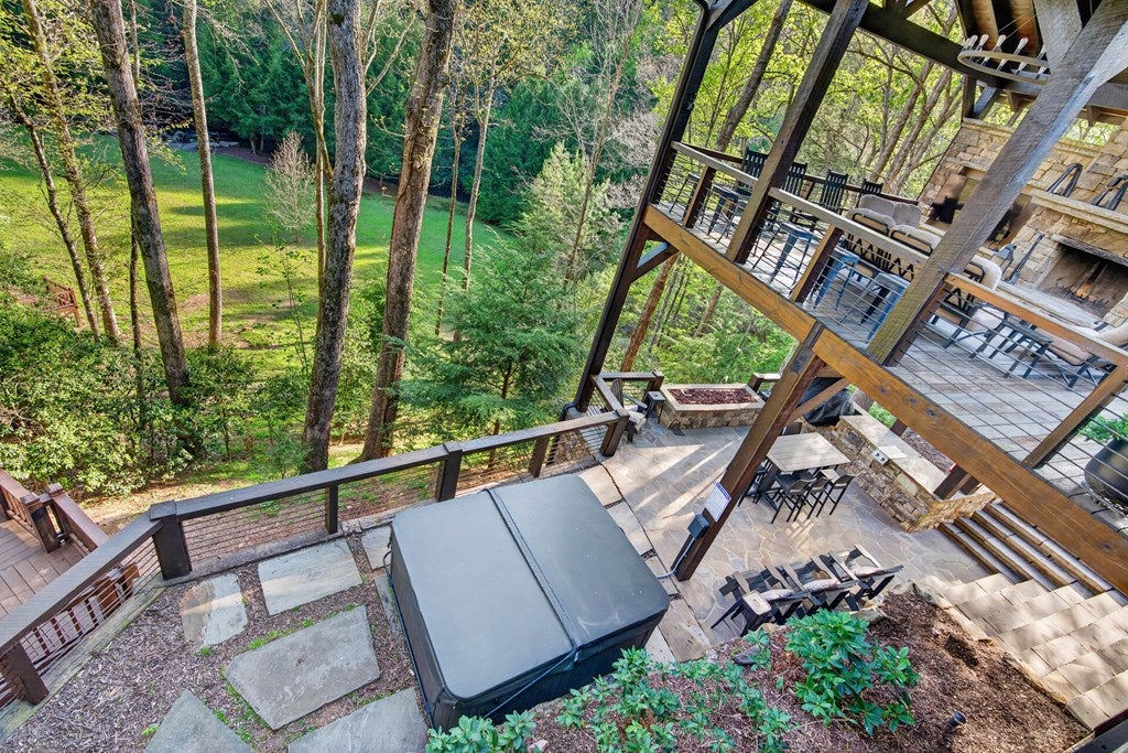 317 Crestview Lane Goose Island Hideaway Cherry Log, GA Welcome to 317 Crestview Lane a mountain river sanctuary unlike any other. Nestled within the prestigious gated enclave of Goose Island Hideaway in Cherry Log, Georgia, this extraordinary estate sits between Blue Ridge and Ellijay, placing you moments from craft breweries, wineries, fine dining, and the Chattahoochee National Forest. Remodeled in 2019 and featured in the 2020 Blue Ridge Parade of Homes, this Keith Sumner custom masterpiece commands 5.69 private forested acres and 550 feet of Ellijay River frontage. The homes striking exterior rusted tin roof accents, signature stacked stone entrance, and timber framing announces a sophisticated blend of modern mountain architecture and rustic elegance. Inside, 5,700 square feet of curated living space unfolds across three levels, offering 5 bedrooms, 4.5 baths, and three master suites. Hand-hewn vaulted ceilings, a grand 16-foot stone fireplace, and floor-to-ceiling glass doors define the main levels great room, flowing seamlessly to an entertainers deck with outdoor kitchen and wood-burning fireplace. The chefs kitchen features a twelve-foot marble island, Viking appliances, and sweeping river views. The primary suite delivers steam spa showers, a copper soaking tub, a Toto Japanese bidet, and a walk-in closet with washer and dryer. Ascend the open timber stairs to the top floor where 3 additional guest bedrooms await, each with a unique designer persona. Descend to the terrace level for a sophisticated bar, Brunswick billiards, shuffleboard, and stone fireplace lounge. Outside, a 10-person hot tub, Green Egg smoker, and gas fire pit anchor the lower deck, while stone pathways lead to 550 feet of private riverbank and a 9-hole disc golf course. Currently enrolled in a successful luxury rental program, this home offers excellent investment potential with a proven rental history. 317 Crestview Lane is not simply a home it is an experience.