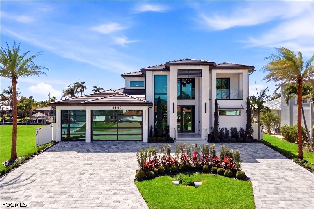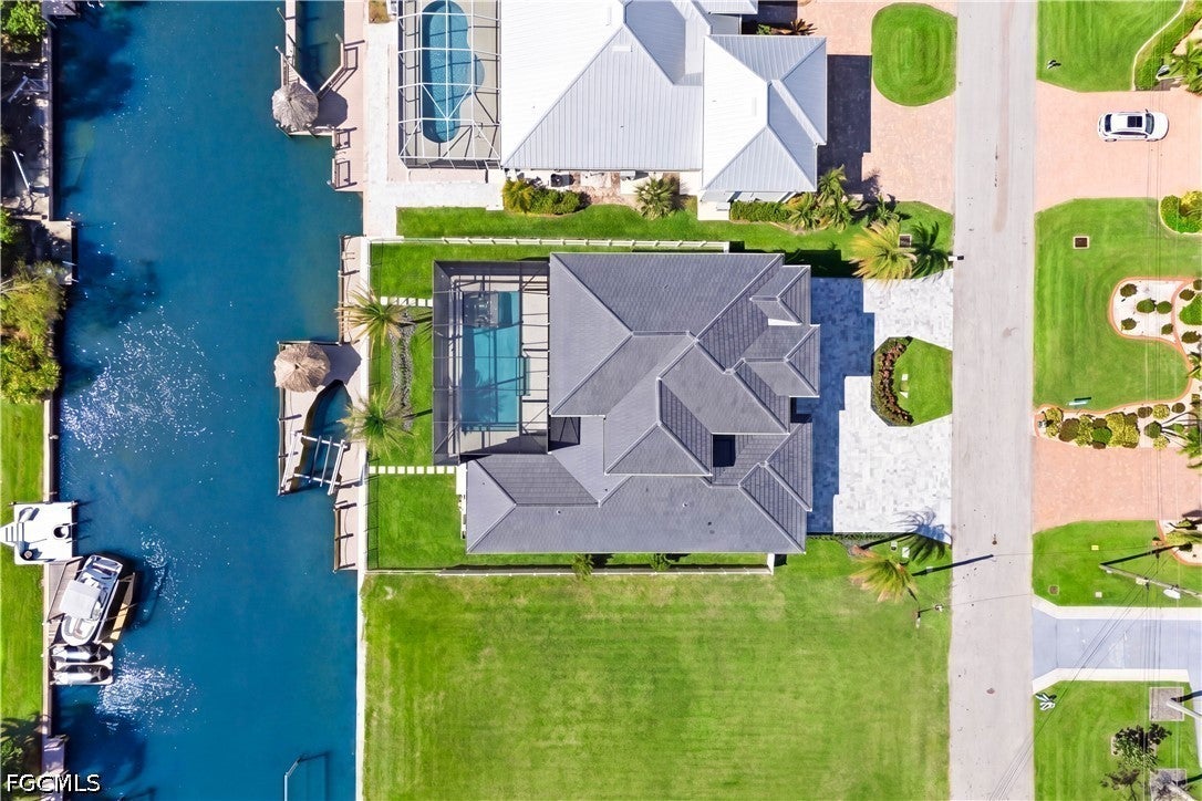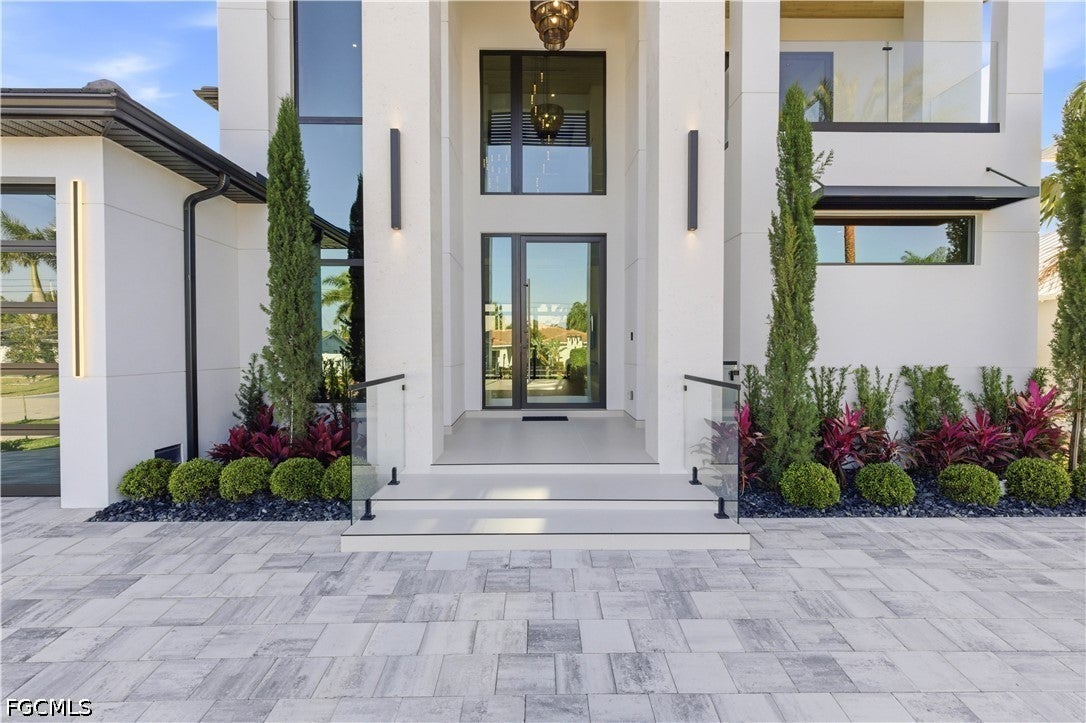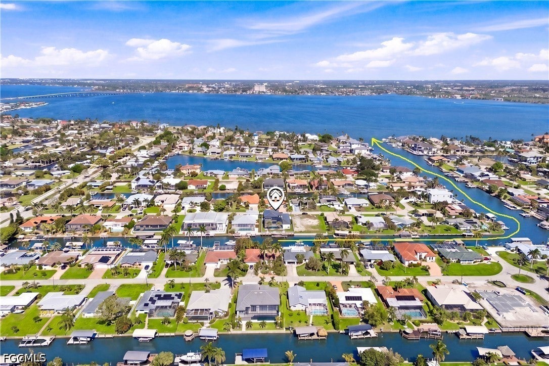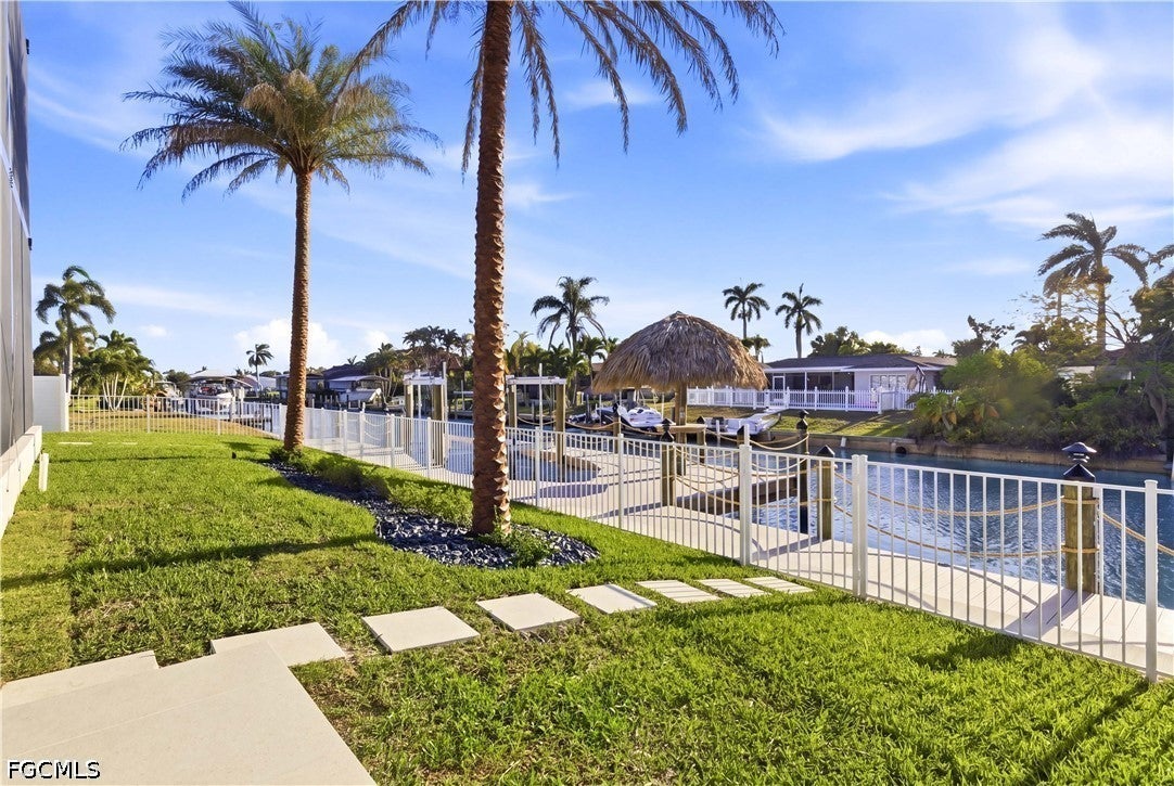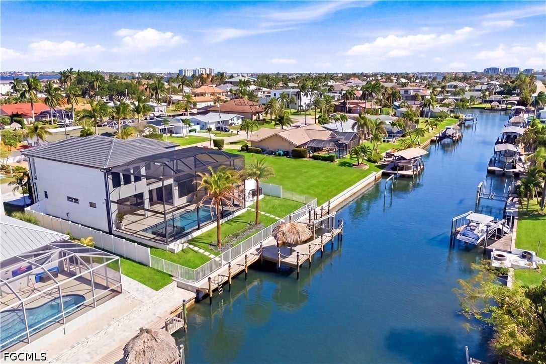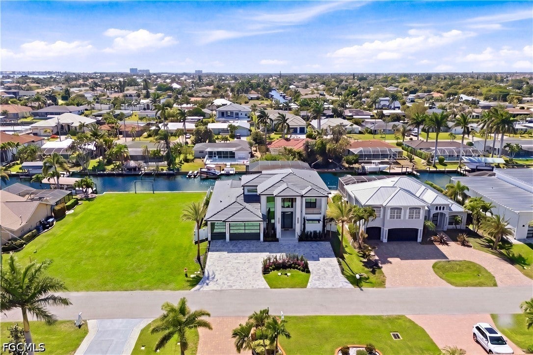 Waterfront masterpiece in Cape Corals Yacht Club w/ direct Gulf access, no bridges, and 7 minutes to Gulf open water - 80 ft on Malaluka Canal featuring captains walk, 10K lb lift, tiki hut & fully equipped dock. Bright & open modern layout featuring oversized 72x41 Spanish porcelain tile on main level & natural engineered oak flooring upstairs. Arrive through marble-column front porch w/ glass accents & modern wood ceiling, opening to impressive foyer w/ 10-ft double tinted Low-E impact-resistant pivot door. Gorgeous entryway w/ multi-drop chandelier & wall paneling. Living room w/ 23-ft cove ceiling, wood beam detailing, Italian wallpapered feature wall w/ illuminated built-ins & stunning 64 multi-drop chandelier cascading from ceiling, 75 TV & Bose surround sound system. Gourmet kitchen w/ modern design & premium craftsmanship, equipped w/ luxury appliances, Liebherr built-in dual-zone wine cooler, Viking flat range w/ double convection ovens, integrated dishwasher, custom built-in Liebherr side-by-side refrigerator/freezer & Miele integrated coffee machine. Trade-Wind commercial-grade hood concealed w/ custom cabinetry. Oversized waterfall island highlighted by Cristallo quartzite lighting pendant & by top-of-the-line cabinetry extending to the ceiling w/ under- & upper-cabinet lighting, Cristallo quartzite countertops, full-height backsplash, pot filler & large sink. Sophisticated formal dining with travertine feature wall, wood ceiling, designer lighting, and 9-ft tinted Low-E sliders plus oversized windows to the waterfront. SPLENDID MASTER BATH w/ FULL GLASS WALL, DOUBLE RAINFALL SHOWERS w/ 4 jets & handheld showerheads, STANDALONE TUB & custom vanities. All bathrooms feature seamless travertine integrated sinks w/ soft veining & wall-mounted smart toilets w/ bidet features & concealed in-wall tank systems for modern look. All beds feature elegant tray ceilings w/ wood inlay accents. SPLIT FLOOR PLAN w/ 2nd MASTER SUITE, 2 GUEST BED & HALL BATH ensure PRIVACY & convenience for FAMILY & GUESTS! Ascend striking glass & engineered oak staircase w/ interior garden feature to second level, offering loft retreat (2nd living) w/ wet bar, Cristallo quartzite, sink, beverage fridge & Bose sound. Includes junior suite w/ east balcony (sunrise), den/office & media/flex room w/ Bose opening to west balcony (breathtaking sunsets). Step outside to your waterfront oasis w/ oversized heated pool & spa, marble pavers, artificial turf, lush landscaping & fenced yard. Outdoor kitchen w/ Bull grill, side burner, hood, fridge, sink & storage, plus covered patio w/ wood ceiling, fan, Bose sound & 65 TV. Laundry room w/ Samsung washer & dryer, utility sink w/ full backsplash, L-shaped countertop & ample storage cabinetry. 3-CAR GARAGE w/ FULL IMPACT RESISTANT TINTED LOW-E GLASS PANELS & INSULATED CEILING. This stunning waterfront property with direct Gulf-access boating and refined luxury offers an exceptional SWFL lifestyle, come experience it firsthand!