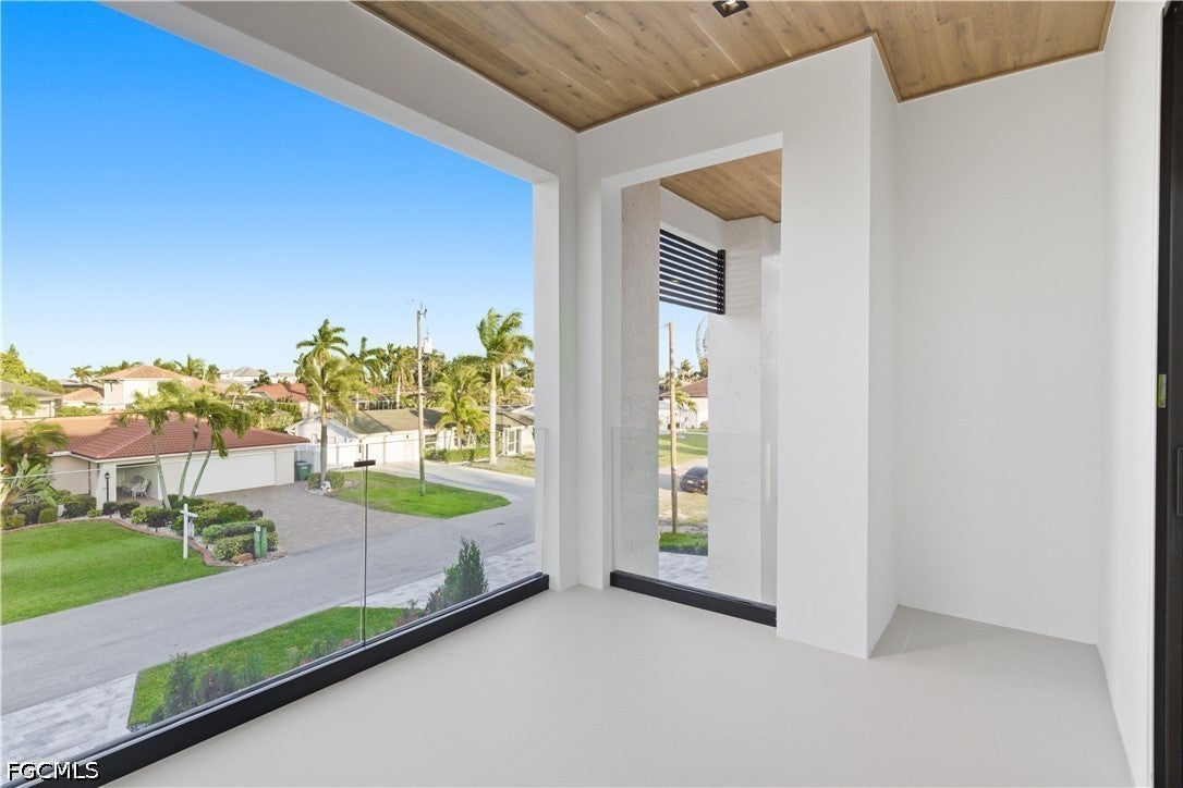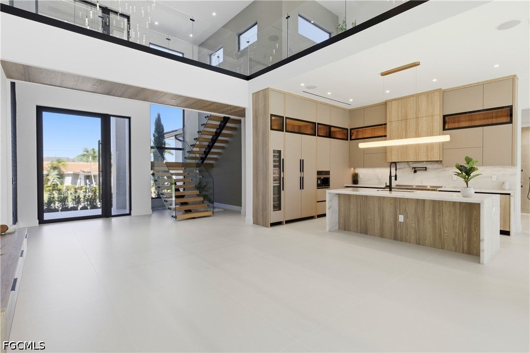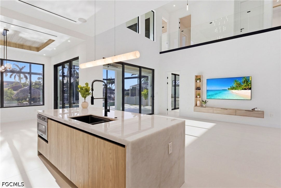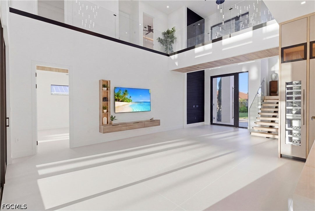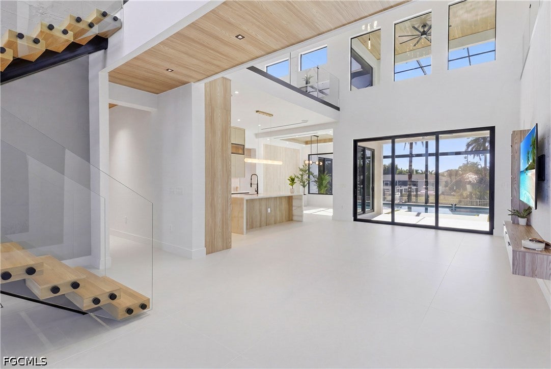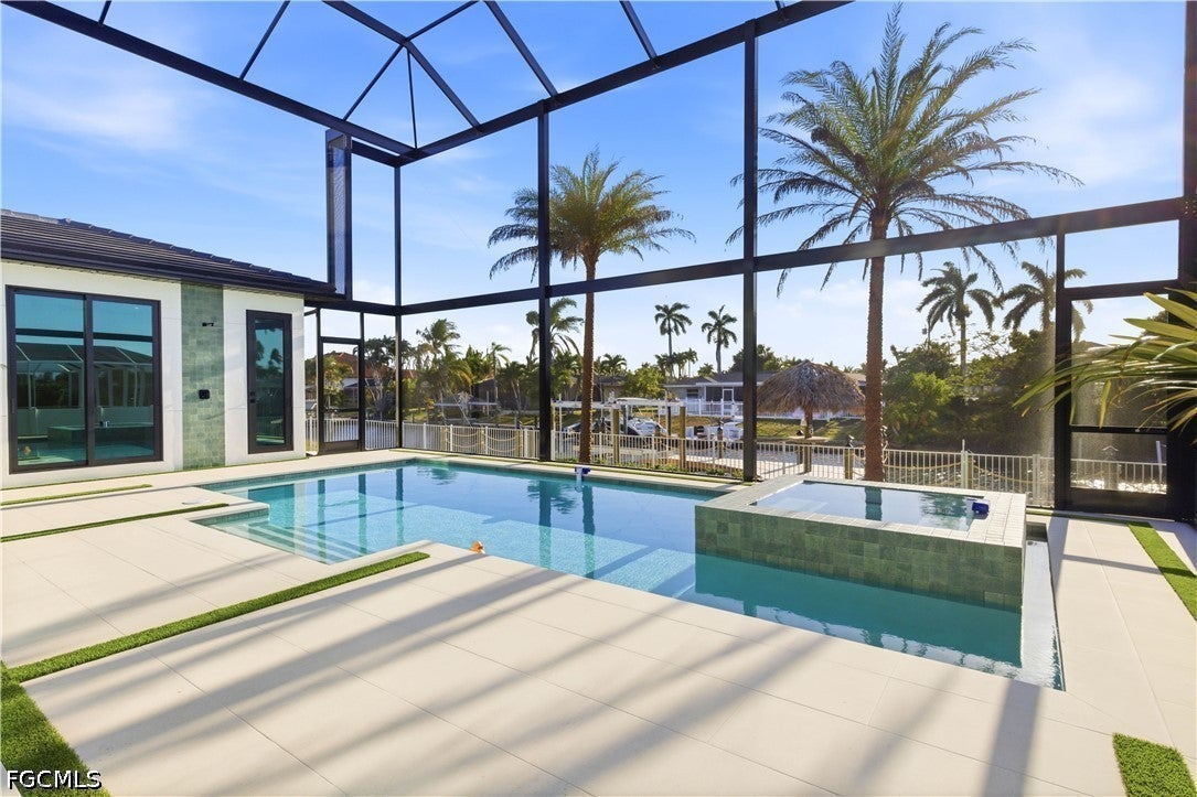 Waterfront masterpiece in Cape Corals Yacht Club w/ direct Gulf access, no bridges, and 7 minutes to Gulf open water - 80 ft on Malaluka Canal featuring captains walk, 10K lb lift, tiki hut & fully equipped dock. Bright & open modern layout featuring oversized 72x41 Spanish porcelain tile on main level & natural engineered oak flooring upstairs. Arrive through marble-column front porch w/ glass accents & modern wood ceiling, opening to impressive foyer w/ 10-ft double tinted Low-E impact-resistant pivot door. Gorgeous entryway w/ multi-drop chandelier & wall paneling. Living room w/ 23-ft cove ceiling, wood beam detailing, Italian wallpapered feature wall w/ illuminated built-ins & stunning 64 multi-drop chandelier cascading from ceiling, 75 TV & Bose surround sound system. Gourmet kitchen w/ modern design & premium craftsmanship, equipped w/ luxury appliances, Liebherr built-in dual-zone wine cooler, Viking flat range w/ double convection ovens, integrated dishwasher, custom built-in Liebherr side-by-side refrigerator/freezer & Miele integrated coffee machine. Trade-Wind commercial-grade hood concealed w/ custom cabinetry. Oversized waterfall island highlighted by Cristallo quartzite lighting pendant & by top-of-the-line cabinetry extending to the ceiling w/ under- & upper-cabinet lighting, Cristallo quartzite countertops, full-height backsplash, pot filler & large sink. Sophisticated formal dining with travertine feature wall, wood ceiling, designer lighting, and 9-ft tinted Low-E sliders plus oversized windows to the waterfront. SPLENDID MASTER BATH w/ FULL GLASS WALL, DOUBLE RAINFALL SHOWERS w/ 4 jets & handheld showerheads, STANDALONE TUB & custom vanities. All bathrooms feature seamless travertine integrated sinks w/ soft veining & wall-mounted smart toilets w/ bidet features & concealed in-wall tank systems for modern look. All beds feature elegant tray ceilings w/ wood inlay accents. SPLIT FLOOR PLAN w/ 2nd MASTER SUITE, 2 GUEST BED & HALL BATH ensure PRIVACY & convenience for FAMILY & GUESTS! Ascend striking glass & engineered oak staircase w/ interior garden feature to second level, offering loft retreat (2nd living) w/ wet bar, Cristallo quartzite, sink, beverage fridge & Bose sound. Includes junior suite w/ east balcony (sunrise), den/office & media/flex room w/ Bose opening to west balcony (breathtaking sunsets). Step outside to your waterfront oasis w/ oversized heated pool & spa, marble pavers, artificial turf, lush landscaping & fenced yard. Outdoor kitchen w/ Bull grill, side burner, hood, fridge, sink & storage, plus covered patio w/ wood ceiling, fan, Bose sound & 65 TV. Laundry room w/ Samsung washer & dryer, utility sink w/ full backsplash, L-shaped countertop & ample storage cabinetry. 3-CAR GARAGE w/ FULL IMPACT RESISTANT TINTED LOW-E GLASS PANELS & INSULATED CEILING. This stunning waterfront property with direct Gulf-access boating and refined luxury offers an exceptional SWFL lifestyle, come experience it firsthand!