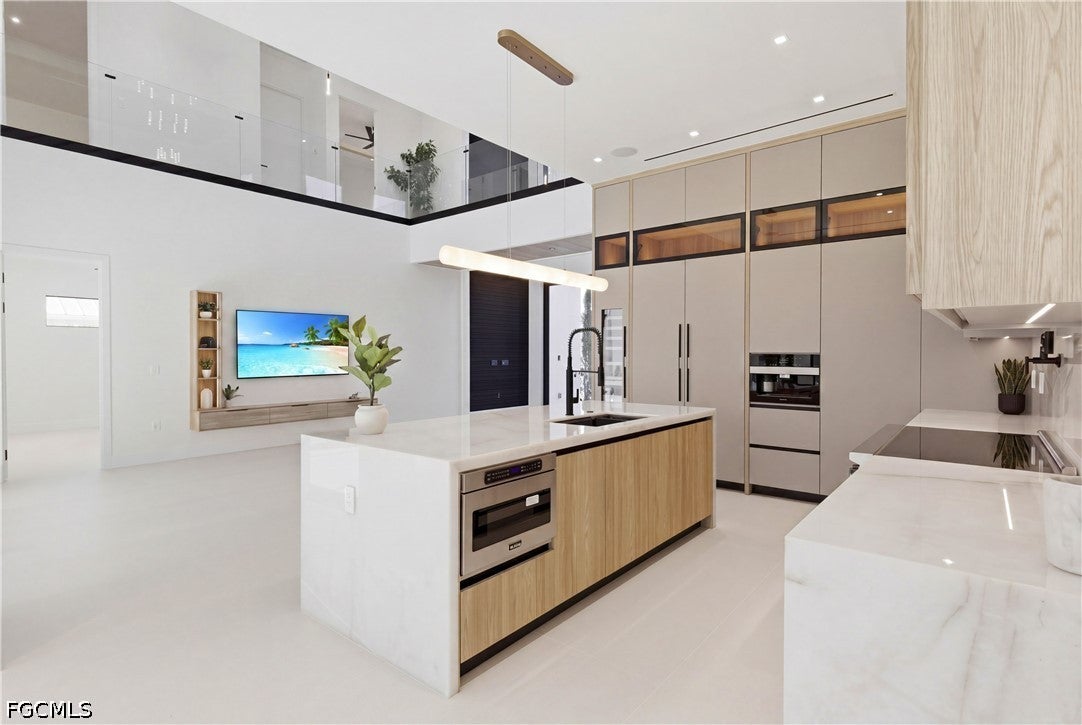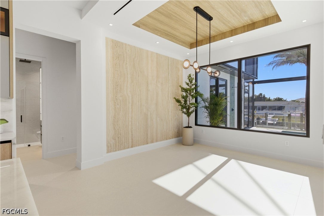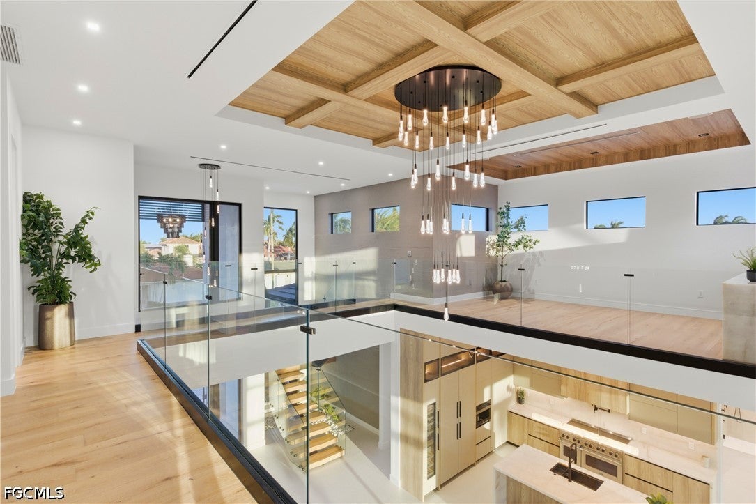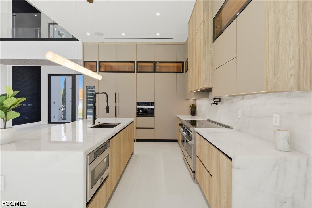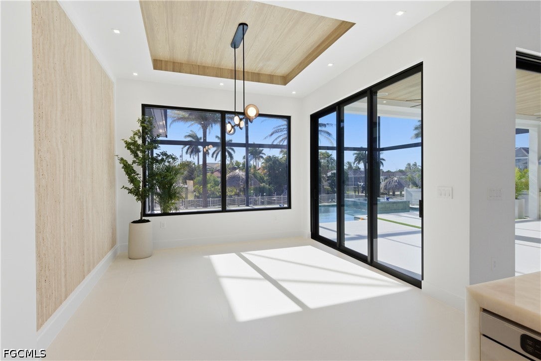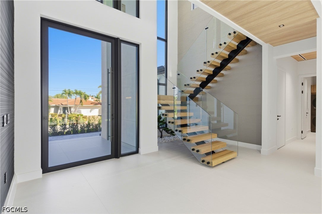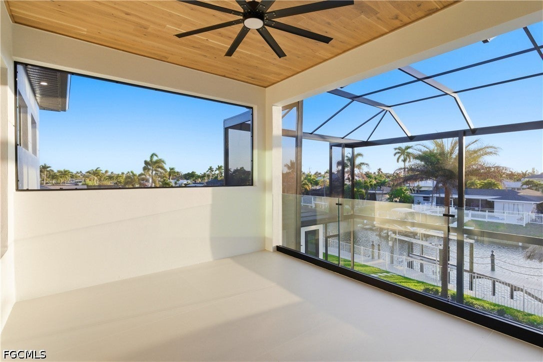 Waterfront masterpiece in Cape Corals Yacht Club w/ direct Gulf access, no bridges, and 7 minutes to Gulf open water - 80 ft on Malaluka Canal featuring captains walk, 10K lb lift, tiki hut & fully equipped dock. Bright & open modern layout featuring oversized 72x41 Spanish porcelain tile on main level & natural engineered oak flooring upstairs. Arrive through marble-column front porch w/ glass accents & modern wood ceiling, opening to impressive foyer w/ 10-ft double tinted Low-E impact-resistant pivot door. Gorgeous entryway w/ multi-drop chandelier & wall paneling. Living room w/ 23-ft cove ceiling, wood beam detailing, Italian wallpapered feature wall w/ illuminated built-ins & stunning 64 multi-drop chandelier cascading from ceiling, 75 TV & Bose surround sound system. Gourmet kitchen w/ modern design & premium craftsmanship, equipped w/ luxury appliances, Liebherr built-in dual-zone wine cooler, Viking flat range w/ double convection ovens, integrated dishwasher, custom built-in Liebherr side-by-side refrigerator/freezer & Miele integrated coffee machine. Trade-Wind commercial-grade hood concealed w/ custom cabinetry. Oversized waterfall island highlighted by Cristallo quartzite lighting pendant & by top-of-the-line cabinetry extending to the ceiling w/ under- & upper-cabinet lighting, Cristallo quartzite countertops, full-height backsplash, pot filler & large sink. Sophisticated formal dining with travertine feature wall, wood ceiling, designer lighting, and 9-ft tinted Low-E sliders plus oversized windows to the waterfront. SPLENDID MASTER BATH w/ FULL GLASS WALL, DOUBLE RAINFALL SHOWERS w/ 4 jets & handheld showerheads, STANDALONE TUB & custom vanities. All bathrooms feature seamless travertine integrated sinks w/ soft veining & wall-mounted smart toilets w/ bidet features & concealed in-wall tank systems for modern look. All beds feature elegant tray ceilings w/ wood inlay accents. SPLIT FLOOR PLAN w/ 2nd MASTER SUITE, 2 GUEST BED & HALL BATH ensure PRIVACY & convenience for FAMILY & GUESTS! Ascend striking glass & engineered oak staircase w/ interior garden feature to second level, offering loft retreat (2nd living) w/ wet bar, Cristallo quartzite, sink, beverage fridge & Bose sound. Includes junior suite w/ east balcony (sunrise), den/office & media/flex room w/ Bose opening to west balcony (breathtaking sunsets). Step outside to your waterfront oasis w/ oversized heated pool & spa, marble pavers, artificial turf, lush landscaping & fenced yard. Outdoor kitchen w/ Bull grill, side burner, hood, fridge, sink & storage, plus covered patio w/ wood ceiling, fan, Bose sound & 65 TV. Laundry room w/ Samsung washer & dryer, utility sink w/ full backsplash, L-shaped countertop & ample storage cabinetry. 3-CAR GARAGE w/ FULL IMPACT RESISTANT TINTED LOW-E GLASS PANELS & INSULATED CEILING. This stunning waterfront property with direct Gulf-access boating and refined luxury offers an exceptional SWFL lifestyle, come experience it firsthand!
