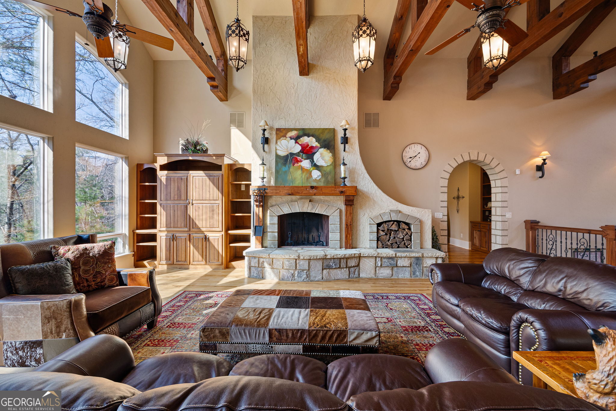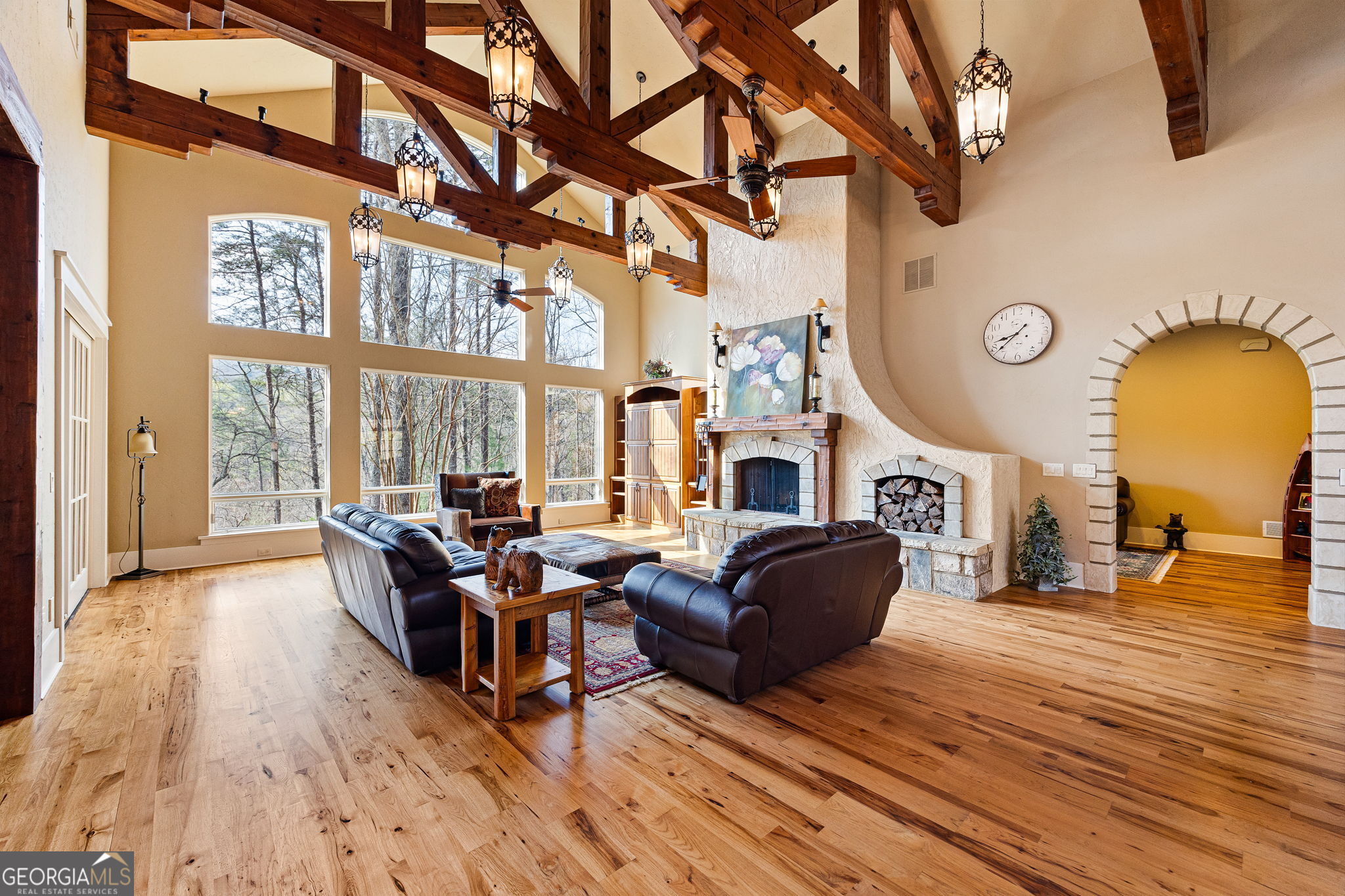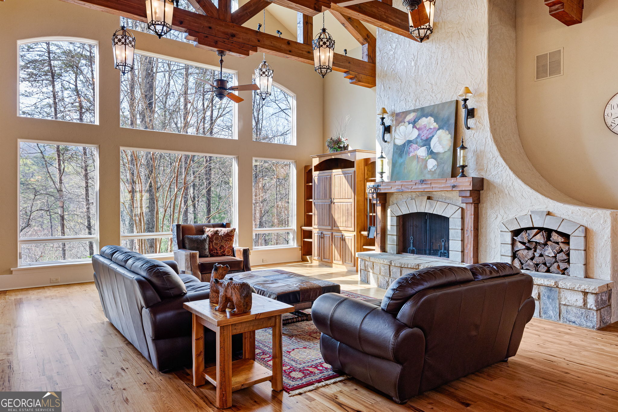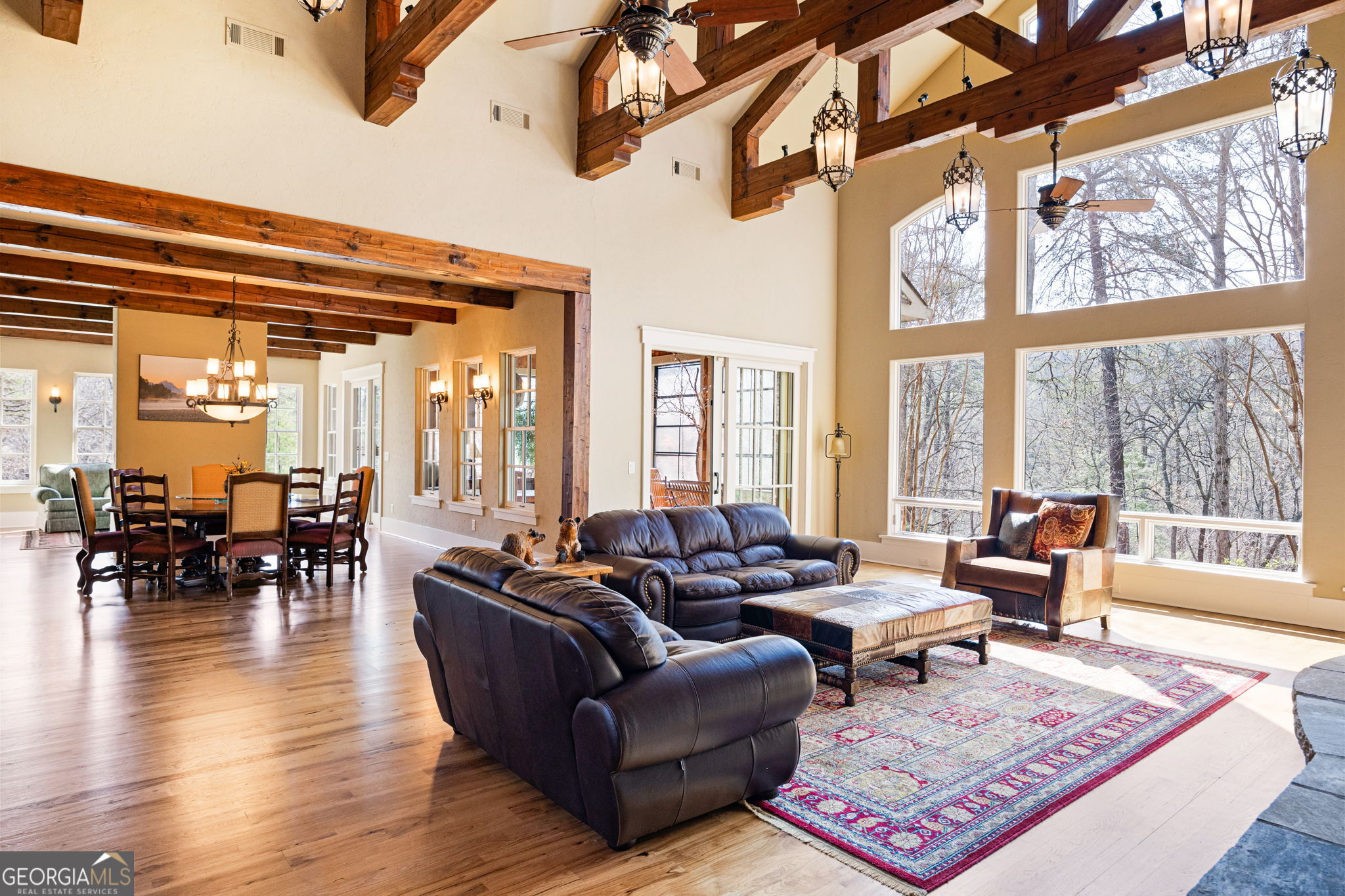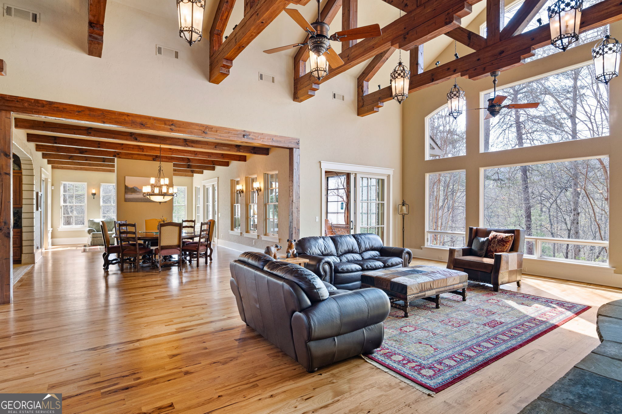 Nestled within the prestigious Wildcat section of Big Canoe, this extraordinary custom estate offers an unparalleled mountain living experience for the most discerning buyer. A sweeping curved driveway leads you to this architectural masterpiece, situated on approx 2.9 acres --where no detail has been overlooked. Step inside to soaring cathedral ceilings adorned with magnificent Hand hewn Custom Designed solid wood beams, custom crafted and planed on-site a testament to the exceptional quality found throughout this approx 9,300 square foot residence. Six bedrooms and seven full baths are spread across three levels, including a luxurious main-level master suite with sitting room, double vanity, whirlpool tub, and separate shower. Hand-finished hickory hardwood floors, rustic cherry cabinetry, and three fireplaces create an atmosphere of warmth and refined elegance. The chefs kitchen opens to a grand great room and cozy keeping room, flowing seamlessly to a screened porch and sunroom with fireplace all framed by breathtaking mountain views. Enter the Custom Designed Whimsical Bunkroom suite and be amazed! Four built in bunkbeds (each with lighting), large game area, two full baths and storage! The terrace level offers two additional bedrooms, three baths, a fitness room, and bonus spaces perfect for entertaining. A three-car garage and lovingly curated master gardens, designed by a Master Gardener, complete this remarkable property. Just some of the exceptional features: Pella Windows and Doors, Soft Corner Detailing throughout, designer selected finishes...the list is extensive!! Residents of Big Canoe enjoy world-class amenities including golf, lake, marina, pool, tennis, fitness center, clubhouse, and fine dining all within a secure, gated mountain retreat. A rare opportunity to own one of Big Canoes finest estates.