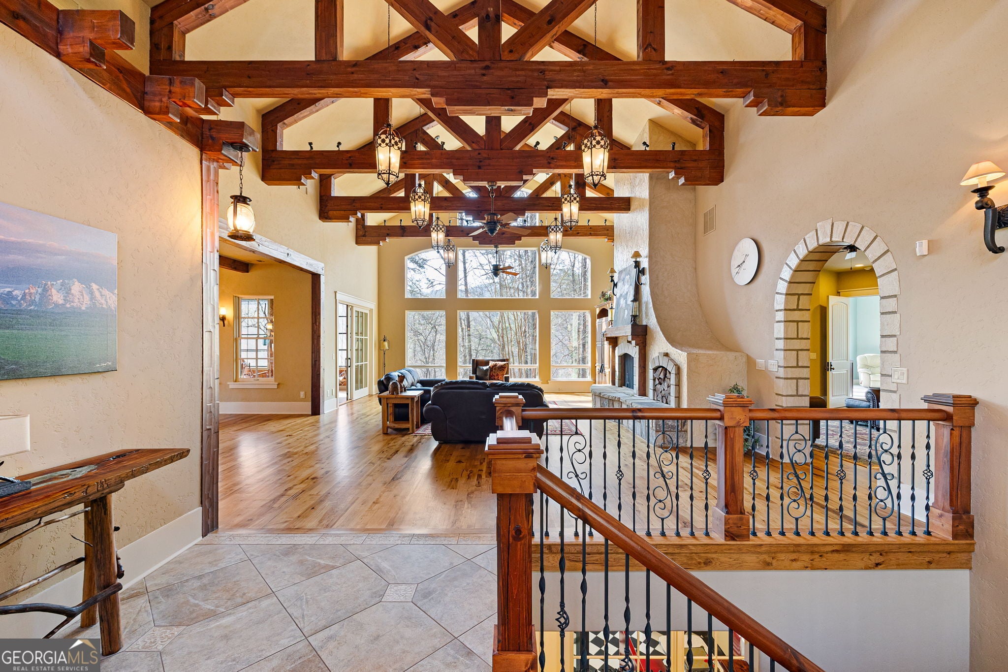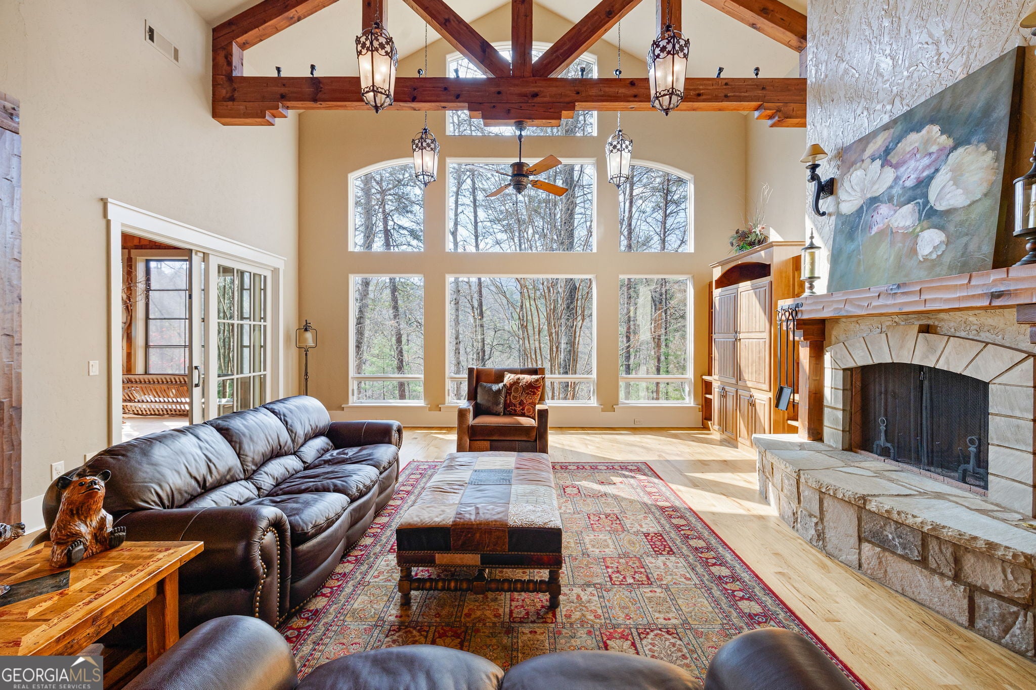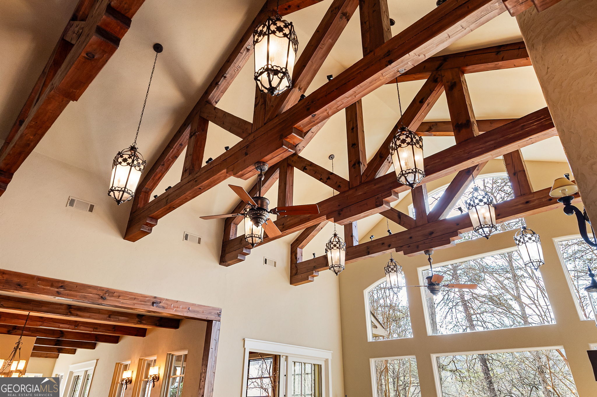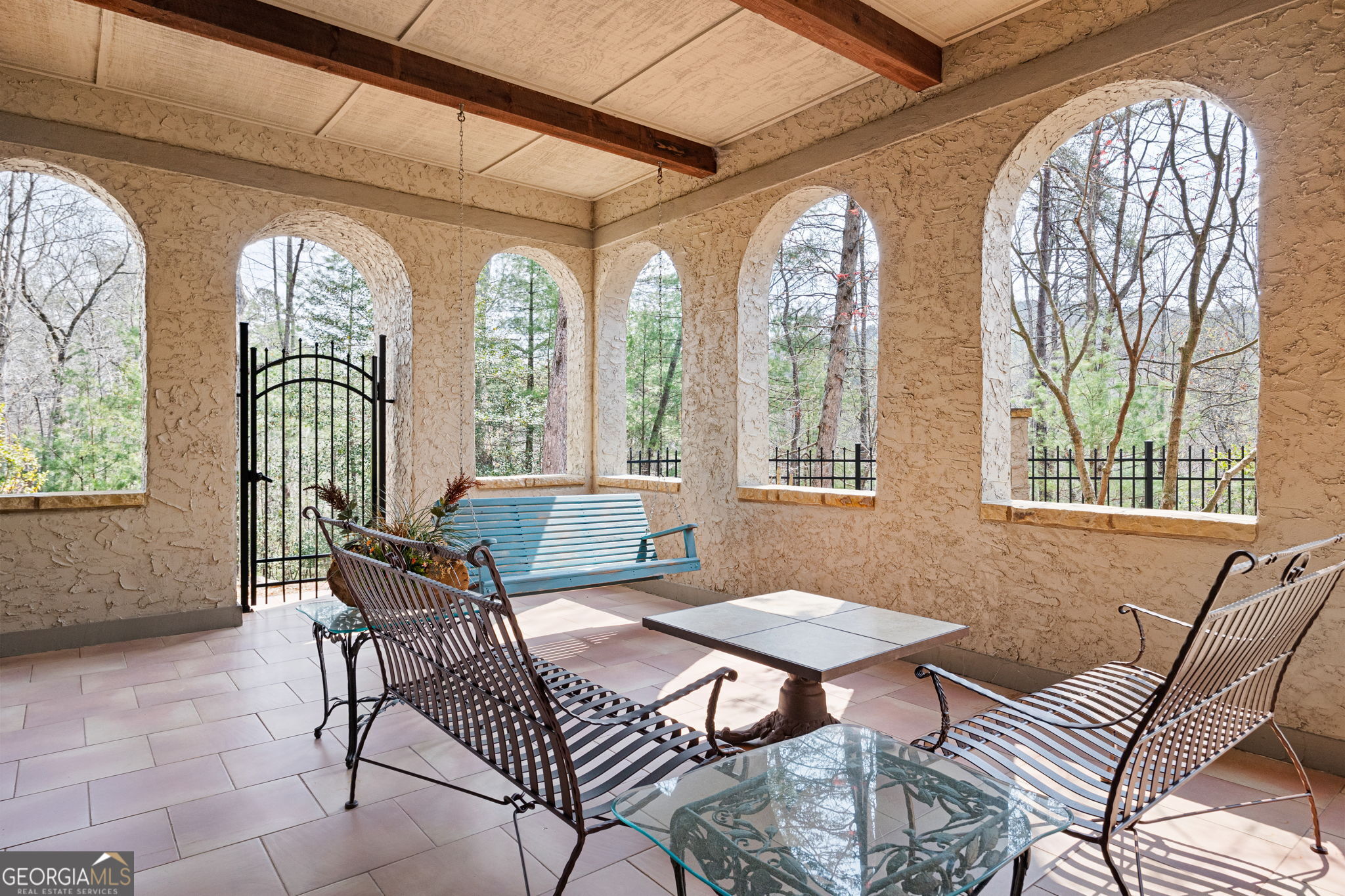 Nestled within the prestigious Wildcat section of Big Canoe, this extraordinary custom estate offers an unparalleled mountain living experience for the most discerning buyer. A sweeping curved driveway leads you to this architectural masterpiece, situated on approx 2.9 acres --where no detail has been overlooked. Step inside to soaring cathedral ceilings adorned with magnificent Hand hewn Custom Designed solid wood beams, custom crafted and planed on-site a testament to the exceptional quality found throughout this approx 9,300 square foot residence. Six bedrooms and seven full baths are spread across three levels, including a luxurious main-level master suite with sitting room, double vanity, whirlpool tub, and separate shower. Hand-finished hickory hardwood floors, rustic cherry cabinetry, and three fireplaces create an atmosphere of warmth and refined elegance. The chefs kitchen opens to a grand great room and cozy keeping room, flowing seamlessly to a screened porch and sunroom with fireplace all framed by breathtaking mountain views. Enter the Custom Designed Whimsical Bunkroom suite and be amazed! Four built in bunkbeds (each with lighting), large game area, two full baths and storage! The terrace level offers two additional bedrooms, three baths, a fitness room, and bonus spaces perfect for entertaining. A three-car garage and lovingly curated master gardens, designed by a Master Gardener, complete this remarkable property. Just some of the exceptional features: Pella Windows and Doors, Soft Corner Detailing throughout, designer selected finishes...the list is extensive!! Residents of Big Canoe enjoy world-class amenities including golf, lake, marina, pool, tennis, fitness center, clubhouse, and fine dining all within a secure, gated mountain retreat. A rare opportunity to own one of Big Canoes finest estates.