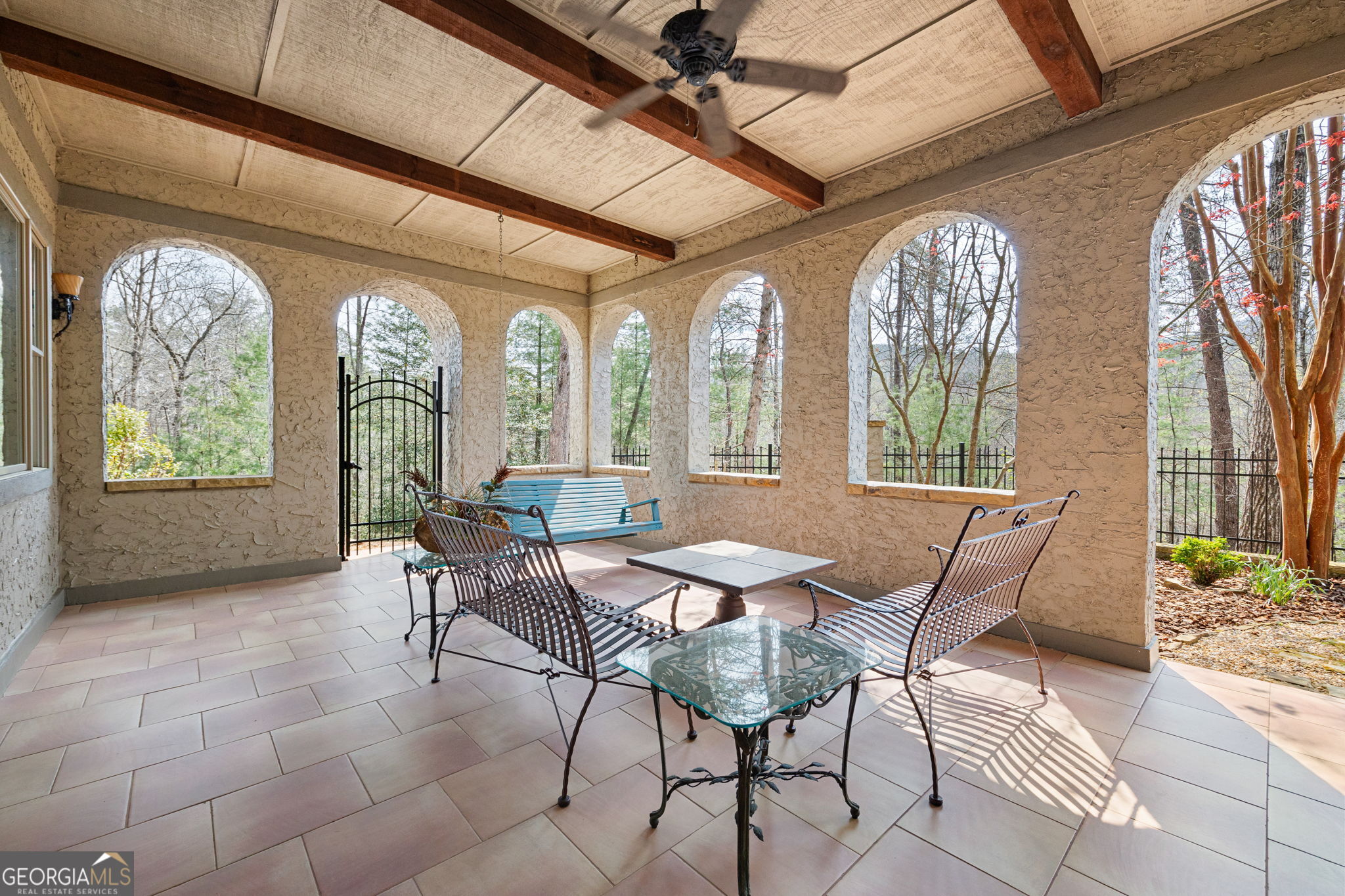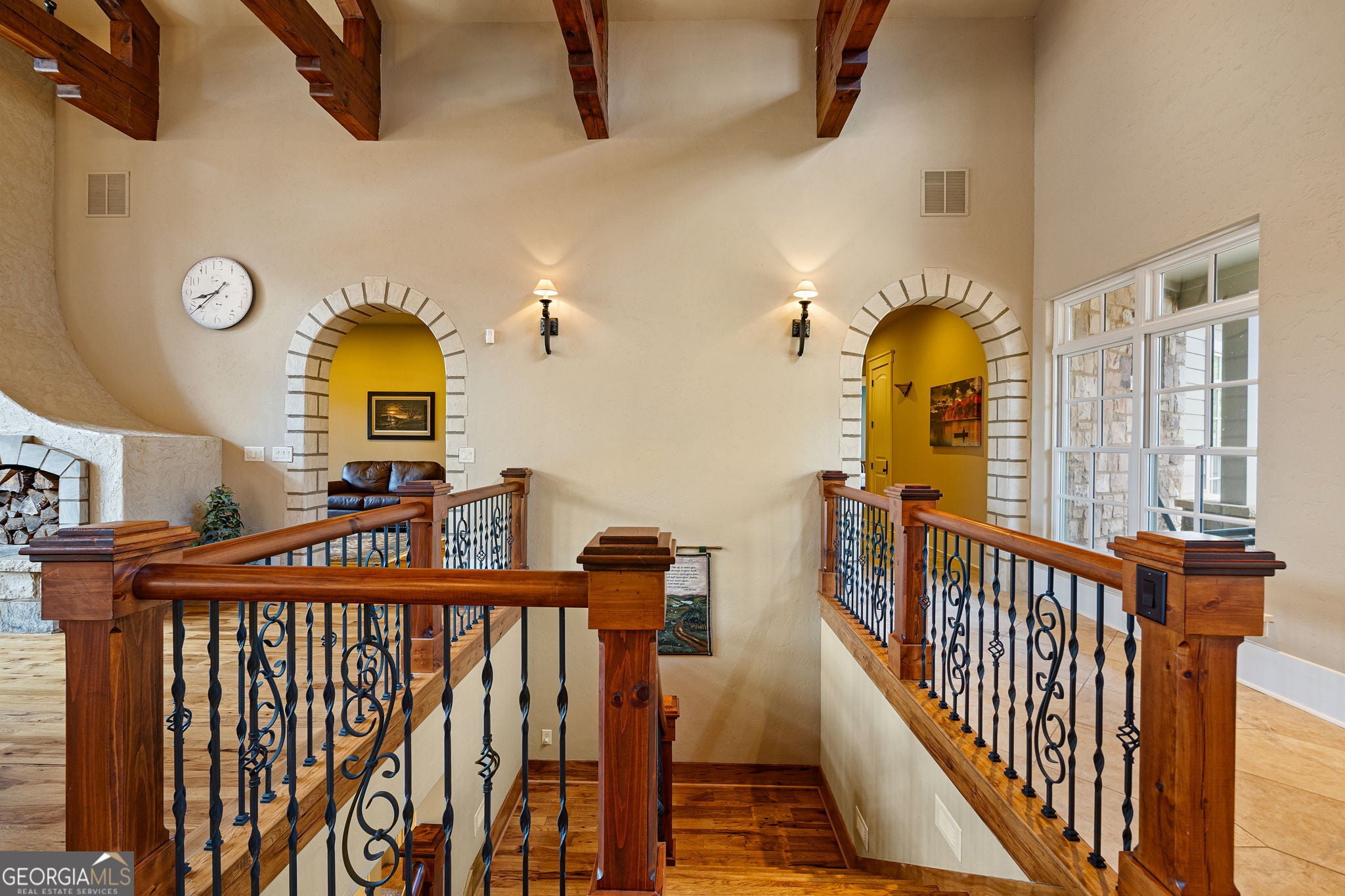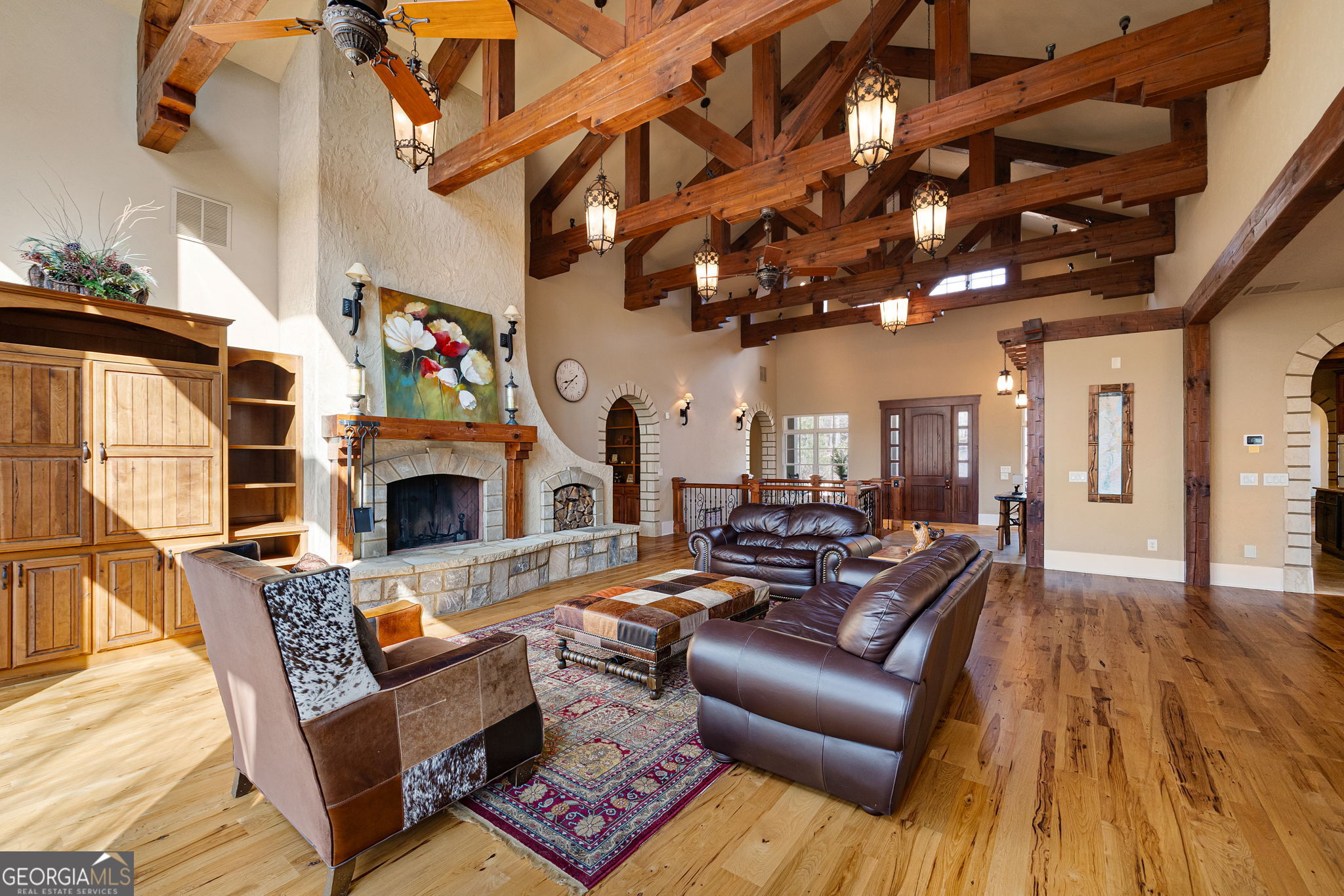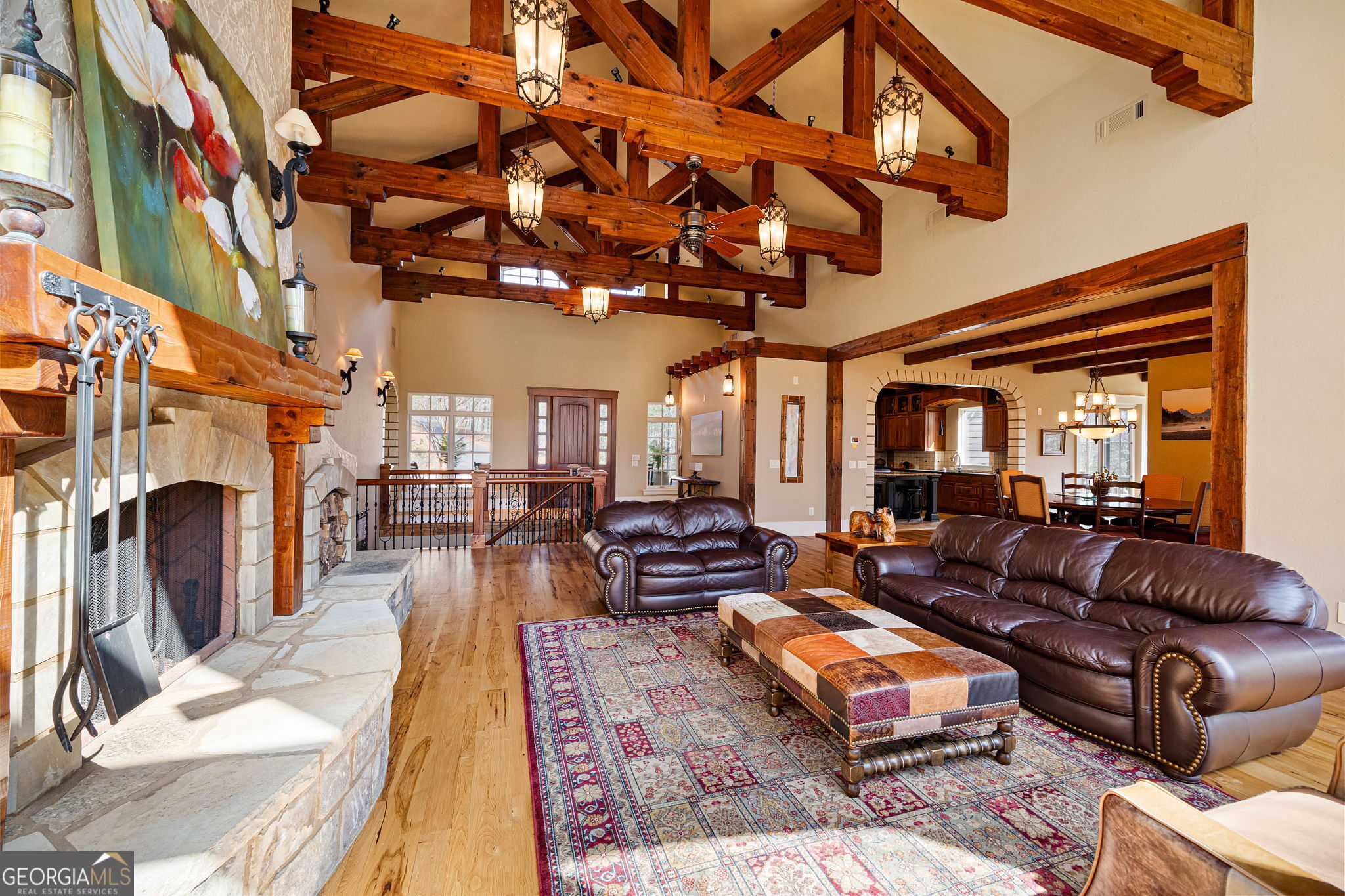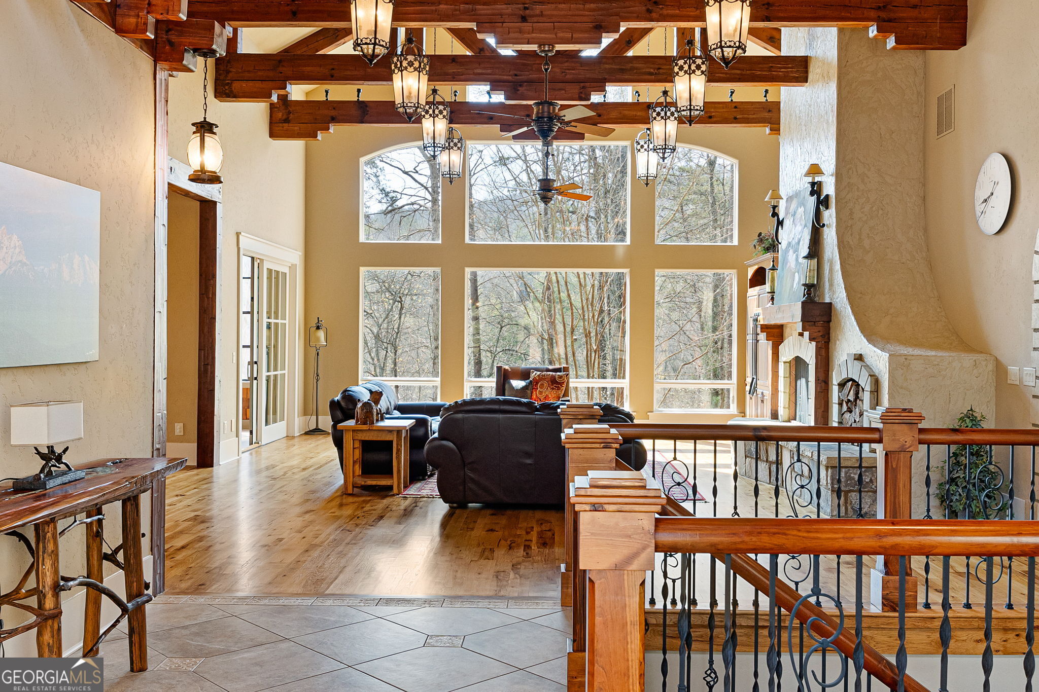 Nestled within the prestigious Wildcat section of Big Canoe, this extraordinary custom estate offers an unparalleled mountain living experience for the most discerning buyer. A sweeping curved driveway leads you to this architectural masterpiece, situated on approx 2.9 acres --where no detail has been overlooked. Step inside to soaring cathedral ceilings adorned with magnificent Hand hewn Custom Designed solid wood beams, custom crafted and planed on-site a testament to the exceptional quality found throughout this approx 9,300 square foot residence. Six bedrooms and seven full baths are spread across three levels, including a luxurious main-level master suite with sitting room, double vanity, whirlpool tub, and separate shower. Hand-finished hickory hardwood floors, rustic cherry cabinetry, and three fireplaces create an atmosphere of warmth and refined elegance. The chefs kitchen opens to a grand great room and cozy keeping room, flowing seamlessly to a screened porch and sunroom with fireplace all framed by breathtaking mountain views. Enter the Custom Designed Whimsical Bunkroom suite and be amazed! Four built in bunkbeds (each with lighting), large game area, two full baths and storage! The terrace level offers two additional bedrooms, three baths, a fitness room, and bonus spaces perfect for entertaining. A three-car garage and lovingly curated master gardens, designed by a Master Gardener, complete this remarkable property. Just some of the exceptional features: Pella Windows and Doors, Soft Corner Detailing throughout, designer selected finishes...the list is extensive!! Residents of Big Canoe enjoy world-class amenities including golf, lake, marina, pool, tennis, fitness center, clubhouse, and fine dining all within a secure, gated mountain retreat. A rare opportunity to own one of Big Canoes finest estates.