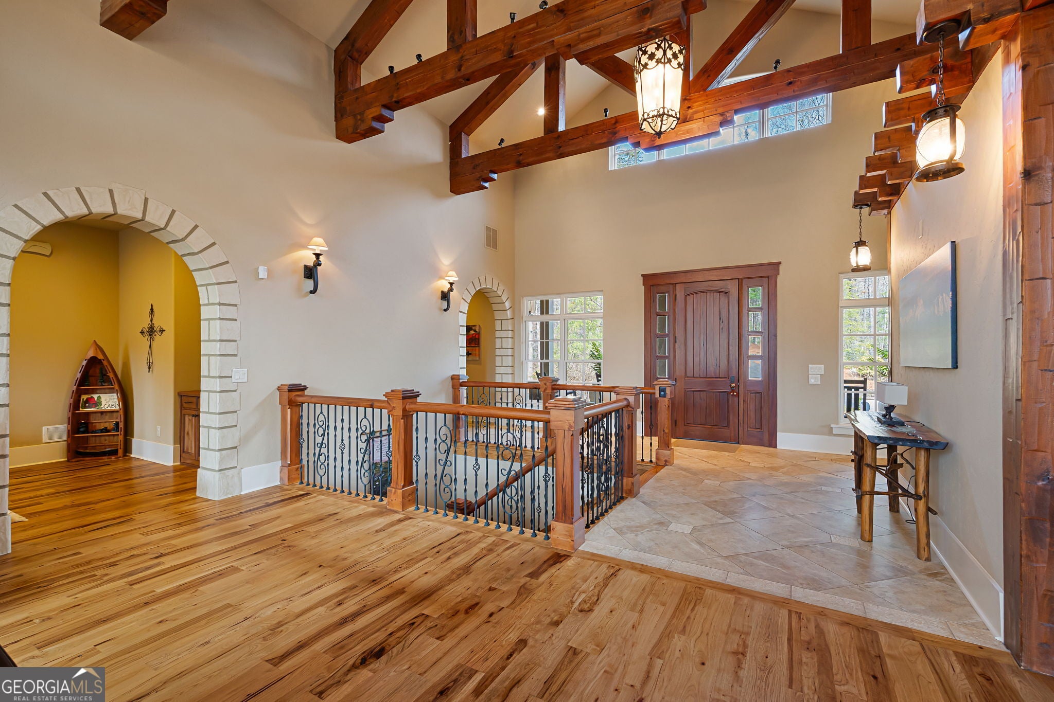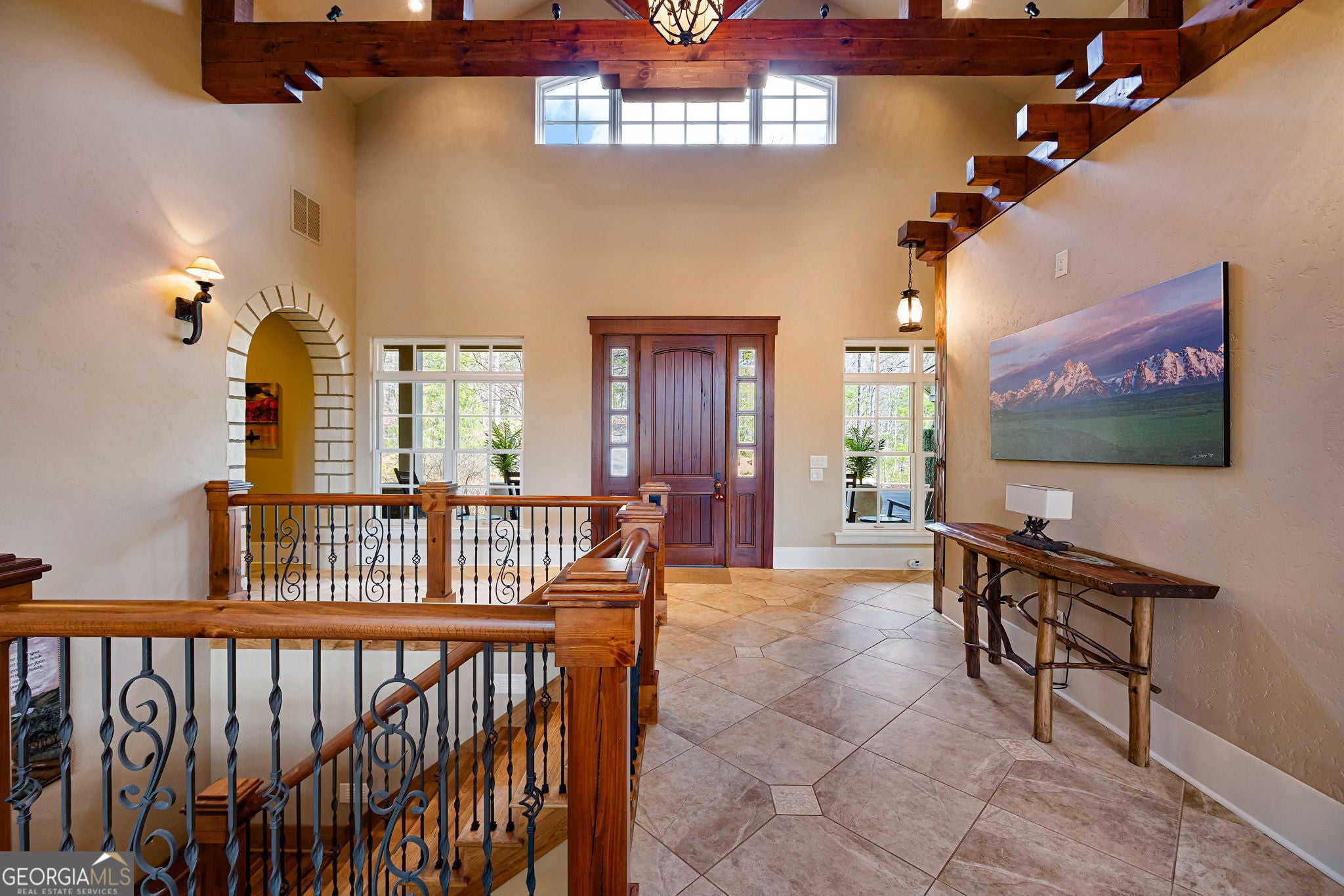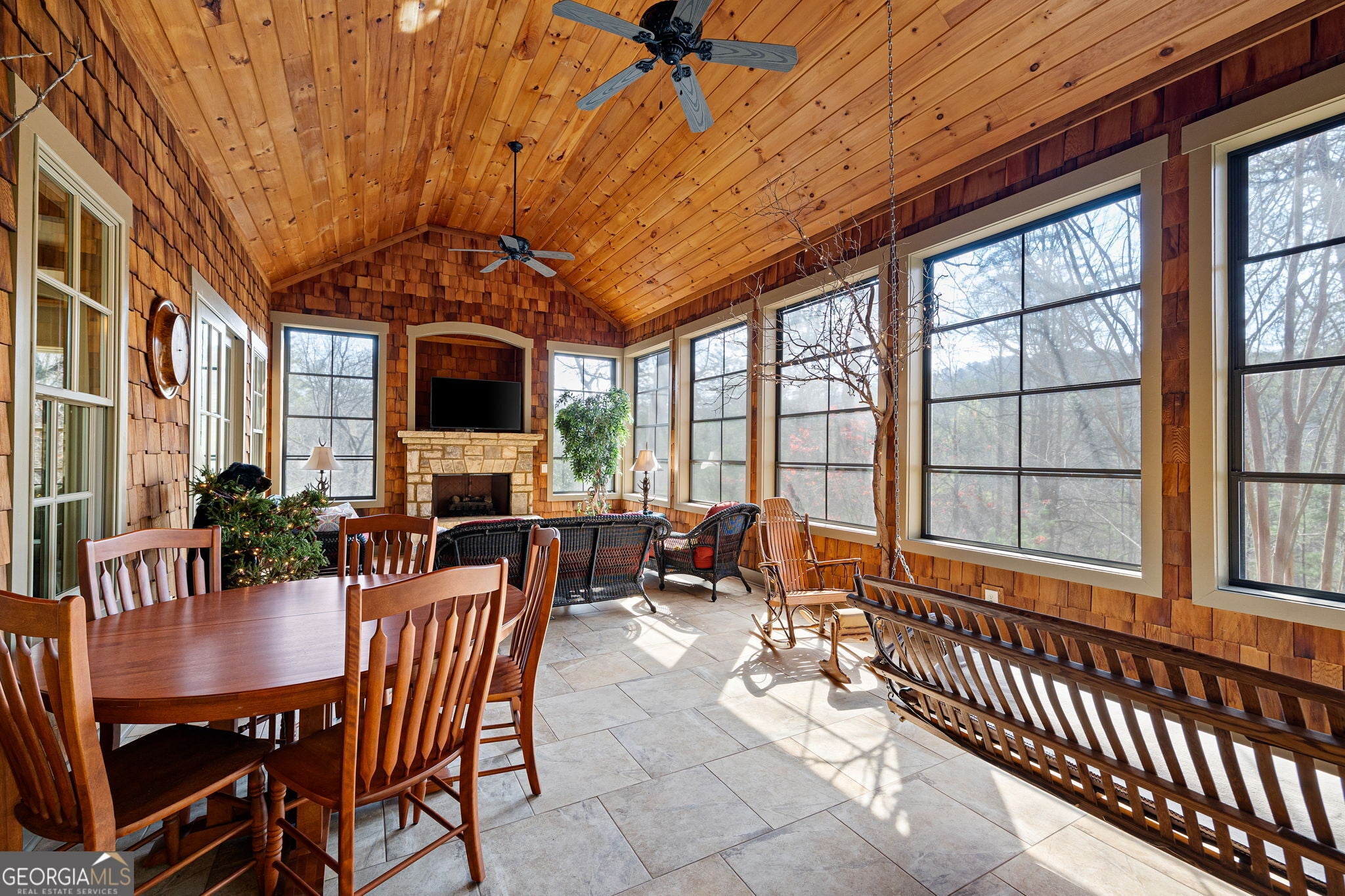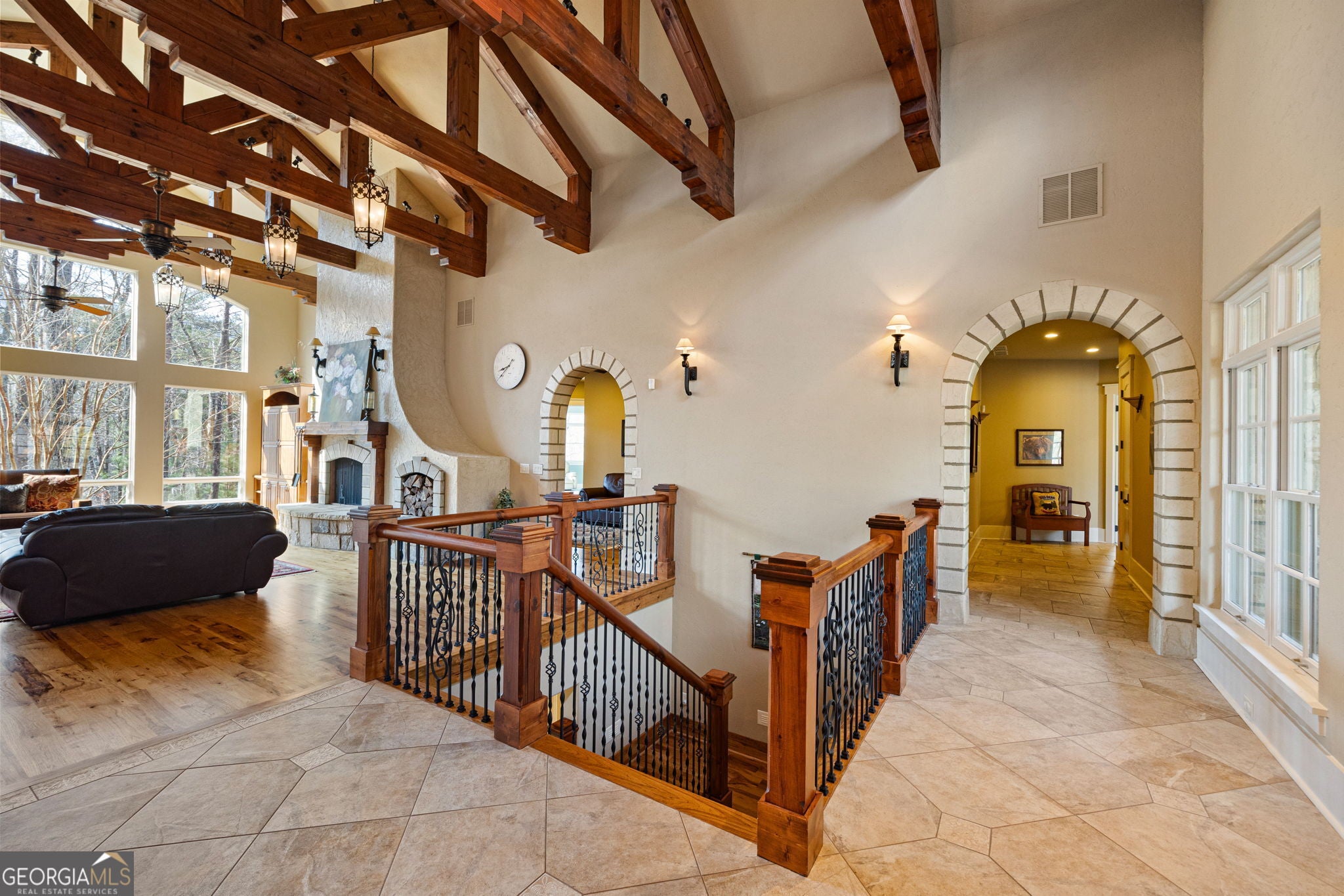 Nestled within the prestigious Wildcat section of Big Canoe, this extraordinary custom estate offers an unparalleled mountain living experience for the most discerning buyer. A sweeping curved driveway leads you to this architectural masterpiece, situated on approx 2.9 acres --where no detail has been overlooked. Step inside to soaring cathedral ceilings adorned with magnificent Hand hewn Custom Designed solid wood beams, custom crafted and planed on-site a testament to the exceptional quality found throughout this approx 9,300 square foot residence. Six bedrooms and seven full baths are spread across three levels, including a luxurious main-level master suite with sitting room, double vanity, whirlpool tub, and separate shower. Hand-finished hickory hardwood floors, rustic cherry cabinetry, and three fireplaces create an atmosphere of warmth and refined elegance. The chefs kitchen opens to a grand great room and cozy keeping room, flowing seamlessly to a screened porch and sunroom with fireplace all framed by breathtaking mountain views. Enter the Custom Designed Whimsical Bunkroom suite and be amazed! Four built in bunkbeds (each with lighting), large game area, two full baths and storage! The terrace level offers two additional bedrooms, three baths, a fitness room, and bonus spaces perfect for entertaining. A three-car garage and lovingly curated master gardens, designed by a Master Gardener, complete this remarkable property. Just some of the exceptional features: Pella Windows and Doors, Soft Corner Detailing throughout, designer selected finishes...the list is extensive!! Residents of Big Canoe enjoy world-class amenities including golf, lake, marina, pool, tennis, fitness center, clubhouse, and fine dining all within a secure, gated mountain retreat. A rare opportunity to own one of Big Canoes finest estates.