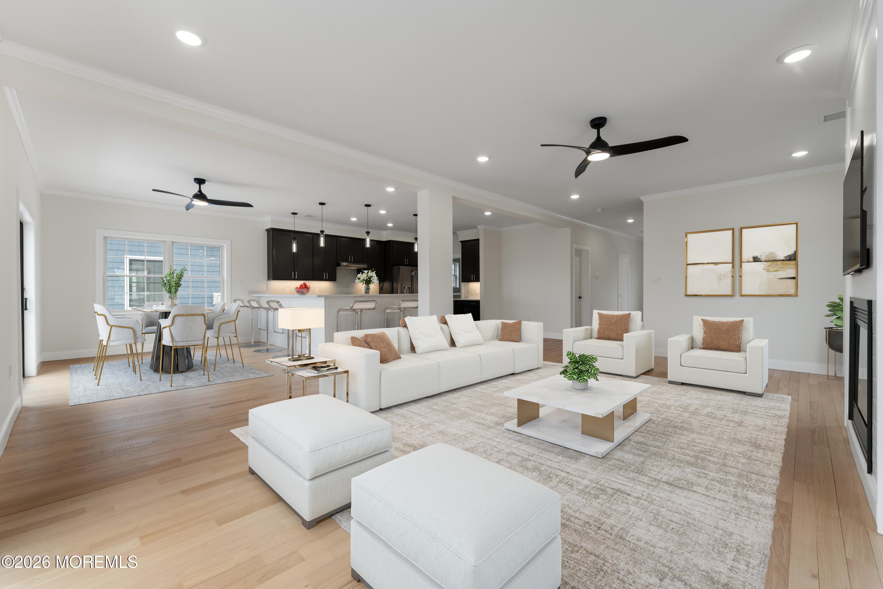 The epitome of a modern coastal New Construction waterfront home with this 4 Bedroom (Possible 5th Bedroom 4 Bathroom retreat... Meticulously designed with comfort, convenience, and style in mind. The elevator stops at all 3 floors, allowing the opportunity for Multi-generational living. First floor offers a Bright and Open layout with a Stylish kitchen with Shaker cabinets, Quartz countertops & backsplash, Stainless Steel KitchenAid appliances, and over sized breakfast bar. Primary Master Suite offers a walk-in closet, Double vanity sinks, soaking tub and Custom walk-in showers. 3rd Floor bonus room with wet-bar, full bathroom, and private deck. Other notable features include: Hardwood Floors throughout, 9 ceilings on the 1st floor, 2 gas fireplaces, an elevator, 2 zoned HVAC, upgraded Black Andersen 400 Windows & Black Andersen sliding doors, and multi-level covered decks. Backyard offers a deep lagoon with a vinyl bulkhead made to last, a Brick paver patio & Driveway. Future development with approvals from the Township for the property across the street. Direct access to the Barnegat Bay with no height restrictions, quick access to F-Cove, and Tices Shoal. Located close to Marinas, dockside dining Restaurants, Parks, and GSP. Just over the Bridge and you are right in Seaside at the Beach! This is everything you could want and need in your shore home!