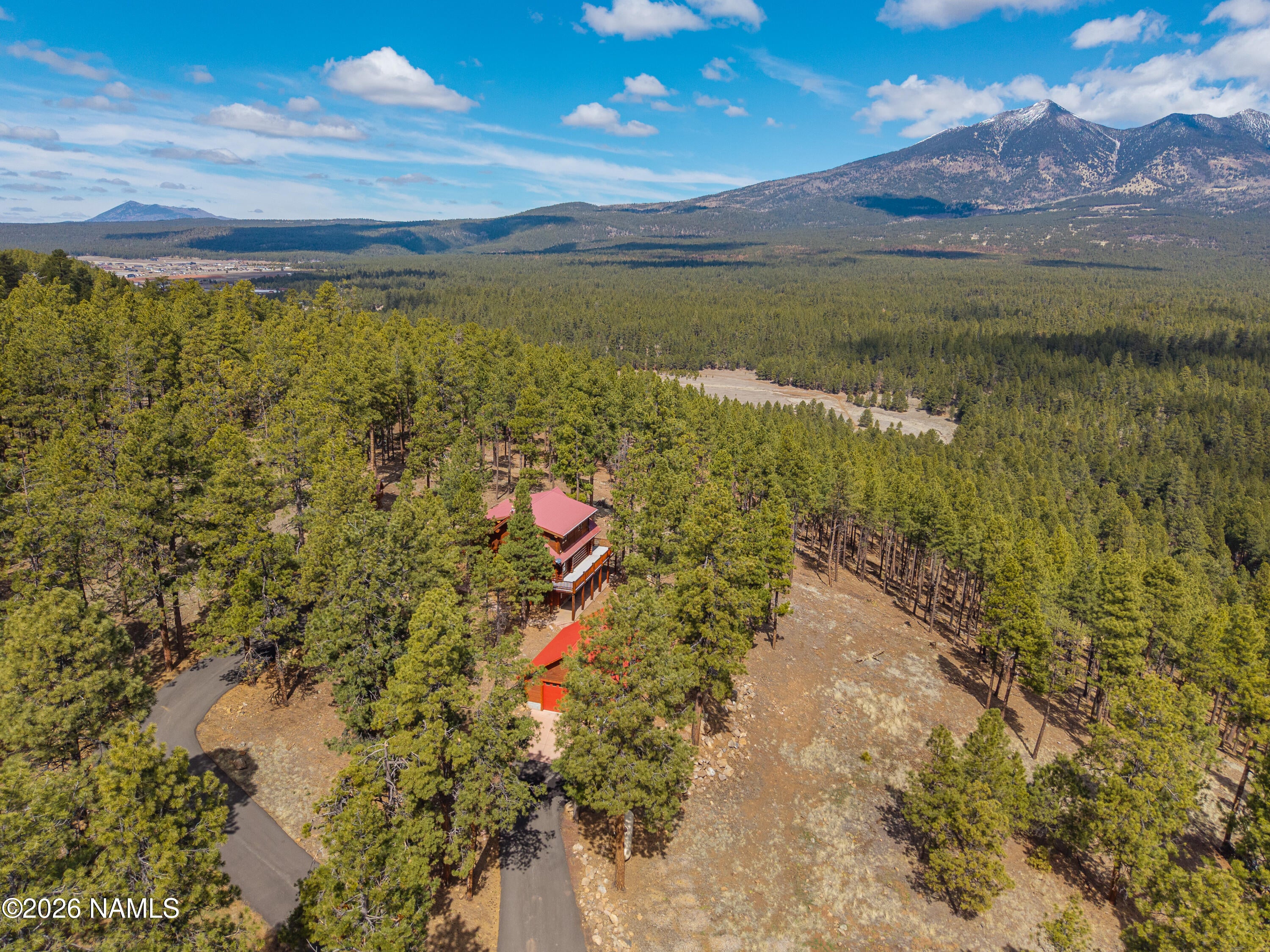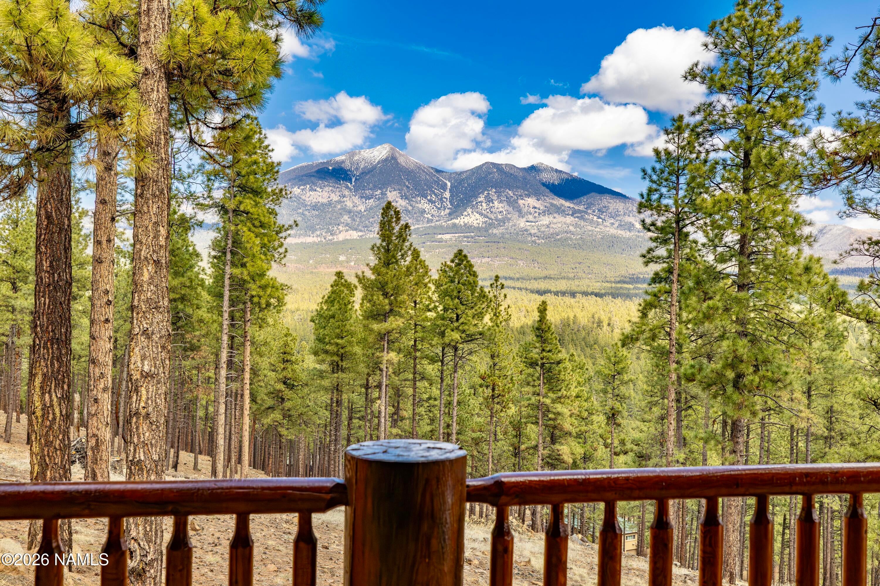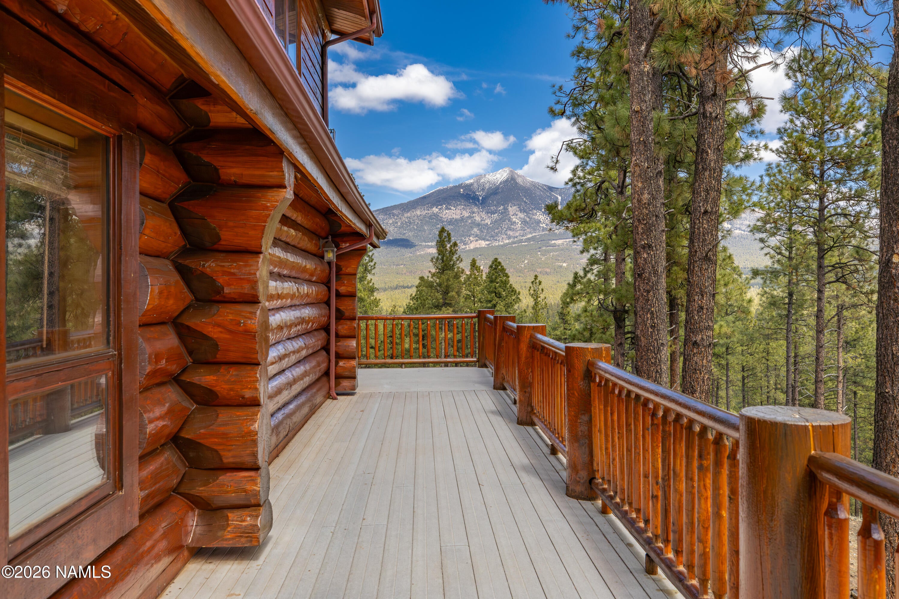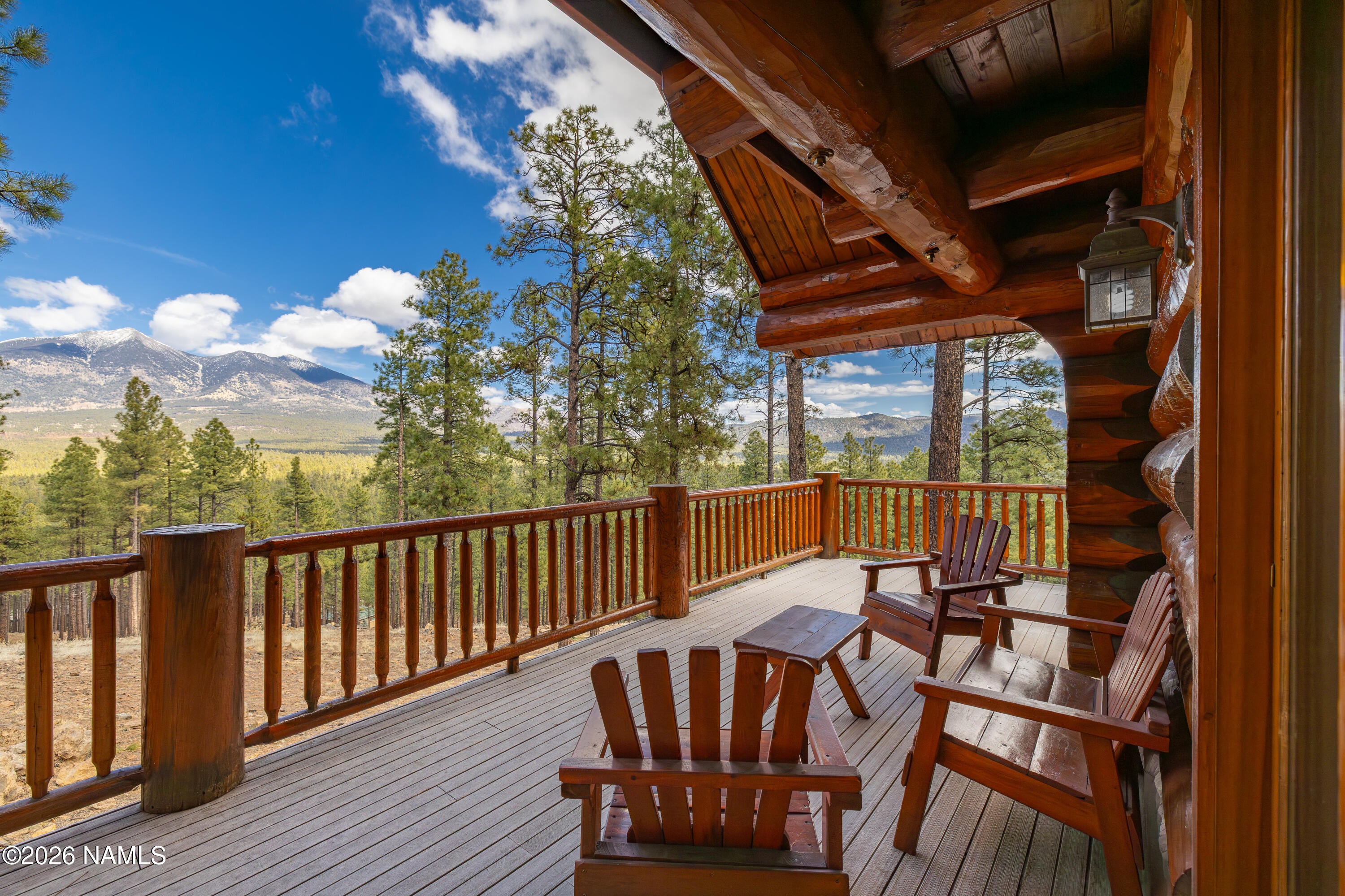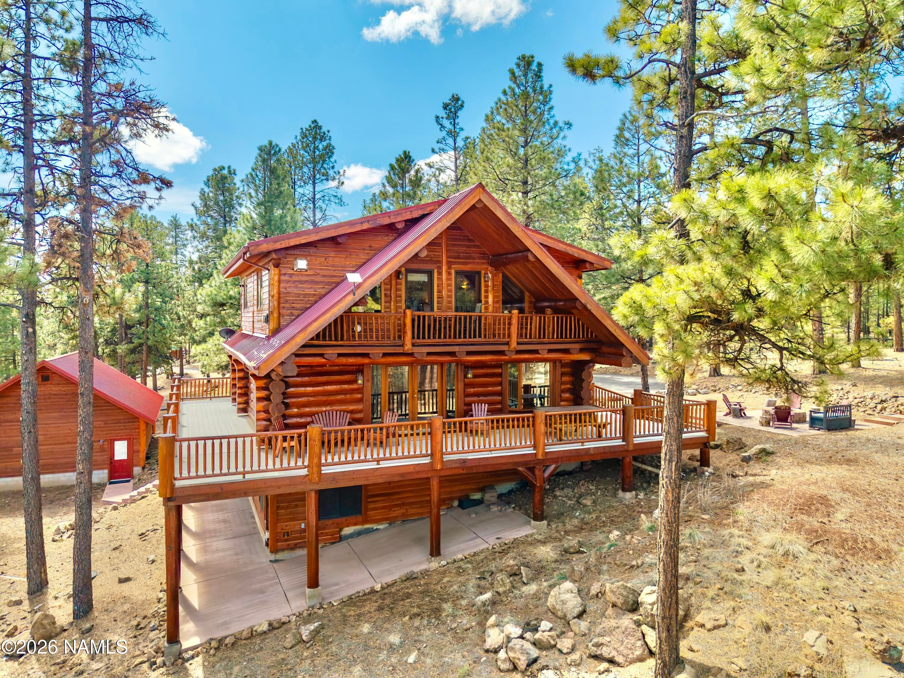 Looking for privacy, peace, and panoramic Peaks views--this is it! Tucked among pines on 2.3 private acres bordering Coconino National Forest, this beautifully maintained, authentic log cabin captures the essence of Flagstaff mountain living. Unobstructed San Francisco Peaks views take center stage, with two levels of decking designed to fully take them in. Wildlife moves freely through the property, and miles of trails begin just beyond your boundary. Inside, this artistically designed log home offers warm, comfortable living across three levels, each with its own propane fireplace, creating inviting spaces to relax year-round. Enjoy exceptional stargazing from the fire pit patio or near the treehouse, thanks to minimal light pollution and being set back from the main road. A detached oversized garage offers ample space for vehicles and gear. A rare combination of privacy, views, and direct forest access--this is Flagstaff living at 7,500 feet elevation!