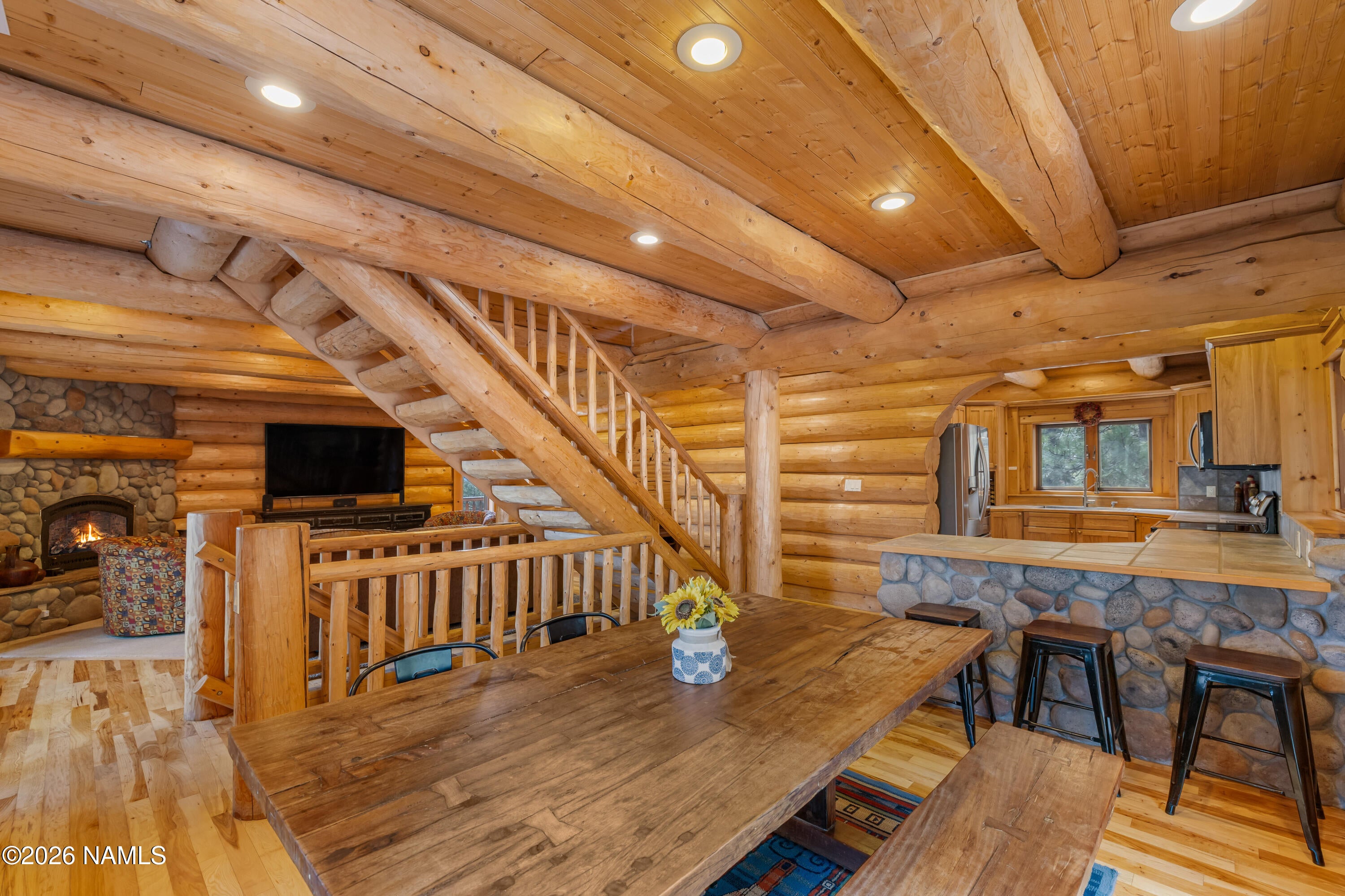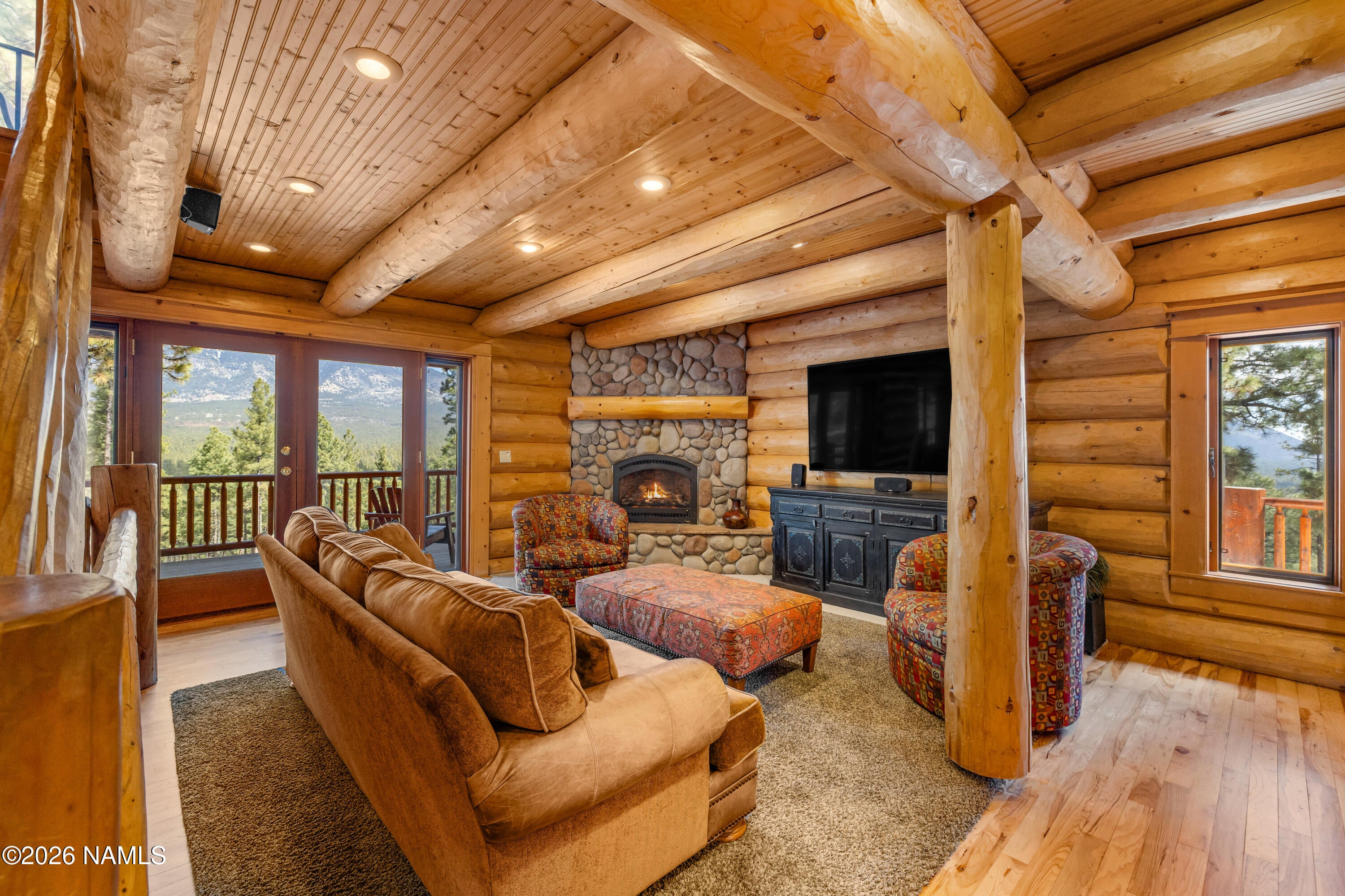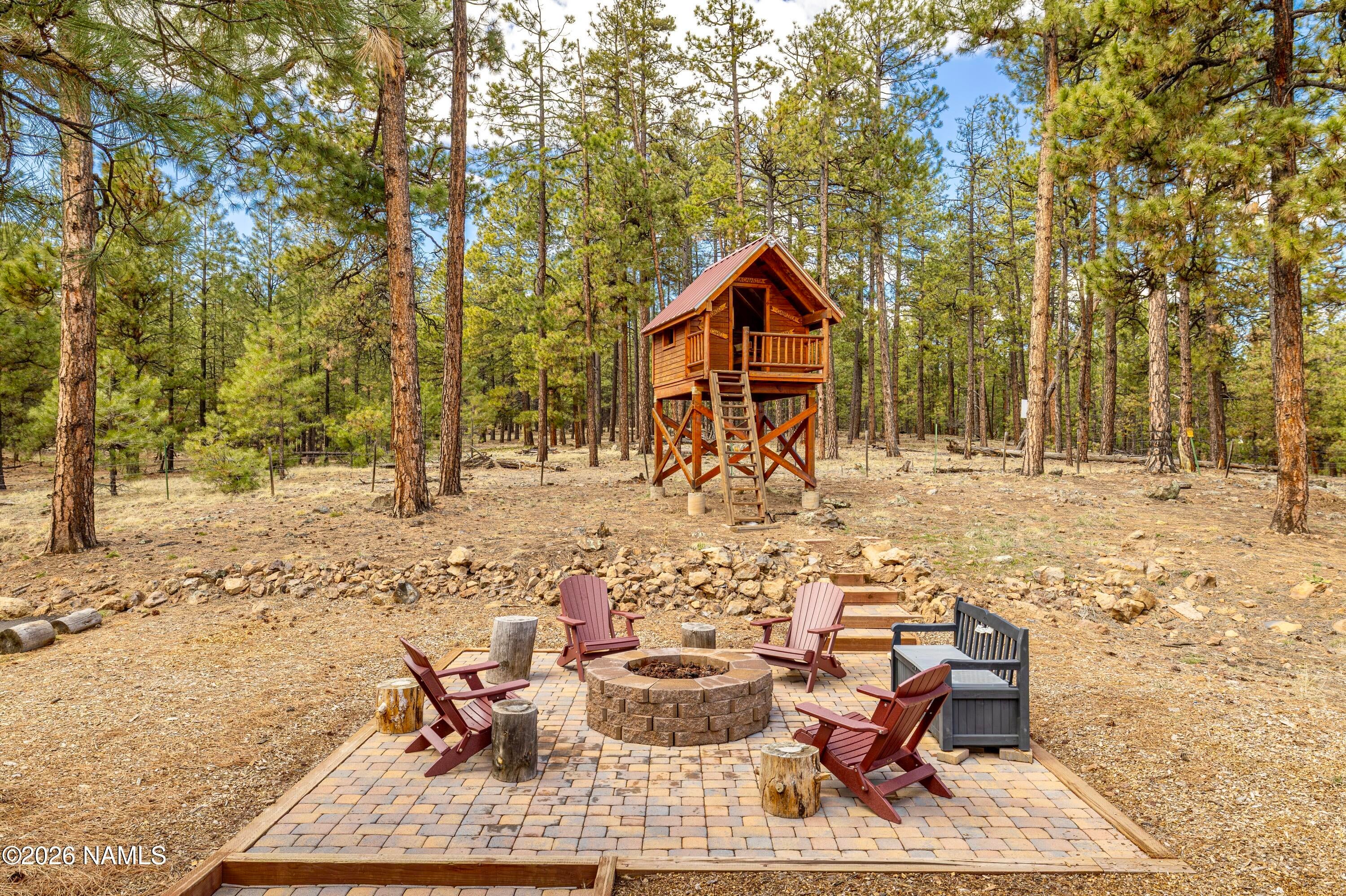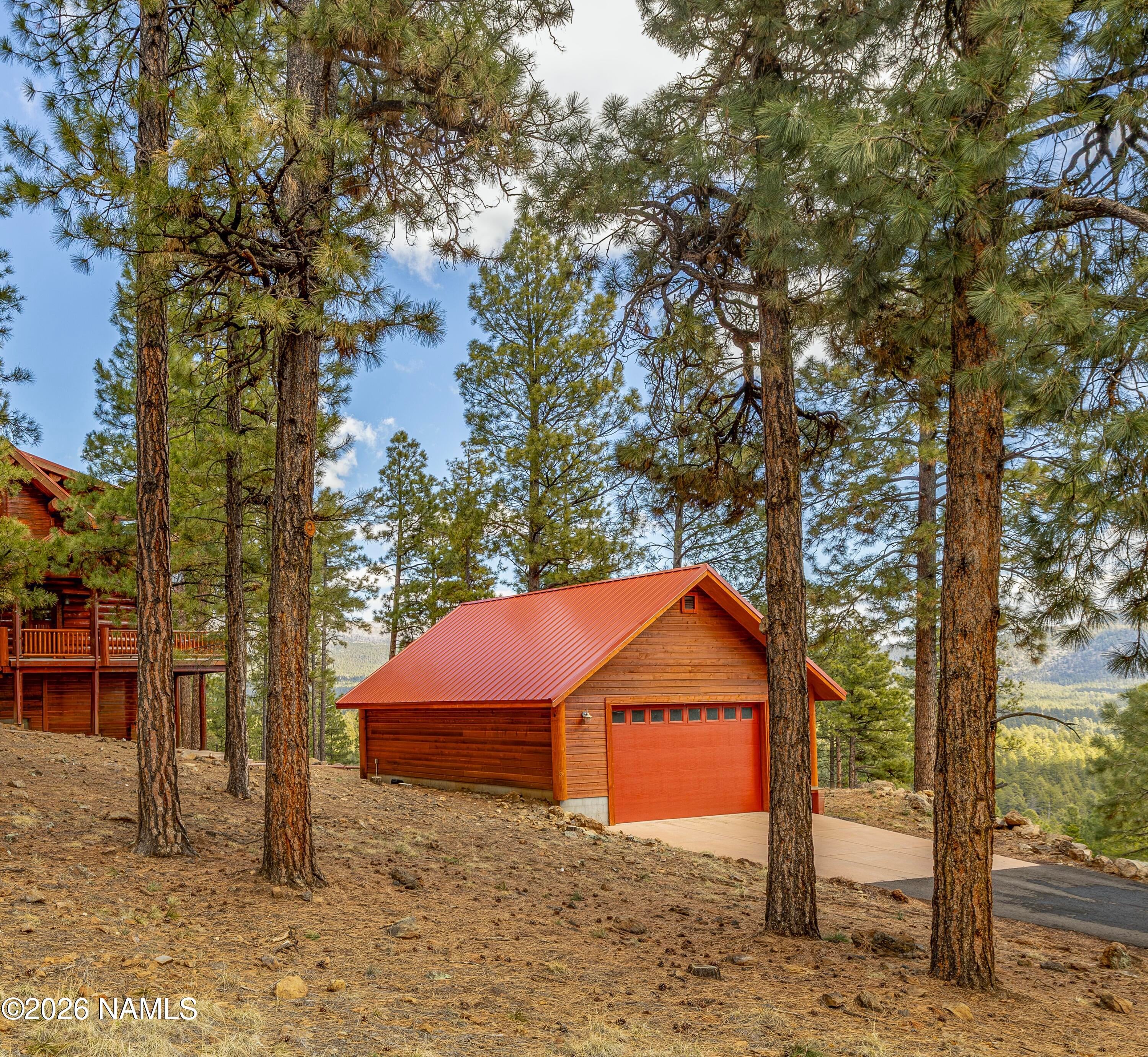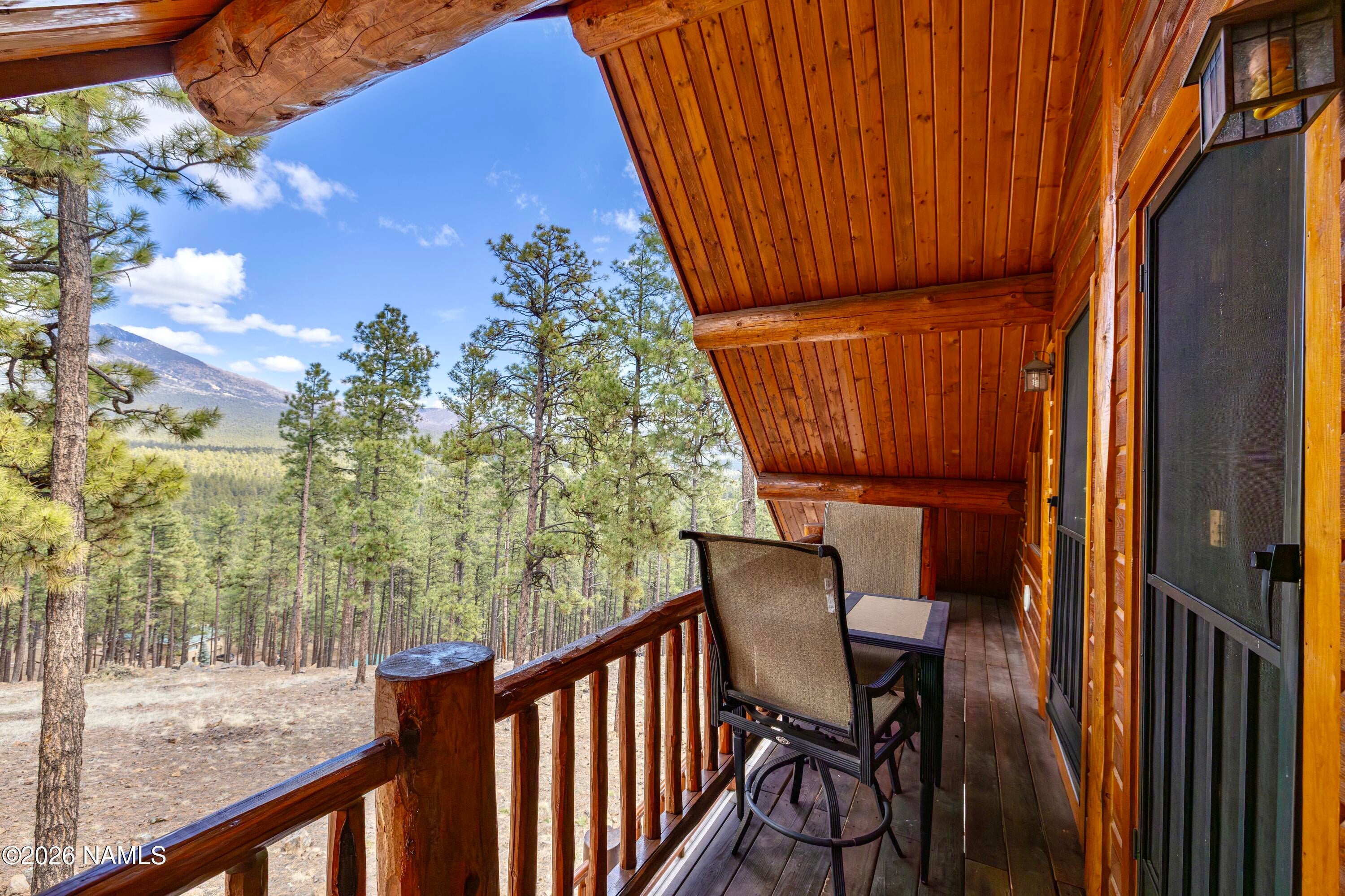 Looking for privacy, peace, and panoramic Peaks views--this is it! Tucked among pines on 2.3 private acres bordering Coconino National Forest, this beautifully maintained, authentic log cabin captures the essence of Flagstaff mountain living. Unobstructed San Francisco Peaks views take center stage, with two levels of decking designed to fully take them in. Wildlife moves freely through the property, and miles of trails begin just beyond your boundary. Inside, this artistically designed log home offers warm, comfortable living across three levels, each with its own propane fireplace, creating inviting spaces to relax year-round. Enjoy exceptional stargazing from the fire pit patio or near the treehouse, thanks to minimal light pollution and being set back from the main road. A detached oversized garage offers ample space for vehicles and gear. A rare combination of privacy, views, and direct forest access--this is Flagstaff living at 7,500 feet elevation!