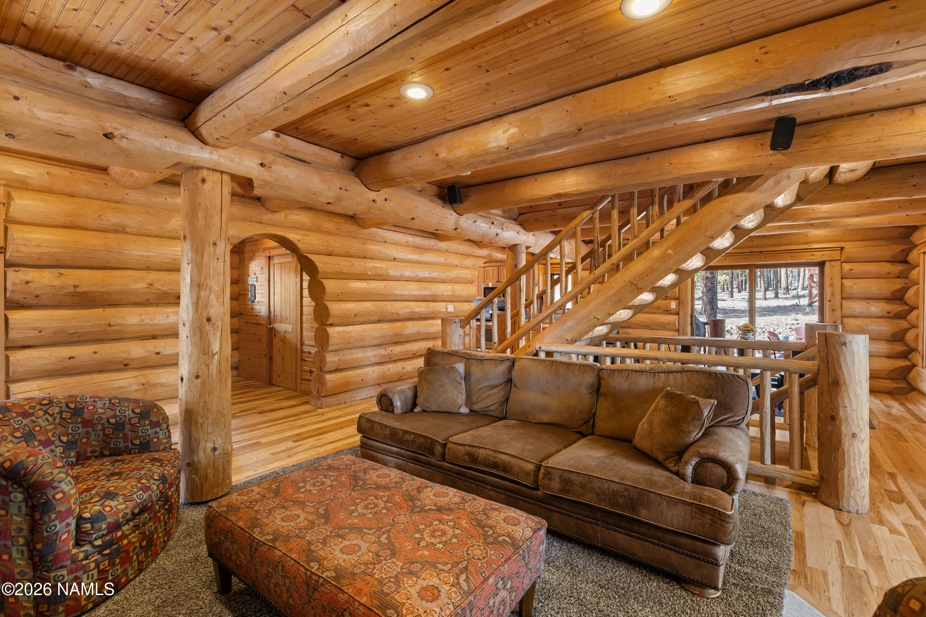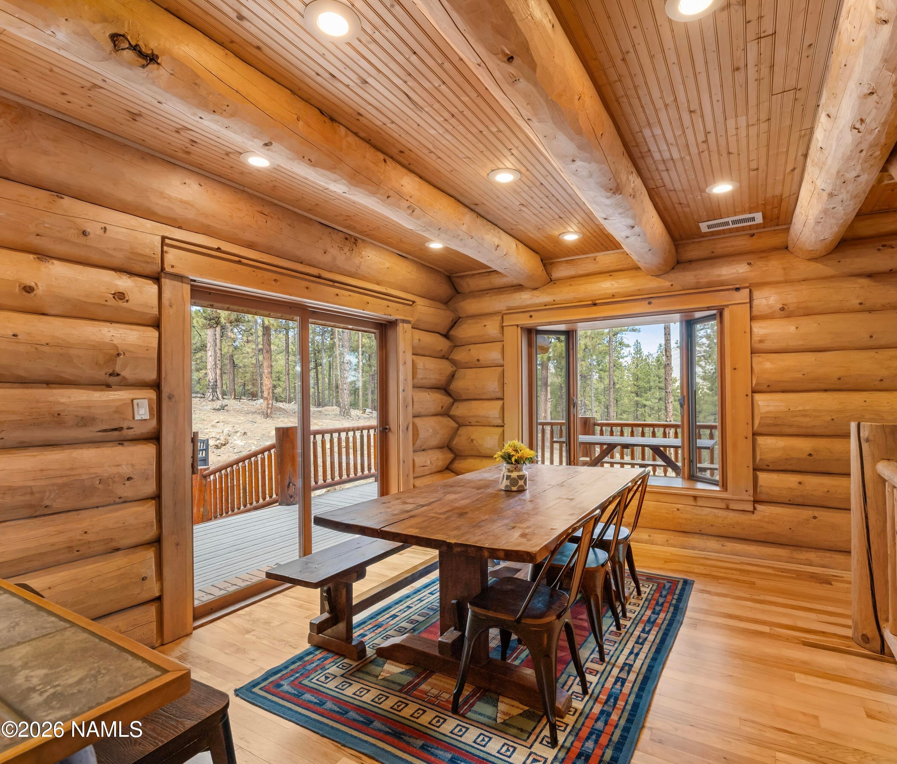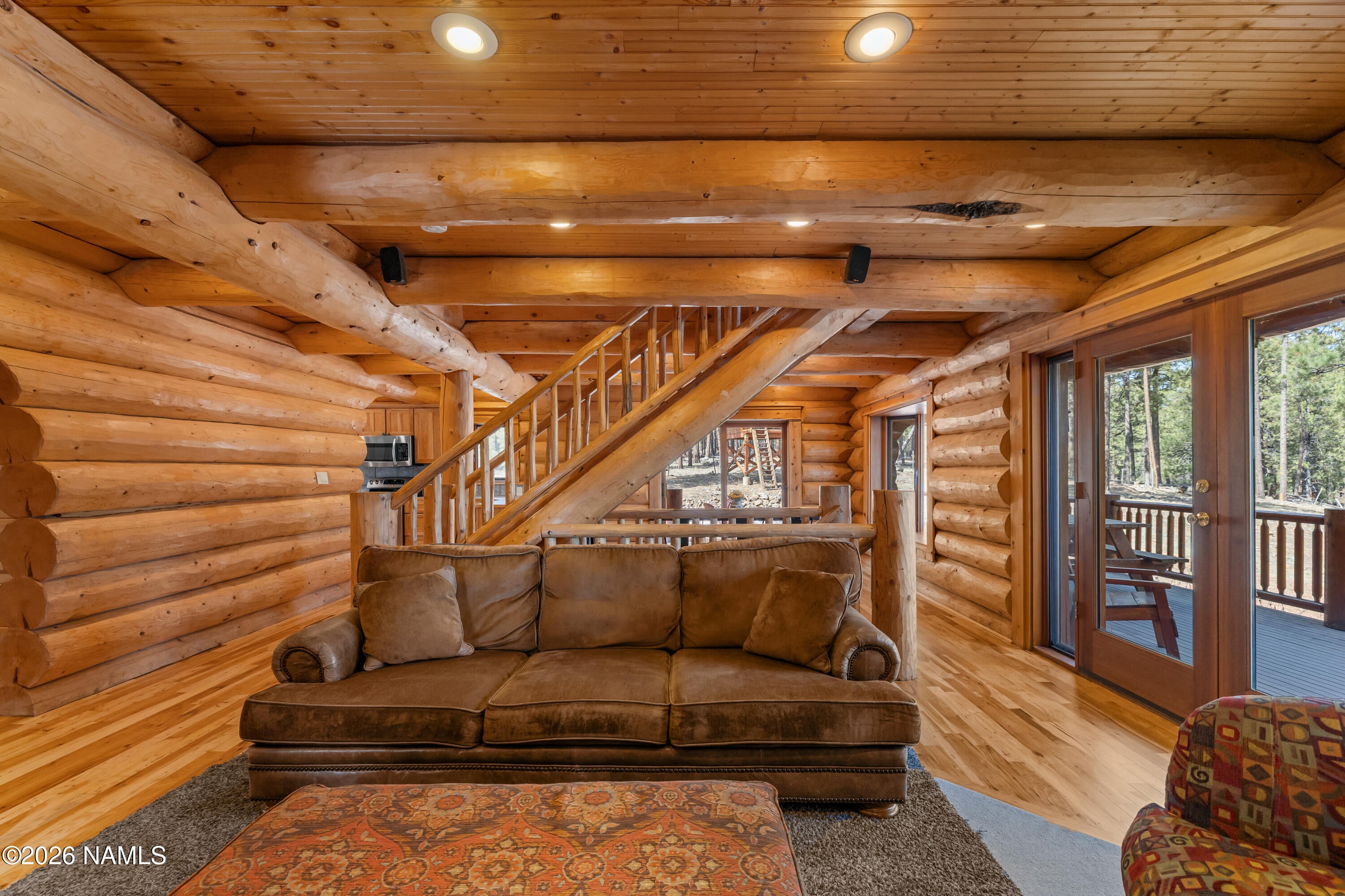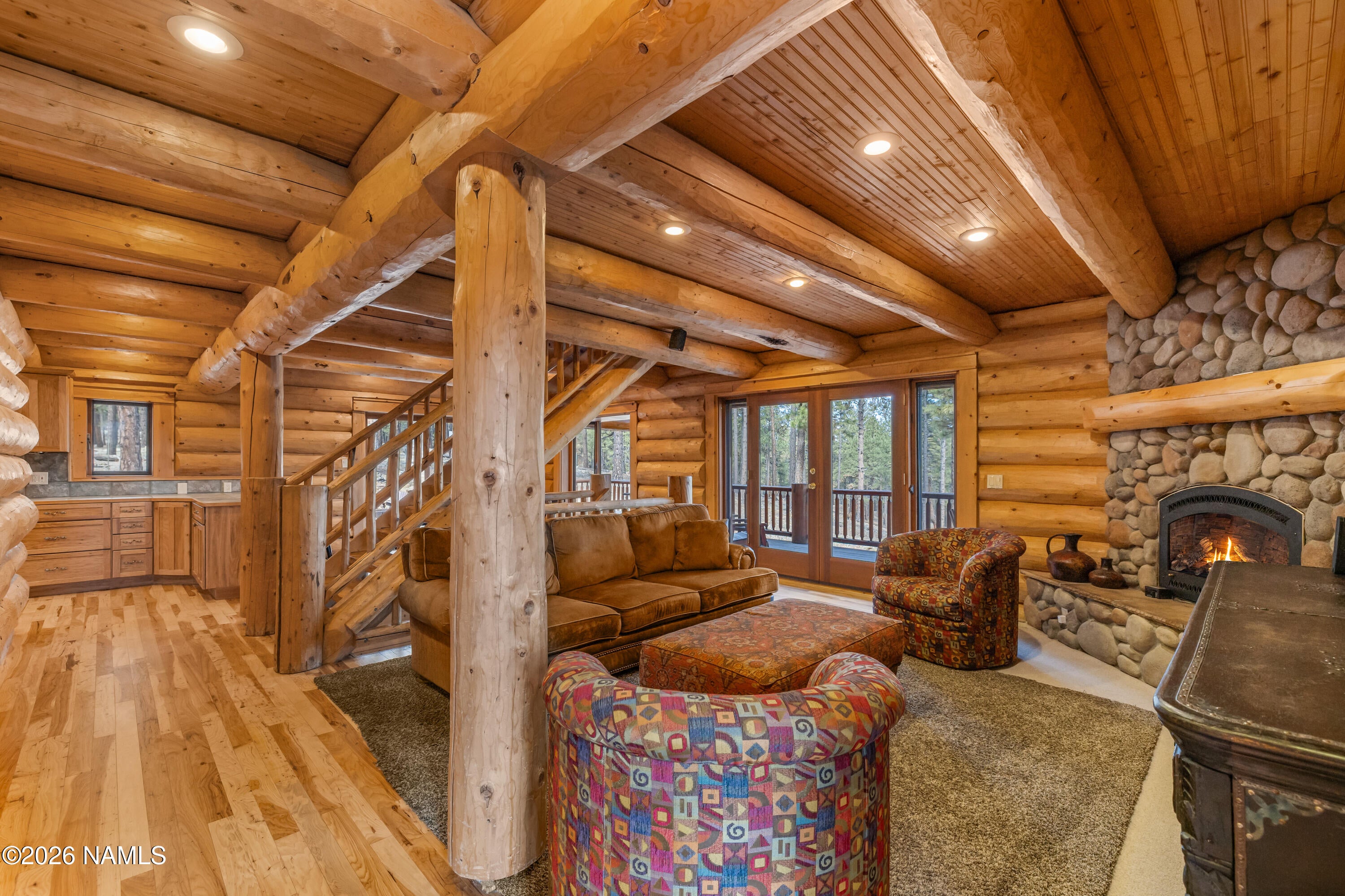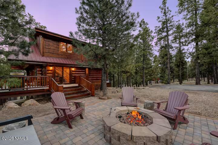 Looking for privacy, peace, and panoramic Peaks views--this is it! Tucked among pines on 2.3 private acres bordering Coconino National Forest, this beautifully maintained, authentic log cabin captures the essence of Flagstaff mountain living. Unobstructed San Francisco Peaks views take center stage, with two levels of decking designed to fully take them in. Wildlife moves freely through the property, and miles of trails begin just beyond your boundary. Inside, this artistically designed log home offers warm, comfortable living across three levels, each with its own propane fireplace, creating inviting spaces to relax year-round. Enjoy exceptional stargazing from the fire pit patio or near the treehouse, thanks to minimal light pollution and being set back from the main road. A detached oversized garage offers ample space for vehicles and gear. A rare combination of privacy, views, and direct forest access--this is Flagstaff living at 7,500 feet elevation!