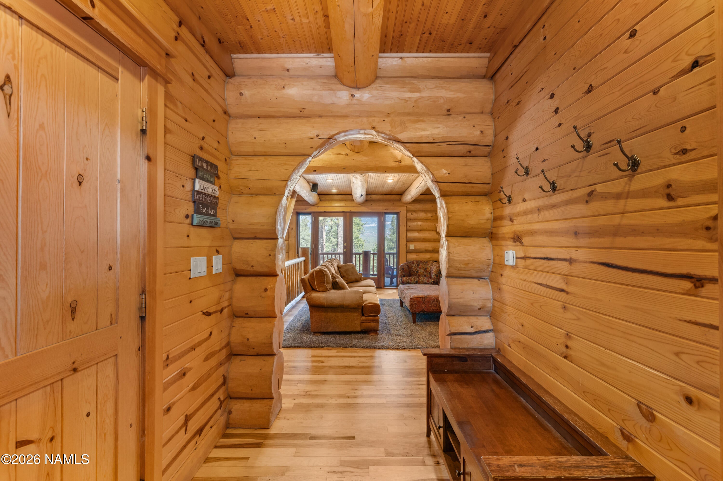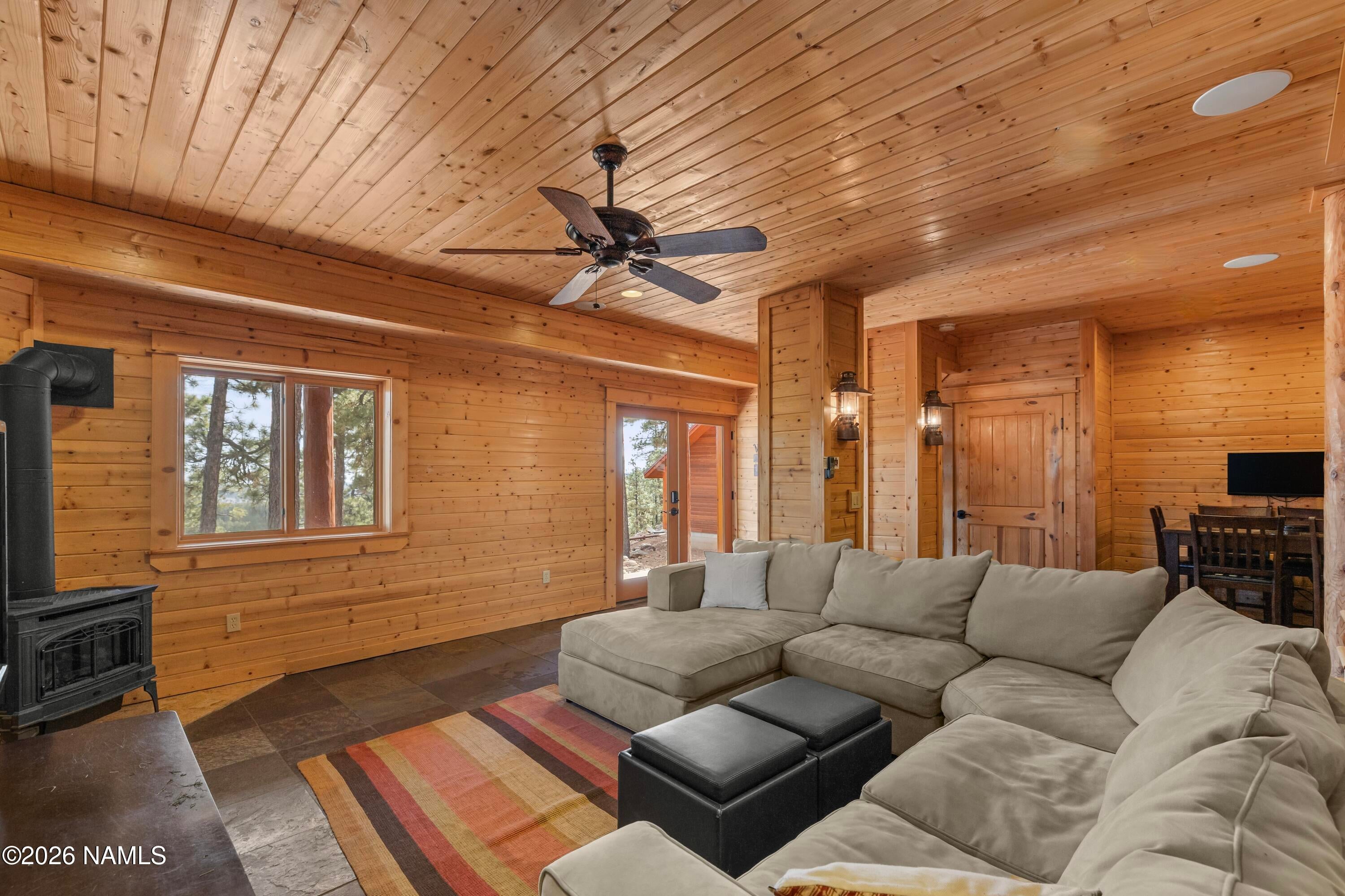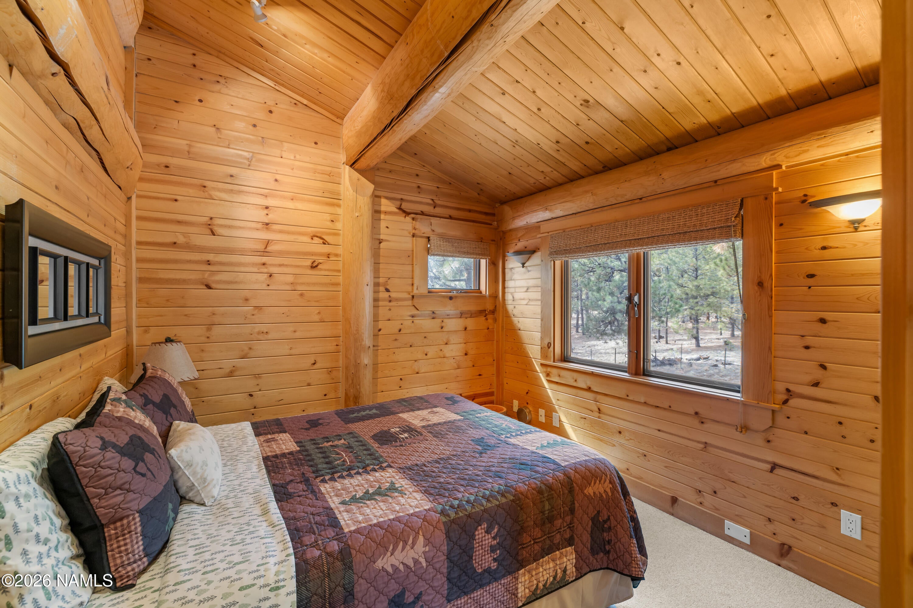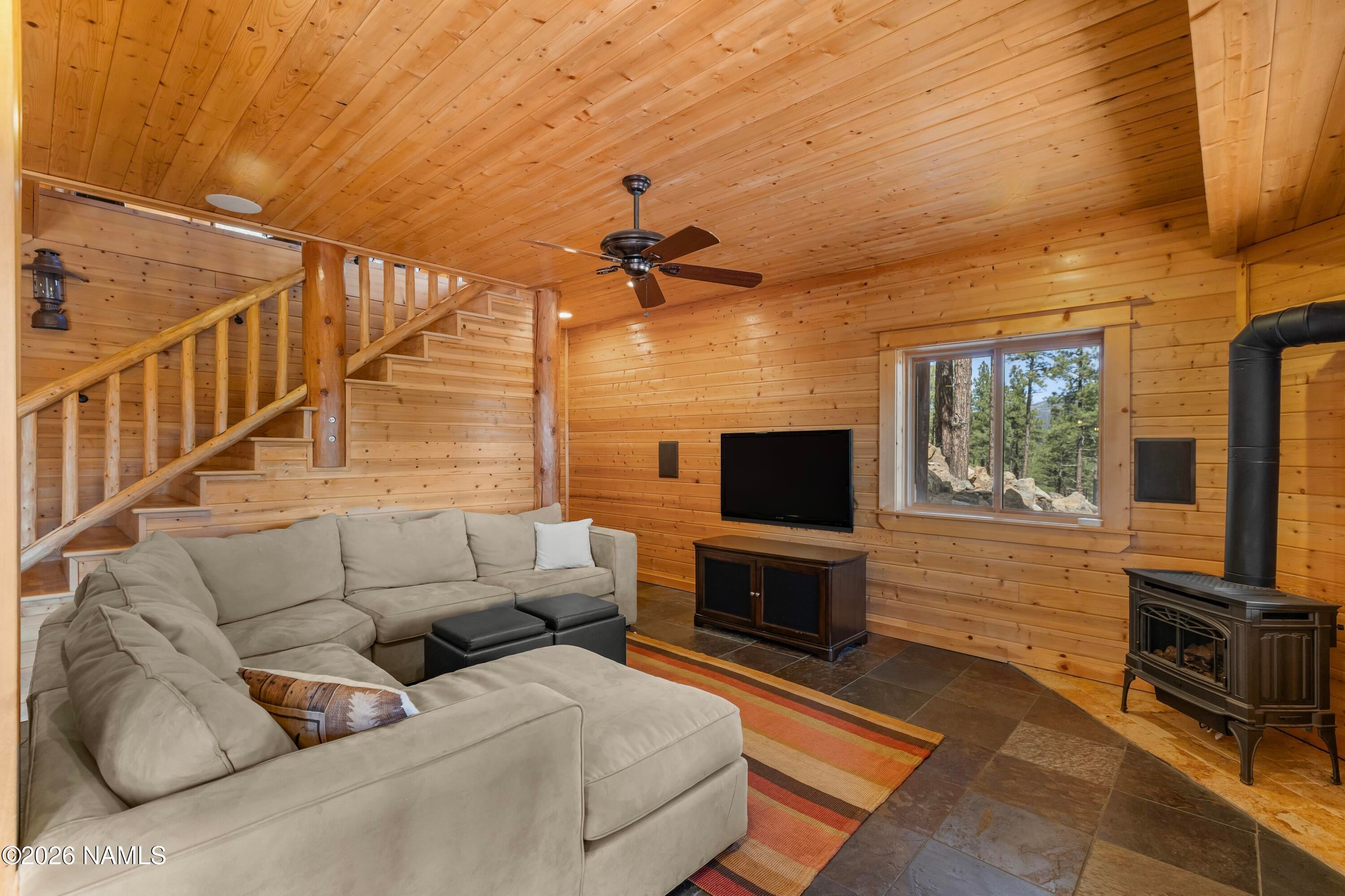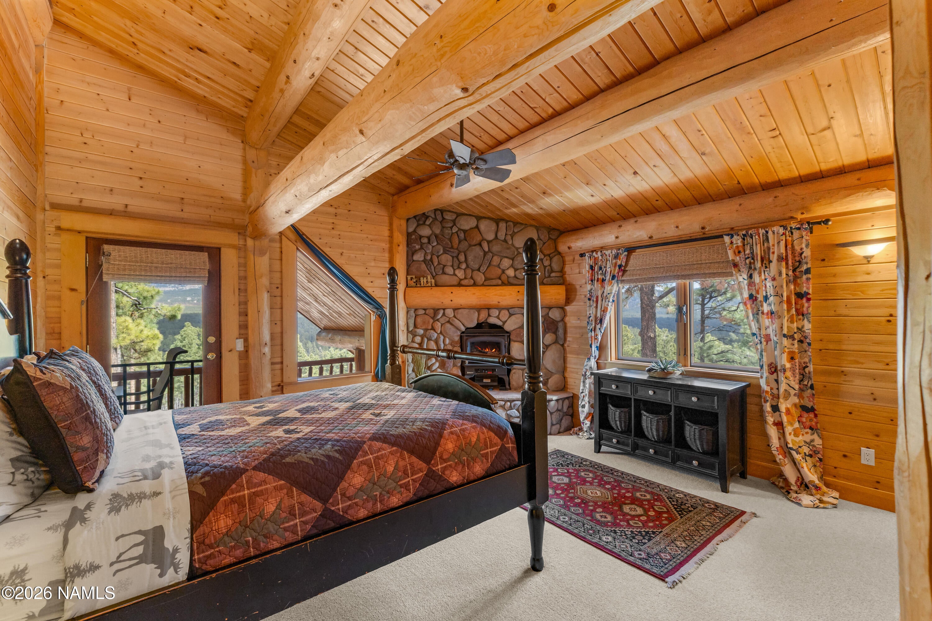 Looking for privacy, peace, and panoramic Peaks views--this is it! Tucked among pines on 2.3 private acres bordering Coconino National Forest, this beautifully maintained, authentic log cabin captures the essence of Flagstaff mountain living. Unobstructed San Francisco Peaks views take center stage, with two levels of decking designed to fully take them in. Wildlife moves freely through the property, and miles of trails begin just beyond your boundary. Inside, this artistically designed log home offers warm, comfortable living across three levels, each with its own propane fireplace, creating inviting spaces to relax year-round. Enjoy exceptional stargazing from the fire pit patio or near the treehouse, thanks to minimal light pollution and being set back from the main road. A detached oversized garage offers ample space for vehicles and gear. A rare combination of privacy, views, and direct forest access--this is Flagstaff living at 7,500 feet elevation!