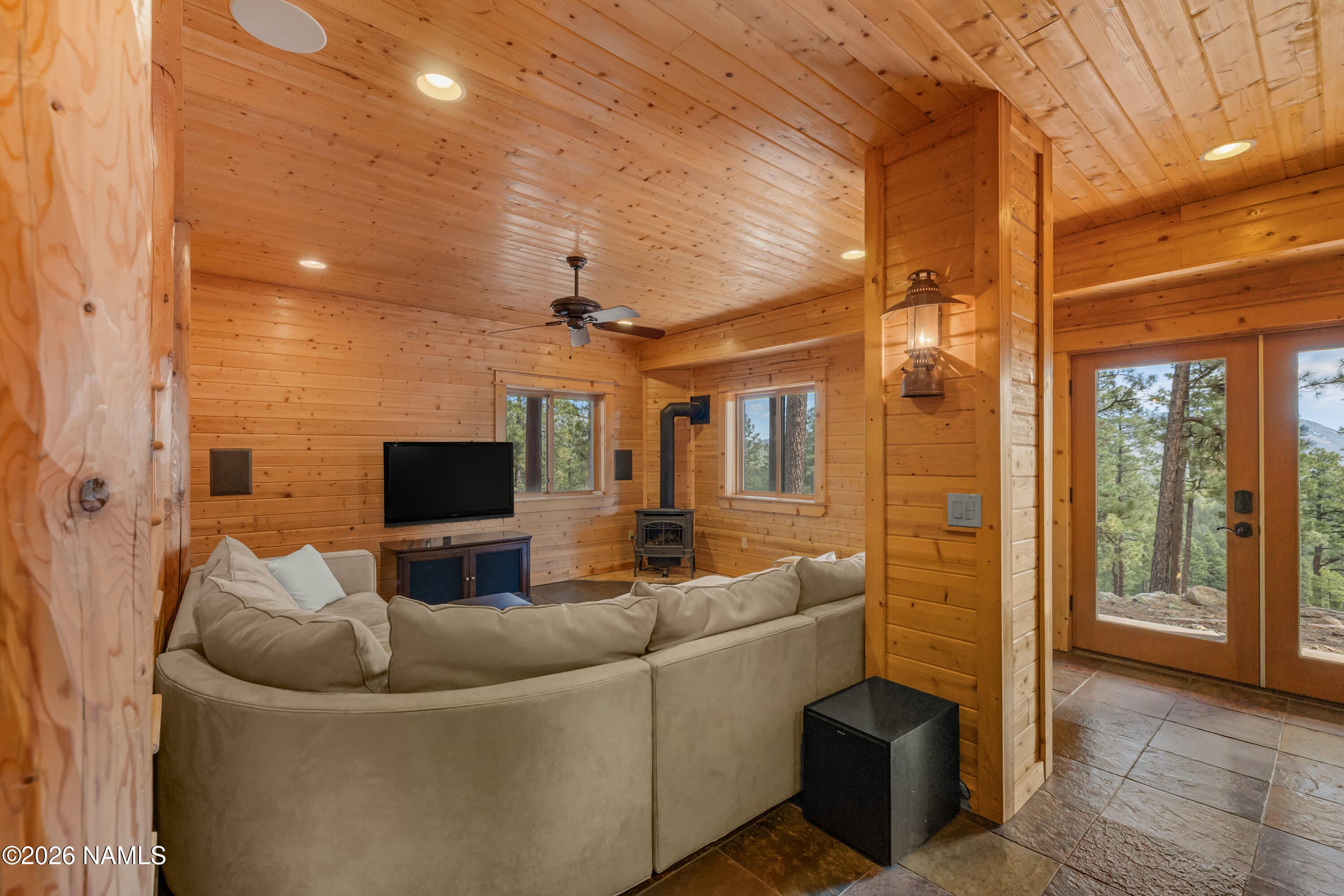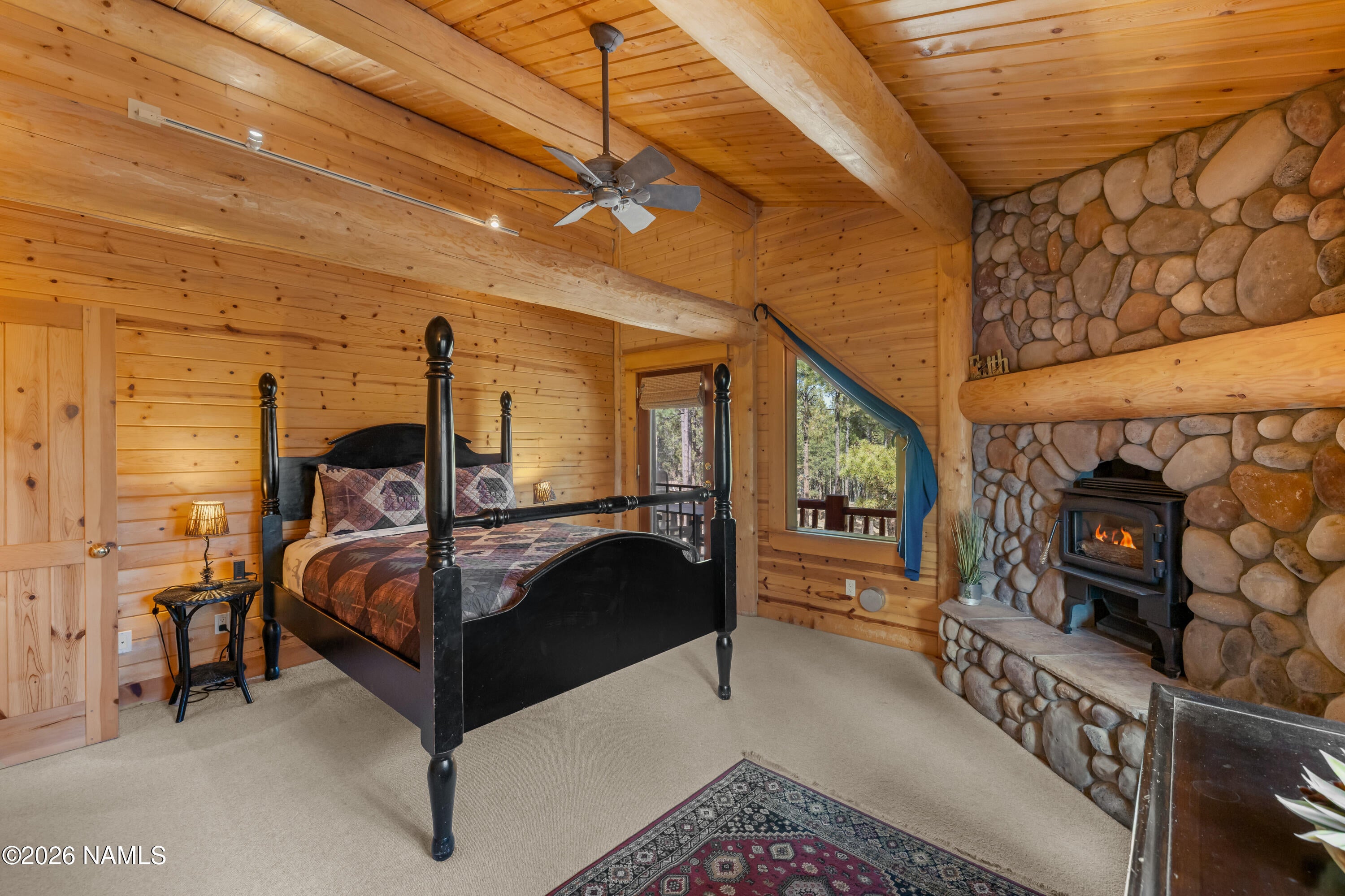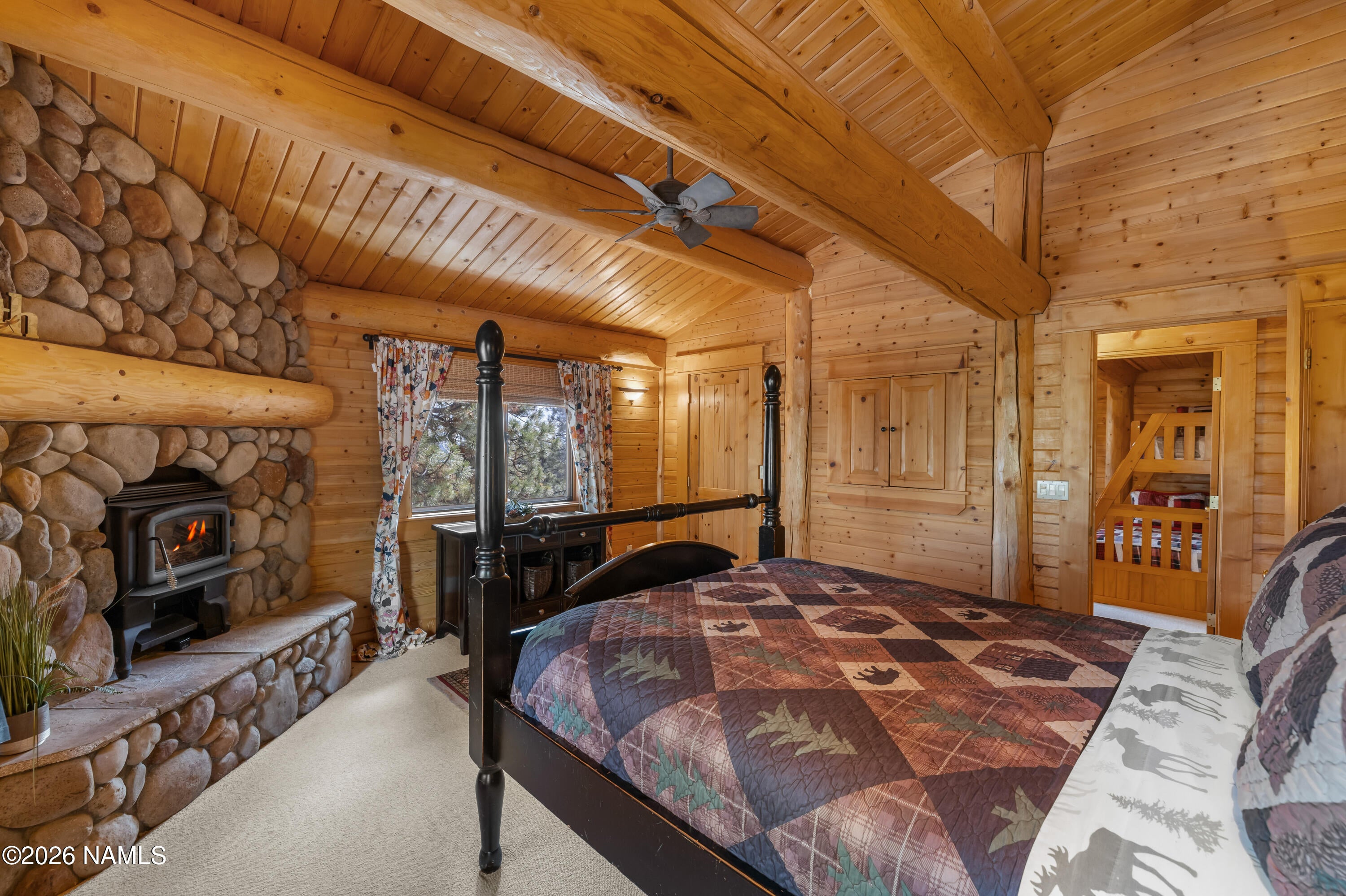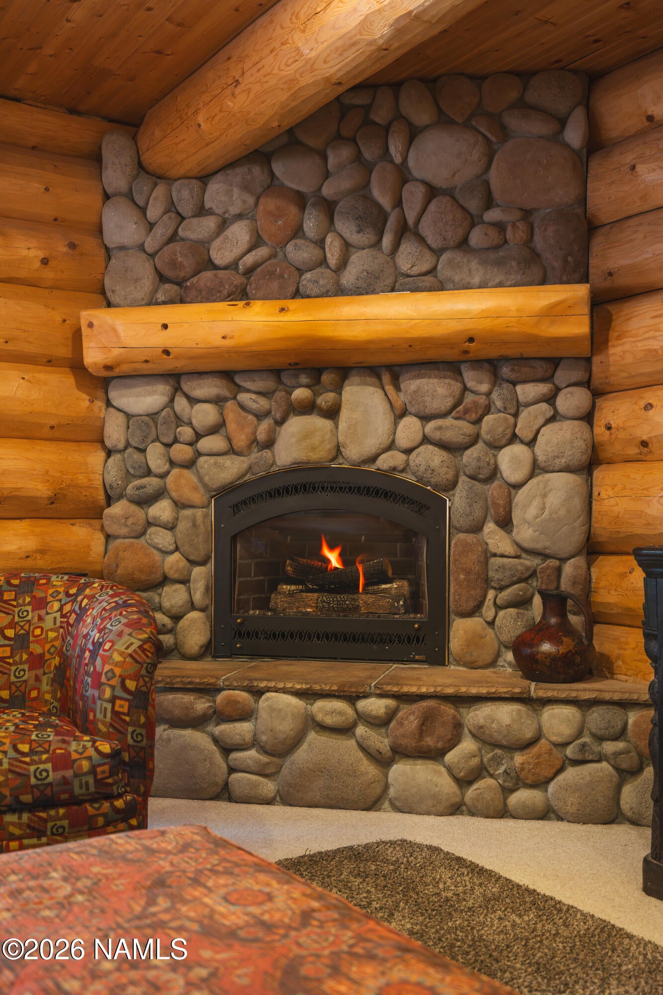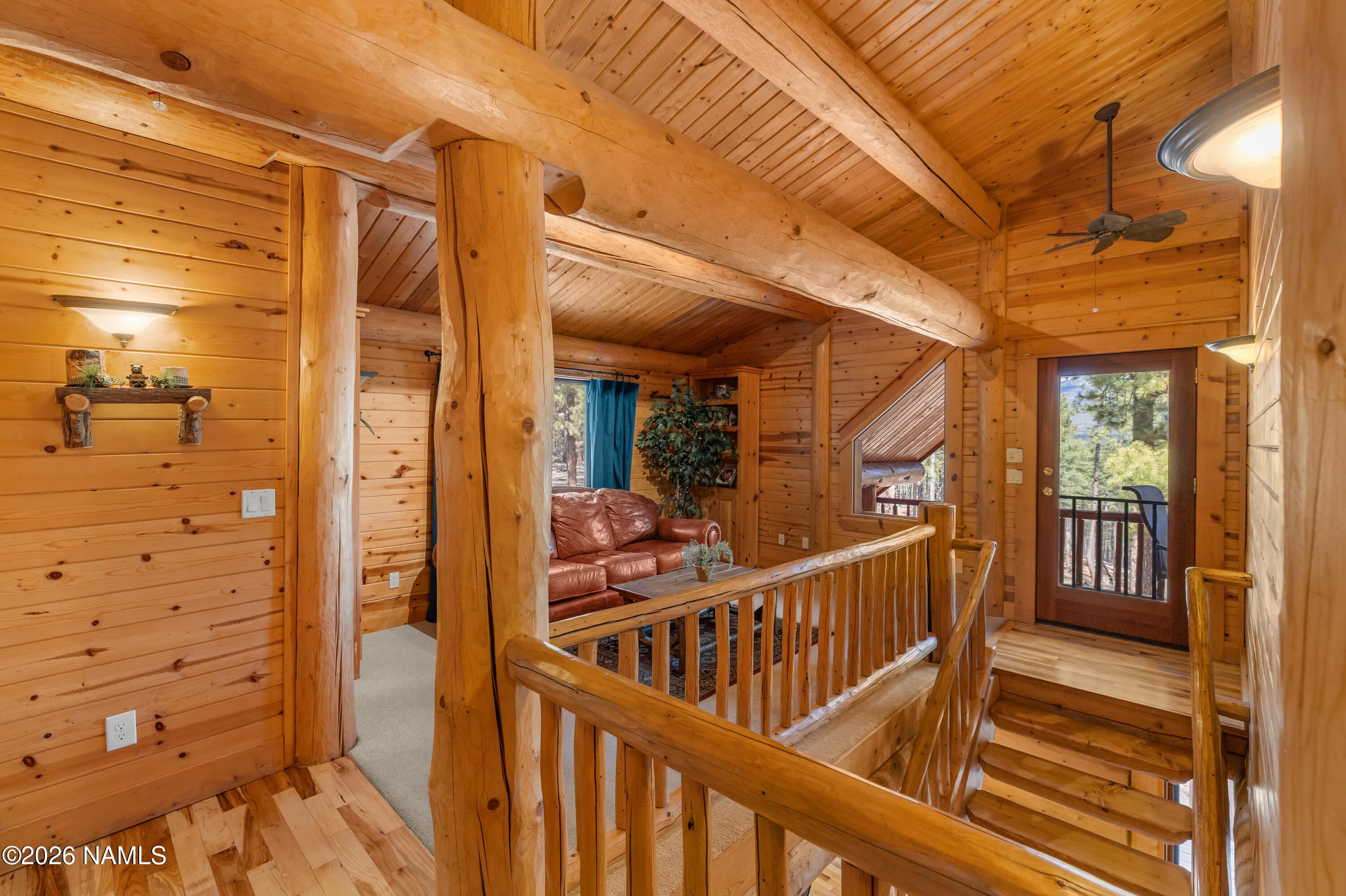 Looking for privacy, peace, and panoramic Peaks views--this is it! Tucked among pines on 2.3 private acres bordering Coconino National Forest, this beautifully maintained, authentic log cabin captures the essence of Flagstaff mountain living. Unobstructed San Francisco Peaks views take center stage, with two levels of decking designed to fully take them in. Wildlife moves freely through the property, and miles of trails begin just beyond your boundary. Inside, this artistically designed log home offers warm, comfortable living across three levels, each with its own propane fireplace, creating inviting spaces to relax year-round. Enjoy exceptional stargazing from the fire pit patio or near the treehouse, thanks to minimal light pollution and being set back from the main road. A detached oversized garage offers ample space for vehicles and gear. A rare combination of privacy, views, and direct forest access--this is Flagstaff living at 7,500 feet elevation!
