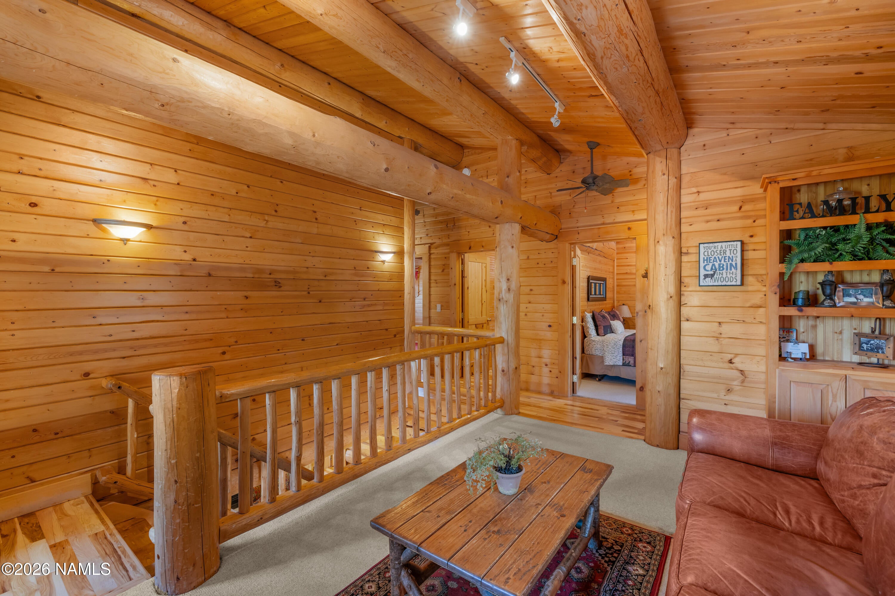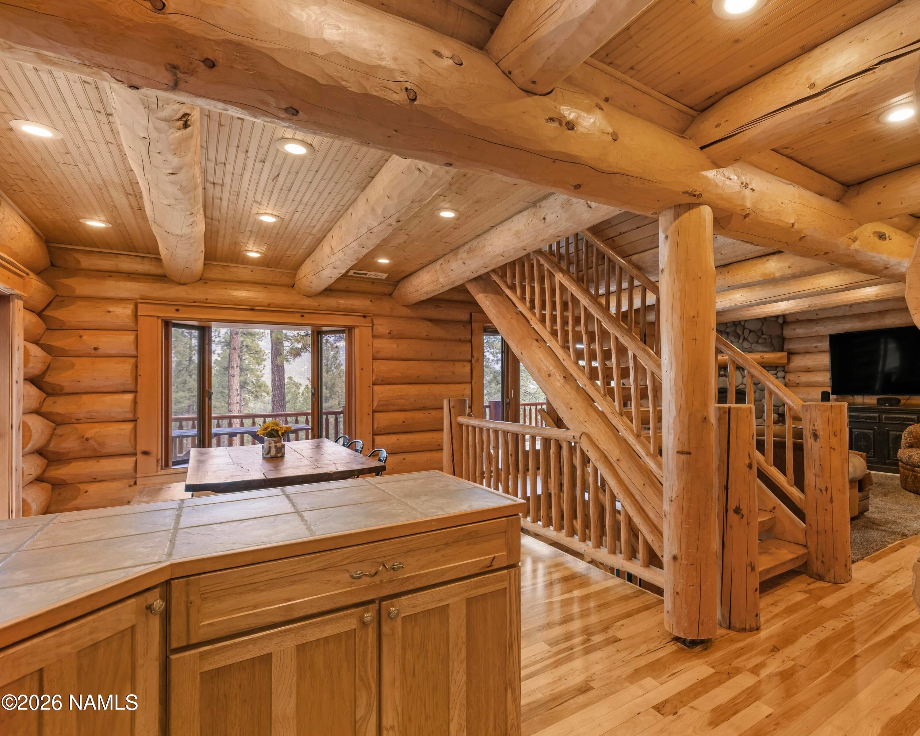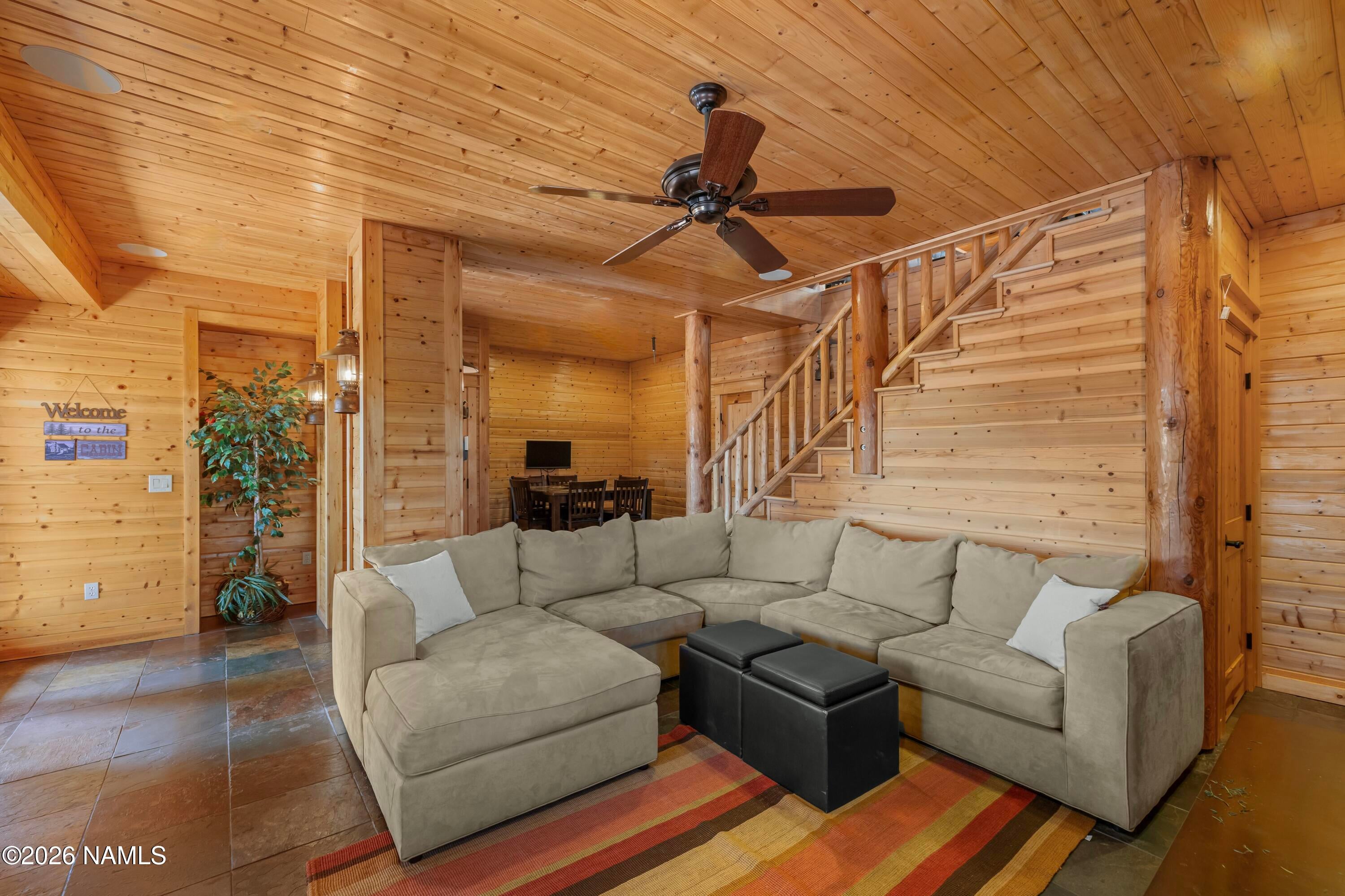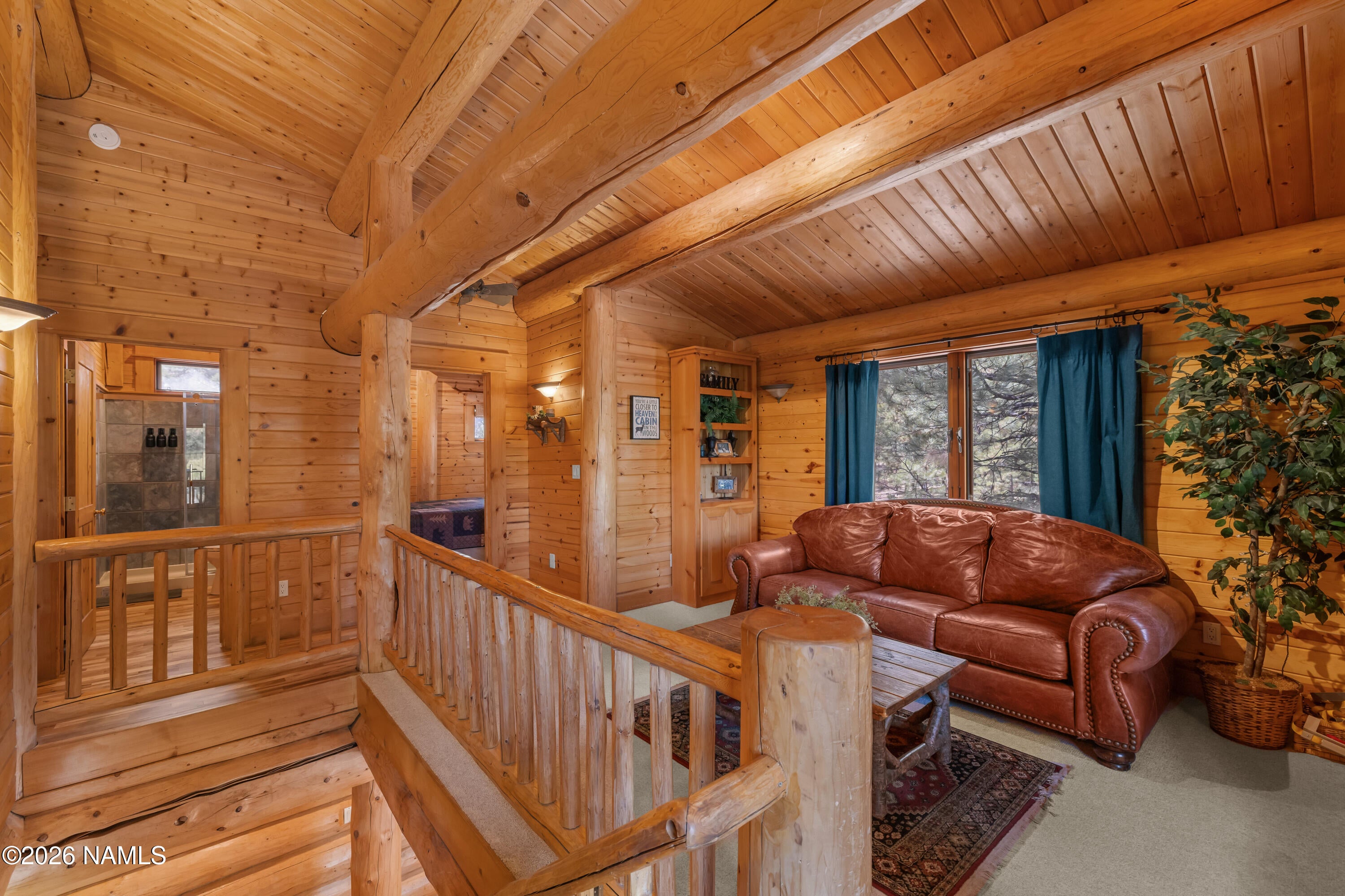 Looking for privacy, peace, and panoramic Peaks views--this is it! Tucked among pines on 2.3 private acres bordering Coconino National Forest, this beautifully maintained, authentic log cabin captures the essence of Flagstaff mountain living. Unobstructed San Francisco Peaks views take center stage, with two levels of decking designed to fully take them in. Wildlife moves freely through the property, and miles of trails begin just beyond your boundary. Inside, this artistically designed log home offers warm, comfortable living across three levels, each with its own propane fireplace, creating inviting spaces to relax year-round. Enjoy exceptional stargazing from the fire pit patio or near the treehouse, thanks to minimal light pollution and being set back from the main road. A detached oversized garage offers ample space for vehicles and gear. A rare combination of privacy, views, and direct forest access--this is Flagstaff living at 7,500 feet elevation!
