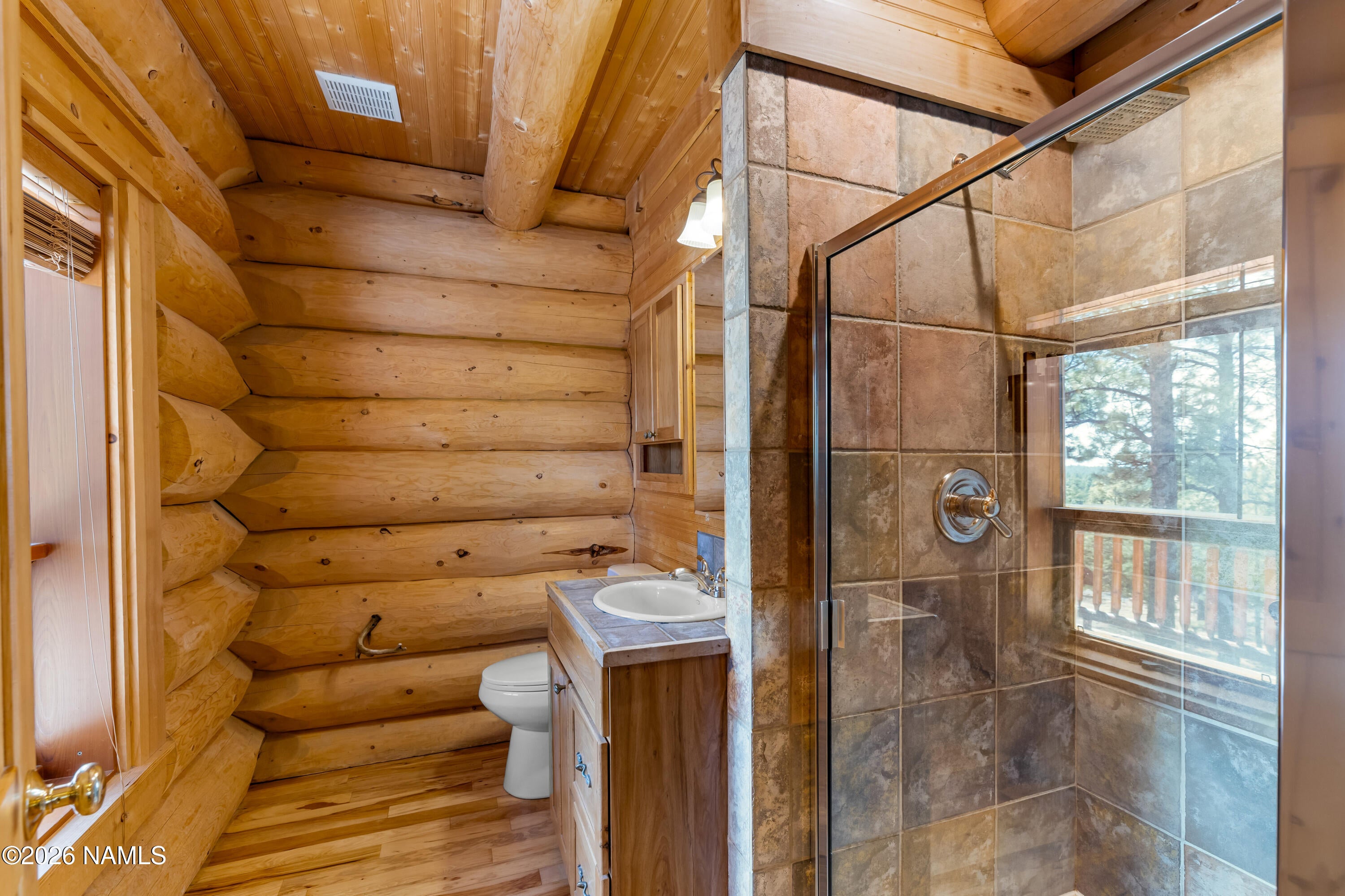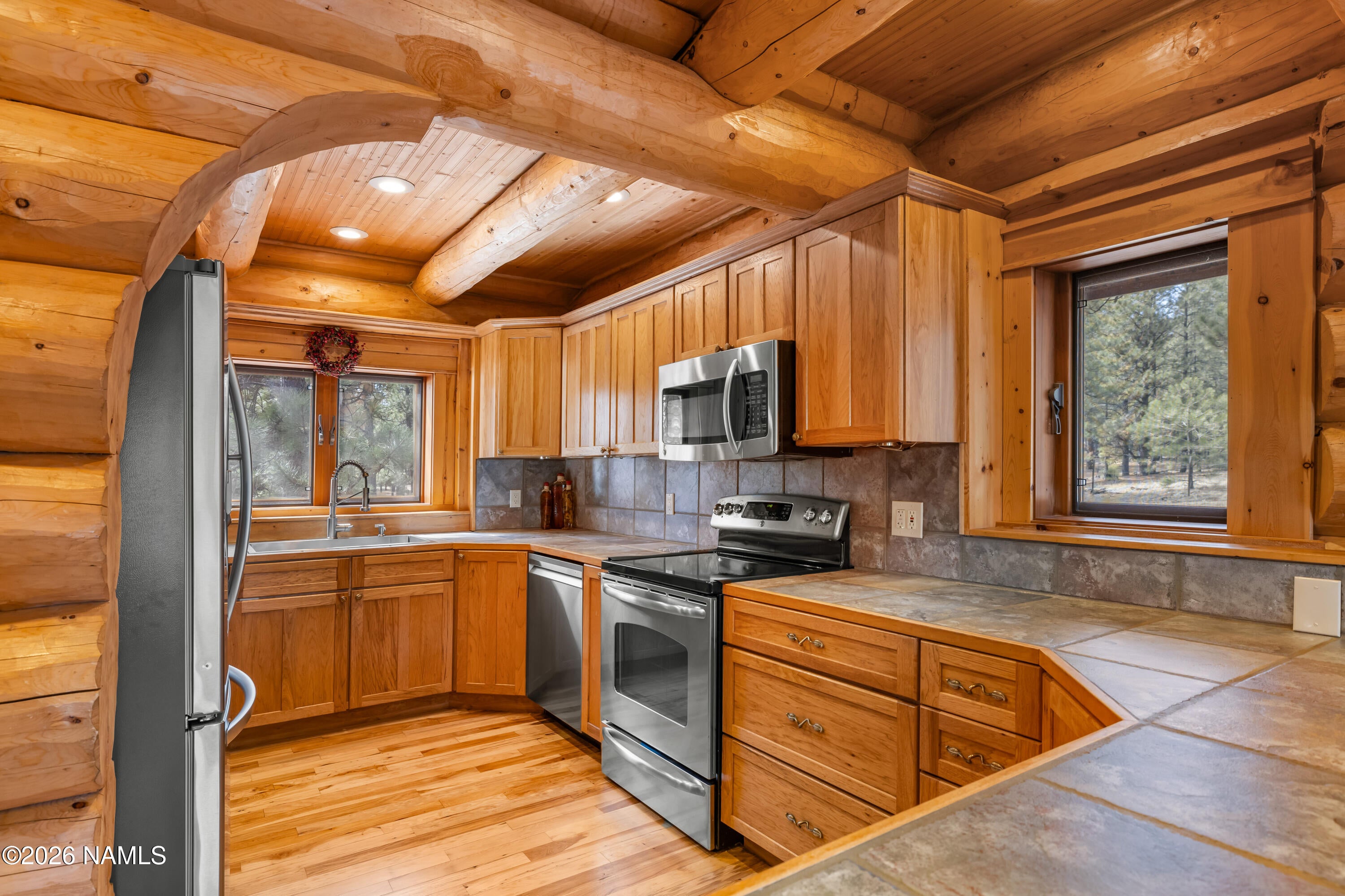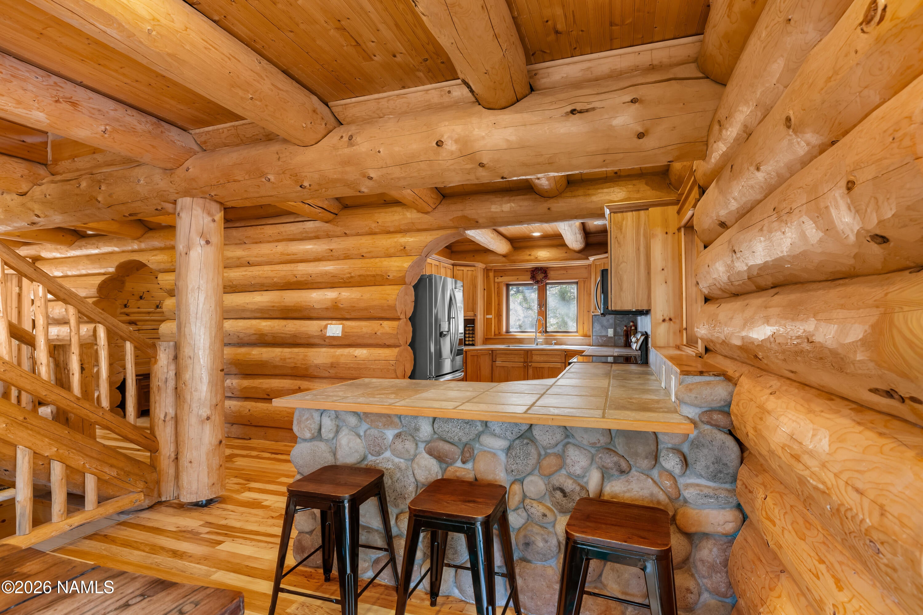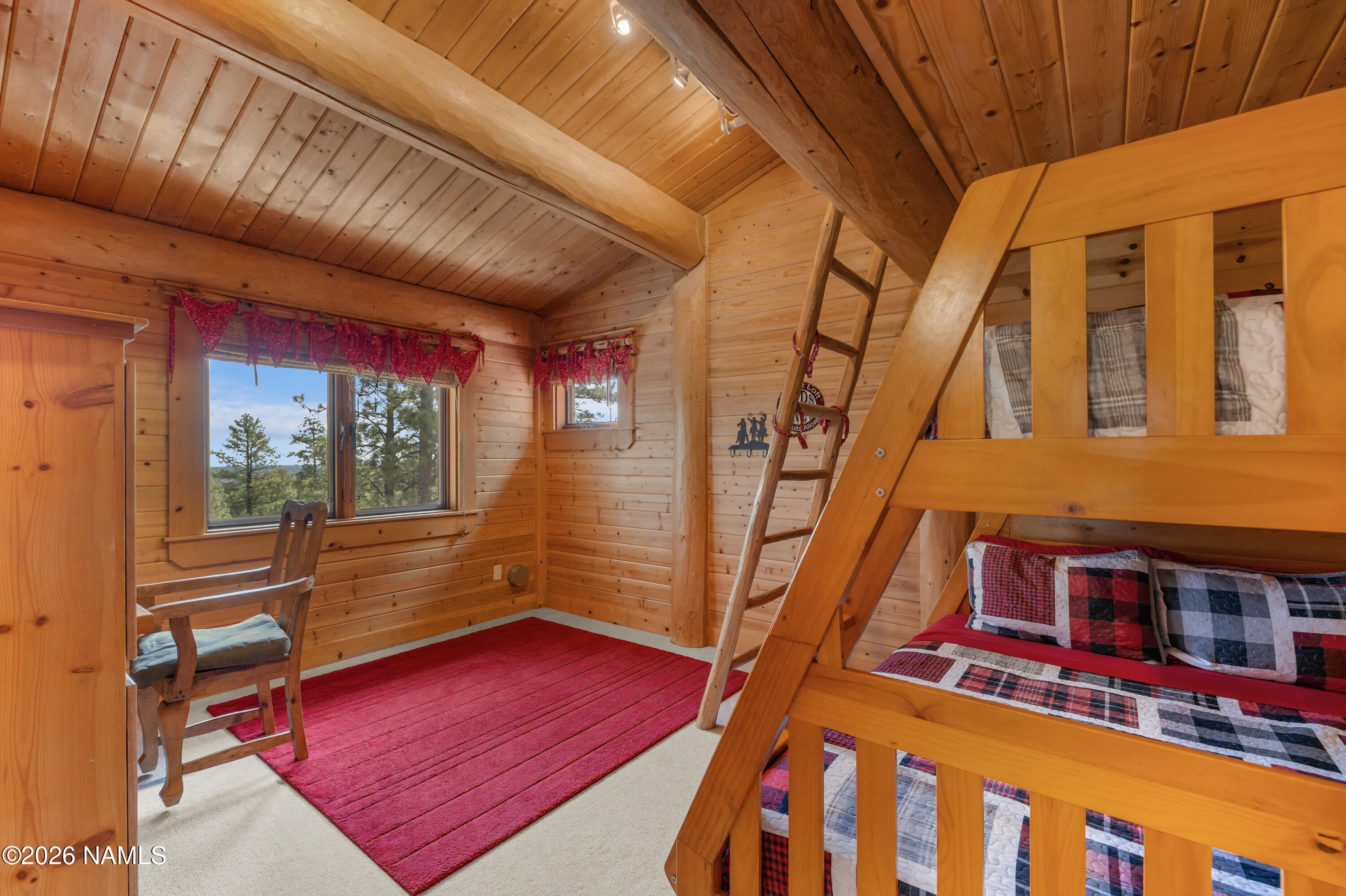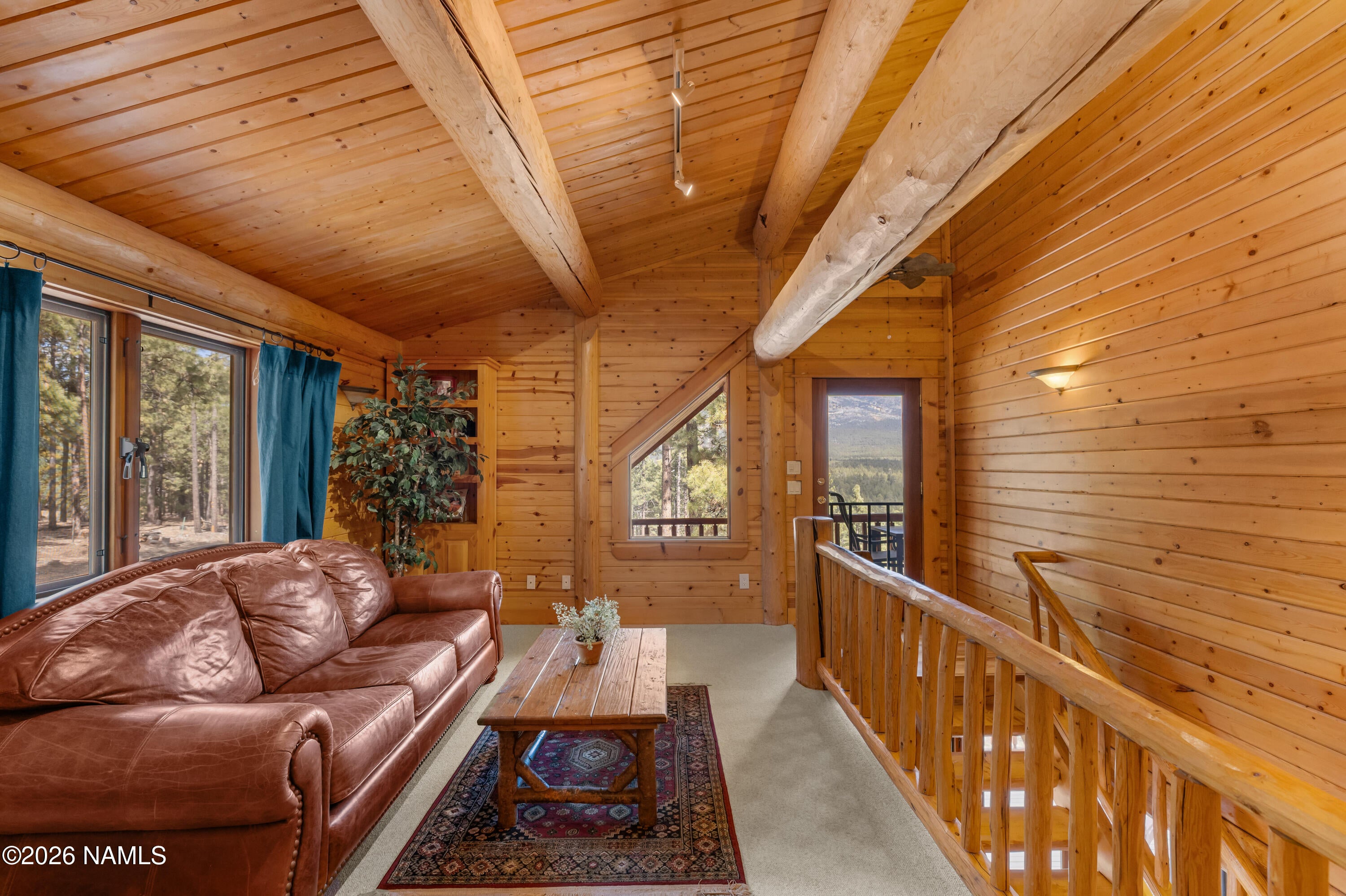 Looking for privacy, peace, and panoramic Peaks views--this is it! Tucked among pines on 2.3 private acres bordering Coconino National Forest, this beautifully maintained, authentic log cabin captures the essence of Flagstaff mountain living. Unobstructed San Francisco Peaks views take center stage, with two levels of decking designed to fully take them in. Wildlife moves freely through the property, and miles of trails begin just beyond your boundary. Inside, this artistically designed log home offers warm, comfortable living across three levels, each with its own propane fireplace, creating inviting spaces to relax year-round. Enjoy exceptional stargazing from the fire pit patio or near the treehouse, thanks to minimal light pollution and being set back from the main road. A detached oversized garage offers ample space for vehicles and gear. A rare combination of privacy, views, and direct forest access--this is Flagstaff living at 7,500 feet elevation!
