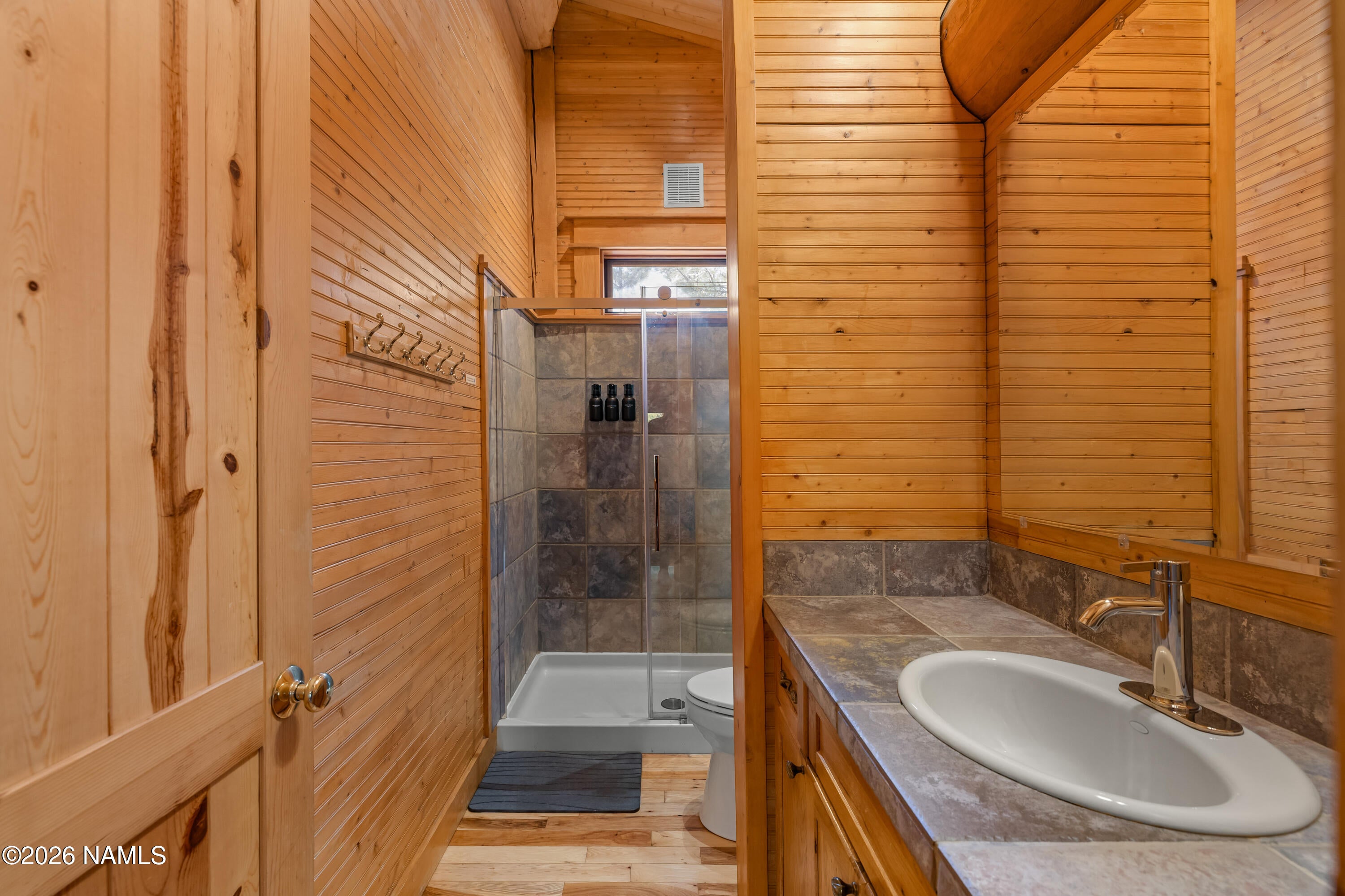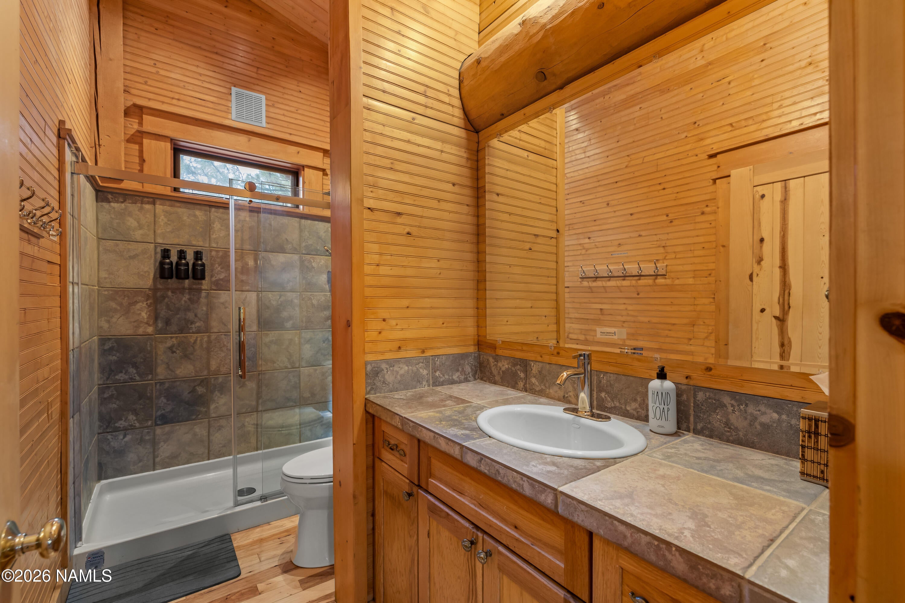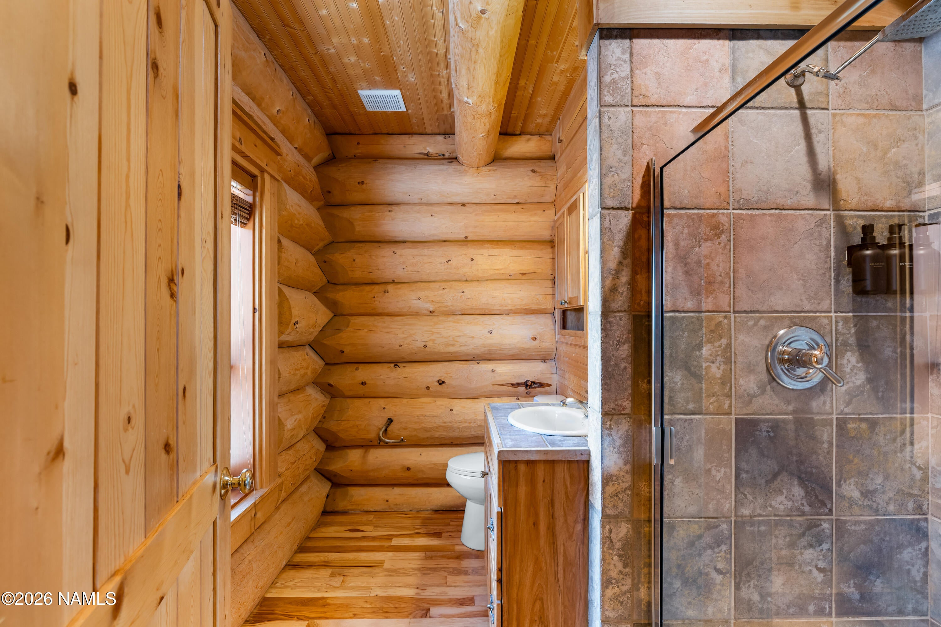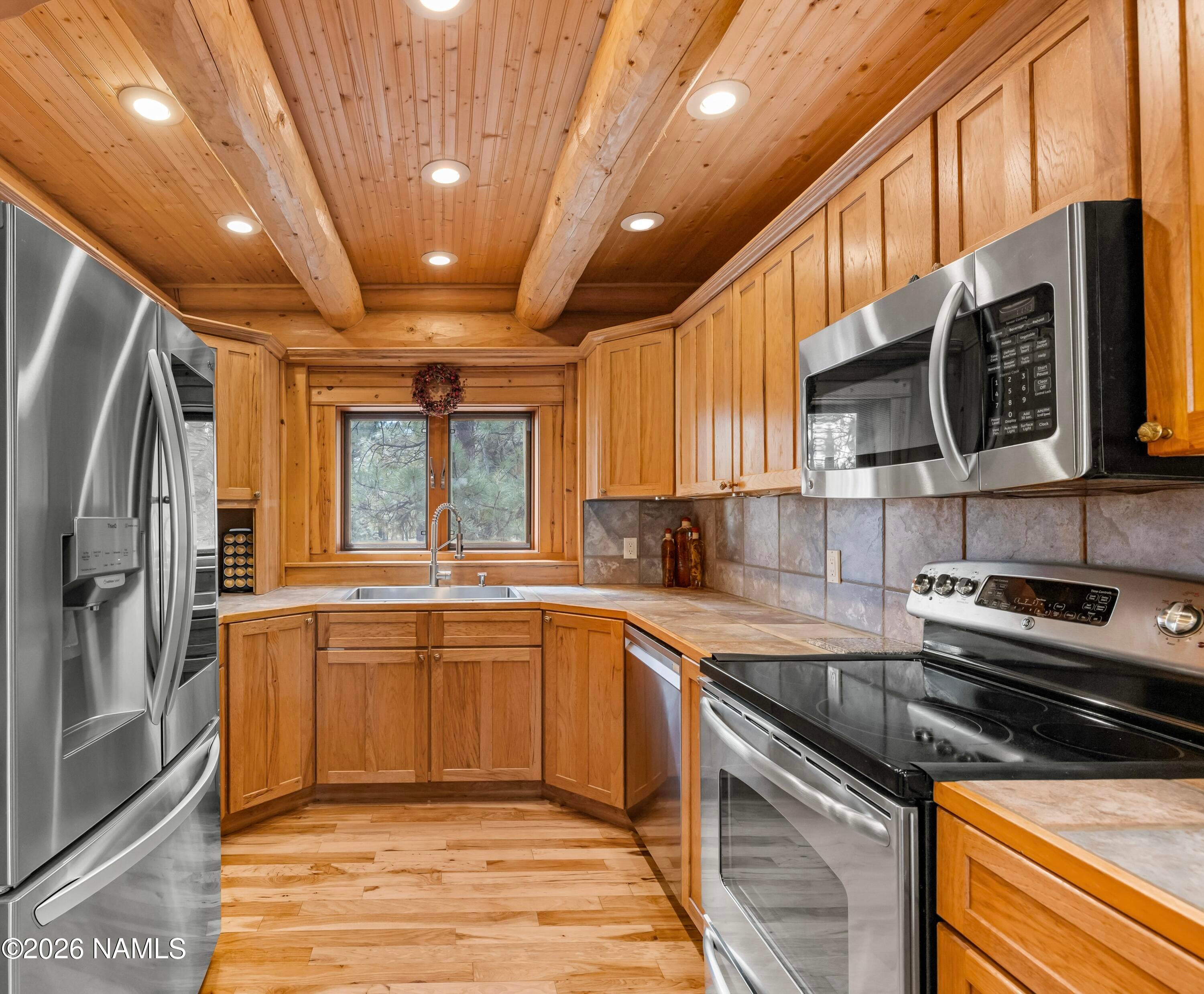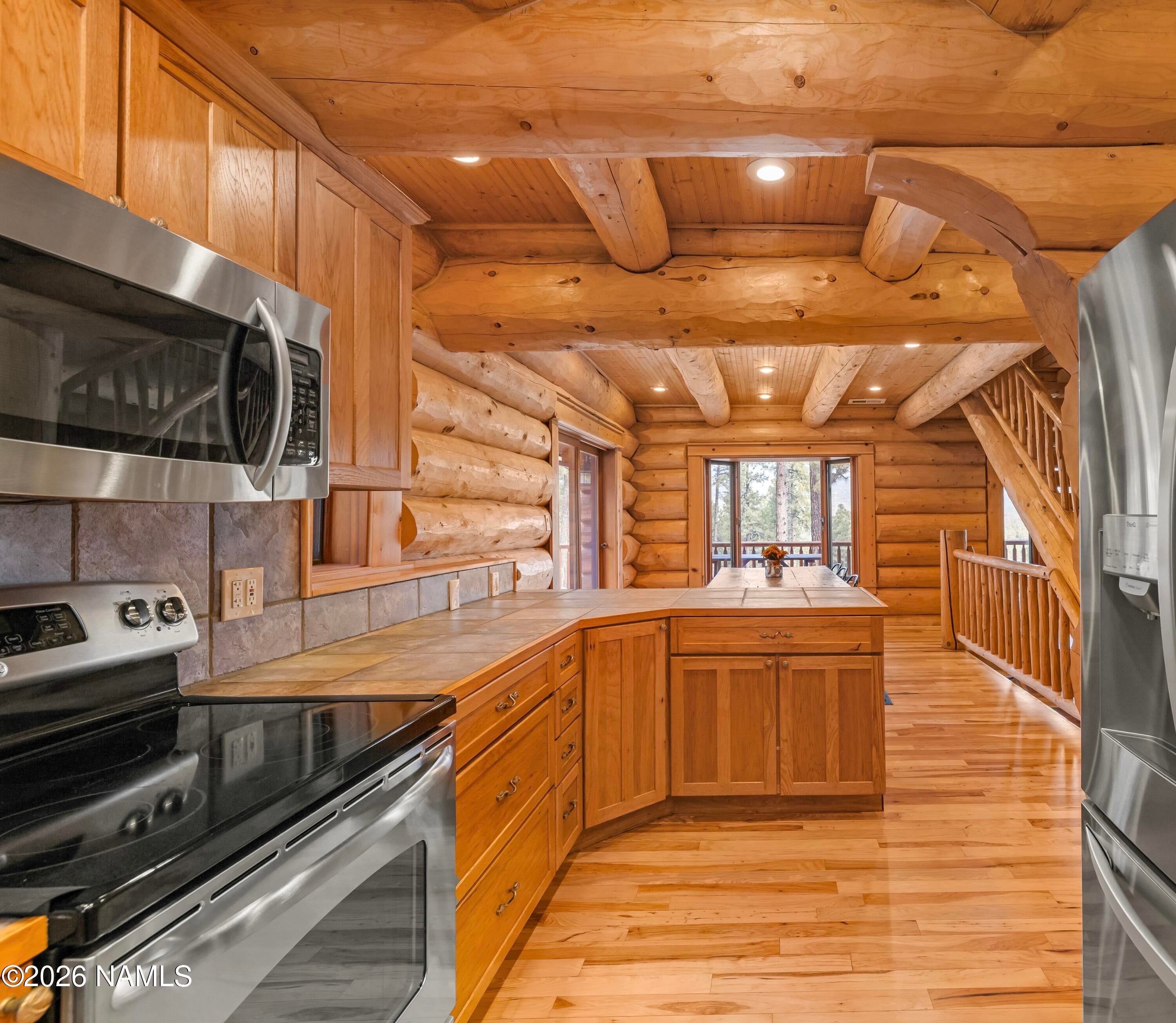 Looking for privacy, peace, and panoramic Peaks views--this is it! Tucked among pines on 2.3 private acres bordering Coconino National Forest, this beautifully maintained, authentic log cabin captures the essence of Flagstaff mountain living. Unobstructed San Francisco Peaks views take center stage, with two levels of decking designed to fully take them in. Wildlife moves freely through the property, and miles of trails begin just beyond your boundary. Inside, this artistically designed log home offers warm, comfortable living across three levels, each with its own propane fireplace, creating inviting spaces to relax year-round. Enjoy exceptional stargazing from the fire pit patio or near the treehouse, thanks to minimal light pollution and being set back from the main road. A detached oversized garage offers ample space for vehicles and gear. A rare combination of privacy, views, and direct forest access--this is Flagstaff living at 7,500 feet elevation!