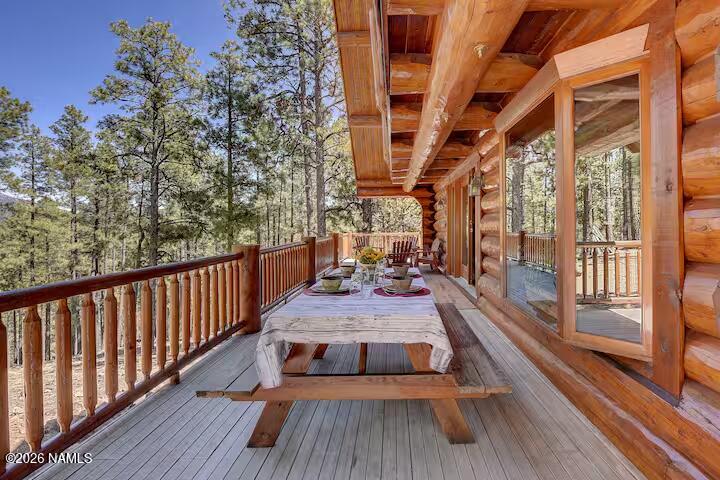 Looking for privacy, peace, and panoramic Peaks views--this is it! Tucked among pines on 2.3 private acres bordering Coconino National Forest, this beautifully maintained, authentic log cabin captures the essence of Flagstaff mountain living. Unobstructed San Francisco Peaks views take center stage, with two levels of decking designed to fully take them in.