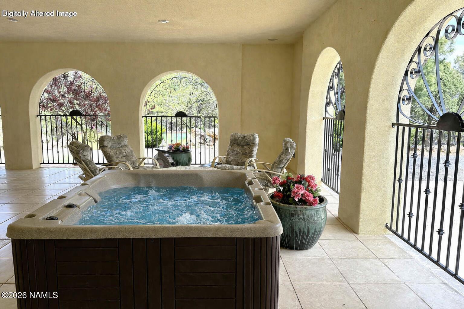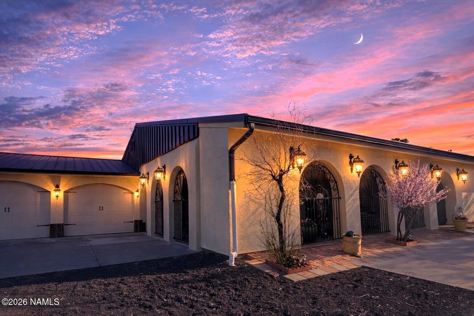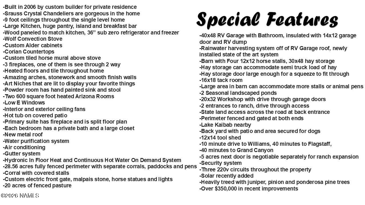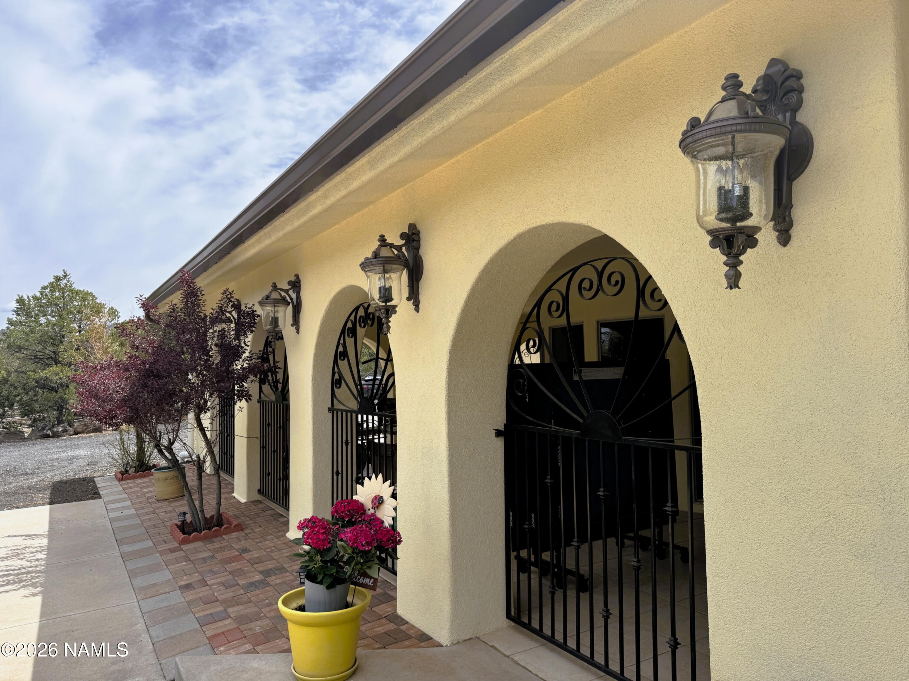 Whispering Winds Ranch in beautiful Williams AZ, located at 9665 Stagecoach Dr, is tucked in the wooded hills in a private gated community. 28.5 acres fenced with separate arenas/pens. The entrance is amazing with malpais stone, electronic gate and beautiful horse statues. The stylish home is a 4,526 square foot single level Spanish Colonial built in 2006 with heated floors, a/c, three suites with their own private baths, split floor plan, formal living room, family room and Arizona Rooms. 3 fireplaces, chandeliers, smooth textured walls, 9 foot ceilings throughout and a custom front door imported from Italy! 4 outbuildings including RV garage, workshop, barn and stalls. Fits 12 cars total garage space. Property has natural ponds and rooftop collection. New metal roof, solar. Call today!