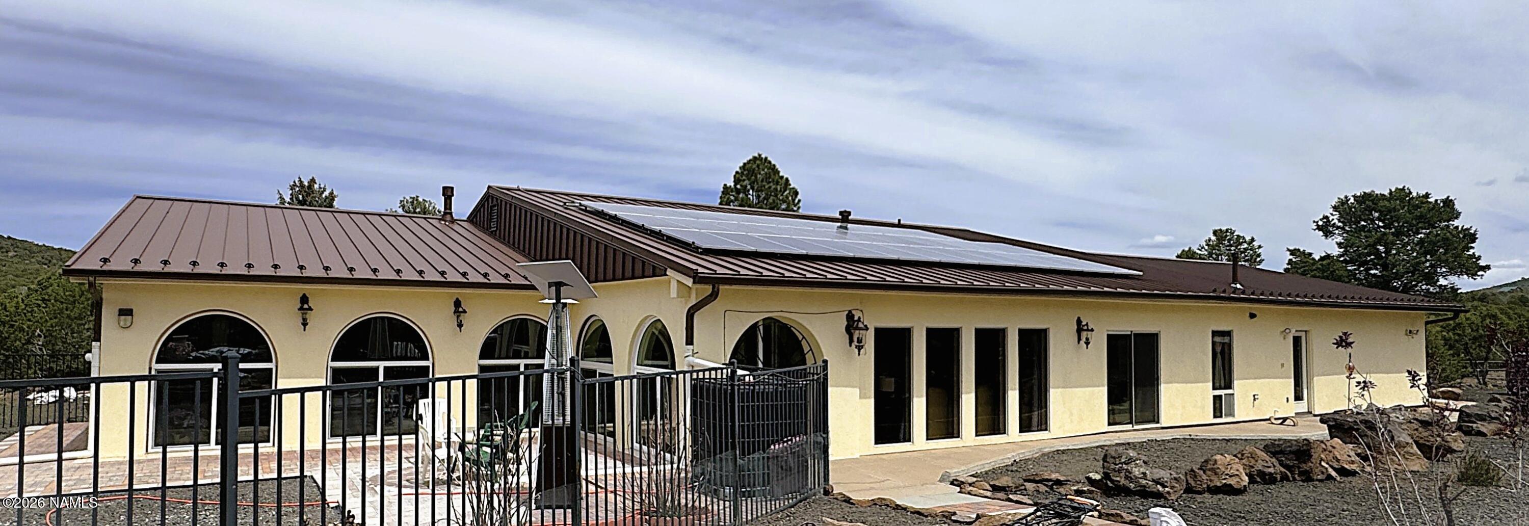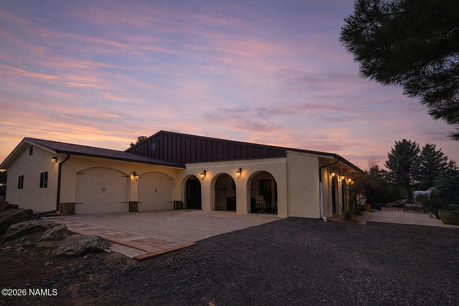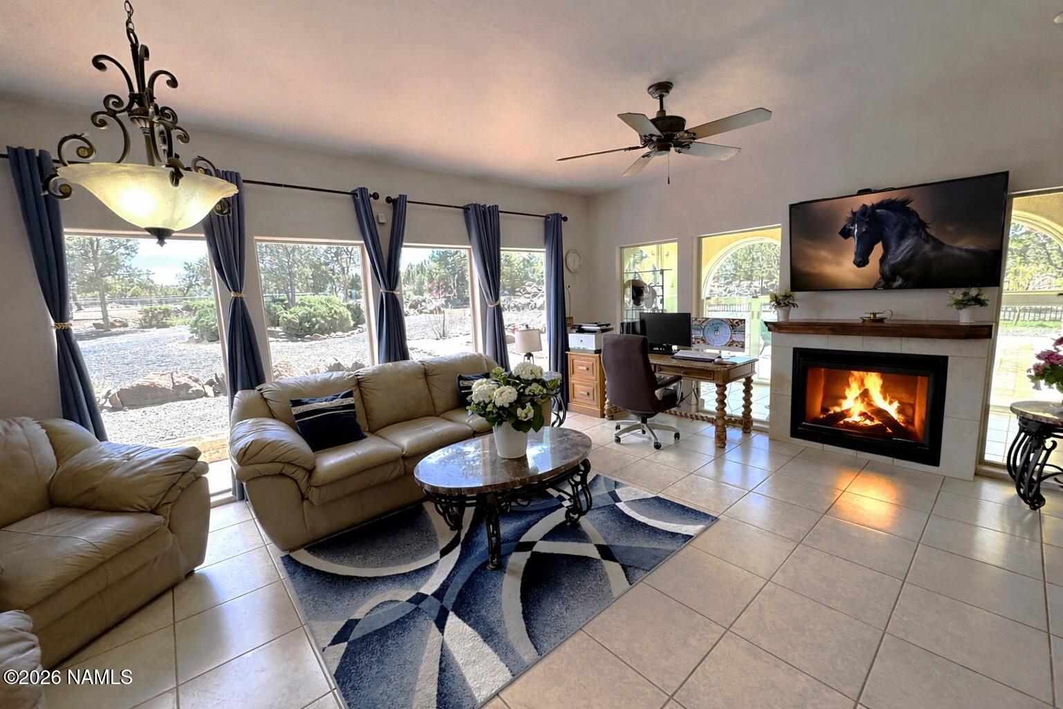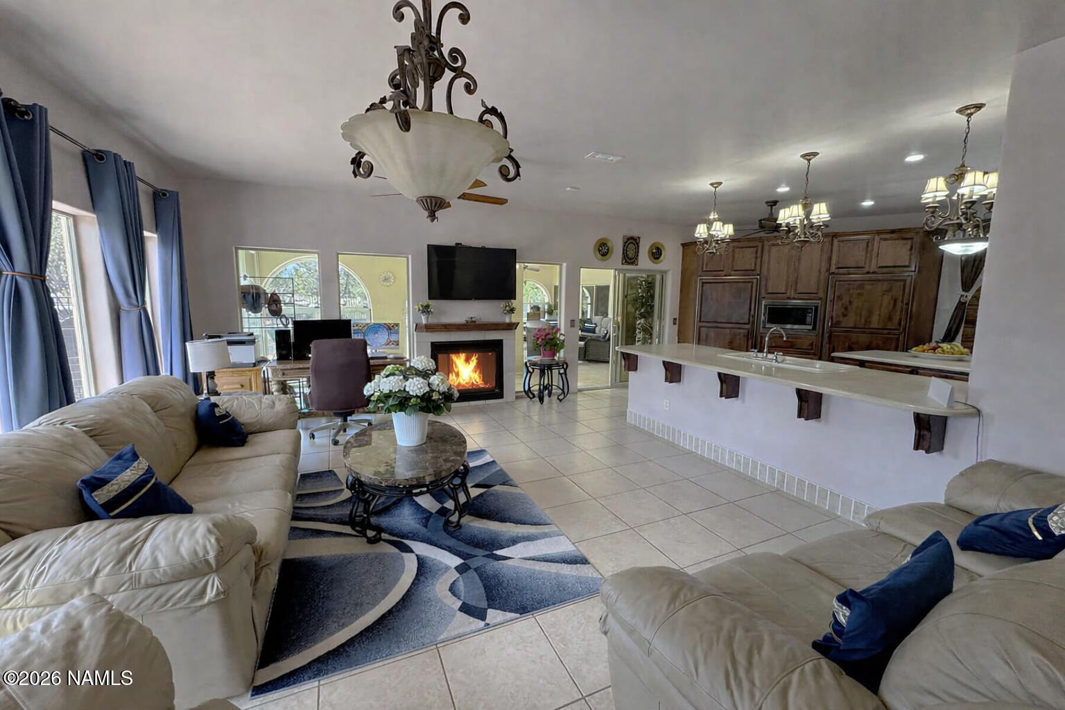 Whispering Winds Ranch in beautiful Williams AZ, located at 9665 Stagecoach Dr, is tucked in the wooded hills in a private gated community. 28.5 acres fenced with separate arenas/pens. The entrance is amazing with malpais stone, electronic gate and beautiful horse statues. The stylish home is a 4,526 square foot single level Spanish Colonial built in 2006 with heated floors, a/c, three suites with their own private baths, split floor plan, formal living room, family room and Arizona Rooms. 3 fireplaces, chandeliers, smooth textured walls, 9 foot ceilings throughout and a custom front door imported from Italy! 4 outbuildings including RV garage, workshop, barn and stalls. Fits 12 cars total garage space. Property has natural ponds and rooftop collection. New metal roof, solar. Call today!