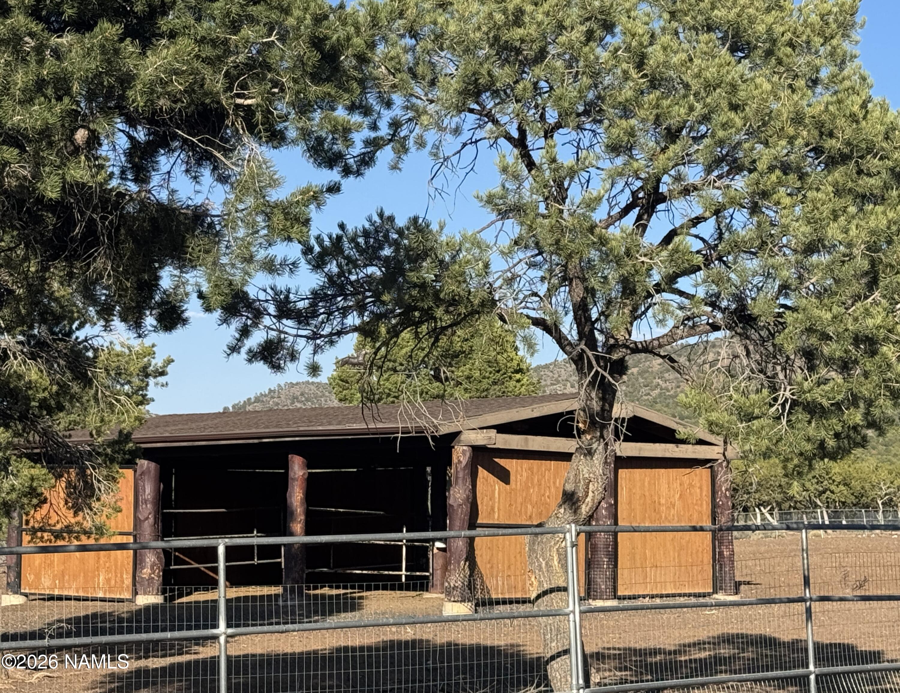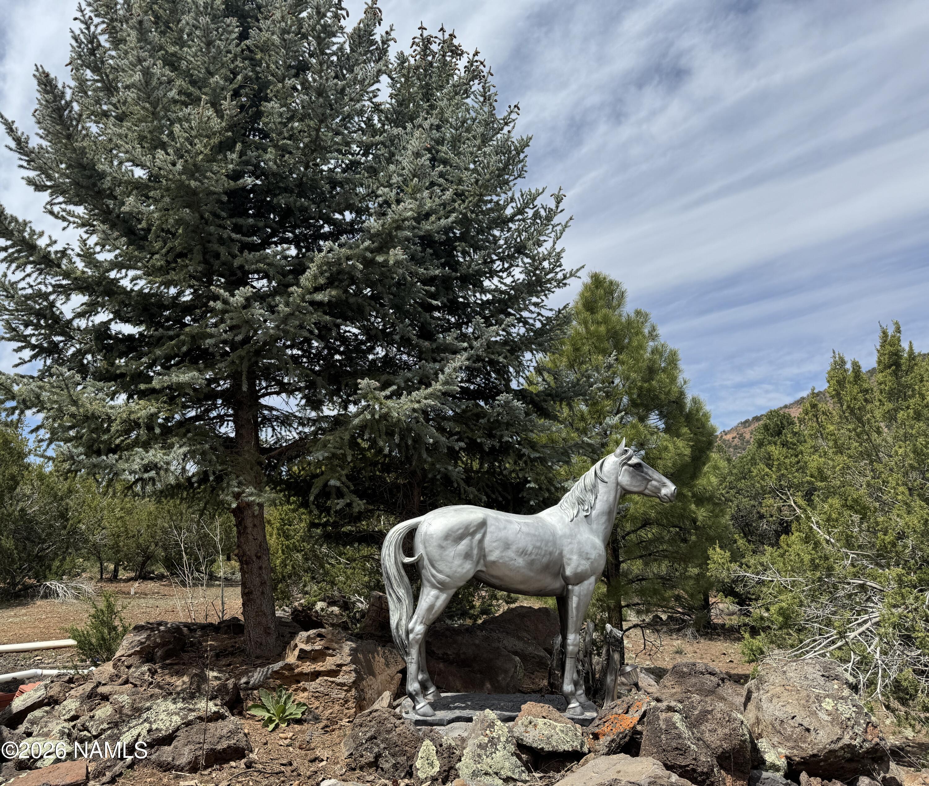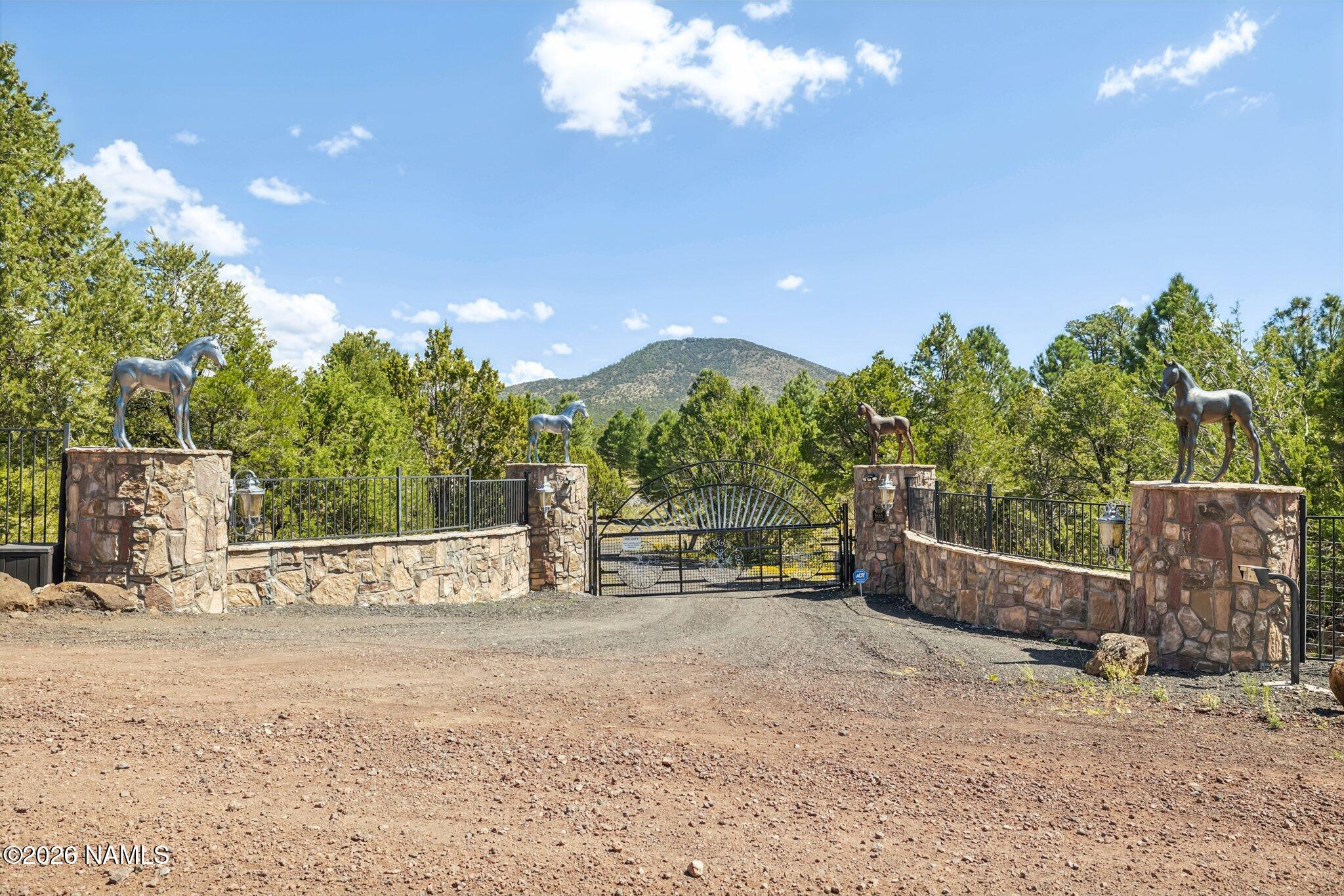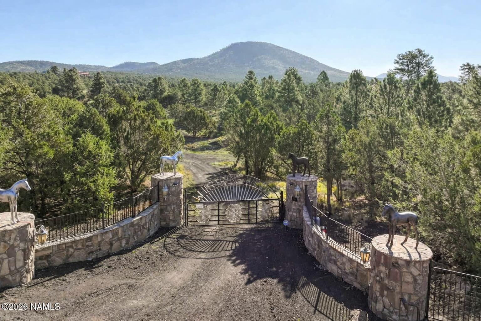 Whispering Winds Ranch in beautiful Williams AZ, located at 9665 Stagecoach Dr, is tucked in the wooded hills in a private gated community. 28.5 acres fenced with separate arenas/pens. The entrance is amazing with malpais stone, electronic gate and beautiful horse statues.
