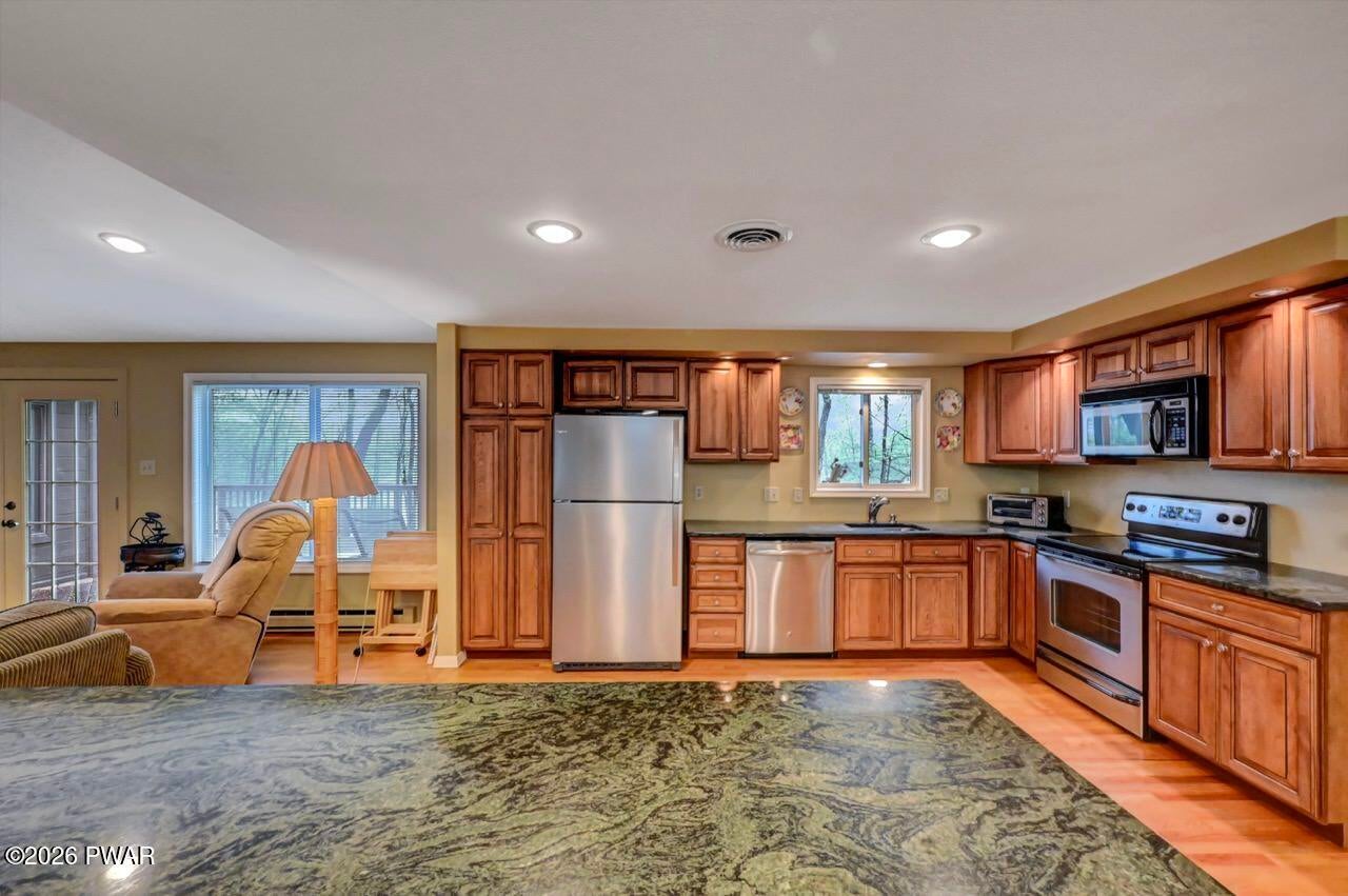 At the heart of this home is a kitchen loaded with great features, from classic shaker cabinets and sleek stone countertops to a stylish backsplash that ties it all together. A roomy kitchen island and a handy peninsula offer plenty of space for cooking and casual meals, while top-of-the-line appliances like a high-end fridge and range oven make every meal a breeze.
