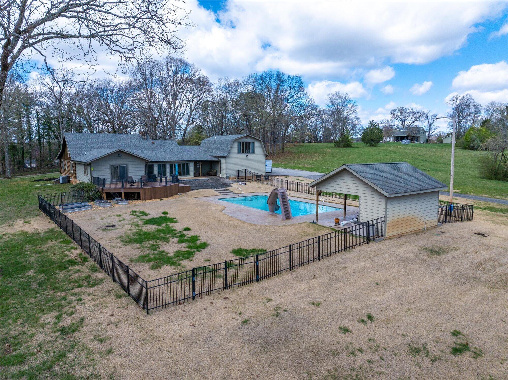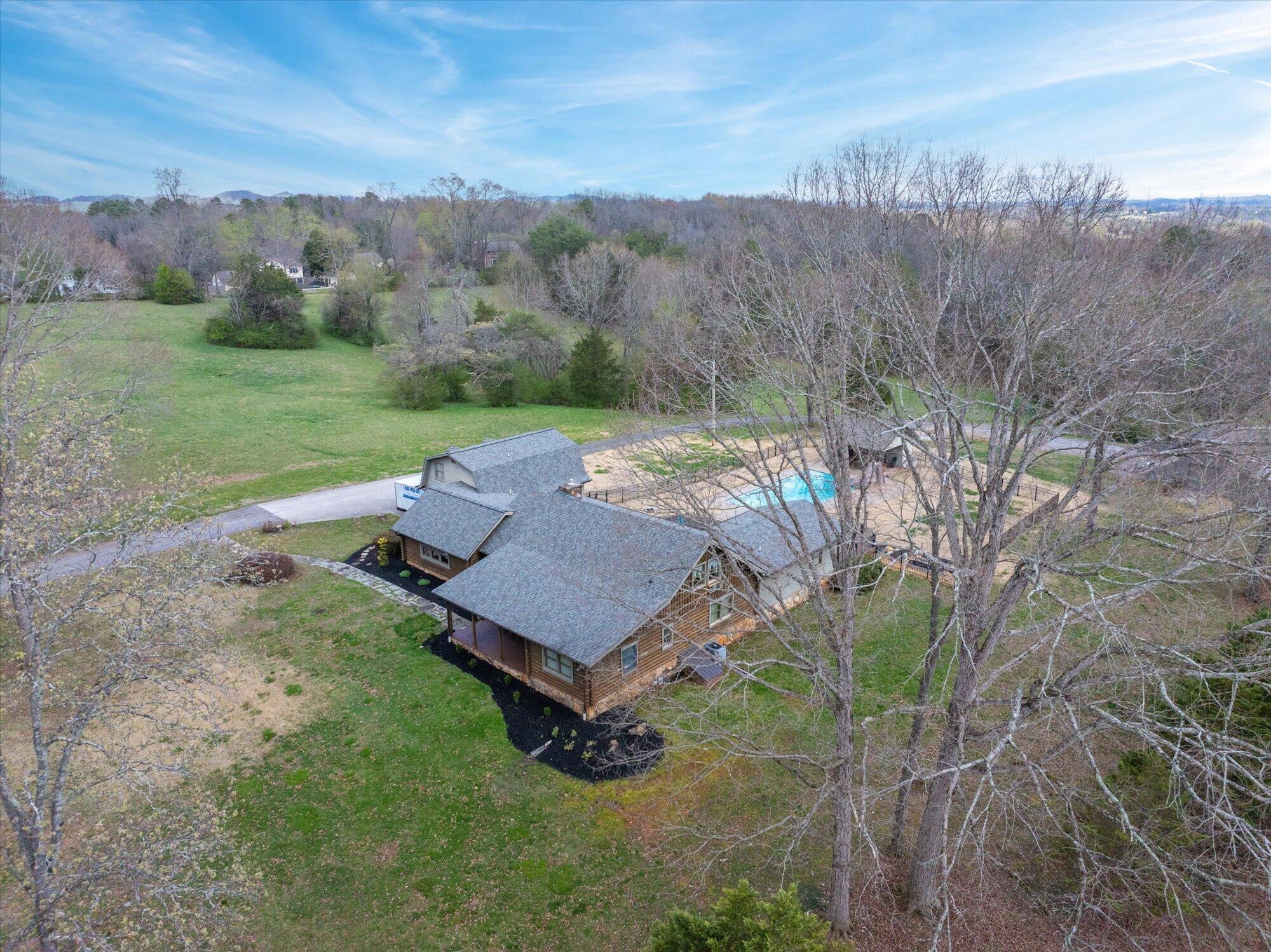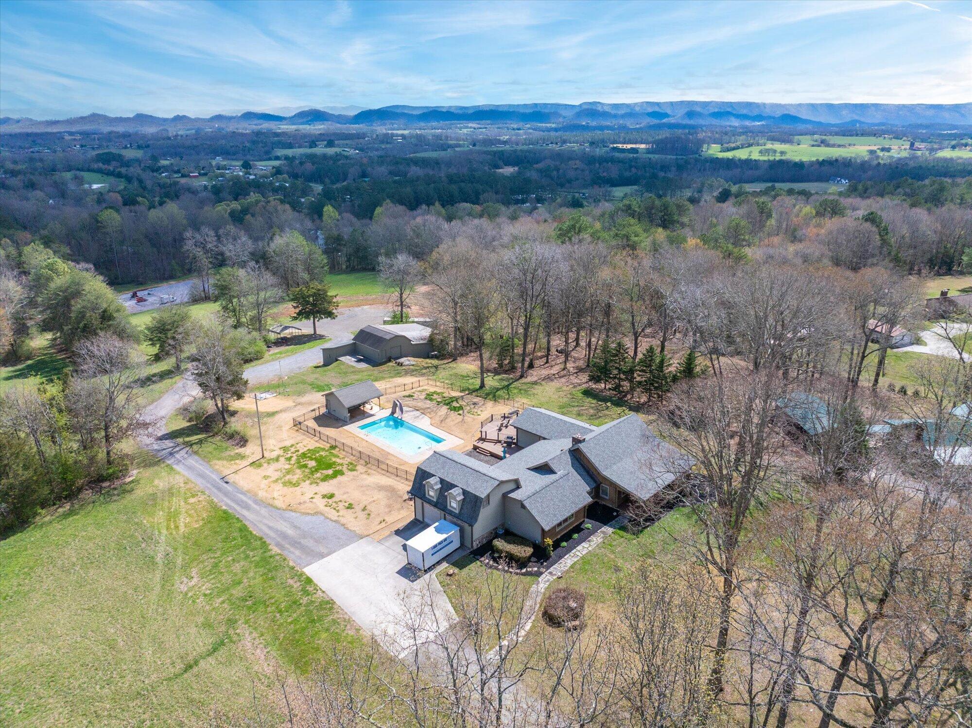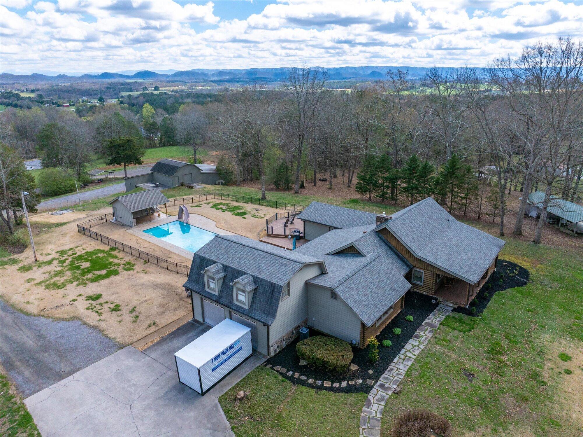 Immaculate log cabin on 6.47 /- cleared acres in McMinn County! This 3,279 sq ft, 4-bedroom, 3-bath home in Englewood offers stunning views of Starr Mountain right in your backyard. Once featured in 'Log Home Guide for Builders and Buyers,' this property has been meticulously maintained, and it shows.Step inside to an open-concept living and kitchen area where a striking stone fireplace serves as a centerpiece--doubling as the gas range on the kitchen side. Natural light pours in, highlighting hardwood floors, custom cherry cabinetry, and granite countertops. Just off the kitchen, you'll find an additional den, a spacious sunroom overlooking the pool, and a large utility room.The primary suite and guest bedrooms are thoughtfully situated on one side of the home, while a fourth bedroom and full bath are located upstairs. The primary suite is a true retreat, featuring wide plank hardwood floors, a generous layout, and a walk-in closet.Above the attached two-car garage, a versatile bonus space with a full bath offers endless possibilities--perfect for a guest suite, game room, or hobby space.Outdoors, enjoy a fully fenced saltwater pool and pool house complete with a convenient changing room--ideal for relaxing or entertaining. Lastly, located behind the pool house is a one car garage, with workshop space above, and a 12x12 garage door.This property is a must-see for those seeking a beautiful country setting, privacy, and ample land--perfect for bringing your animals. Please note, red boundary lines are approximate. Buyer to verify all information.