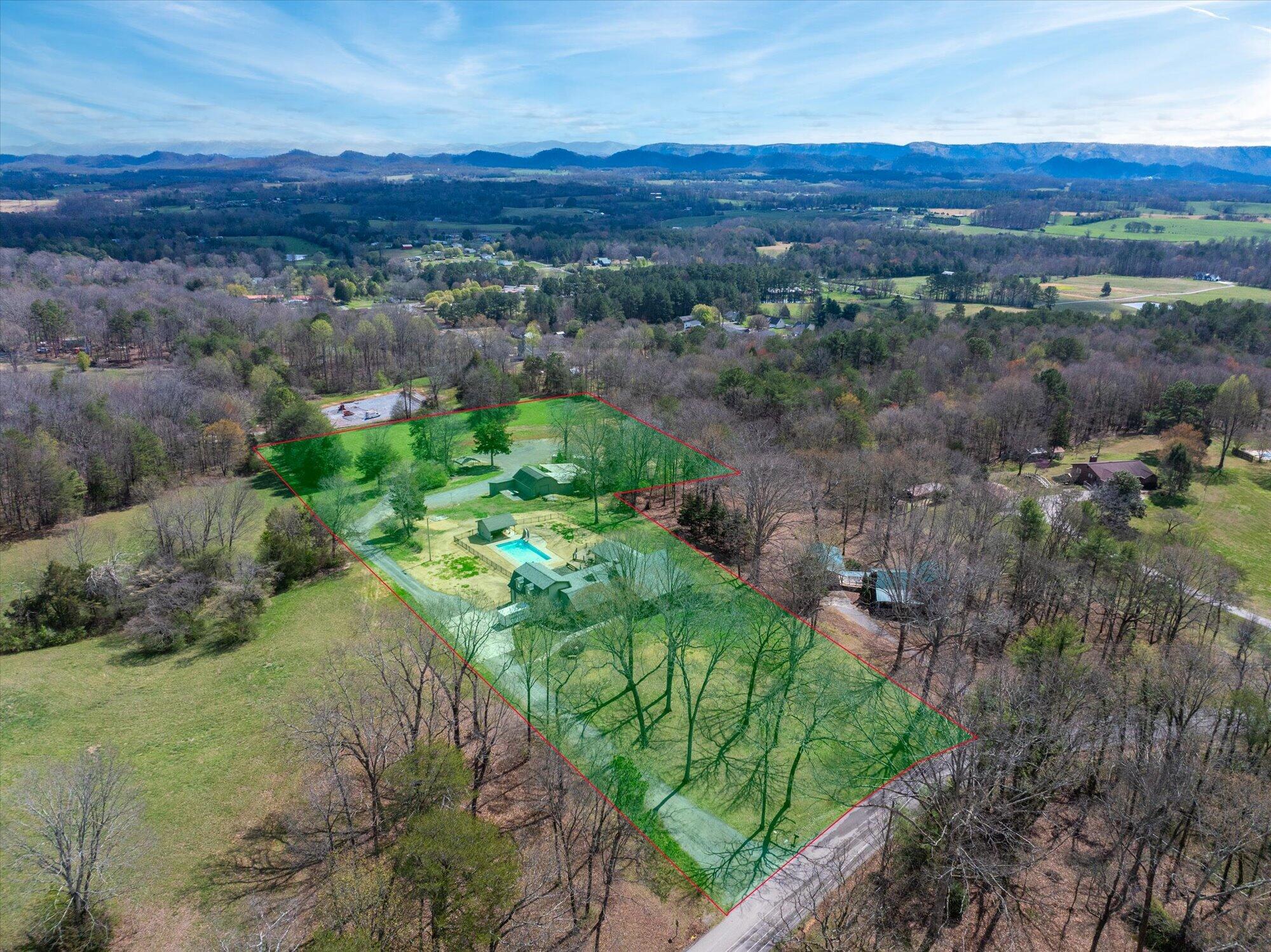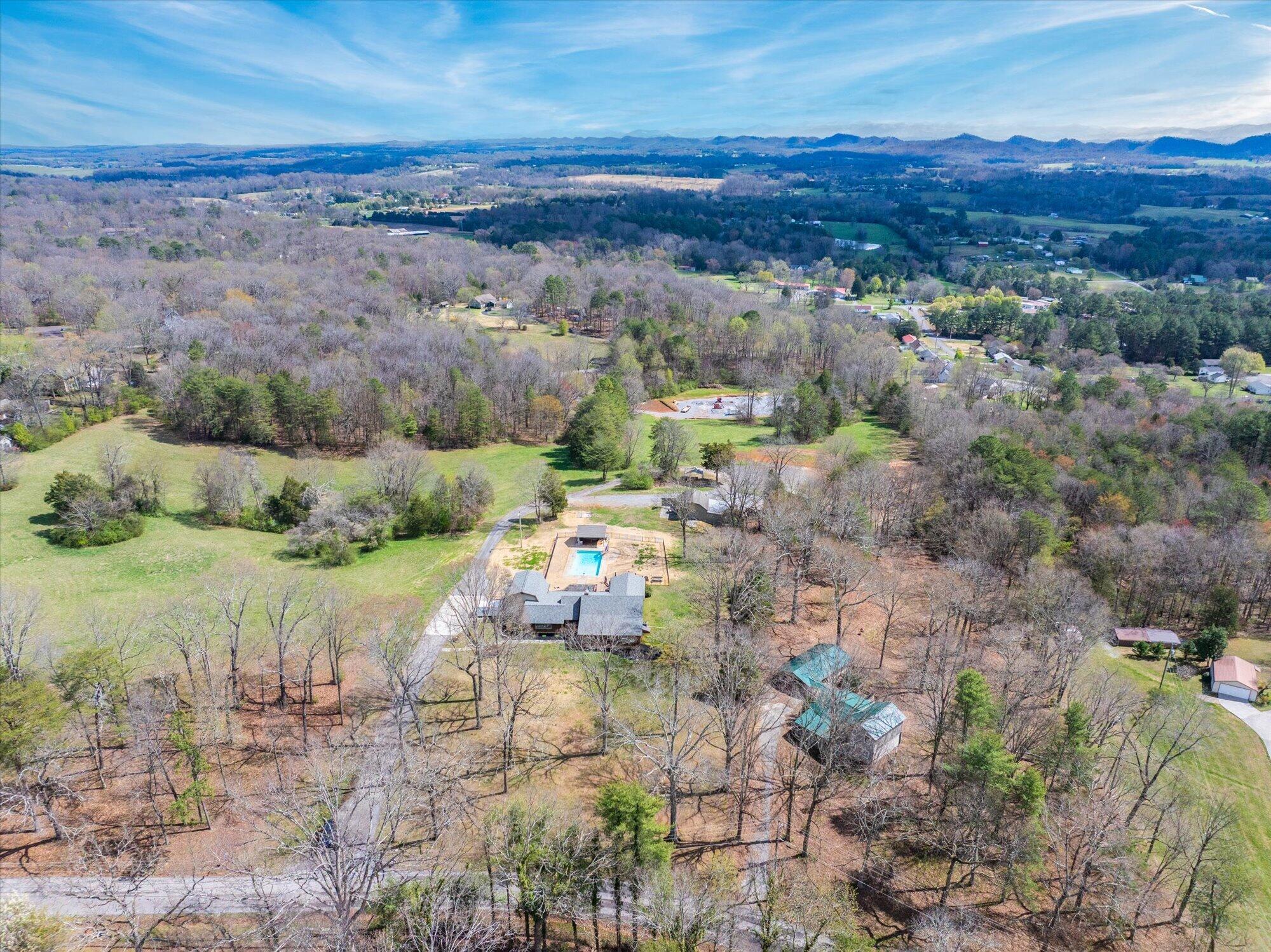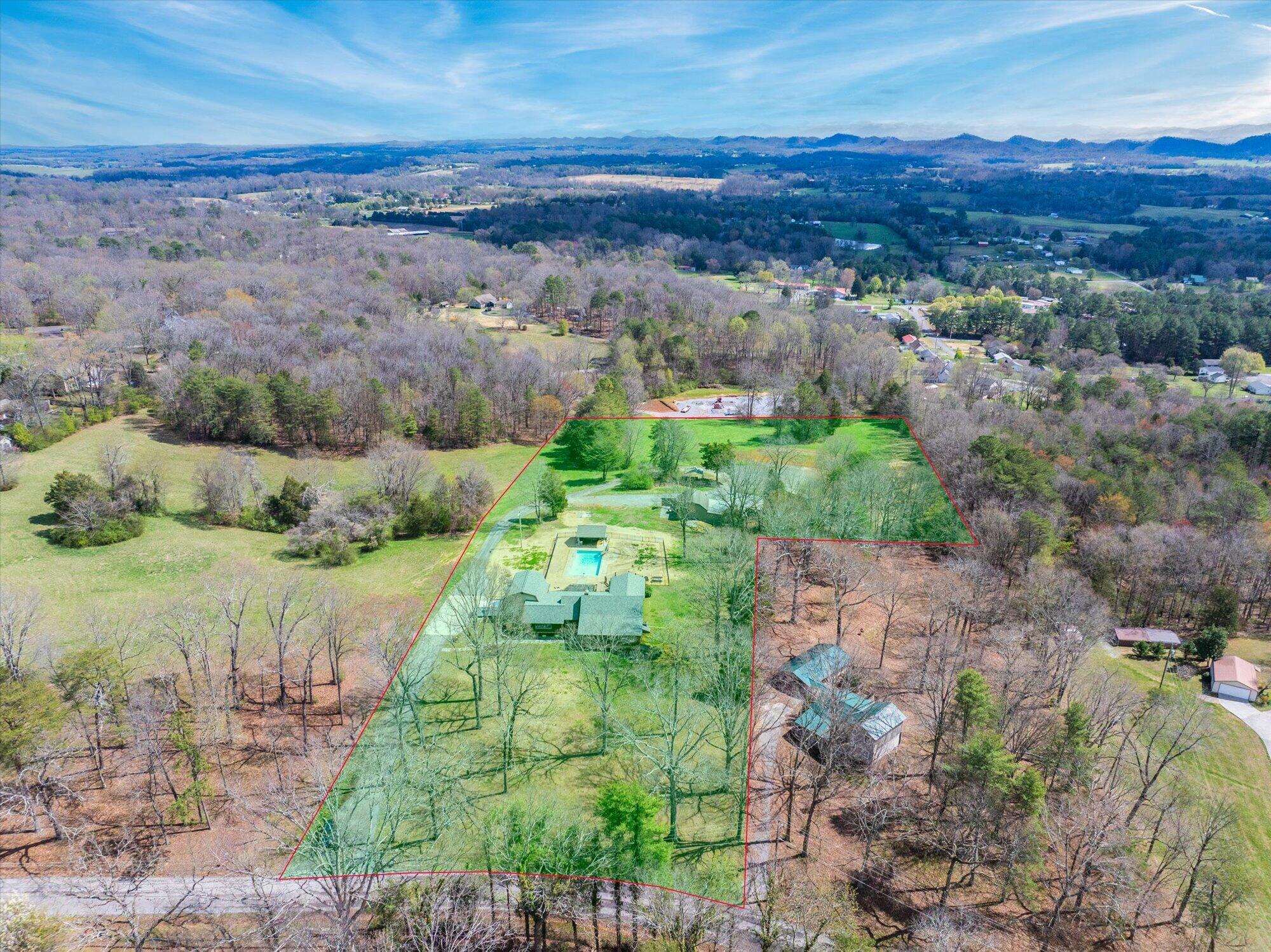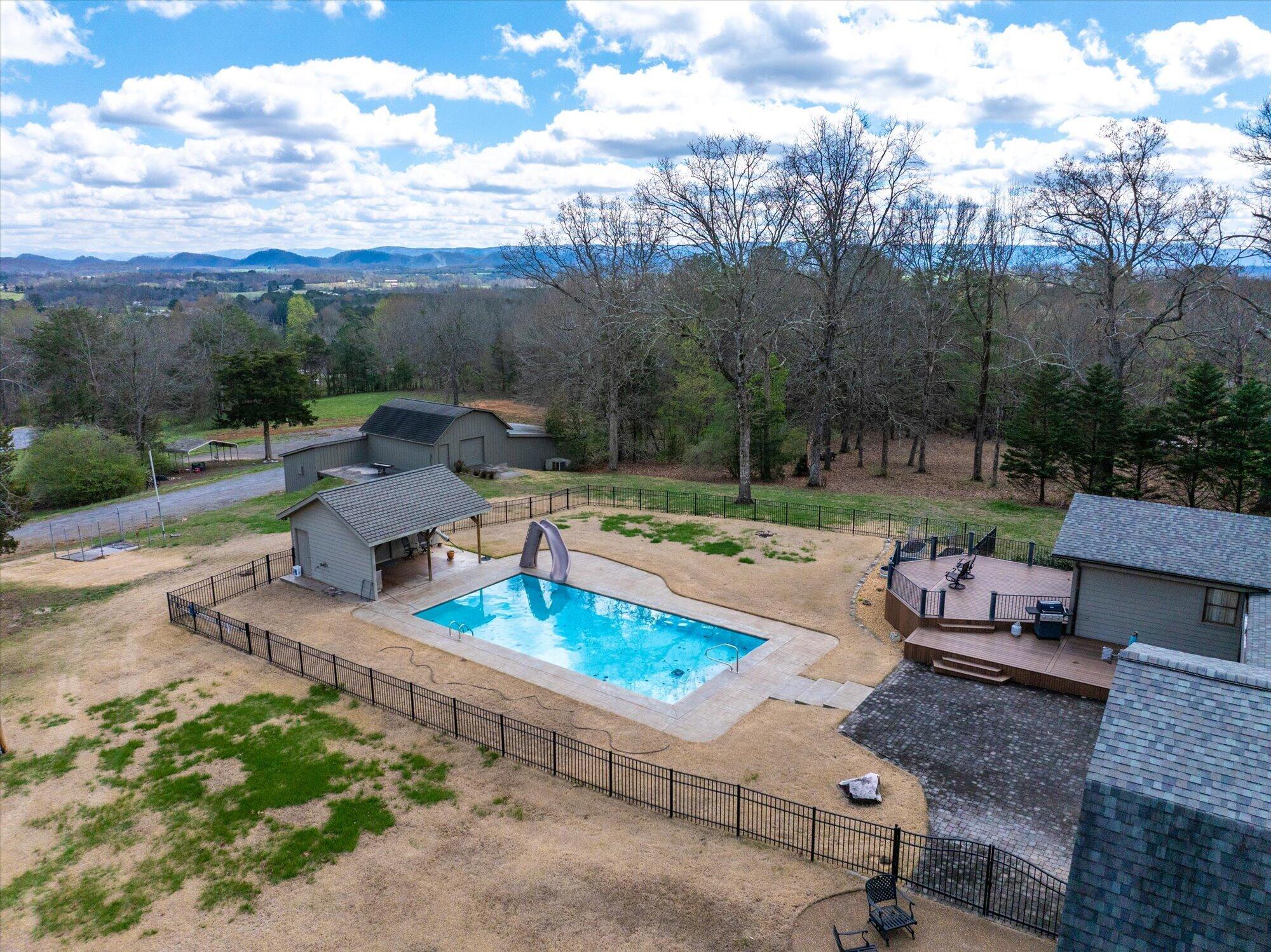 Immaculate log cabin on 6.47 /- cleared acres in McMinn County! This 3,279 sq ft, 4-bedroom, 3-bath home in Englewood offers stunning views of Starr Mountain right in your backyard. Once featured in 'Log Home Guide for Builders and Buyers,' this property has been meticulously maintained, and it shows.Step inside to an open-concept living and kitchen area where a striking stone fireplace serves as a centerpiece--doubling as the gas range on the kitchen side. Natural light pours in, highlighting hardwood floors, custom cherry cabinetry, and granite countertops. Just off the kitchen, you'll find an additional den, a spacious sunroom overlooking the pool, and a large utility room.The primary suite and guest bedrooms are thoughtfully situated on one side of the home, while a fourth bedroom and full bath are located upstairs. The primary suite is a true retreat, featuring wide plank hardwood floors, a generous layout, and a walk-in closet.Above the attached two-car garage, a versatile bonus space with a full bath offers endless possibilities--perfect for a guest suite, game room, or hobby space.Outdoors, enjoy a fully fenced saltwater pool and pool house complete with a convenient changing room--ideal for relaxing or entertaining. Lastly, located behind the pool house is a one car garage, with workshop space above, and a 12x12 garage door.This property is a must-see for those seeking a beautiful country setting, privacy, and ample land--perfect for bringing your animals. Please note, red boundary lines are approximate. Buyer to verify all information.