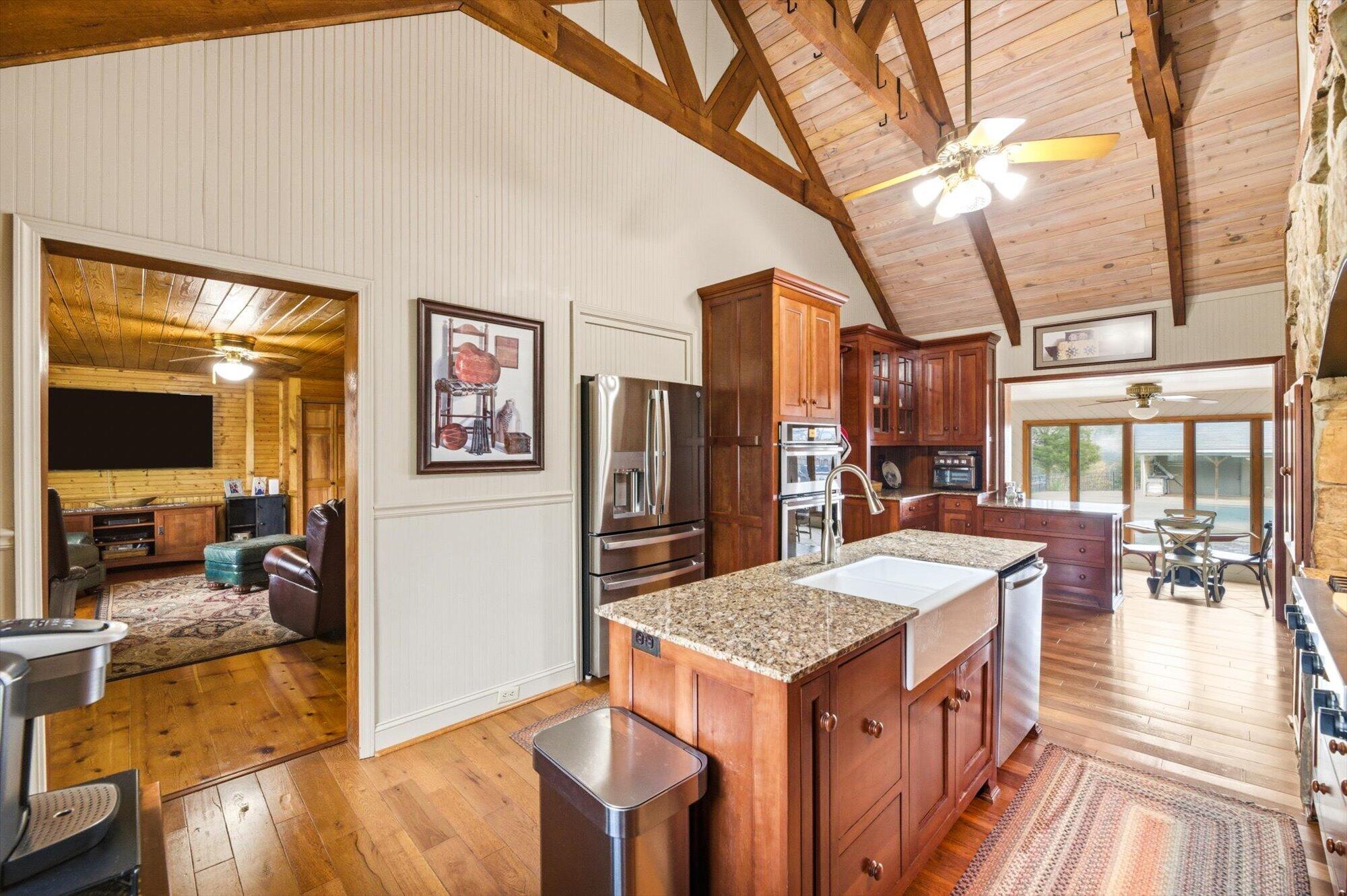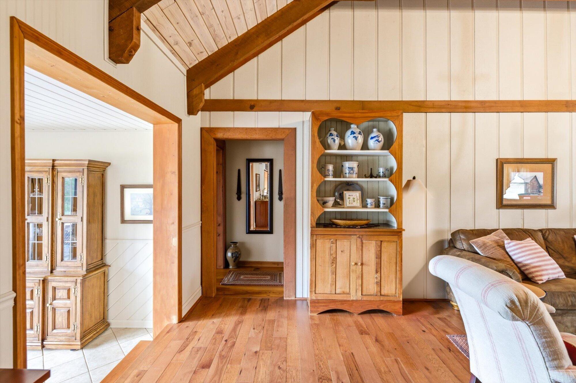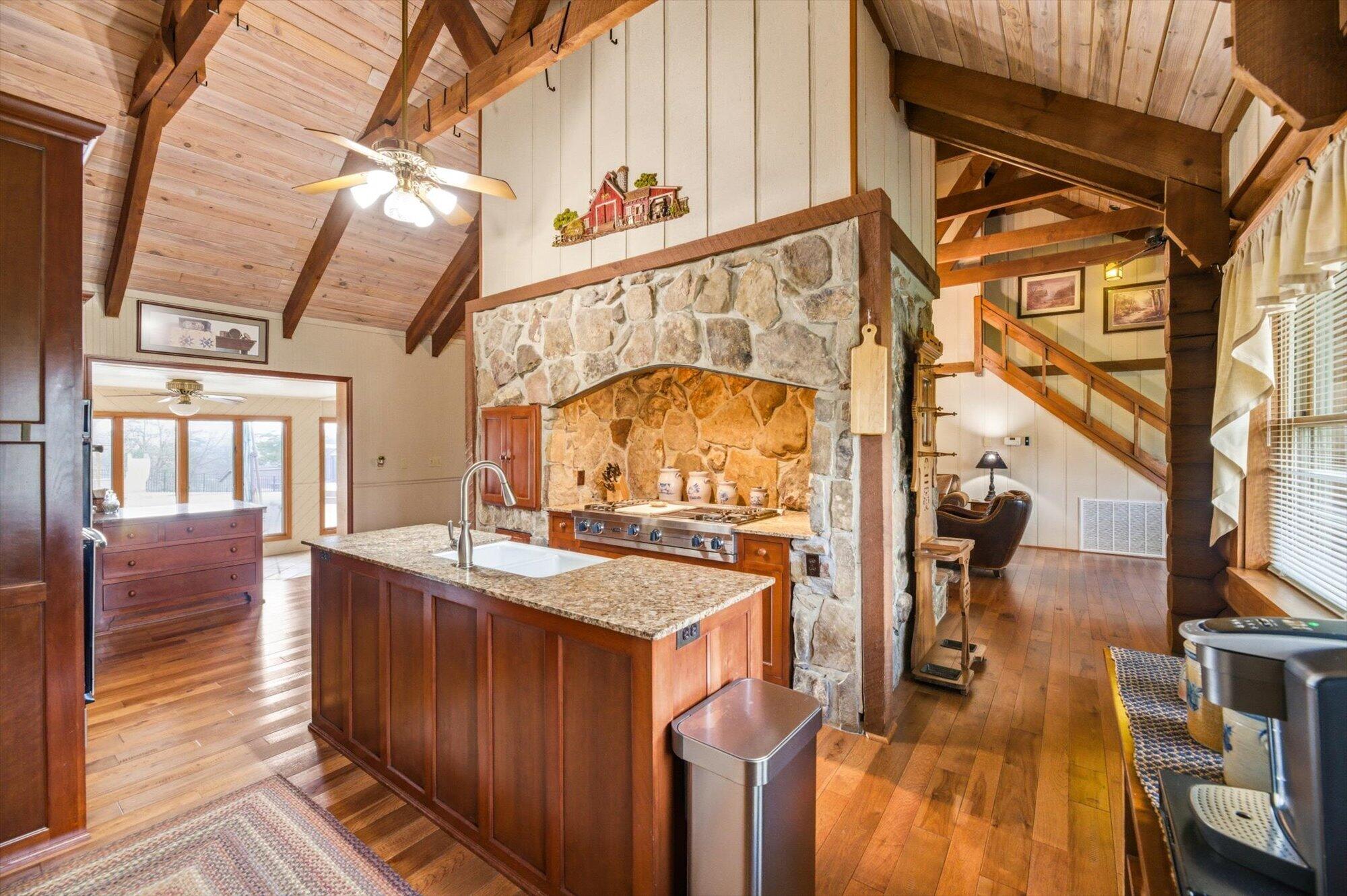 Tucked along the shoreline of Lake Monroe, this charming Swiss chalet-style retreat offers the relaxed lake lifestyle buyers dream about, complete with a coveted boat slip at the neighborhood dock. Just bring a swimsuit, this home is being sold turn-key! Spend summer mornings on the water and wind down in the evenings around a lakeside campfire beneath the trees. Situated in Salt Creek Estates in Monroe County, the home is surrounded by the wooded hills and natural beauty that make this area of Southern Indiana so special. The 4-bed, 2-bath ranch captures the timeless feel of a classic lake cabin. Warm wood interiors, exposed beams, and two stone fireplaces create inviting gathering spaces, while large windows frame peaceful views of Lake Monroe. The walkout lower level provides additional living and recreation space, ideal for hosting guests after a day on the water. Whether you're looking for a weekend getaway or comfortable year-round living, this property offers a rare opportunity to enjoy lake access just outside your back door while living less than 30 minutes to Bloomington or downtown Nashville.