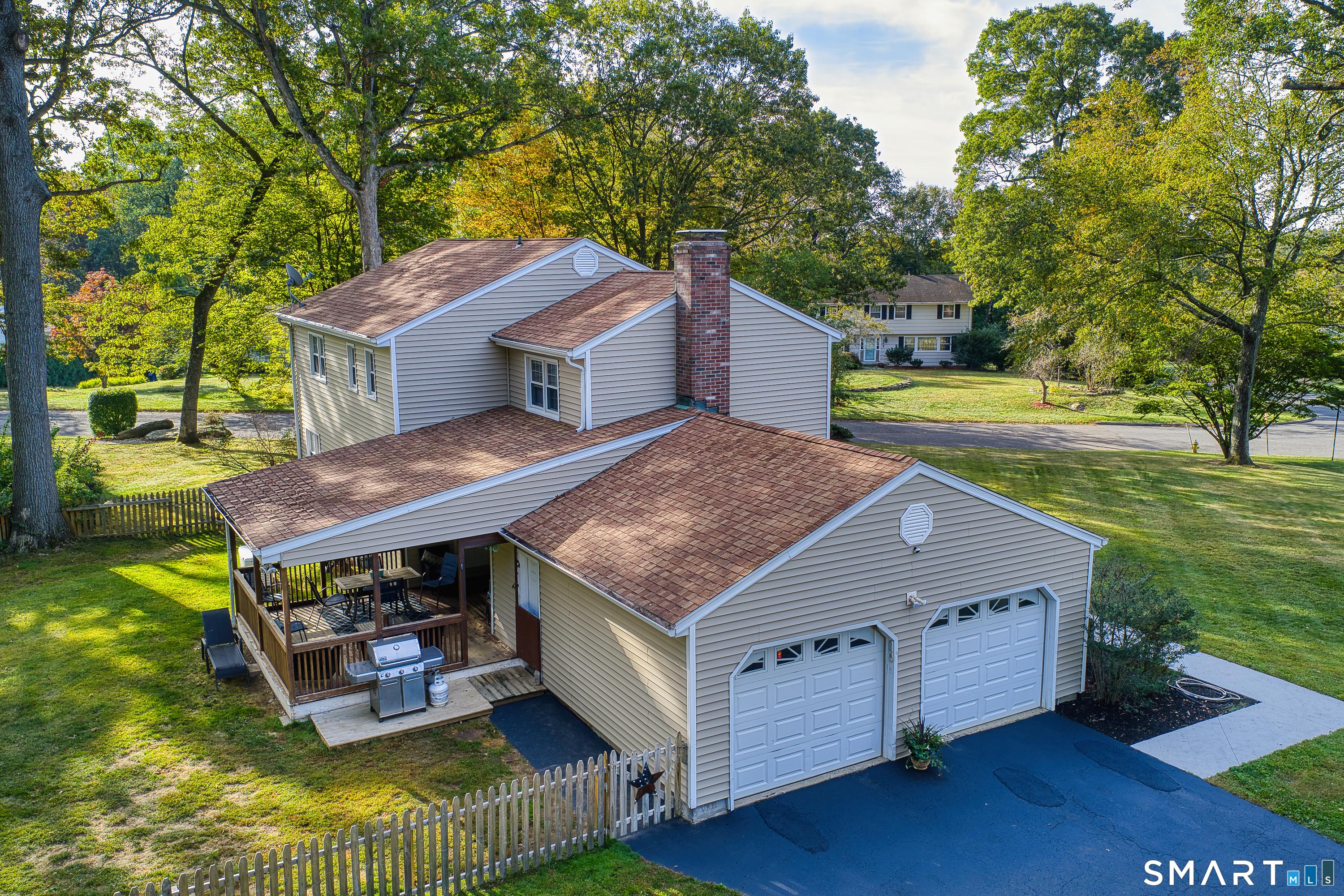 Beautiful 4-Bedroom 2.5 bath Colonial on a Flat 1 Acre Lot - in Daniels Farm awaits Set perfectly with a unique corner lot orientation this beautifully sited home offers outstanding curb appeal, and a warm welcoming presence from the moment you arrive. The home offers additional parking with a stone parking pad, a fenced rear yard for added privacy, and surrounded by beautiful, mature trees. Thoughtfully maintained and updated over the years, improvements and maintenance include roof, windows, vinyl siding, boiler, hot water tank and central air conditioning. Additionally, this home features a Generac natural gas whole house generator. Inside, the main level features hardwood floors throughout with a warm inviting layout, designed for both entertaining and everyday life. Laundry area, a wood burning stove insert fireplace, built ins, and access to the covered porch, provides an ideal spot for relaxing and enjoying summer evenings overlooking this beautifully maintained property. A 2-car attached gar situated off the family room, adds everyday practicality which includes a work bench with cabinets. Upstairs, youll find four generously sized bedrooms all with hardwood floors offering comfortable space for family, guests, or a home office. The updated bathrooms provide modern style and functionality complementing the homes charm. With over 2,100 square feet, a fantastic layout, and a peaceful one-acre setting, this home combines comfort, character and opportunities.