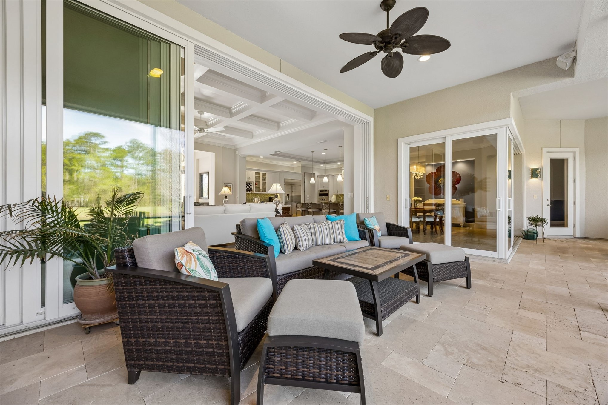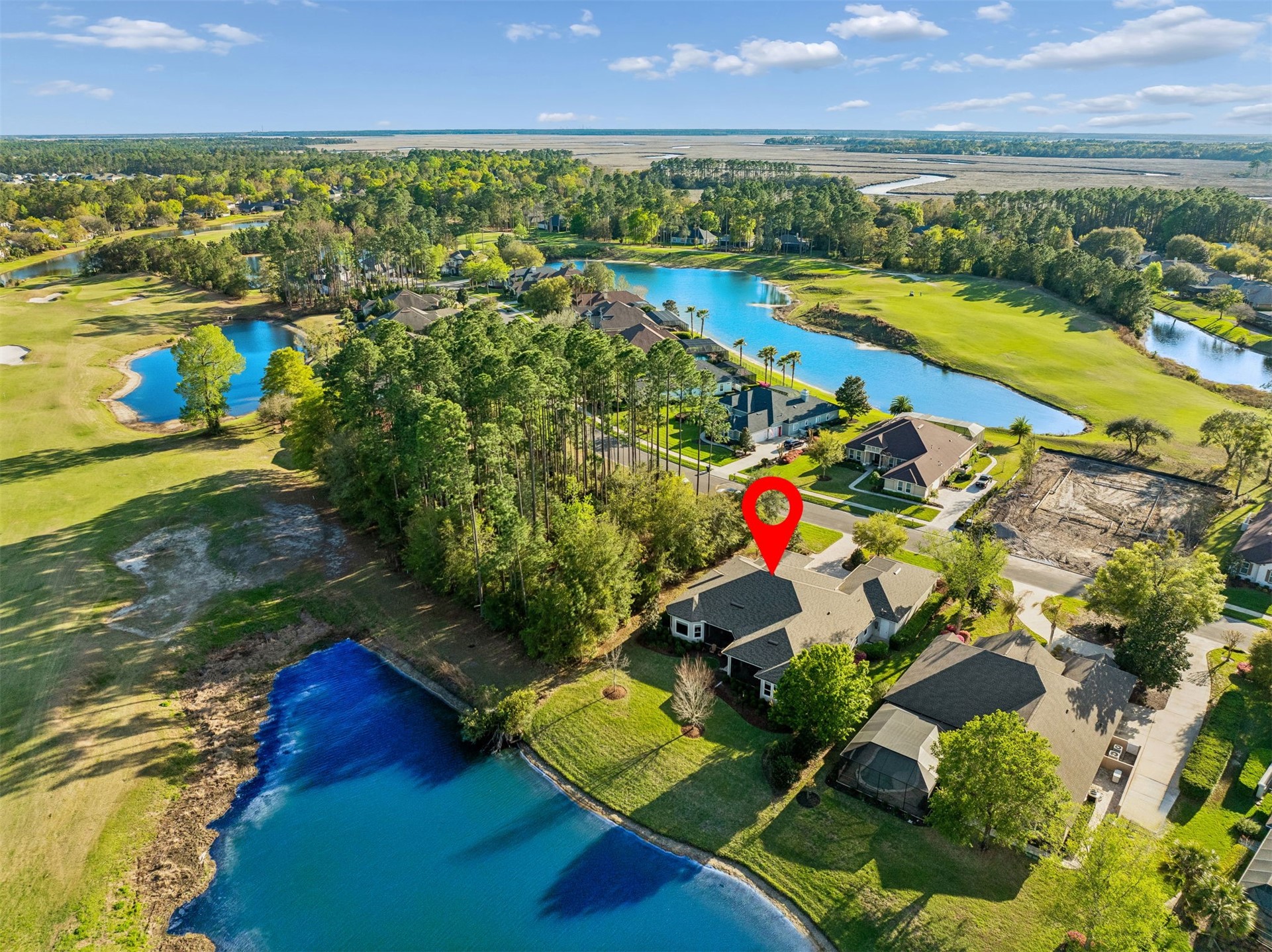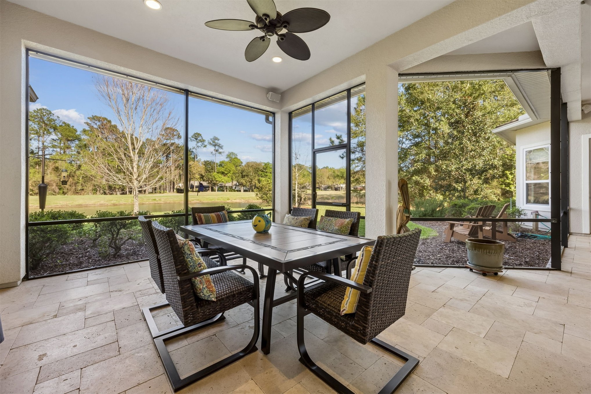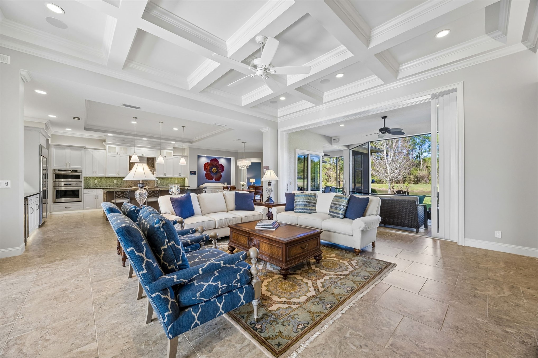 Welcome to 85126 Napeague Drive, a stunning custom home built by Arthur Rutenberg Homes in 2015, where indoor-outdoor living come together in one exceptional property. Offering 4 bedrooms, 3 bathrooms, and a dedicated office, all on a single level, this 3,372 square foot home was designed for both everyday comfort and entertaining. From the moment you enter, soaring ceilings and a coffered living room ceiling create an impressive atmosphere. The kitchen is a true centerpiece for gathering, featuring pro series appliances, gas cooking, and a layout that seamlessly connects to the living spaces, perfect for entertaining friends & family. Set on over half an acre, the lot captures sweeping golf course and lake views while being thoughtfully positioned to accommodate a future pool and paver patio. The expansive screened lanai is truly “endless,” offering the ideal setting for morning coffee, evening cocktails, and year-round outdoor living. With gas and water hookups already in place, your dream summer kitchen is ready to come to life. The entire right wing of the home is dedicated to a private primary suite retreat, offering space and privacy. Additional highlights include an oversized 3-car garage that easily accommodates large SUVs and more, a new roof (2024), central vacuum system, generator hookup, and an HVAC system with clean air technology. The paver driveway provides ample additional parking, while the custom, low-maintenance landscaping enhances the home's curb appeal without the upkeep. Located in the North Hampton community, with no CDD fees, residents enjoy an amenity package including a pool, pickleball courts, tennis courts, sports field, and a kayak launch. This is more than a home, it's a lifestyle.