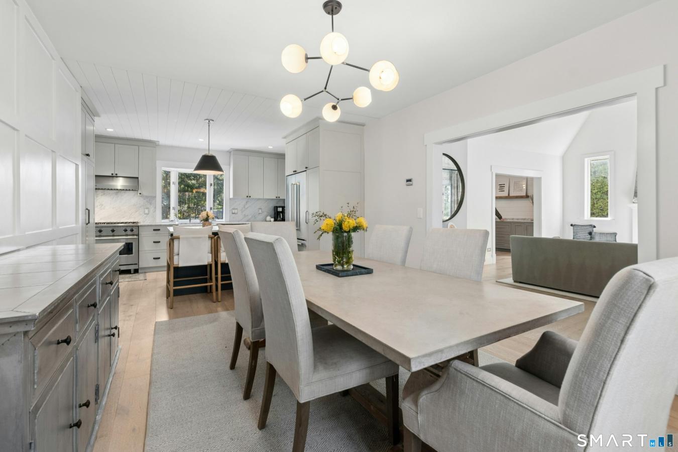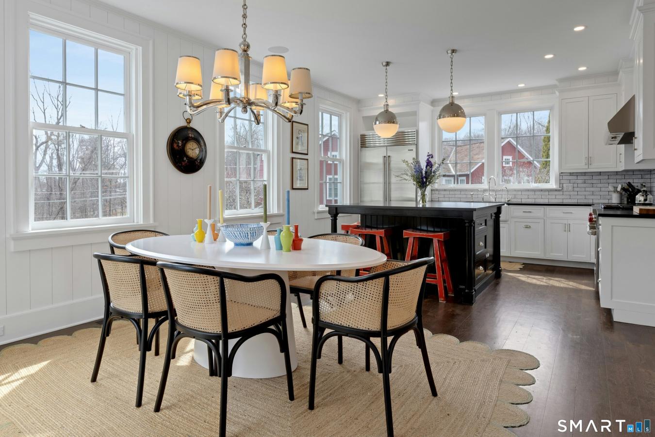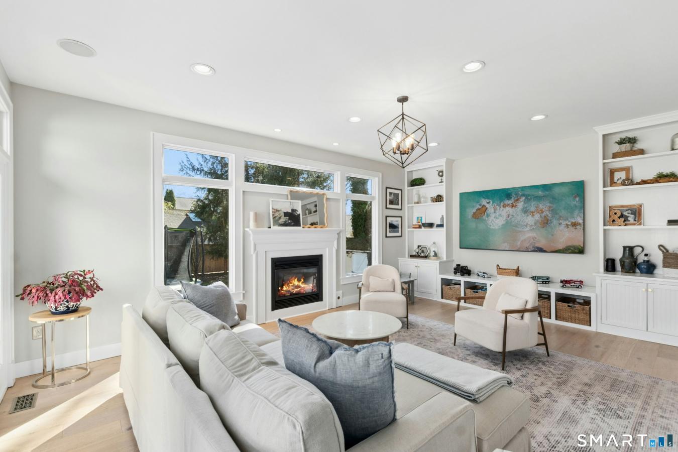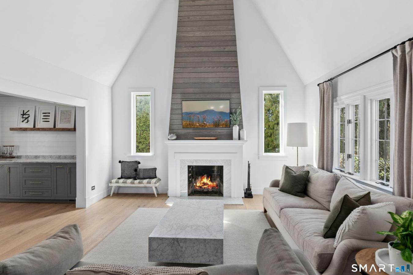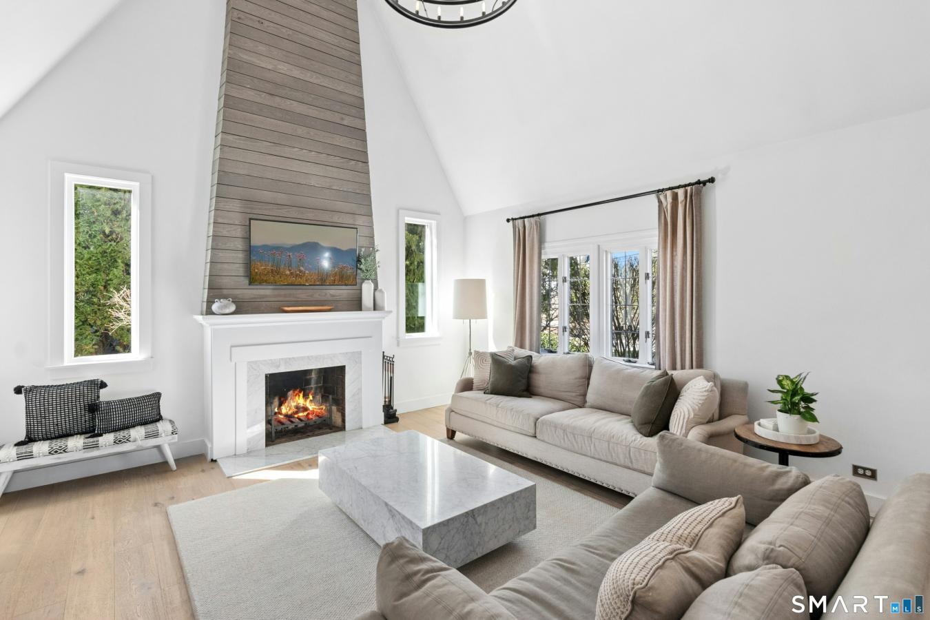 This gem of a home, in a prime Darien location, is ideal for both entertaining and casual living! As the charming entry sweeps you in, you immediately are surprised by the vaulted ceilings in the spacious living room which is centered around a soaring wood burning fireplace, clad in shiplap and marble.