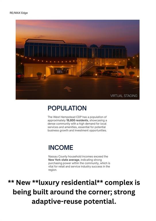 Exceptional opportunity to acquire a high-visibility commercial asset in the heart of West Hempstead. This approximately 9,204 SF building sits on a prime corridor along Hempstead Turnpike, offering strong traffic exposure and excellent accessibility.The property features a functional single-story layout, ideal for a wide range of commercial uses, along with parking available in both the front and rear for added convenience.Situated on an approximately 16,500 SF lot, the property also presents strong development and expansion potential (subject to zoning and approvals).Property Highlights:Approx. 9,204 SF buildingApprox. 16,500 SF lotFlexible open layout easy to reconfigureFront and rear parkingStrong street presence on Hempstead TurnpikeSurrounded by national retailers and established businessesPotential Uses:Suitable for retail, showroom, medical, professional office, restaurant, event space, or other permitted commercial uses. Offers excellent adaptive-reuse and customization potential for both end-users and investors.Location:Strategically located on Hempstead Turnpike, one of Nassau Countys busiest commercial corridors. Adjacent to Wendys and directly across from Flagstar Bank. Nearby national retailers include Target and Home Depot, contributing to strong foot and vehicle traffic.Convenient access to major highways and transportation routes, with easy connectivity to NYC, JFK Airport, and surrounding areas.A new luxury residential development in the immediate area may contribute to increased population density and future demand for retail and services.Summary:Rare opportunity to acquire a well-located commercial property with both immediate usability and long-term upside, including potential for redevelopment or expansion.All information deemed reliable but not guaranteed. Buyer to verify all information independently, including zoning, use, lot size, and square footage.MLS Approve- No financial