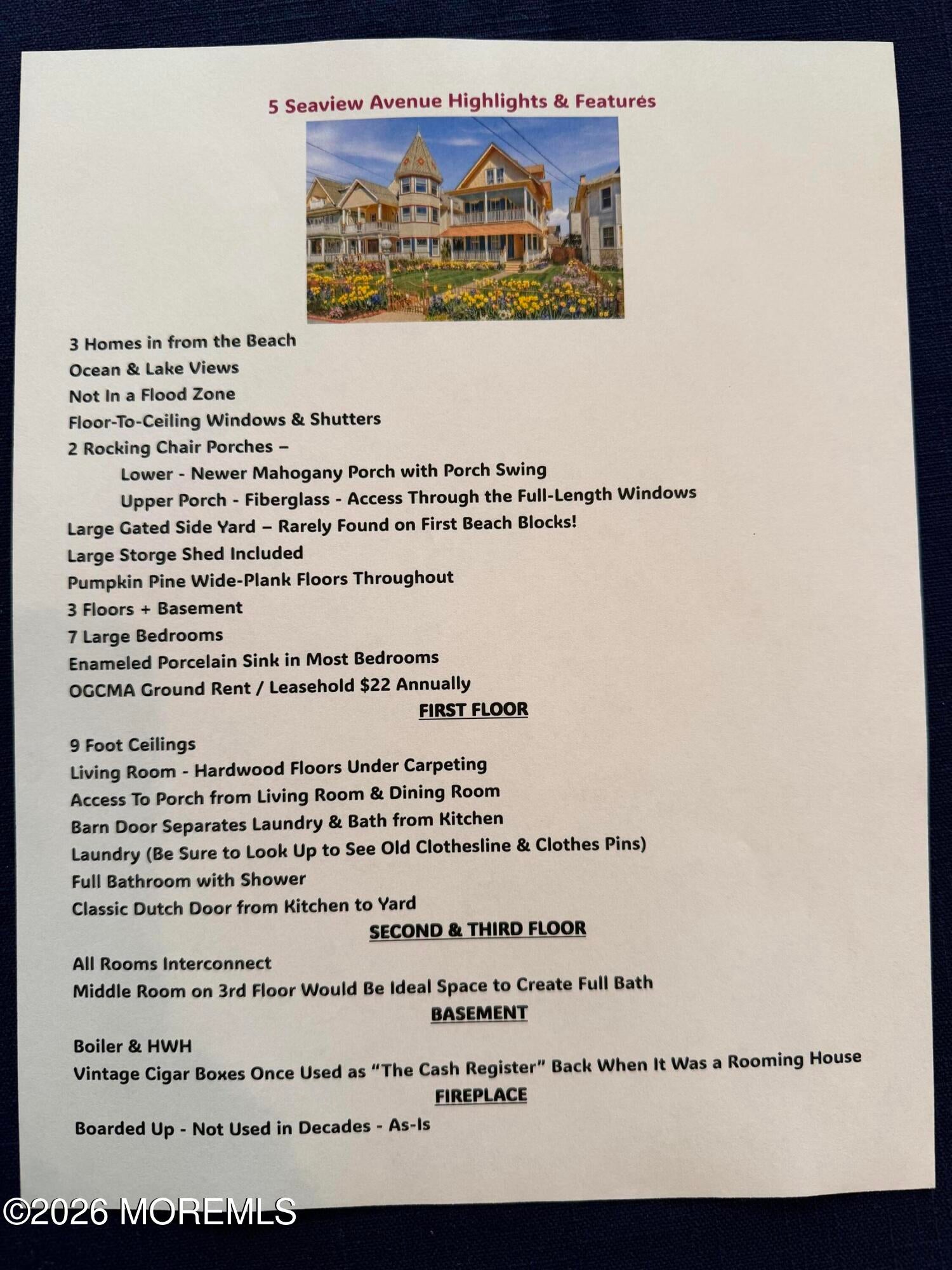 Welcome to this 1st Beach Block Victorian w/Southern Exposure Boasting 7BR/2.5BA. Timeless Architectural Details & Steps to Beach, Main Ave & Asbury. Pass Through the Ornate Wrought-Iron Gate Crowned w/Yellow Finials & Step into a Gentler Era. Expansive Upper & Lower Porches Capture Sweeping Ocean Views, while Mahogany Rocking-Chair Porch Invites Long, Unhurried Afternoons. Magnificent Floor-to-Ceiling Windows & Doors Flanked by Period Shutters & Hardware Set a Tone of Grandeur. Preserved by the Same Family for 85 Years, this Gem Exudes Character. Wide Plank Pumpkin Pine Floors, Soaring 9ft Ceilings & Picture Rail Moldings Enhance the Elegant LR & DR. The EIK-Added Later-Features a Tin Ceiling, BA, W&D & Charming Dutch Door Opening to a Gated Side Yard Ideal for Aprs Beach BBQs. 2 of the 3 Interconnecting BRs on the 2nd FL Feature Floor-to-Ceiling Windows Opening Directly to Upper Porch Boasting Unparalleled Ocean Vistas while a Clawfoot Tub Anchors the BA.4 Sizable BRs Sweet 1/2 BA Await on 3rd Fl.Most BRs Showcase Lake or Ocean Views & Porcelain Sinks, Harking Back to its Rooming House Days.Even the Basement Holds History, w/Cigar Boxes Once Used to Collect Rent.A True Legacy Property--Ready to Be Enjoyed Immediately or Thoughtfully Refined for Generations to Come.