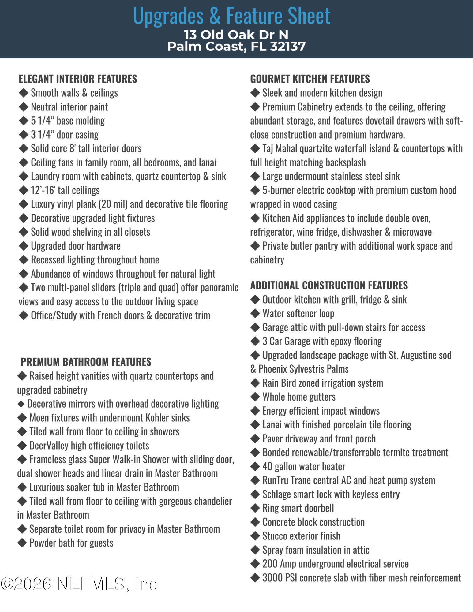 Simply elevated in design and highlighted by soaring 12-16 ft ceilings, this luxury NEW CONSTRUCTION HOME on an expansive lot showcases exceptional craftsmanship, sophisticated finishes, and a seamless blend of elegance and comfort. At the center of the home is a stunning gourmet kitchen showcasing style and function. The private butlers pantry adds additional workspace and storage. A luxurious owners suite offers a spa-inspired bathroom and spacious dual closets. Two multi-panel sliding glass doors seamlessly connect the interior living spaces to two grand lanais with an outdoor kitchen, creating the perfect setting for indoor-outdoor living year round. Enjoy a private study with French doors offering a quiet retreat. Even the laundry room is thoughtfully designed with cabinetry, utility sink, and generous counter space, blending everyday function with elevated style. Three additional bedrooms include one with a private ensuite bath, while the remaining two bedrooms share a well-appointed full bath. There is also a powder half bath conveniently located for guests. This stunning home features concrete block construction, energy-efficient windows, whole-home gutters, full irrigation, 3-car garage with epoxy flooring, and paver driveway. Designed to impress at every turn, this remarkable residence combines architectural elegance, high-end finishes, and resort-inspired outdoor living to create a truly elevated lifestyle experience. An extraordinary home designed for refined living and ready to welcome you home. Discover the hidden gem of Palm Coast in The Sanctuary, a private, gated boating community offering the perfect blend of tranquility, luxury, and Florida charm. Tucked away along the Intracoastal Waterway, this exclusive enclave featuring 175 homes, invites you to live each day like a vacation. Whether youre dreaming of expansive waterfront views or a lush, oak-shaded setting, this vibrant community offers something for everyone. More than just a neighborhood, The Sanctuary is a way of life. Spend your days sailing the Intracoastal, soaking in the sunshine, or exploring the surrounding natural landscape, all within the comfort of a secure, beautifully maintained community. The Sanctuary features pristine lakes and trails that wind through majestic old oak trees. Leaving The Sanctuary, you have easy access to an abundance of shopping and activities, most notably beautiful Atlantic beaches and several golf courses. From Palm Coast, you only need to travel a few miles on I-95 to explore northeastern Florida including Jacksonville, St. Augustine, Ormond, Orlando, and Daytona Beach, as well as many parks and attractions.
