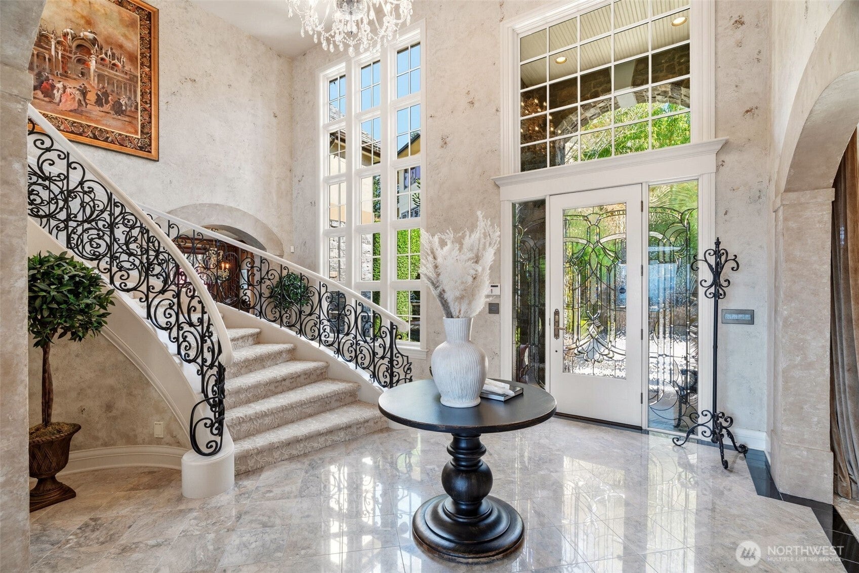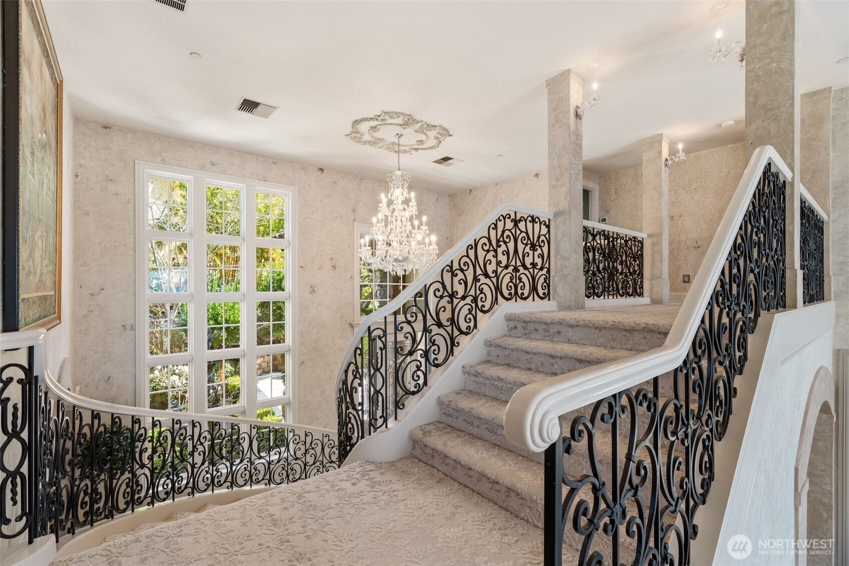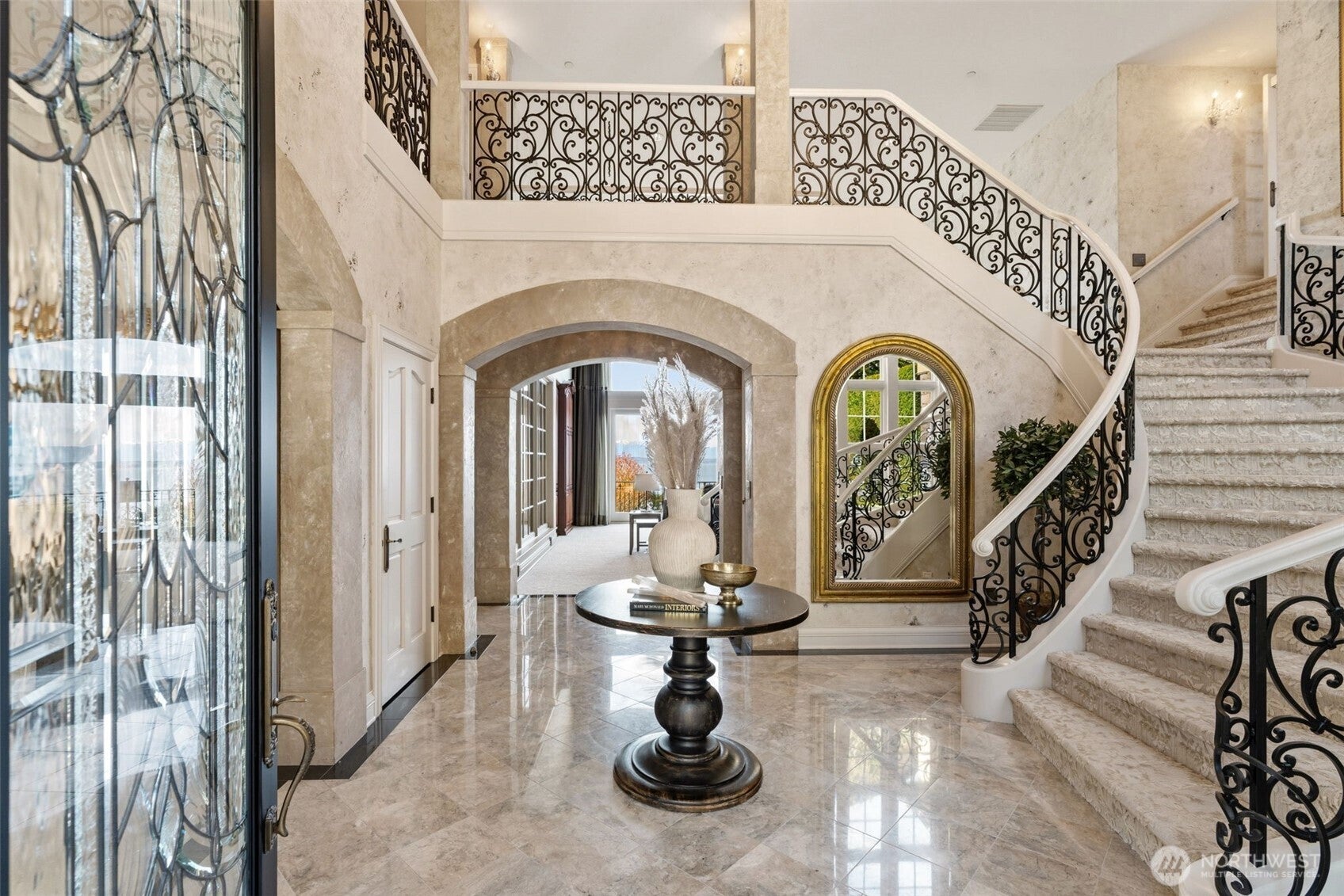 Inspired by the timeless elegance of a French Chteau, this exquisite Edmonds estate captures sweeping views of Puget Sound and the Olympic Mountains. Custom-built in 2001, this private residence blends old-world craftsmanship with modern sophistication. A dramatic marble entry and sweeping staircase set the tone for gracious living, accented by a sparkling crystal chandelier.