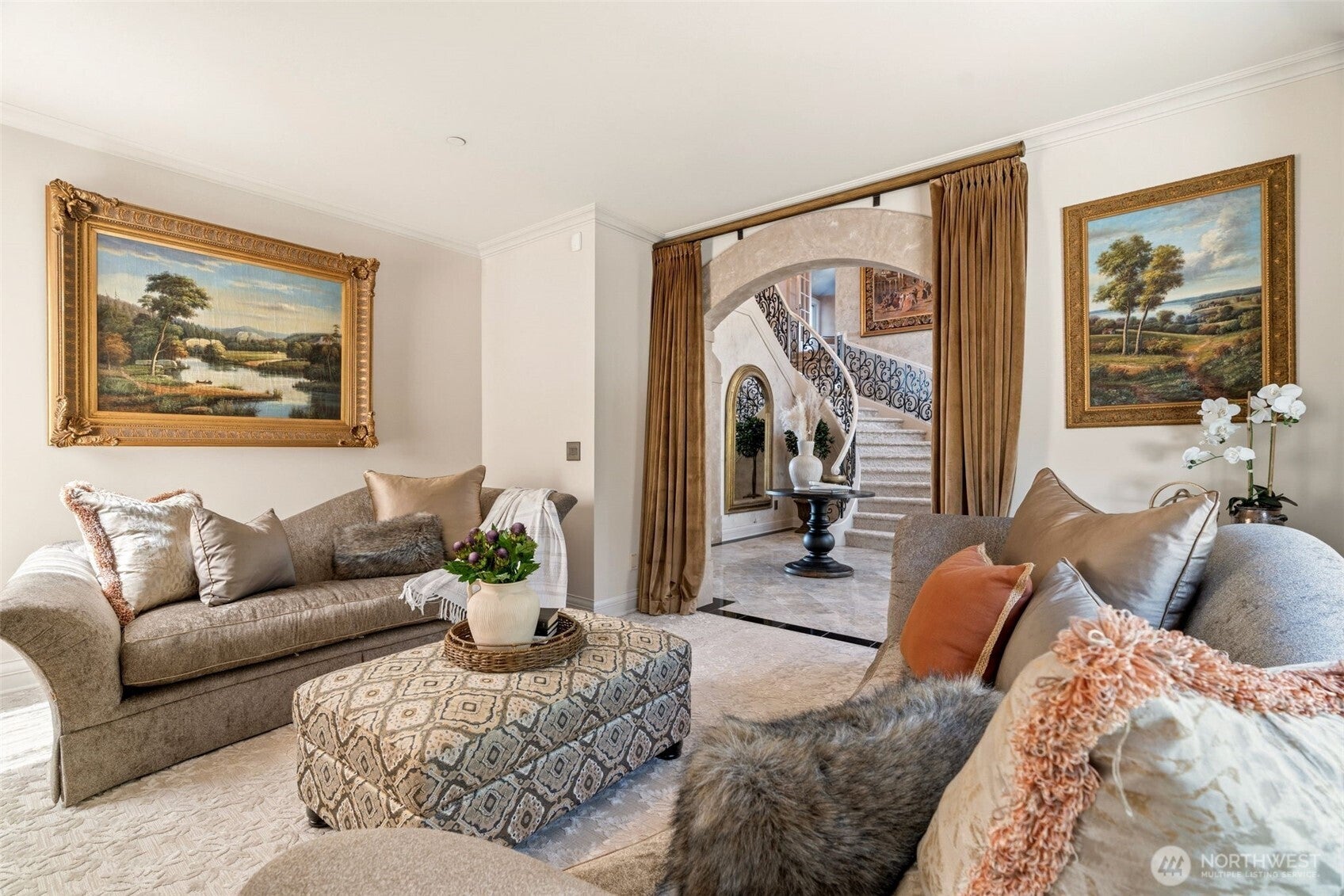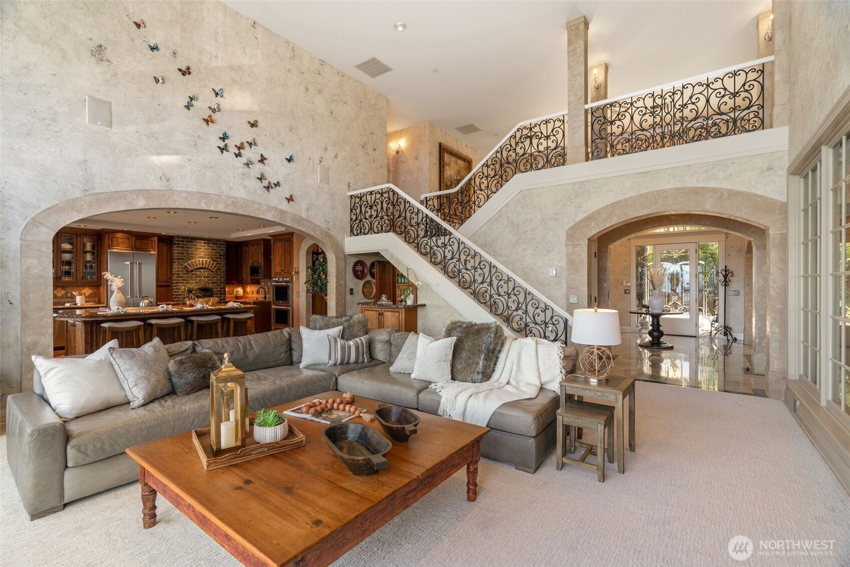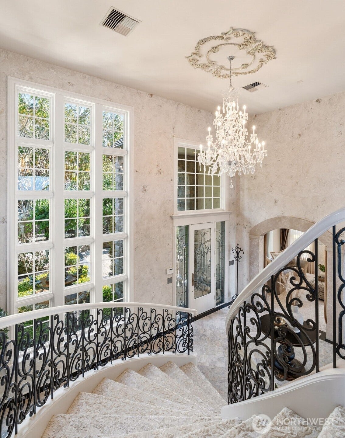 Inspired by the timeless elegance of a French Chteau, this exquisite Edmonds estate captures sweeping views of Puget Sound and the Olympic Mountains. Custom-built in 2001, this private residence blends old-world craftsmanship with modern sophistication. A dramatic marble entry and sweeping staircase set the tone for gracious living, accented by a sparkling crystal chandelier.